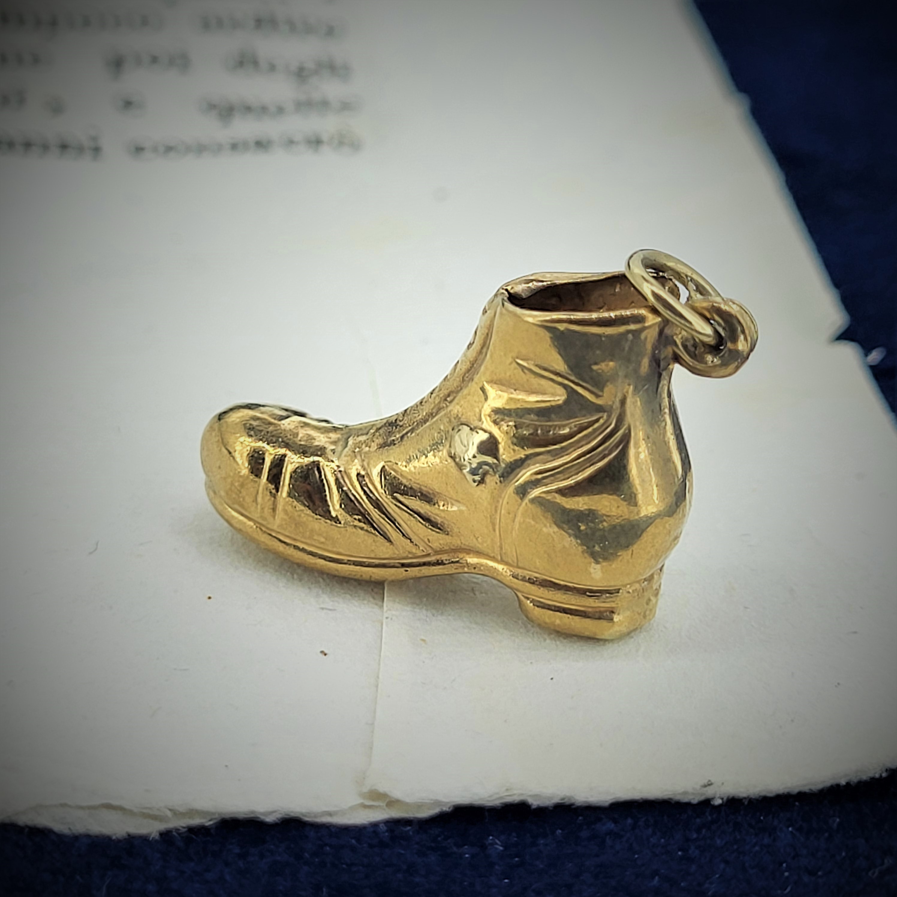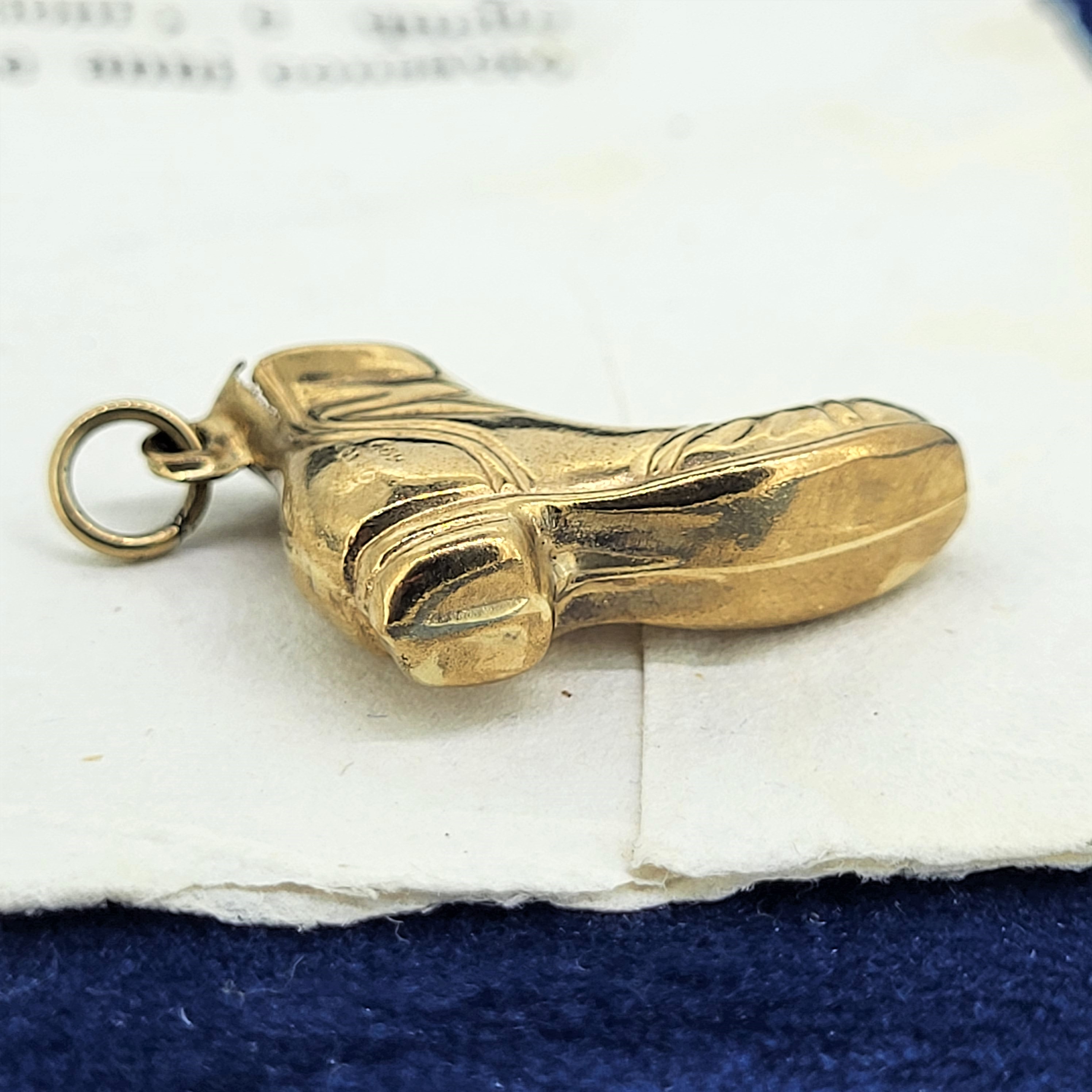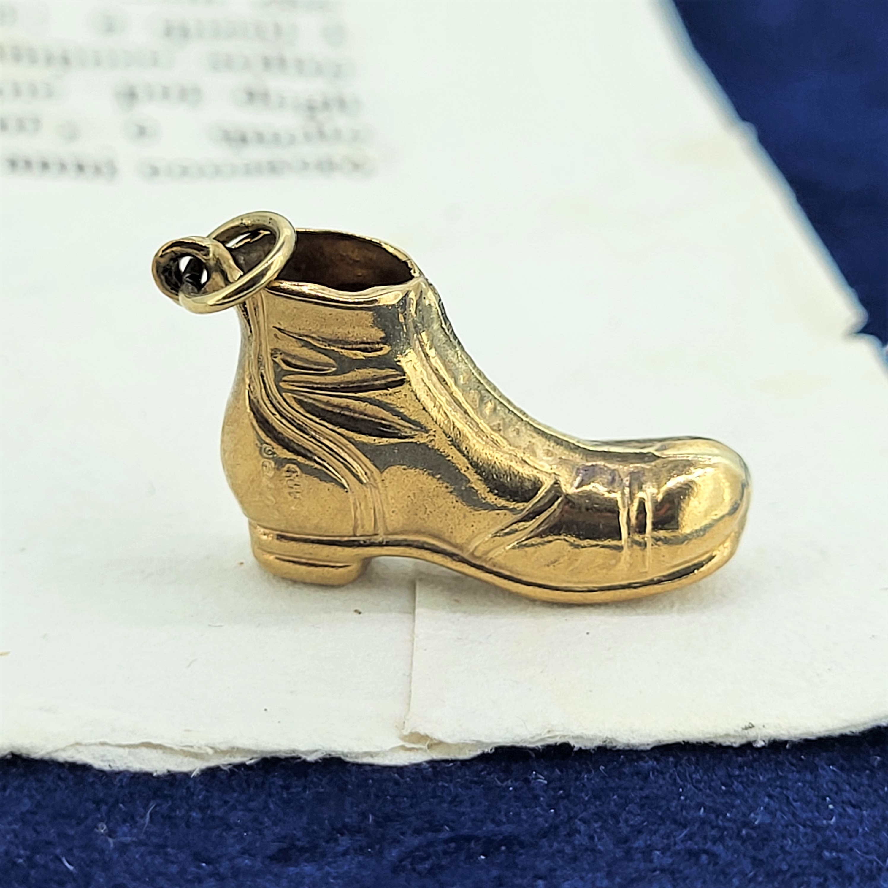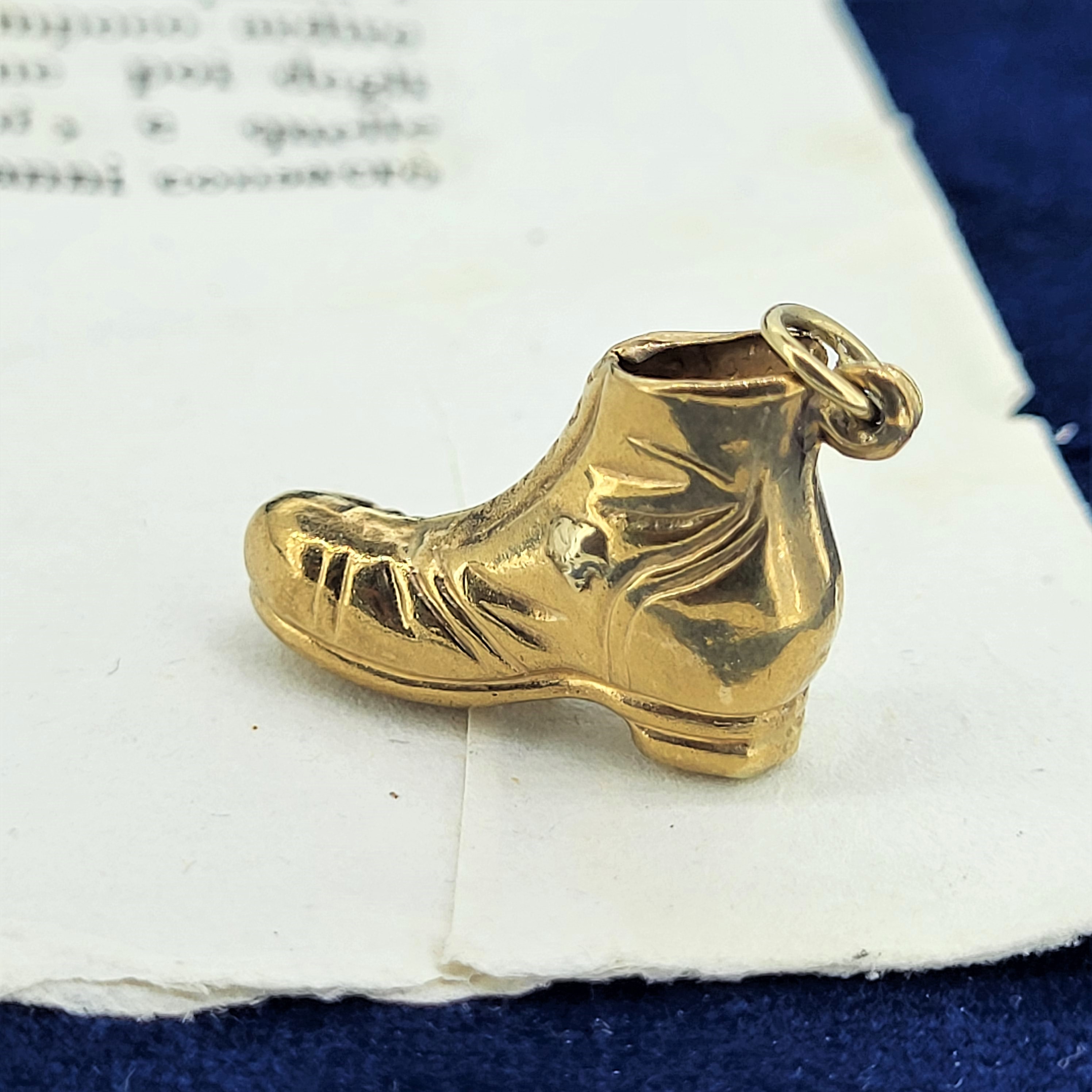 This charm measures 21mm by 15mm and has slight detailing across the boot. It weighs 1.4 grams.