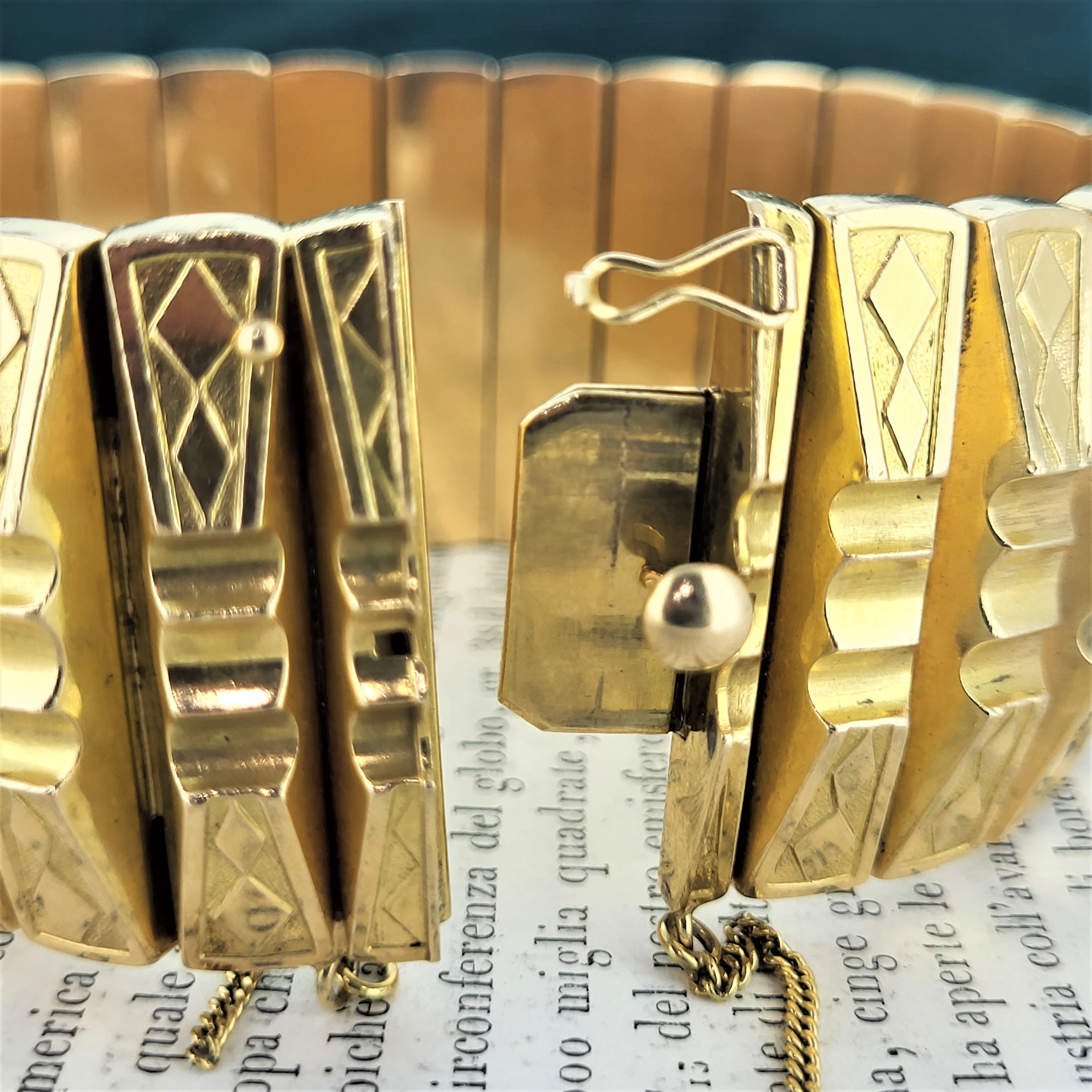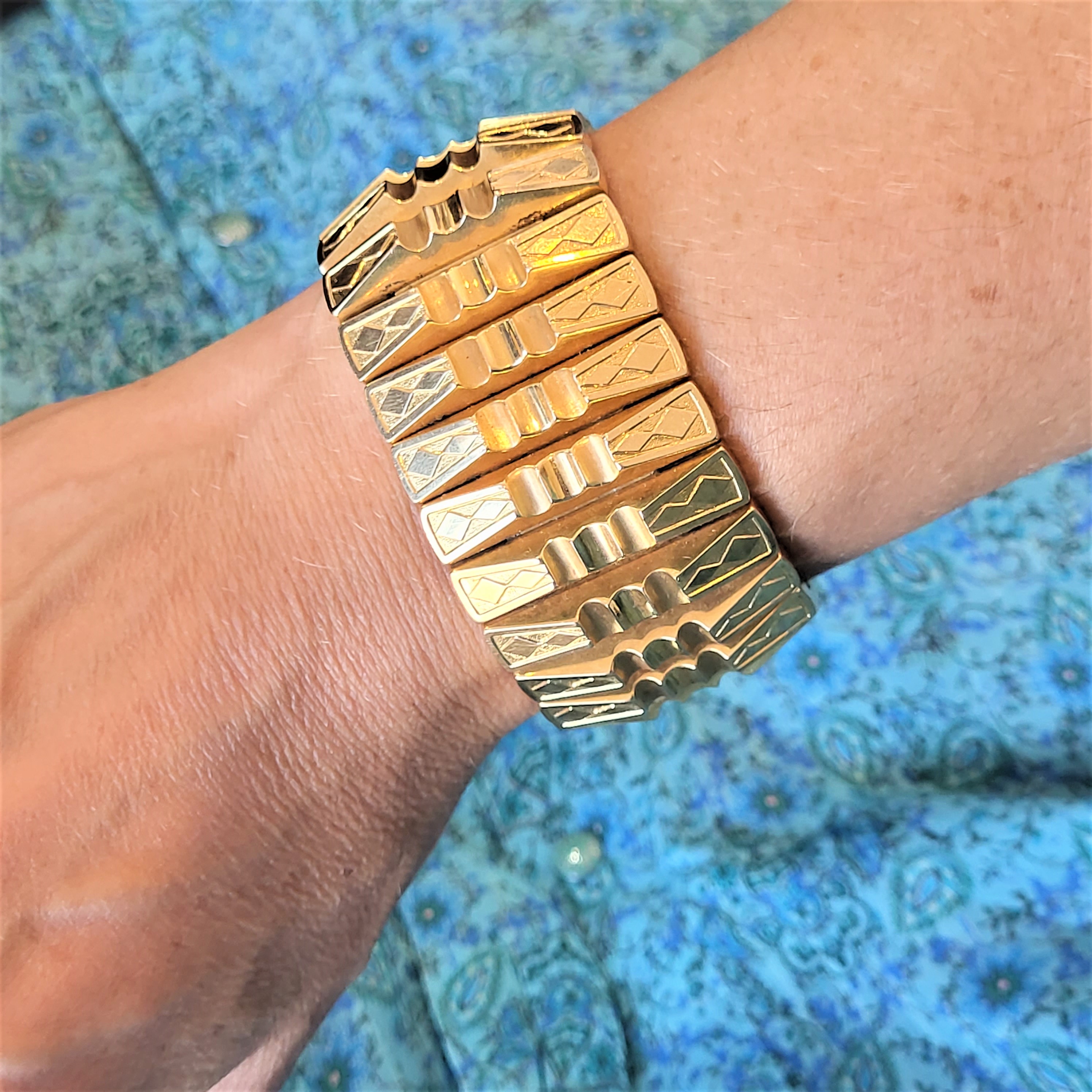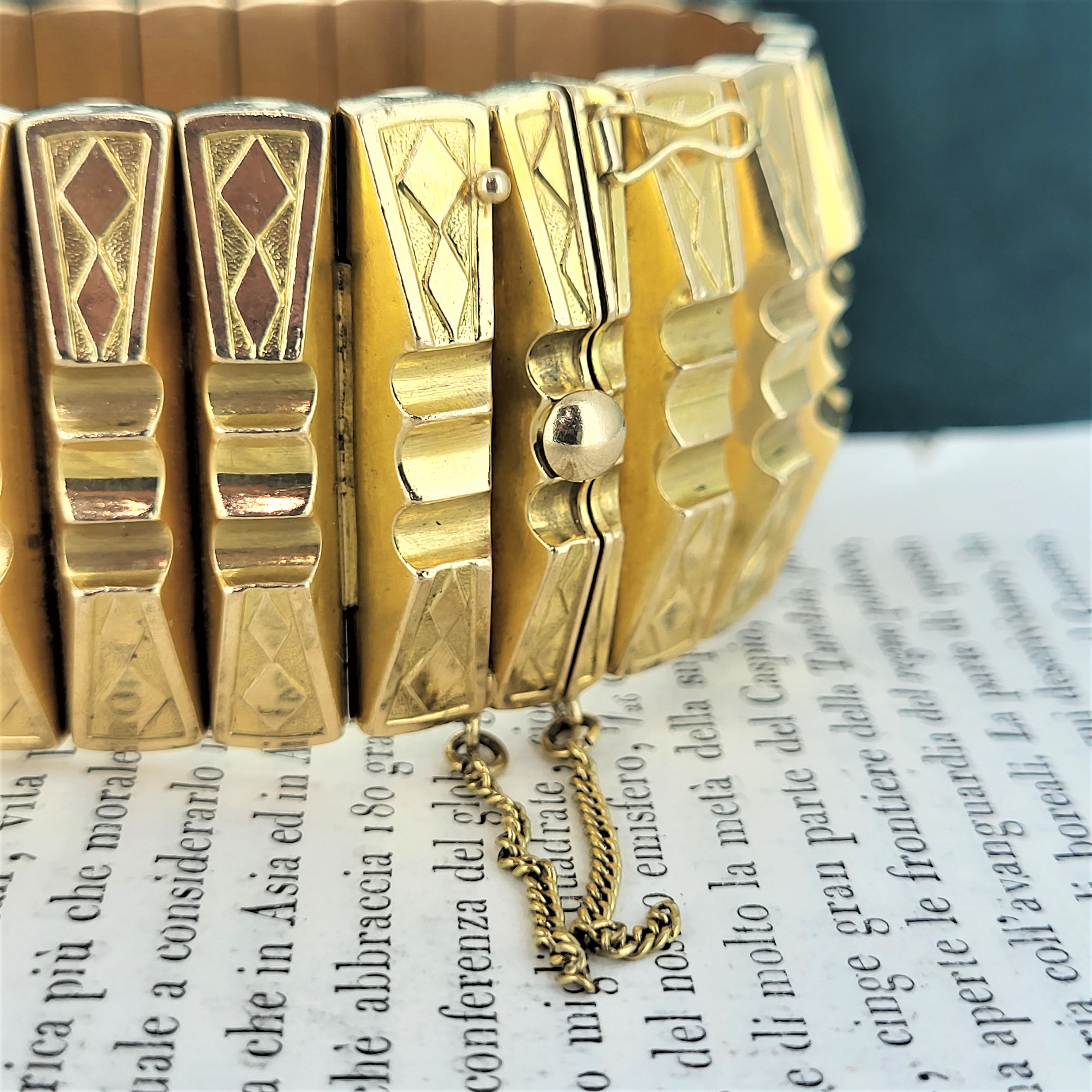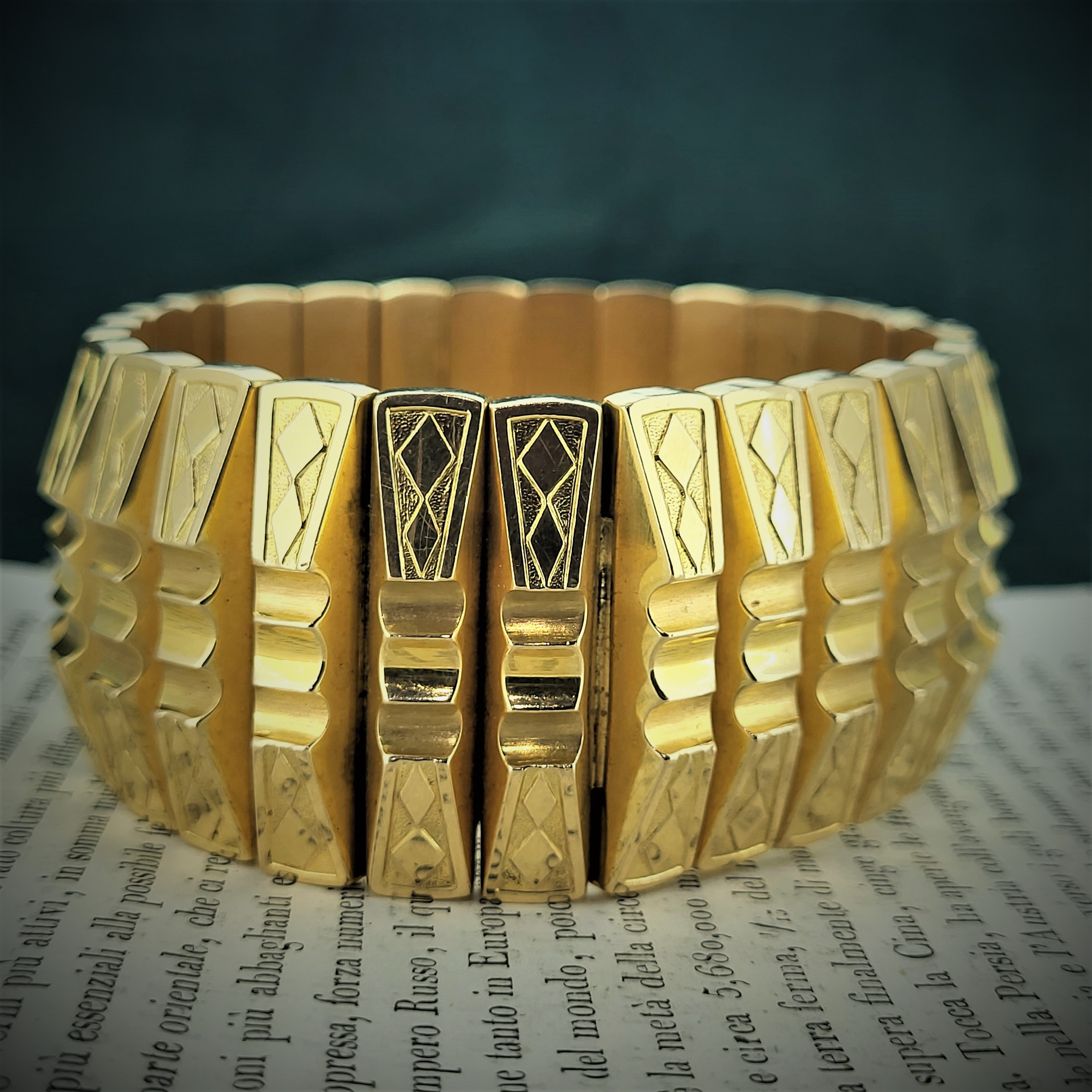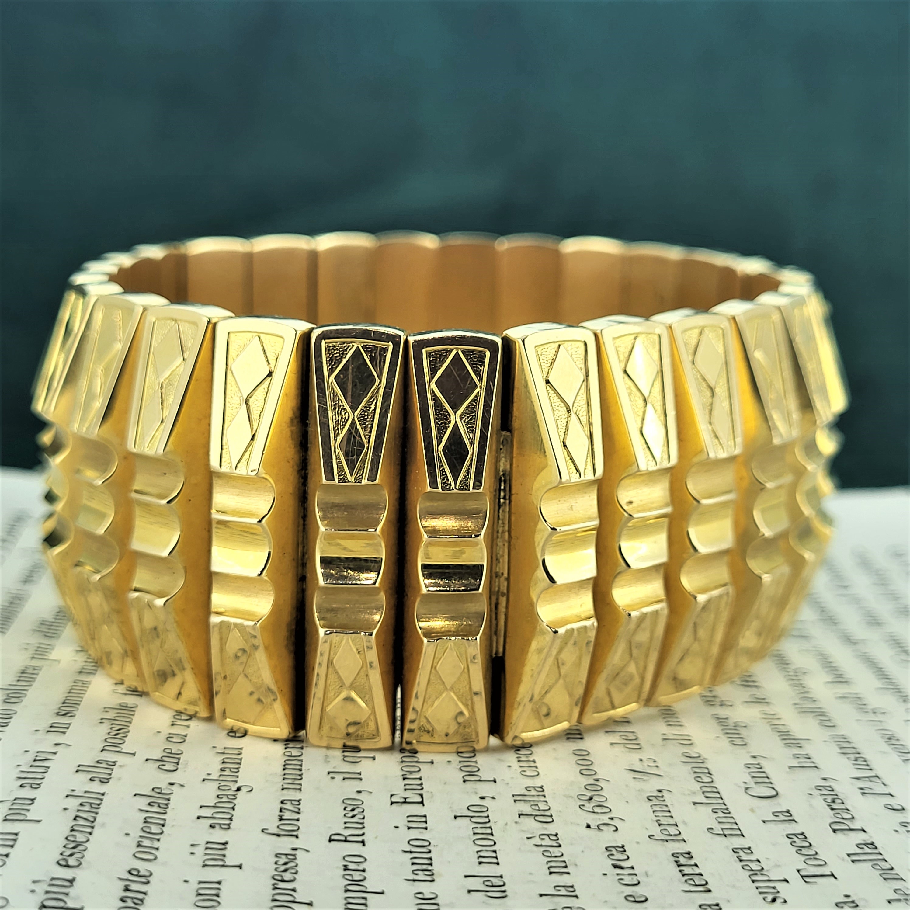 The bracelet is French and it features a symmetrical pattern around its entirety. It reminds us of the work by Marcel Boucher who began his career in Paris in the 1920s!