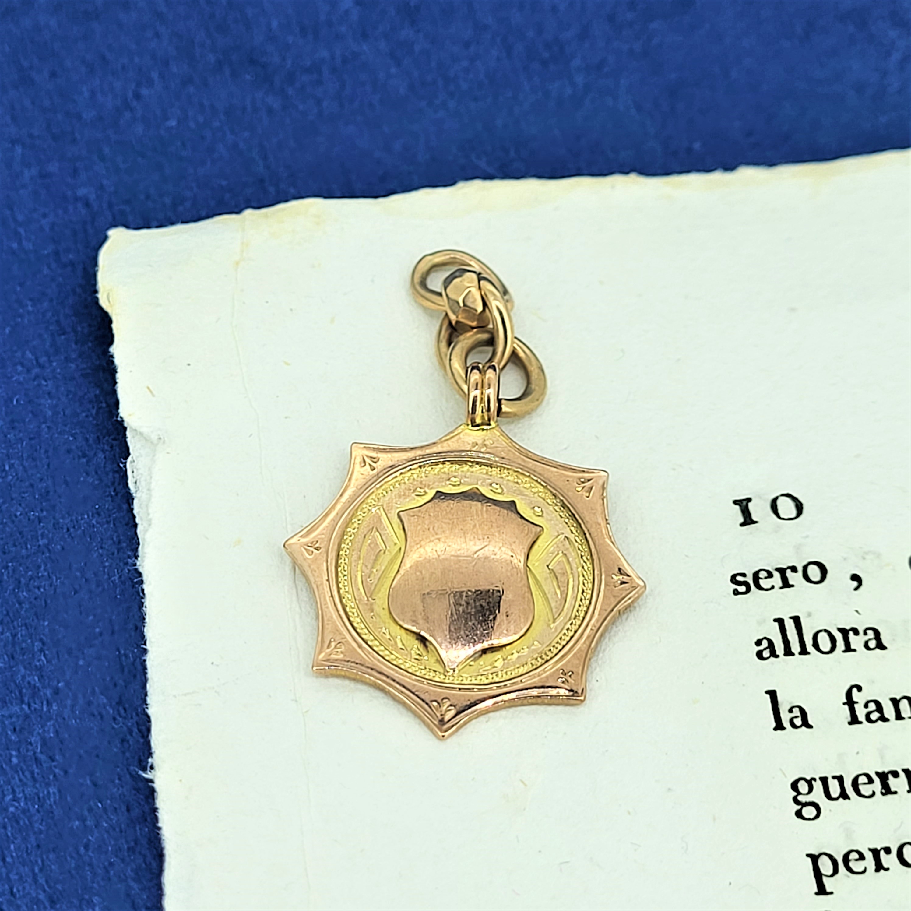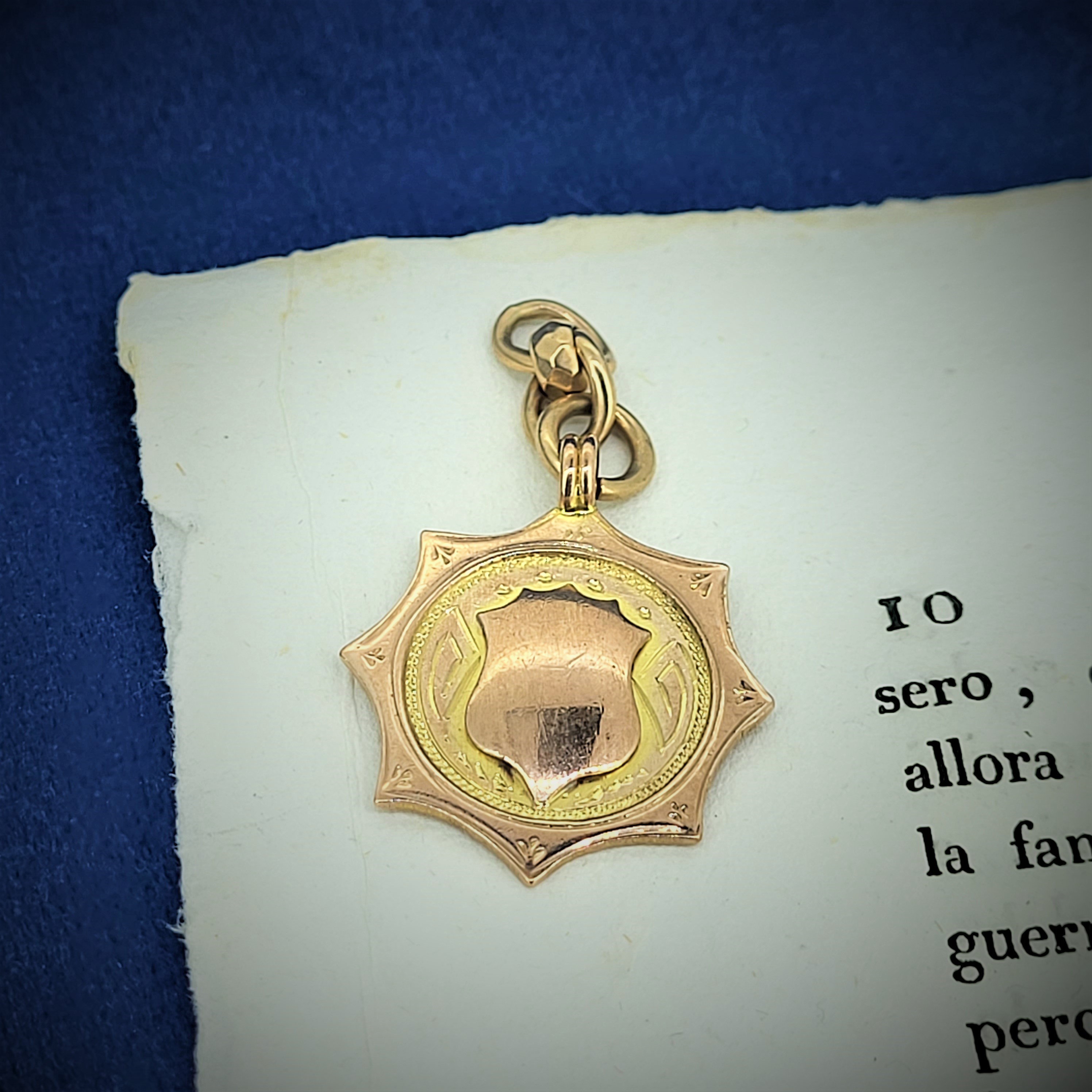 Shield watch fobs can be worn as pendants and are sometimes engraved with sporting achievements. This pendant measures 23mm by 23mm, weighs 2.7 grams and is in great condition!