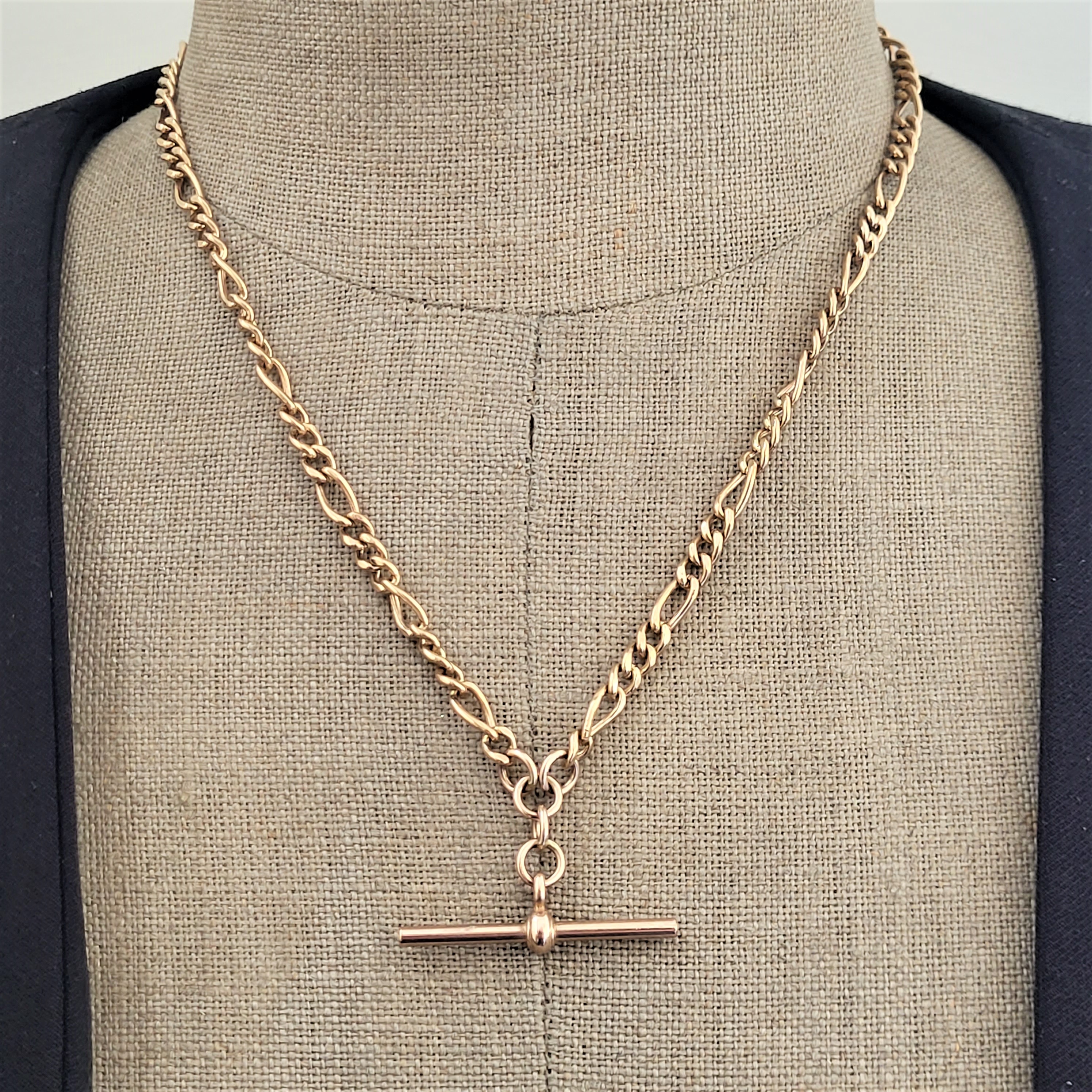 The links measures 4.5mm and are uniformed with the chain measuring 18 inches in length. It is fully hallmarked and features a double swivel fitting and a T-Bar that measures 35mm and hangs an additional 3/4 inch.
