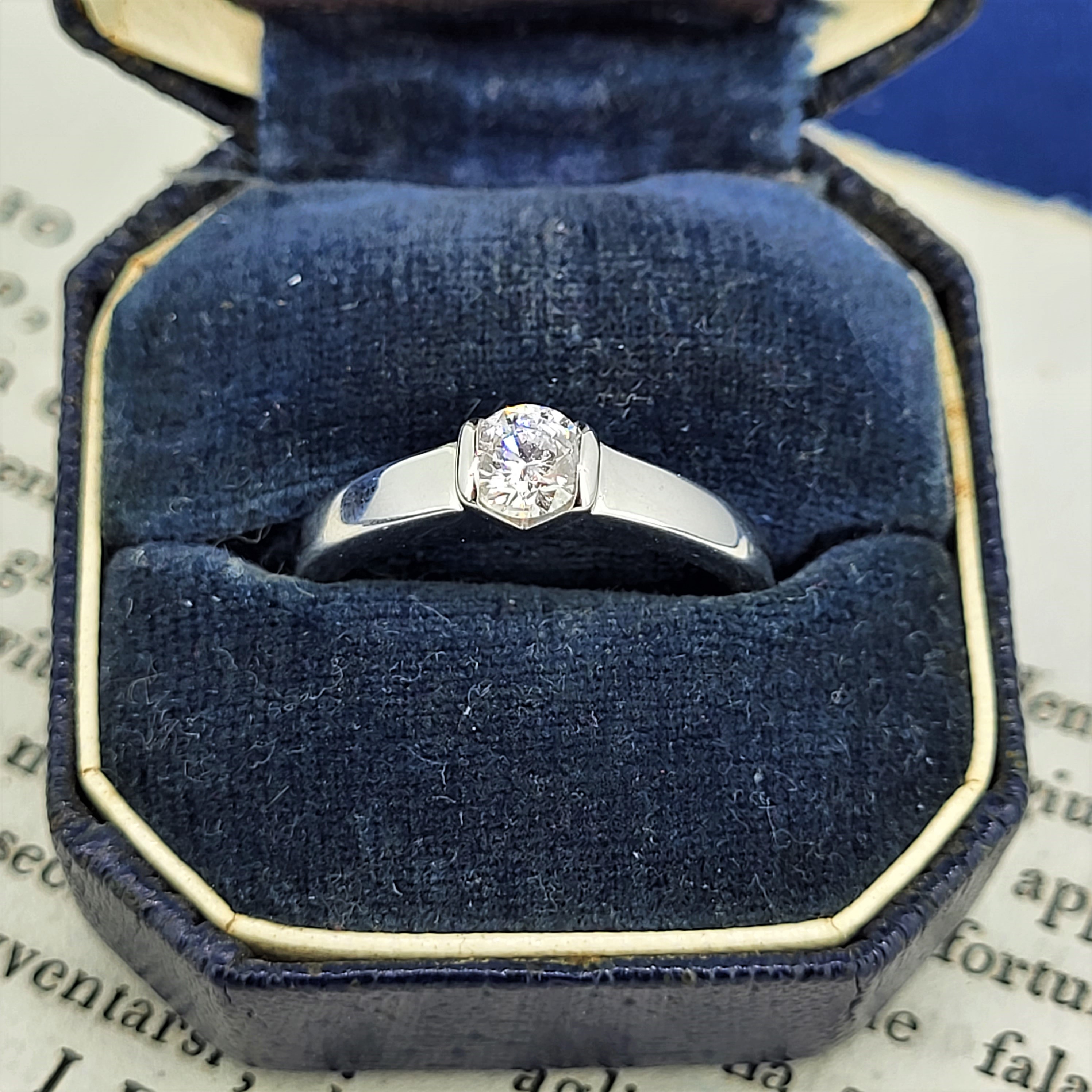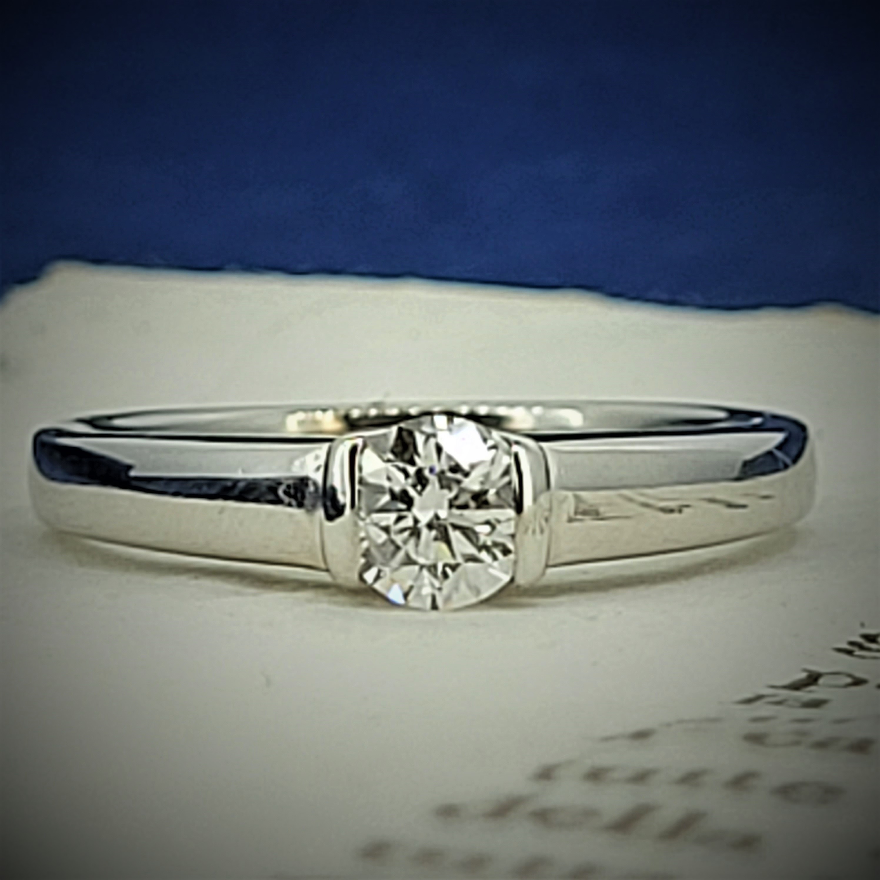 A beautifully sparkly 0.33ct diamond is tension set in a solid and weighty 18ct White Gold shank. The shank is slightly graduated measuring 3mm where it meets the diamond gradually reducing to the more traditional 2mm width. The diamond itself is tension set in a V style setting that sits 0.50cm above the finger. Unusually this ring is cast in a single piece adding weight and durability to a beautiful ring.