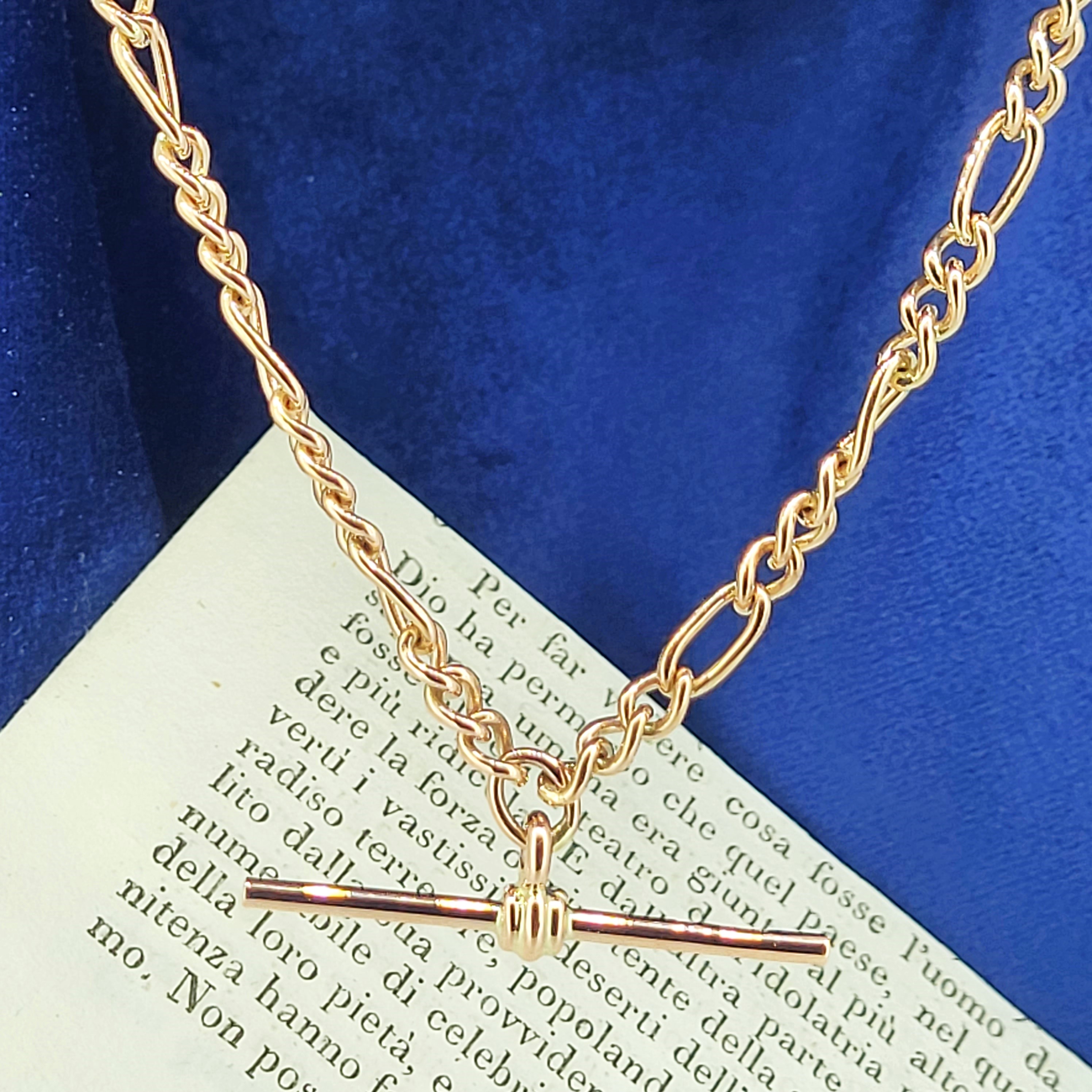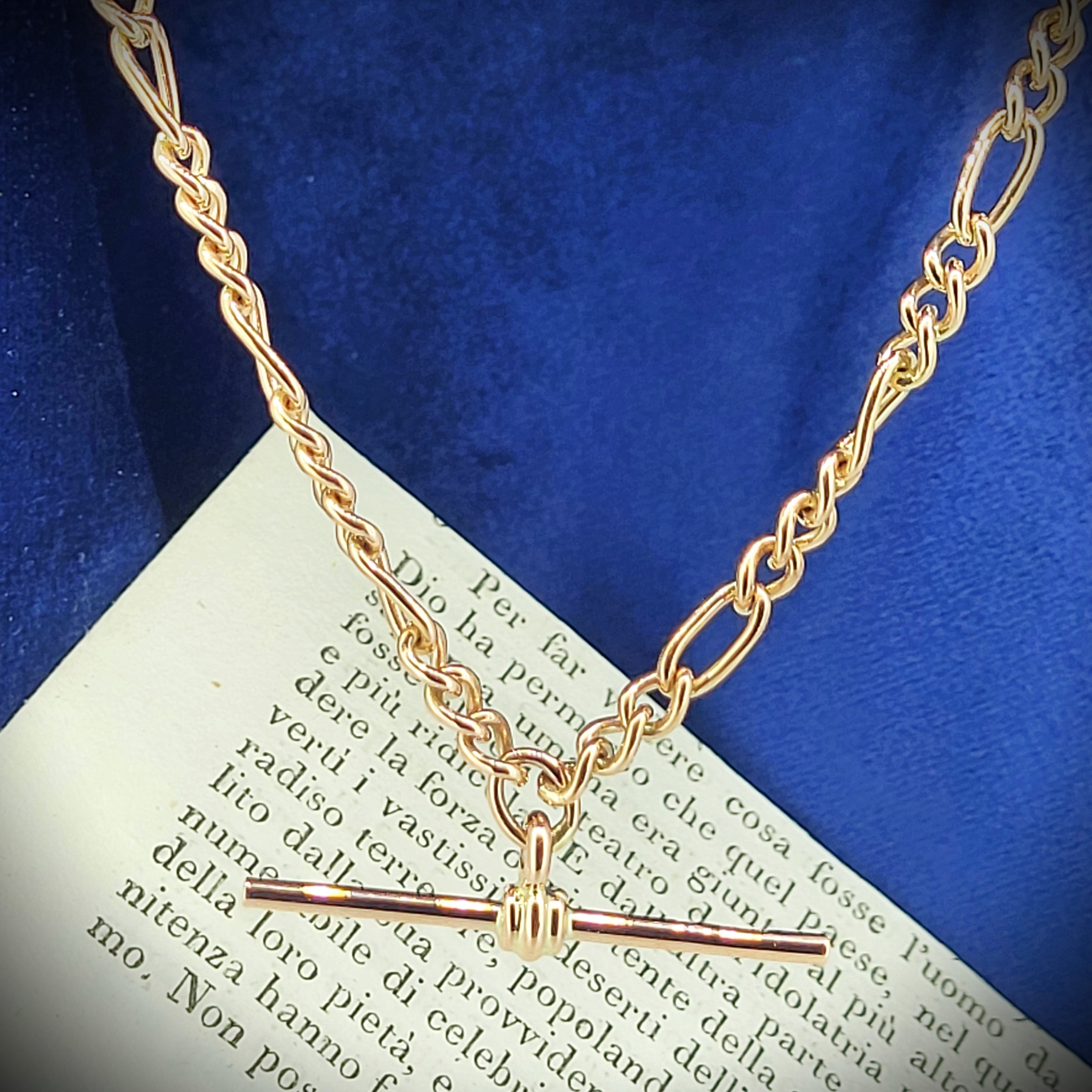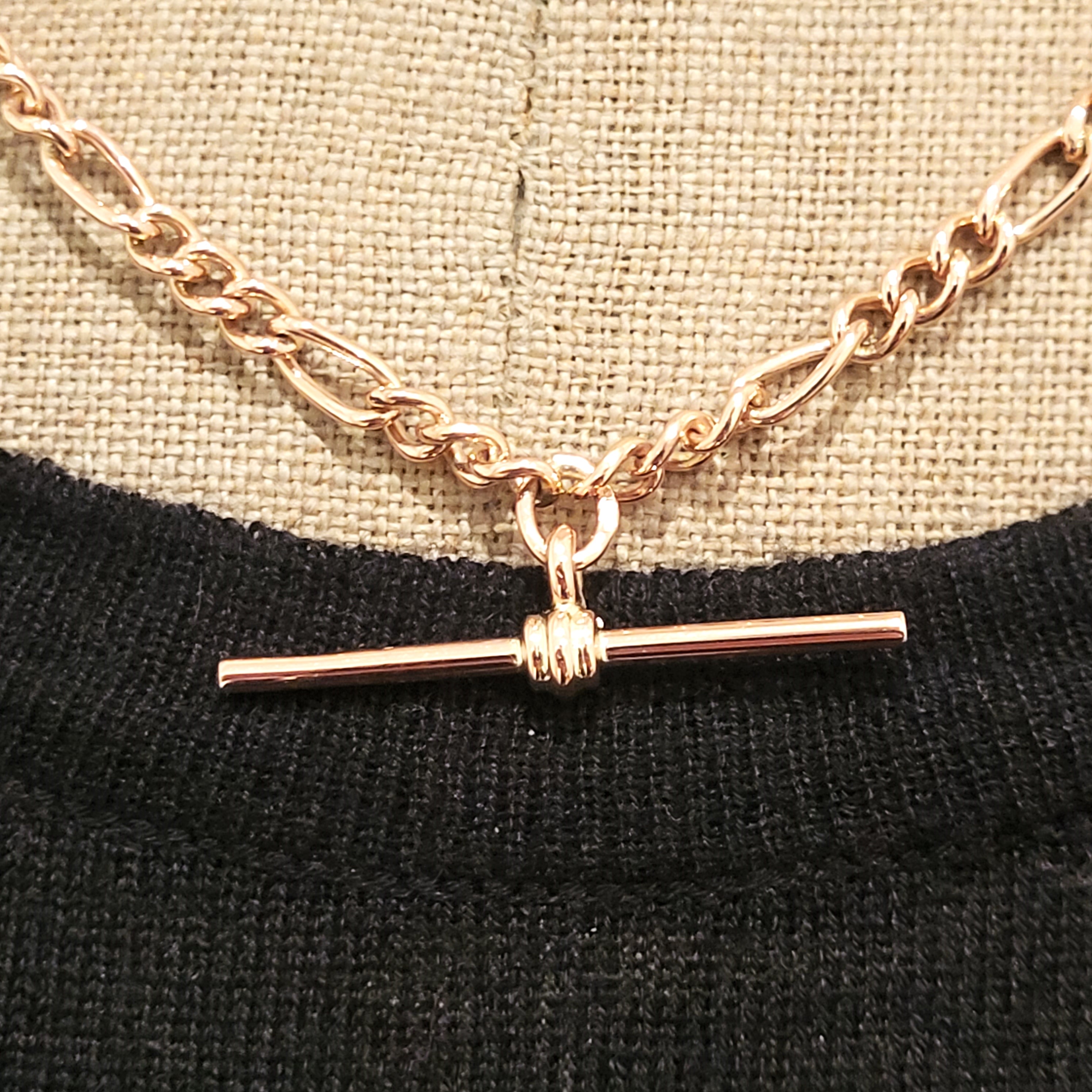 The hallmarked t-bar measures 38mm and is attached to a uniform 4.4mm figaro link.