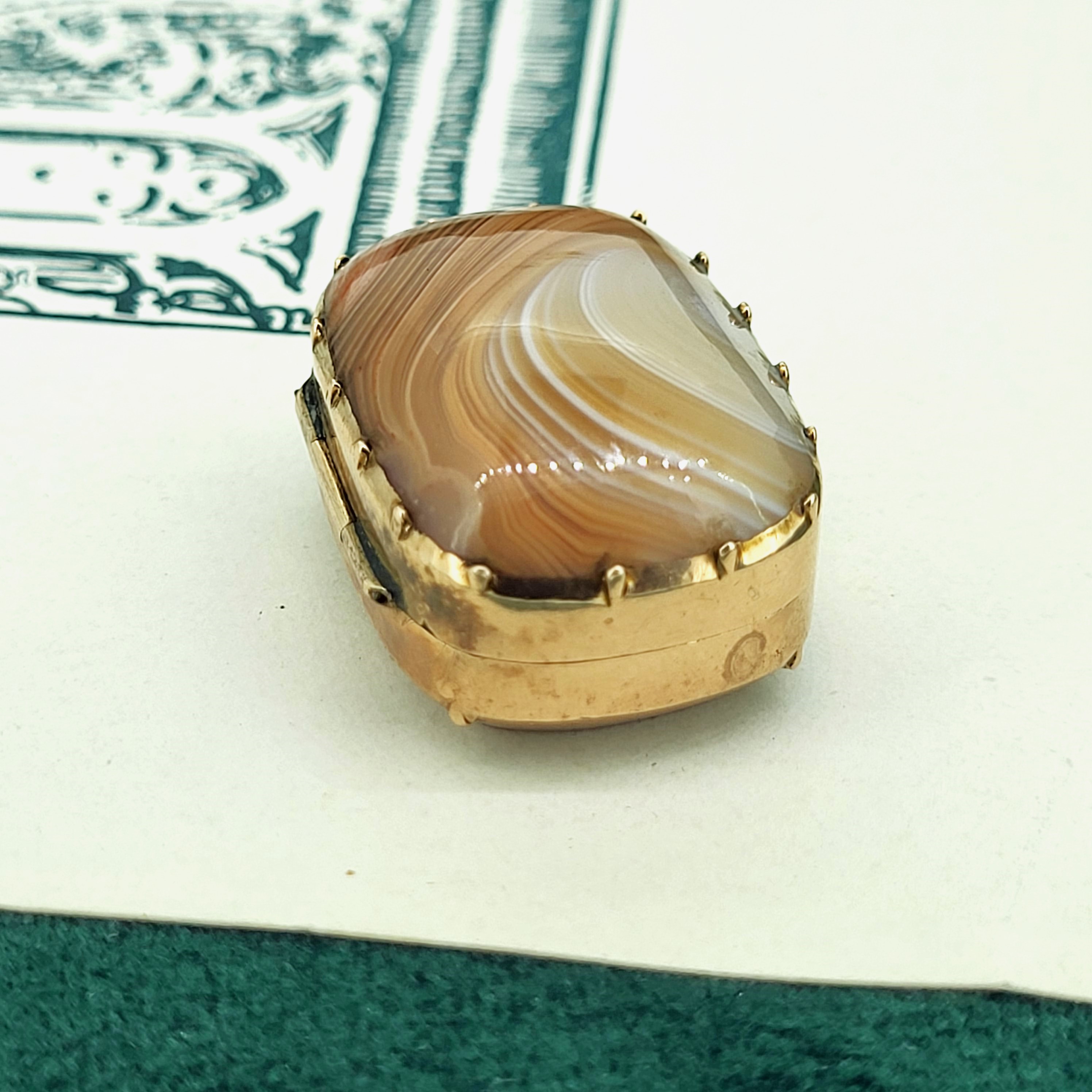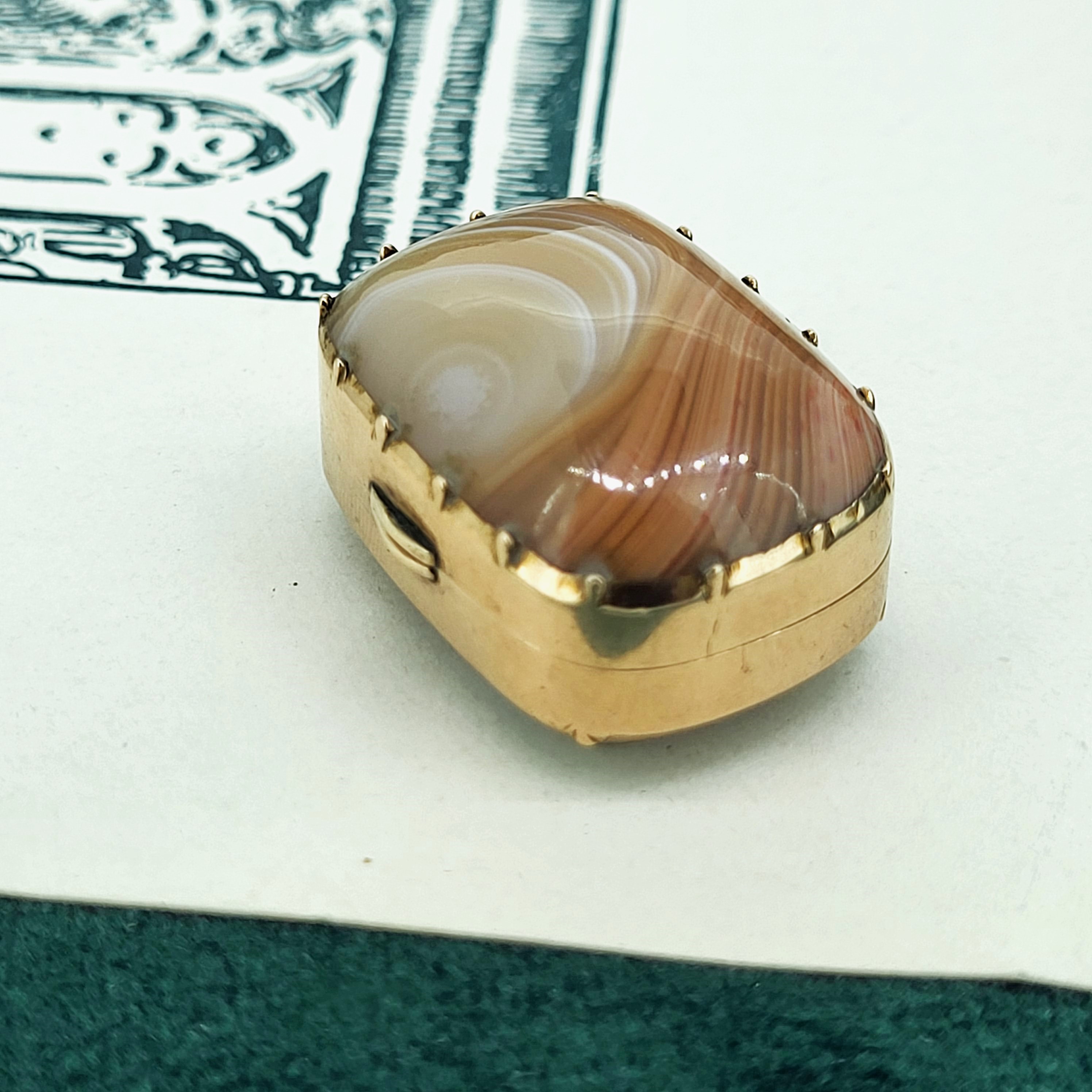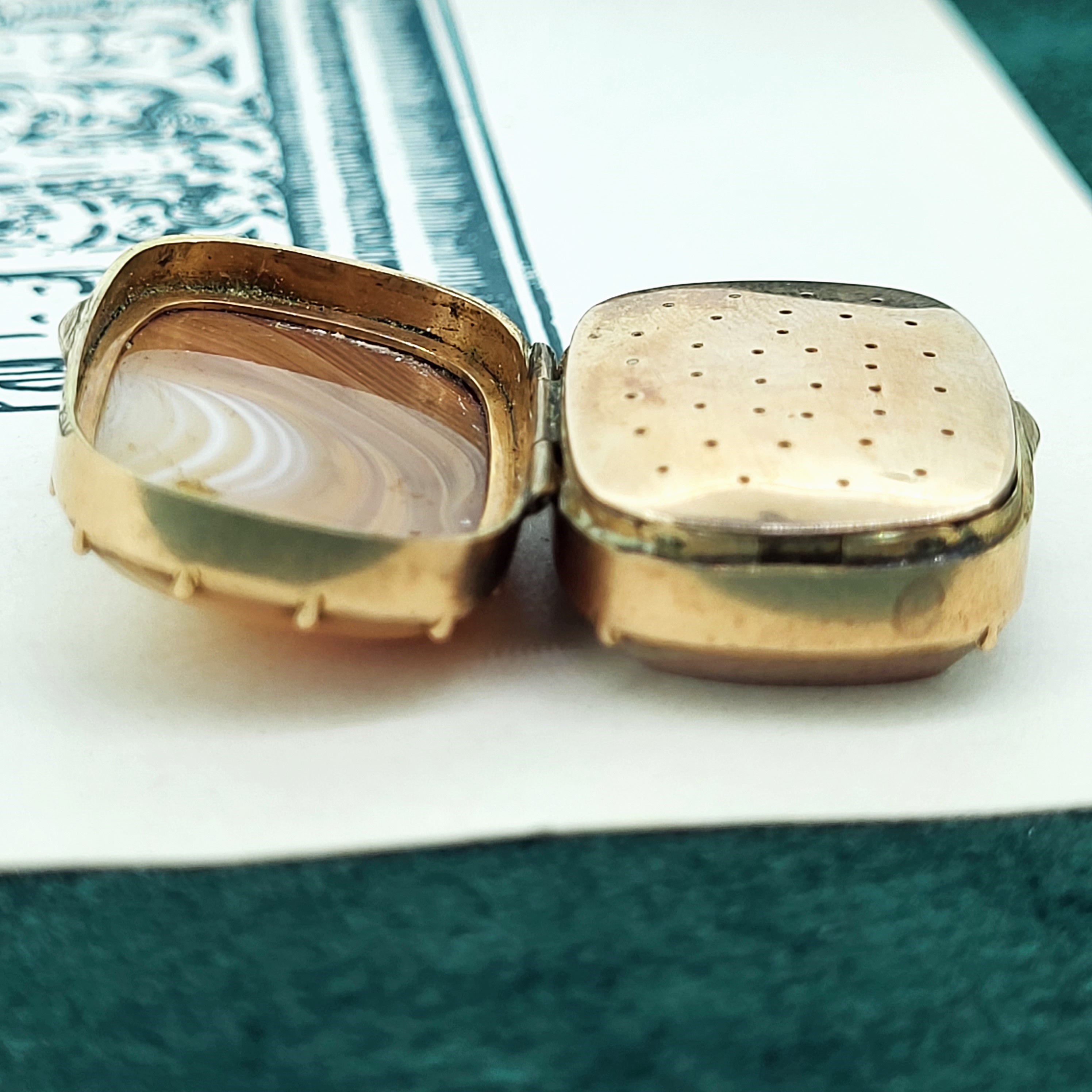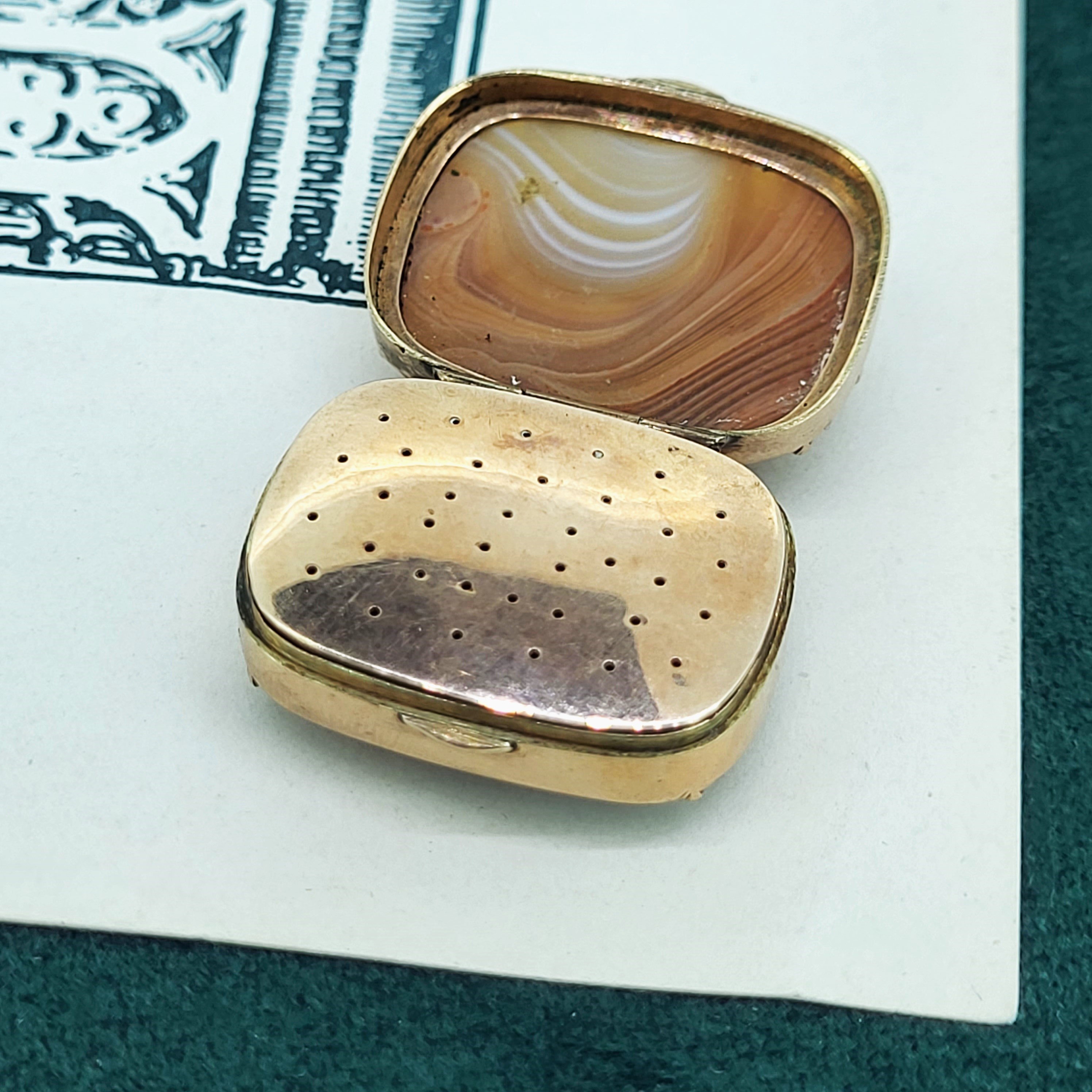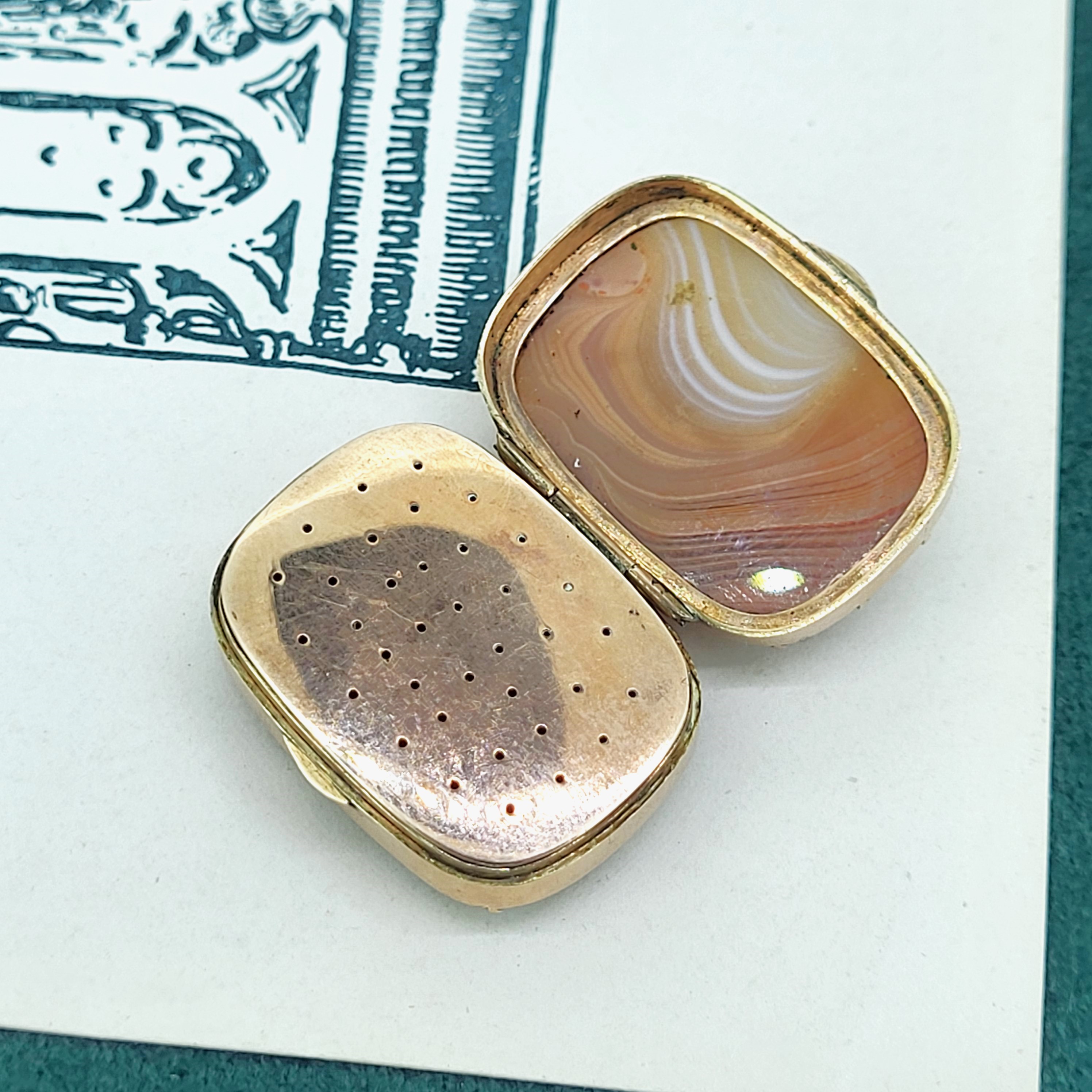 An Antique Vinaigrette crafted from 9ct Rose Gold. It features Scottish Banded Agate which looks beautifully semi translucent.