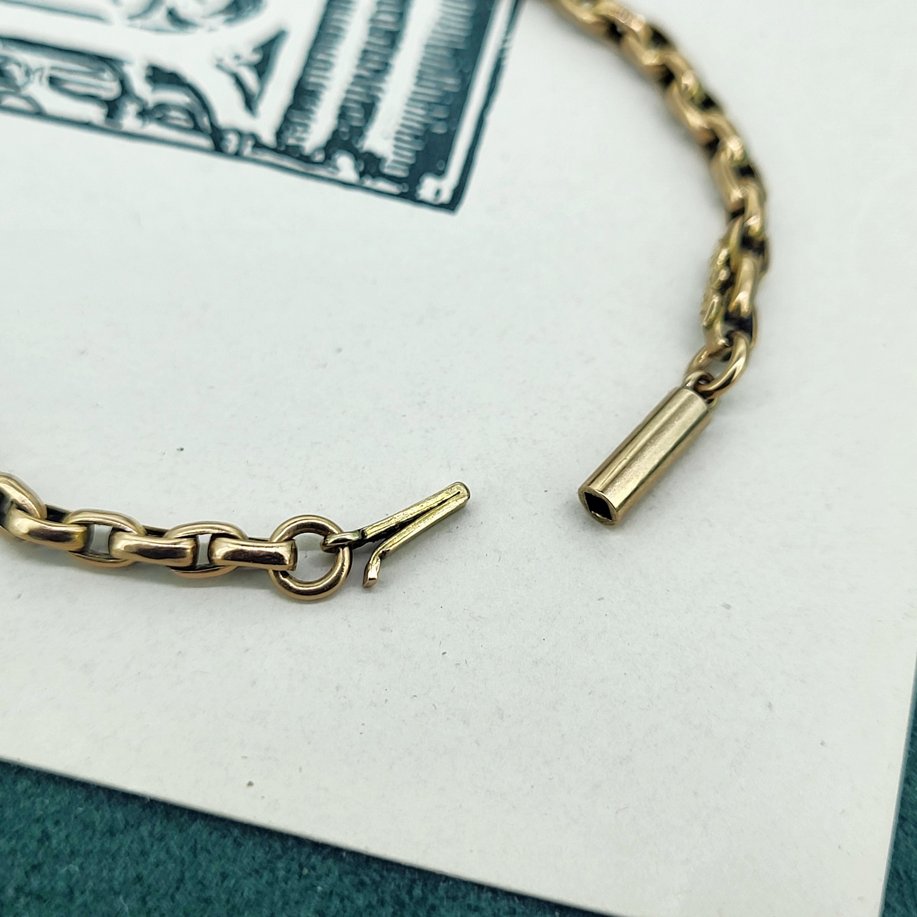 It is secured by a smooth tube shaped clasp where you push the tongue in and then press the button for it to be released. It is unusual to see a belcher link chain with this type of clasp fitting but it just adds something unique to this traditional design.
