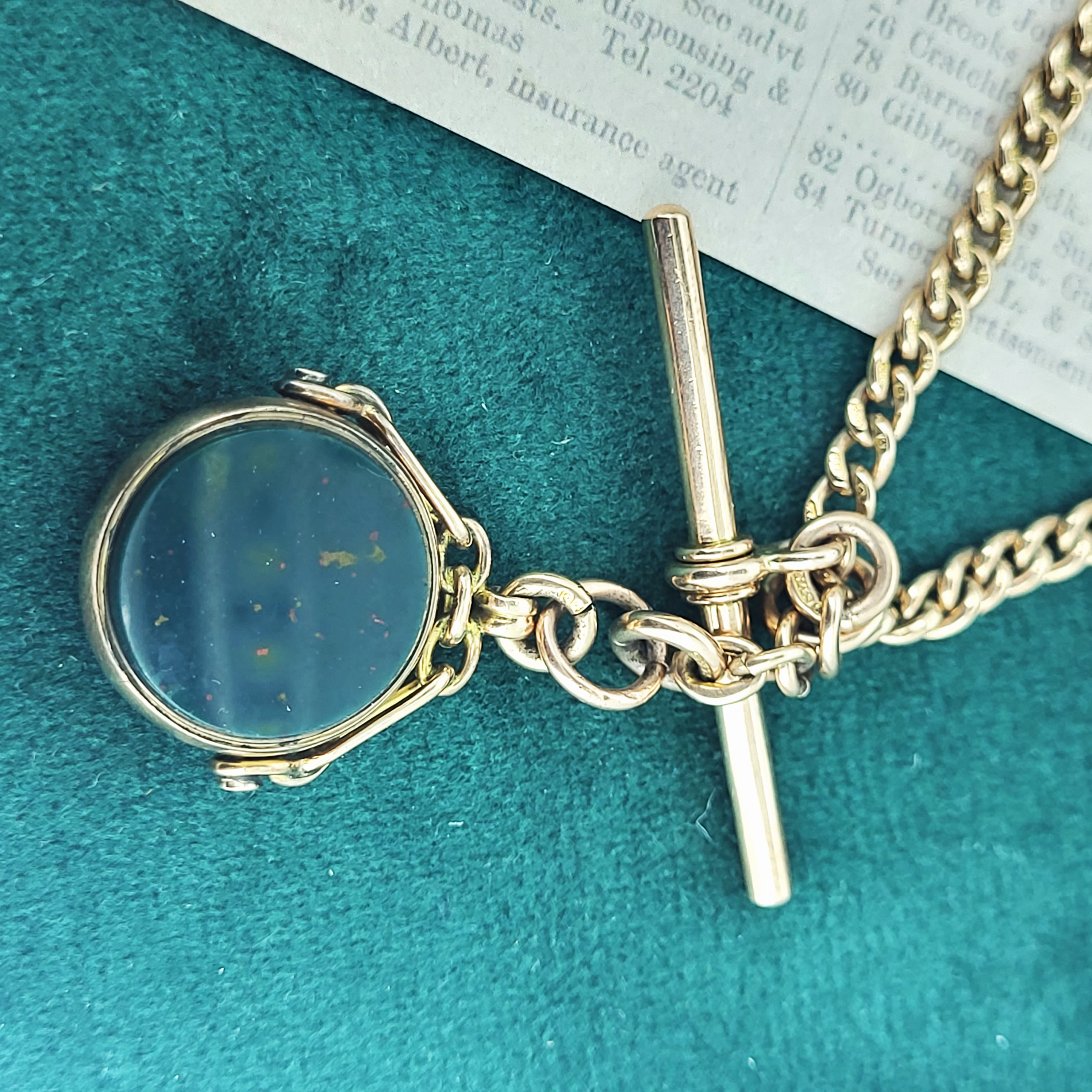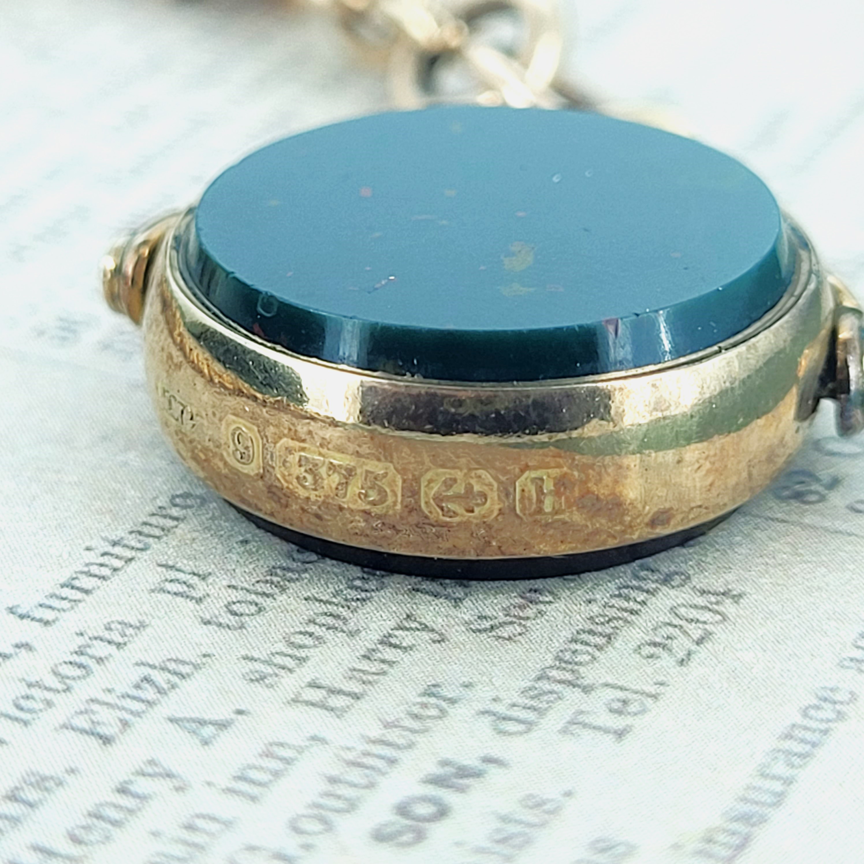 The fob was hallmarked by M W & J during 1932 and 1933. The fob has two gemstones set, one is a Bloodstone and the other is Cornelian.