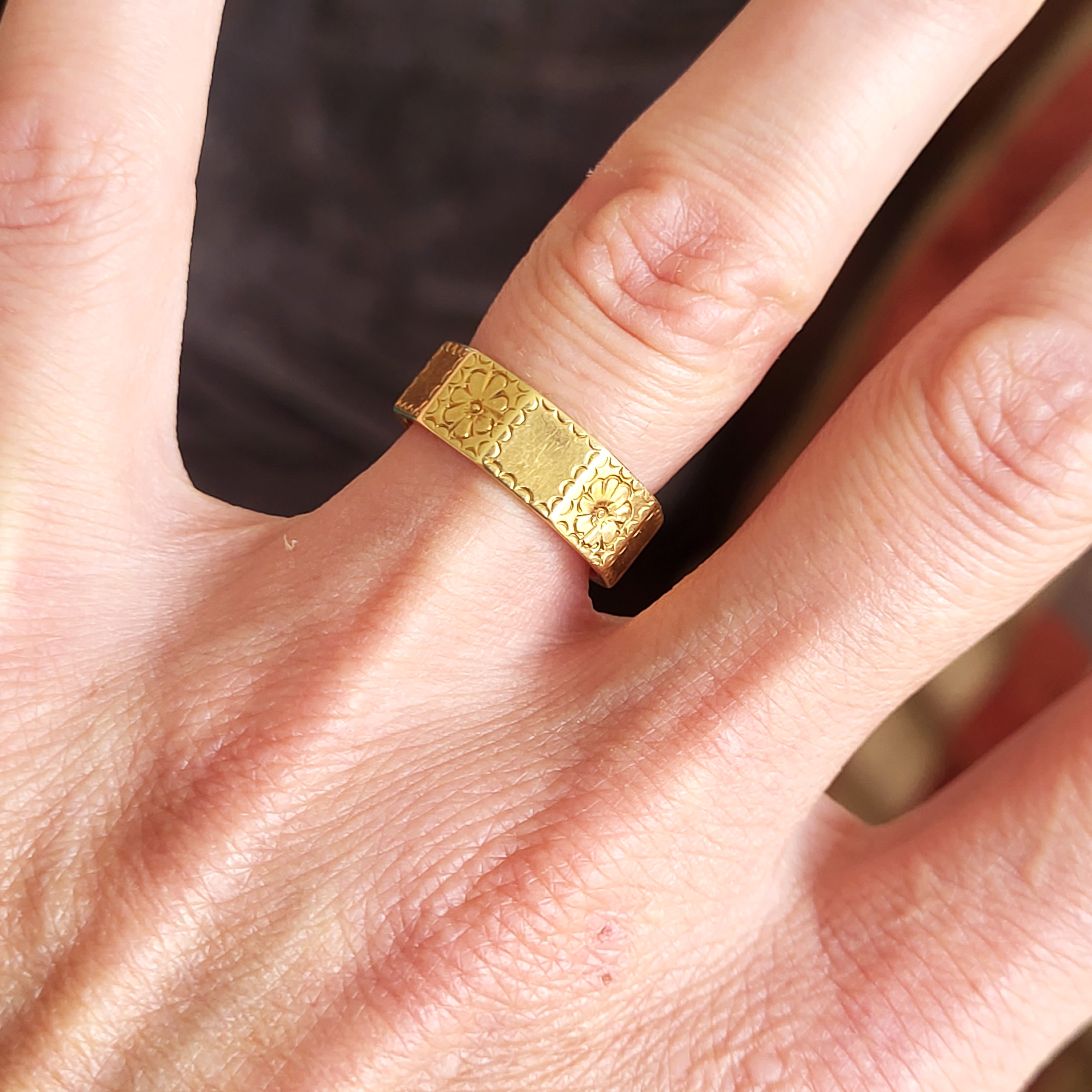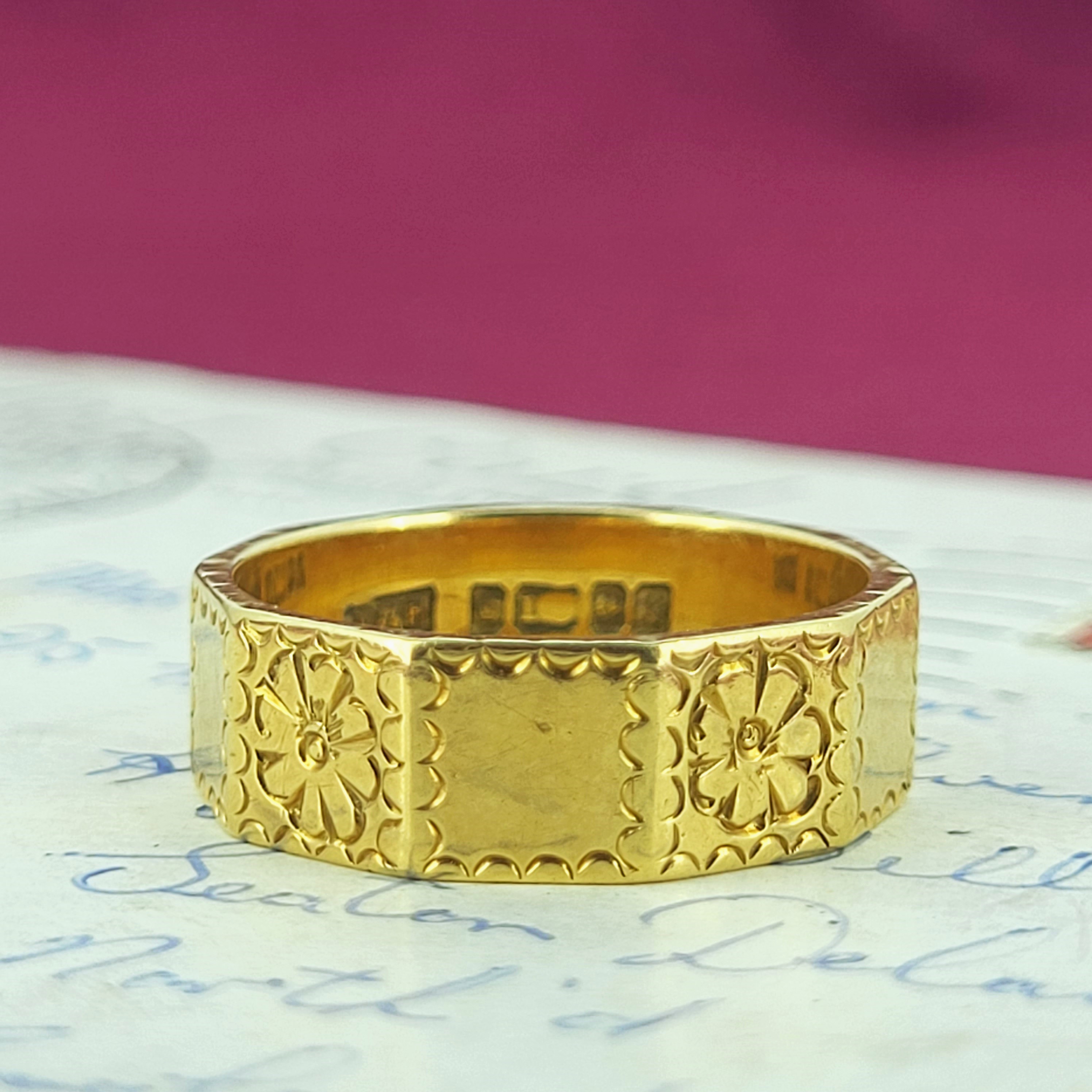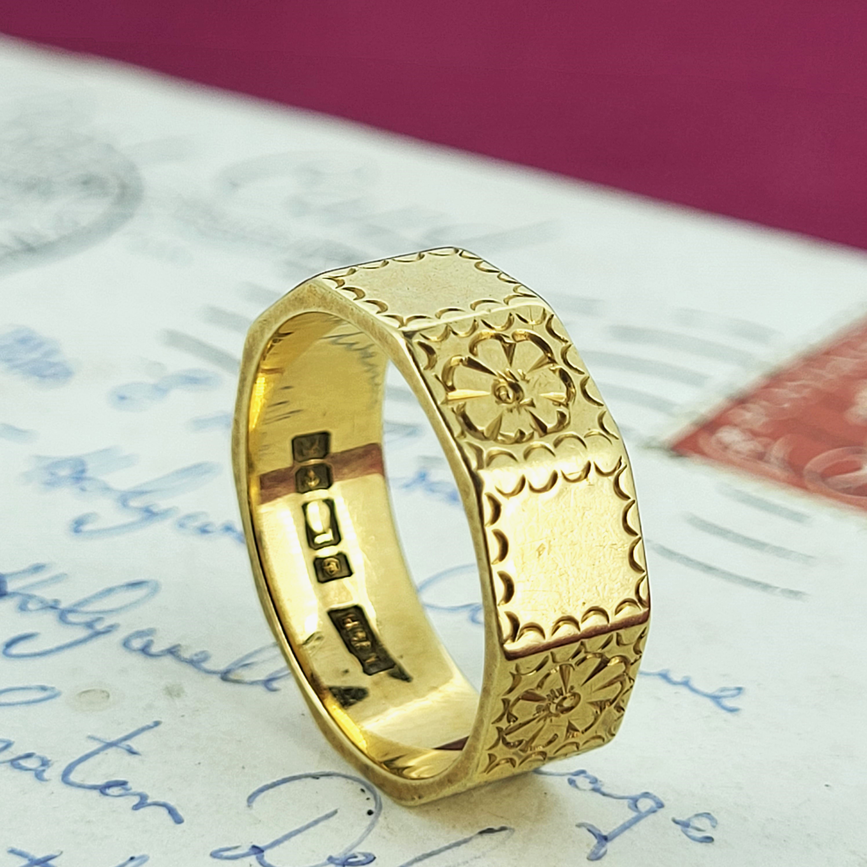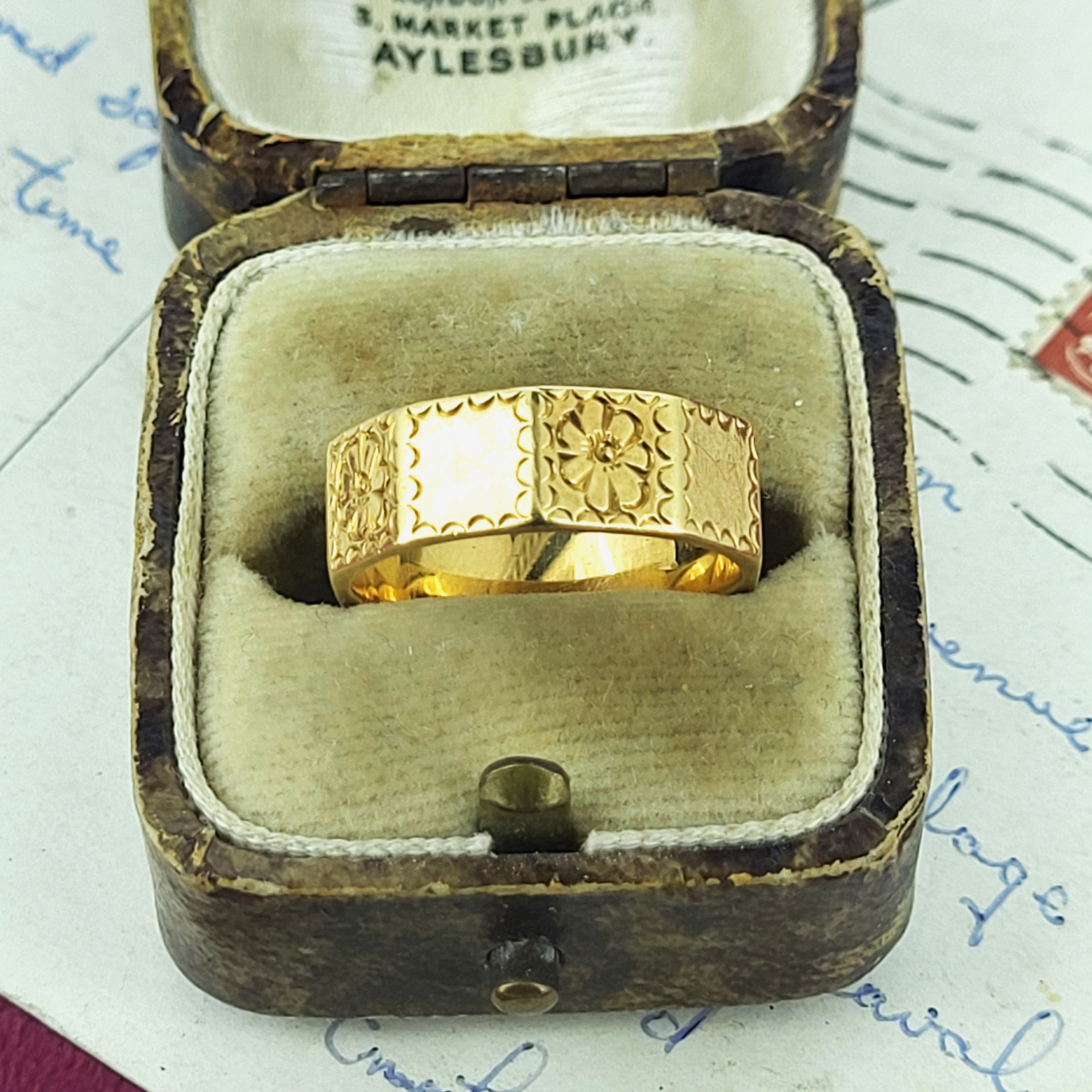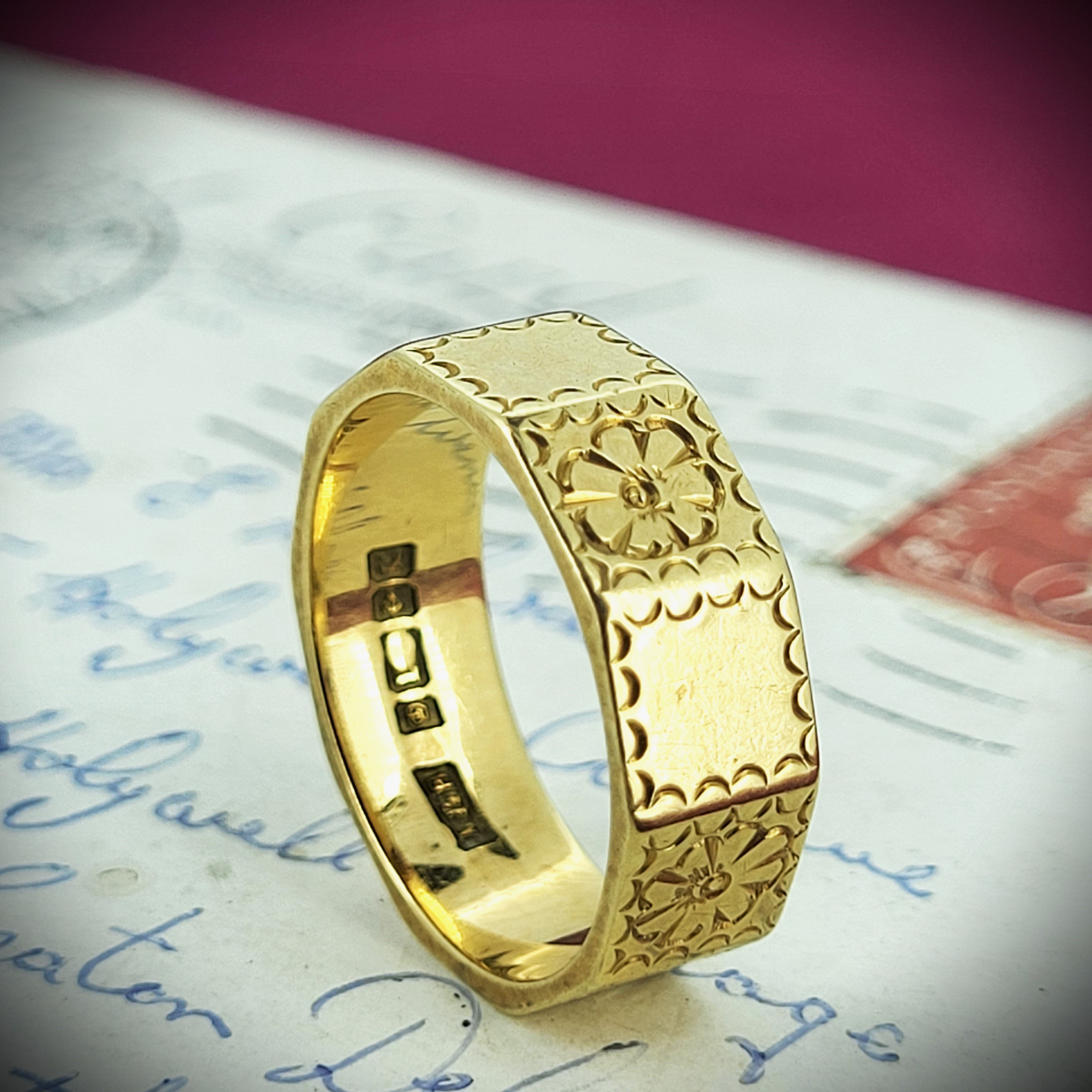 A touching find, this antique 18ct yellow gold wedding ring has been hand engraved by a clever artisan with a sweet design of flowers and frills. This is an absolute delight to wear and looks gorgeous as the principal piece or could make the perfect partner to a vintage collection.