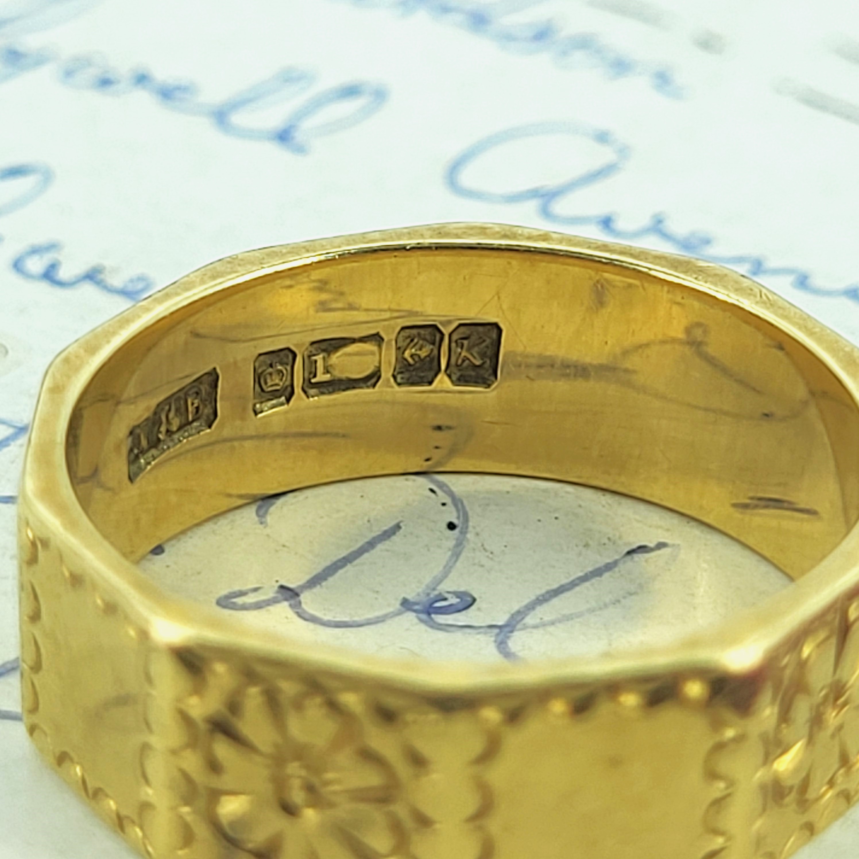 Hallmarked in Birmingham in between 1959 and 1960 by the makers J and B with a width of 6.5mm. Size O and due to its design cannot be sized.