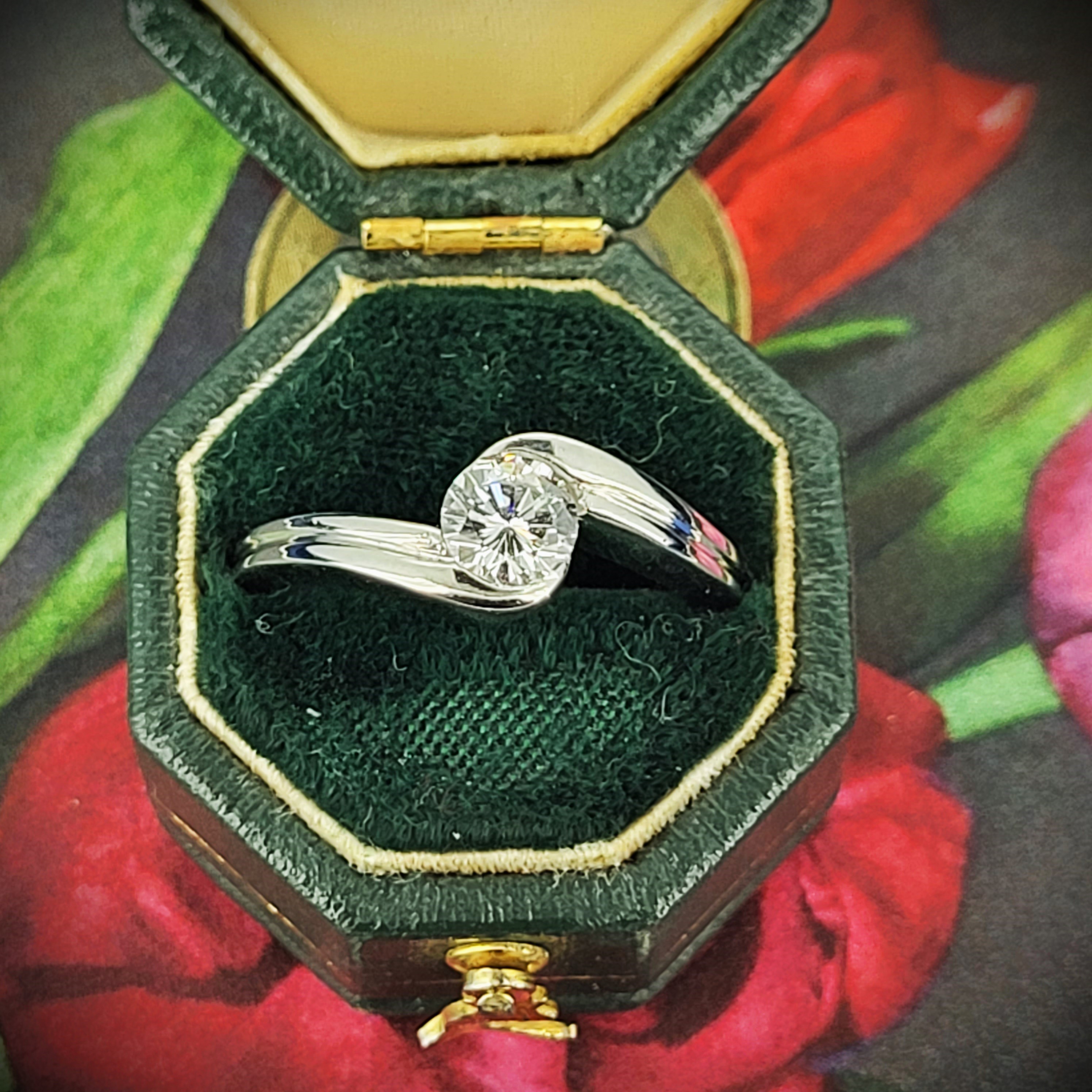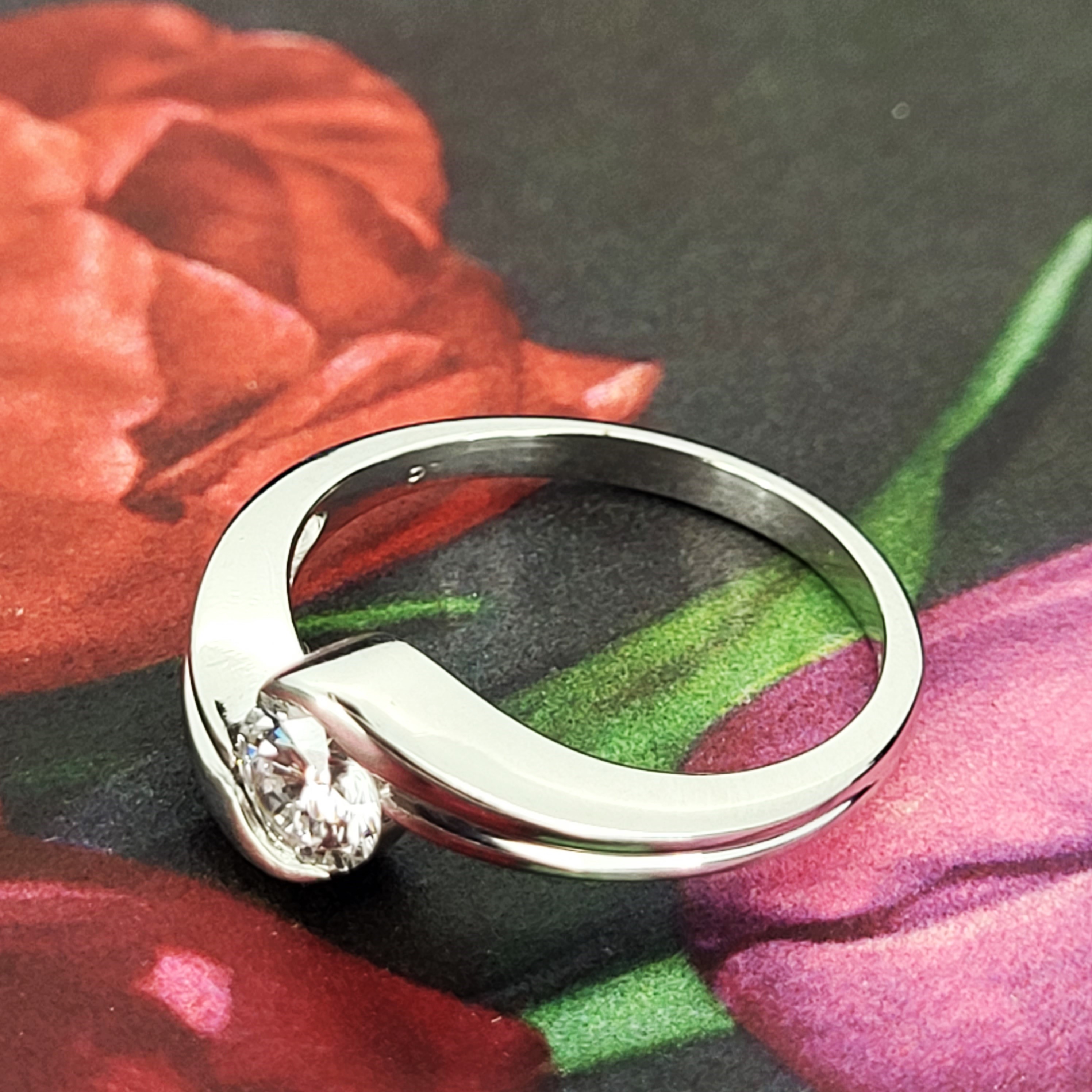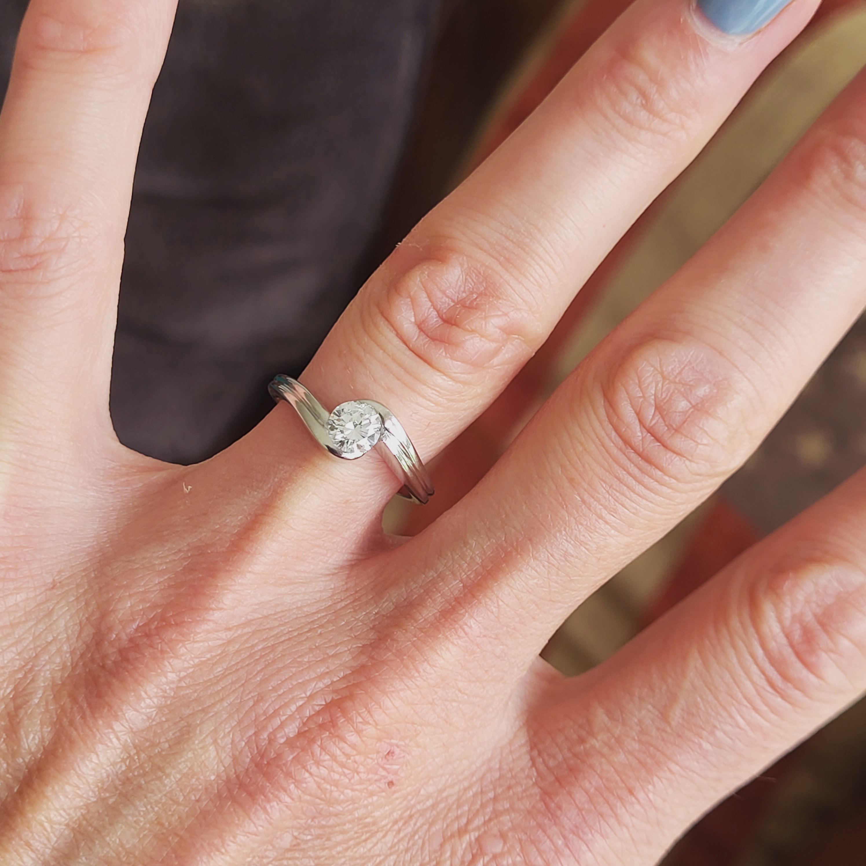 The diamond is tension set between the twists making the setting nice and smooth and the diamond dazzles!