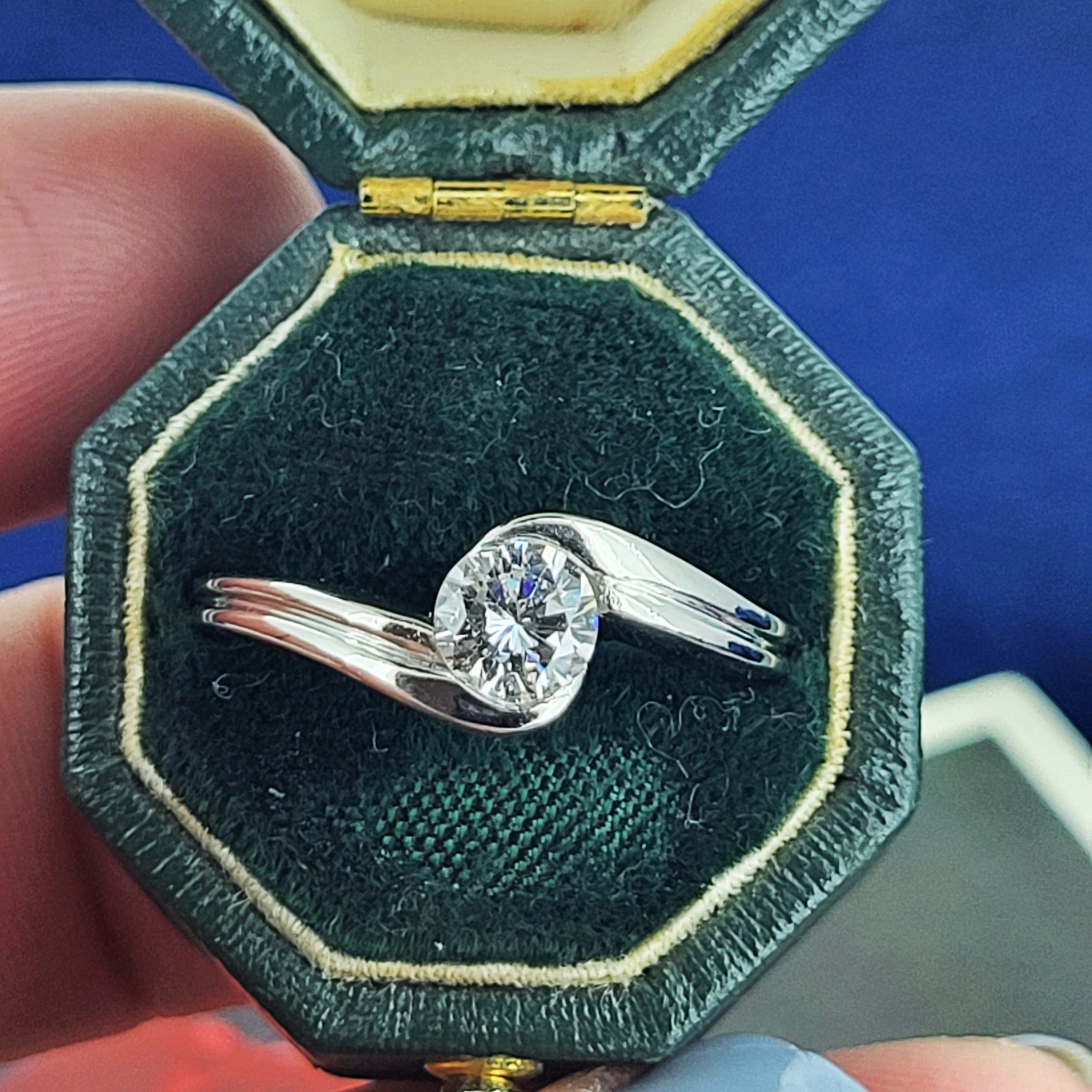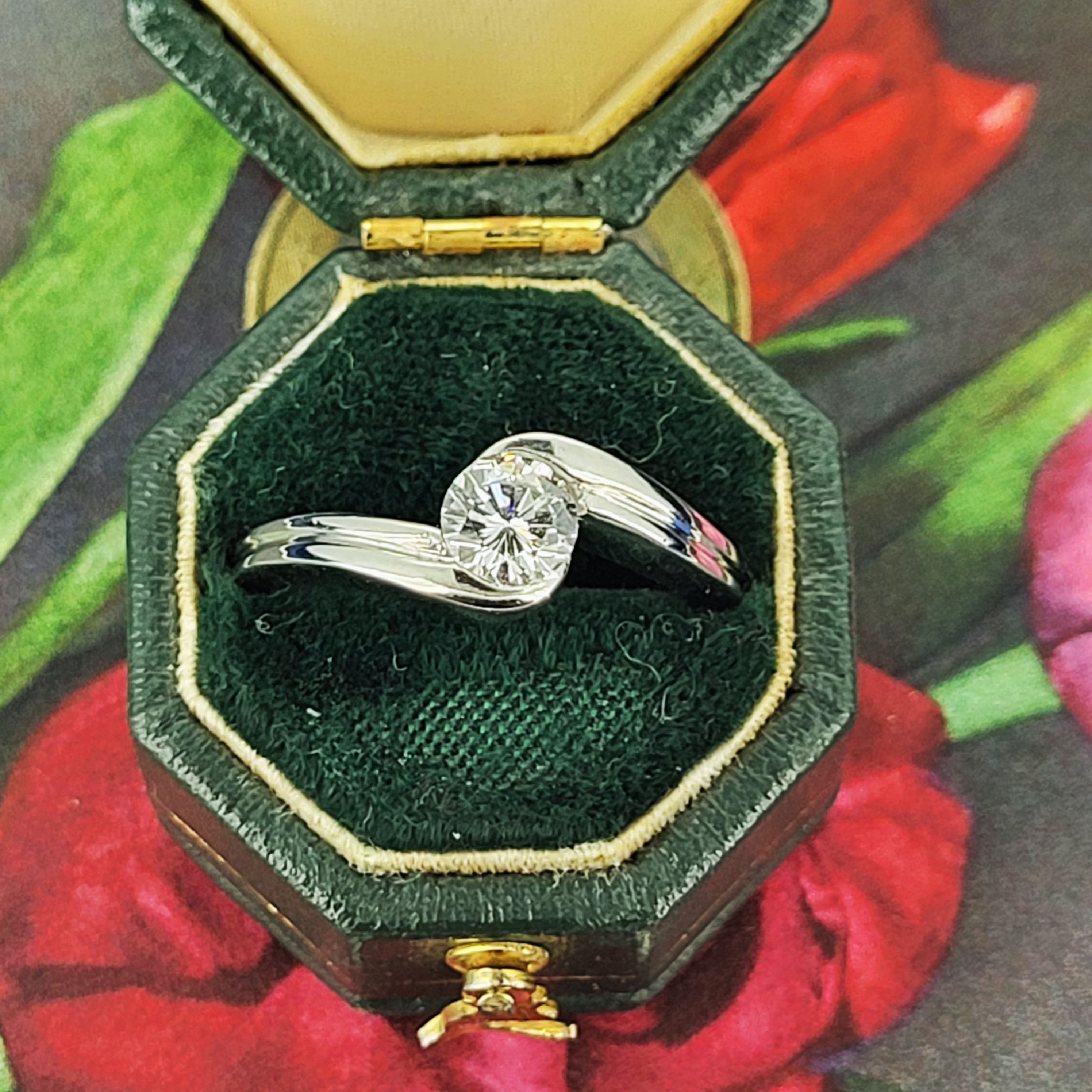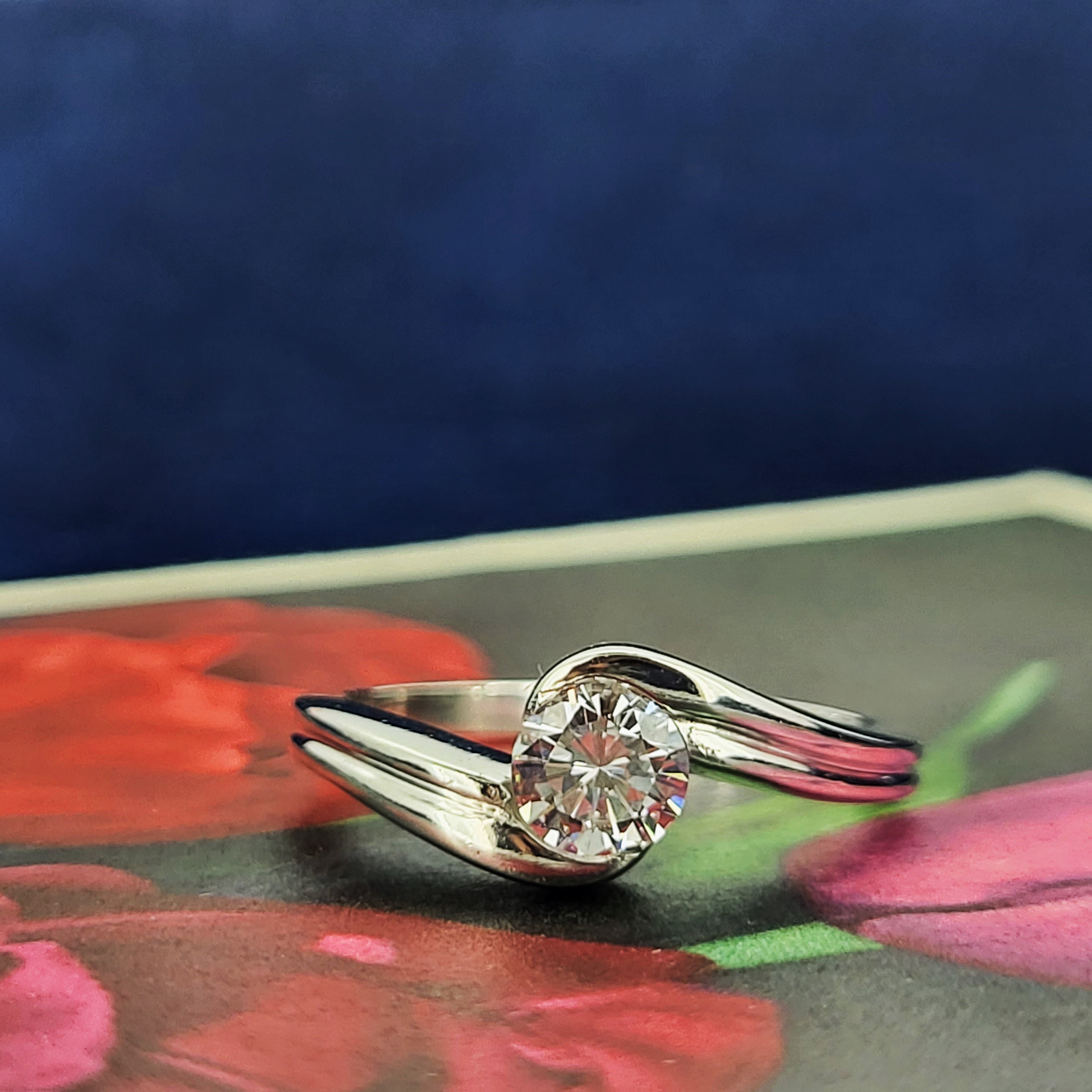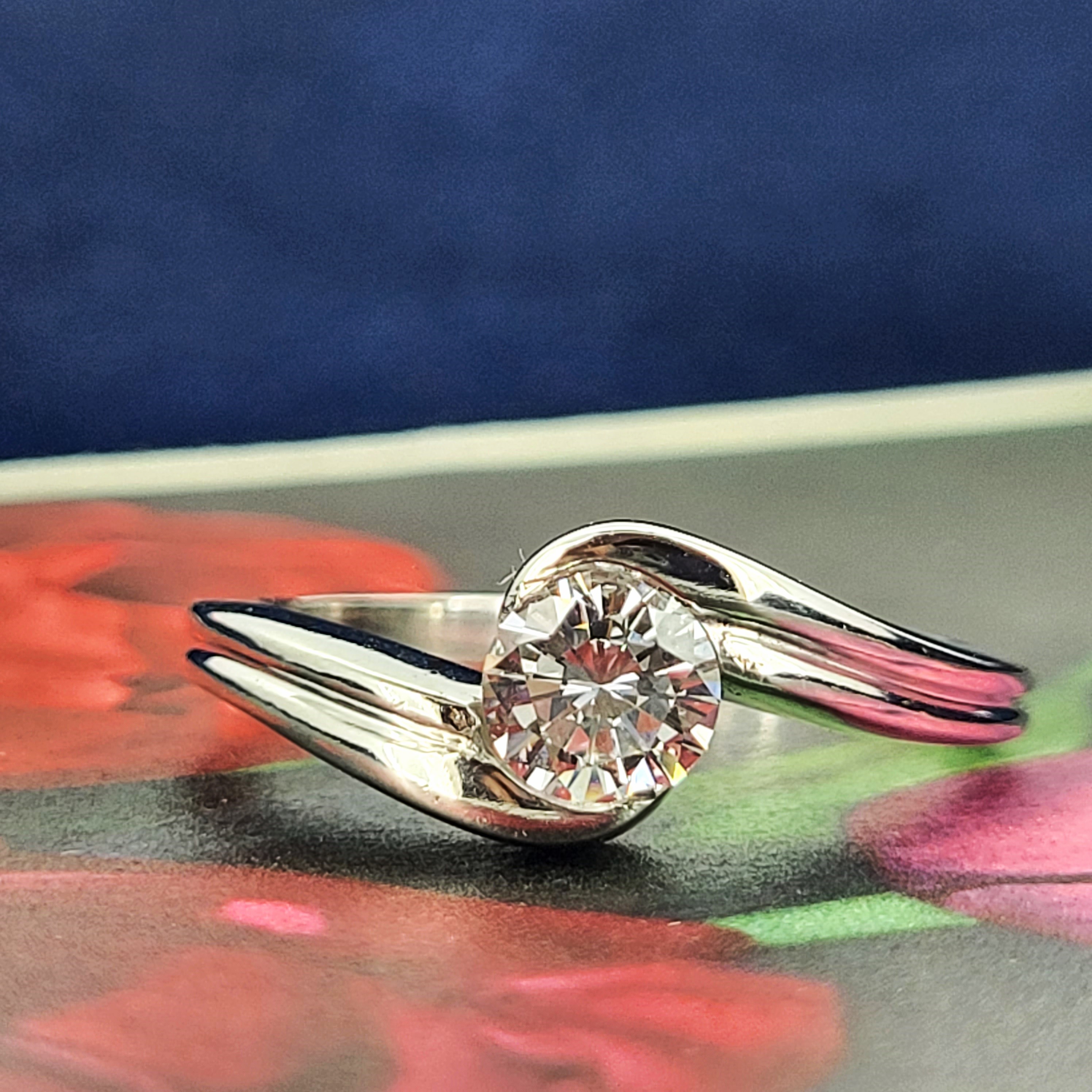 The diamond is tension set between the twists making the setting nice and smooth and the diamond dazzles!