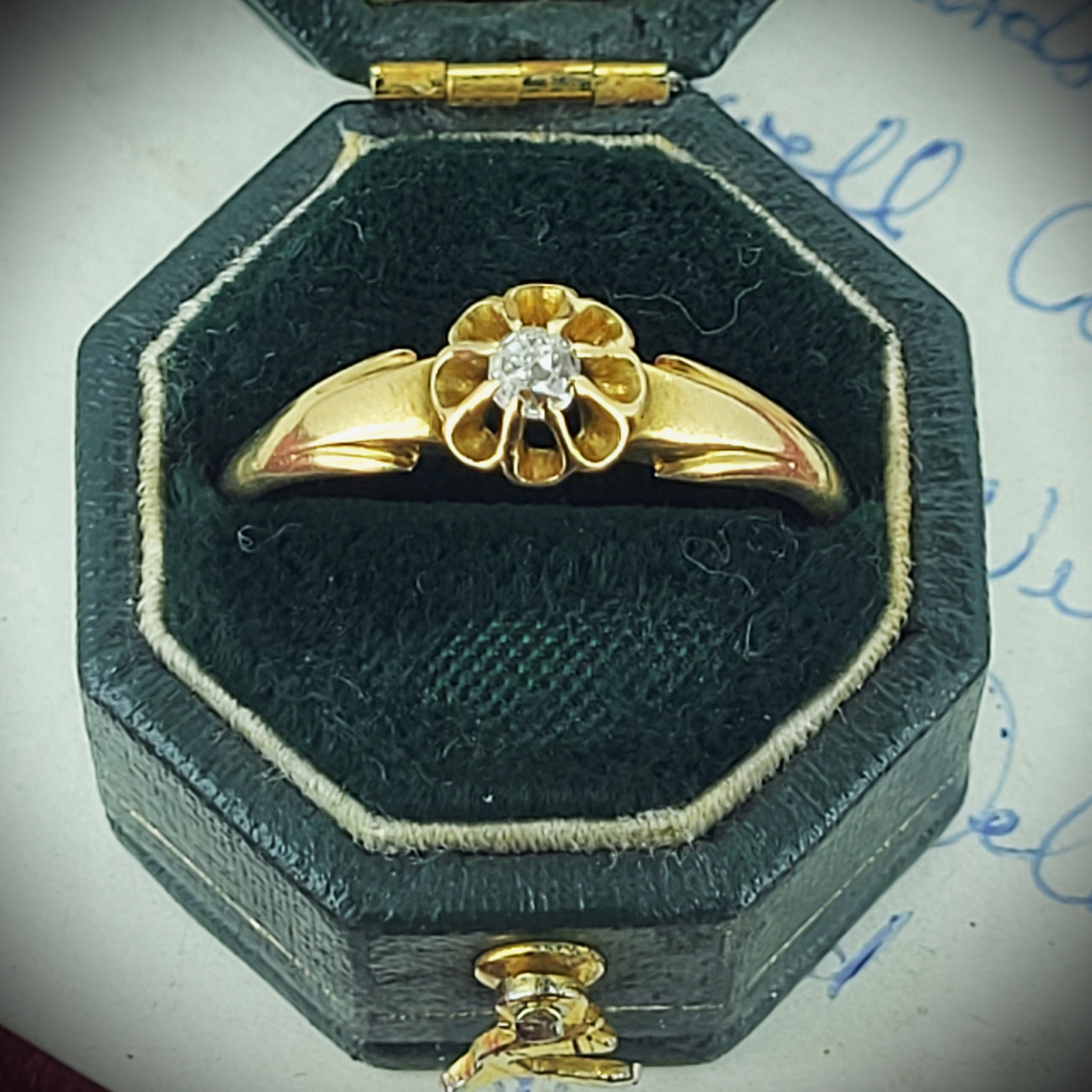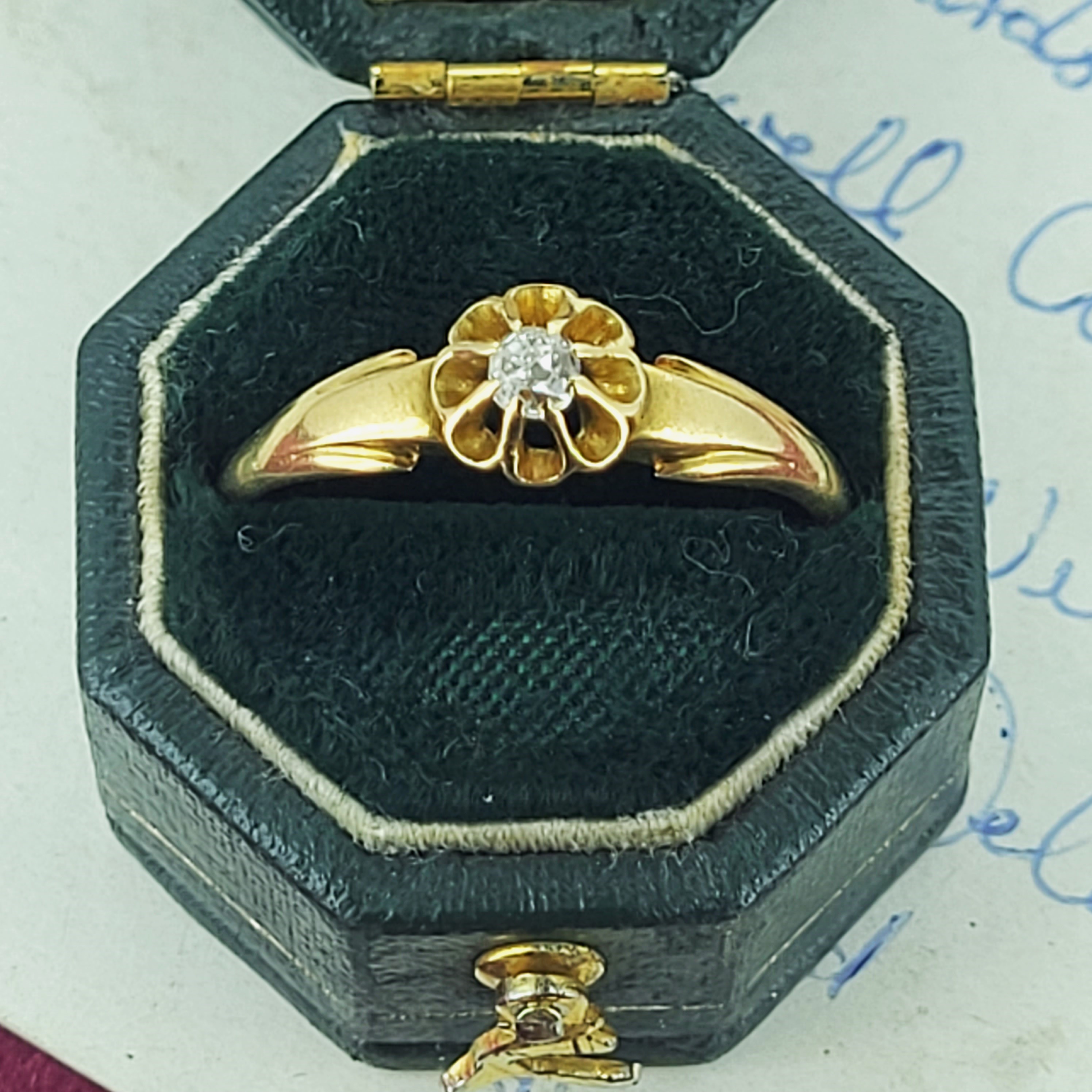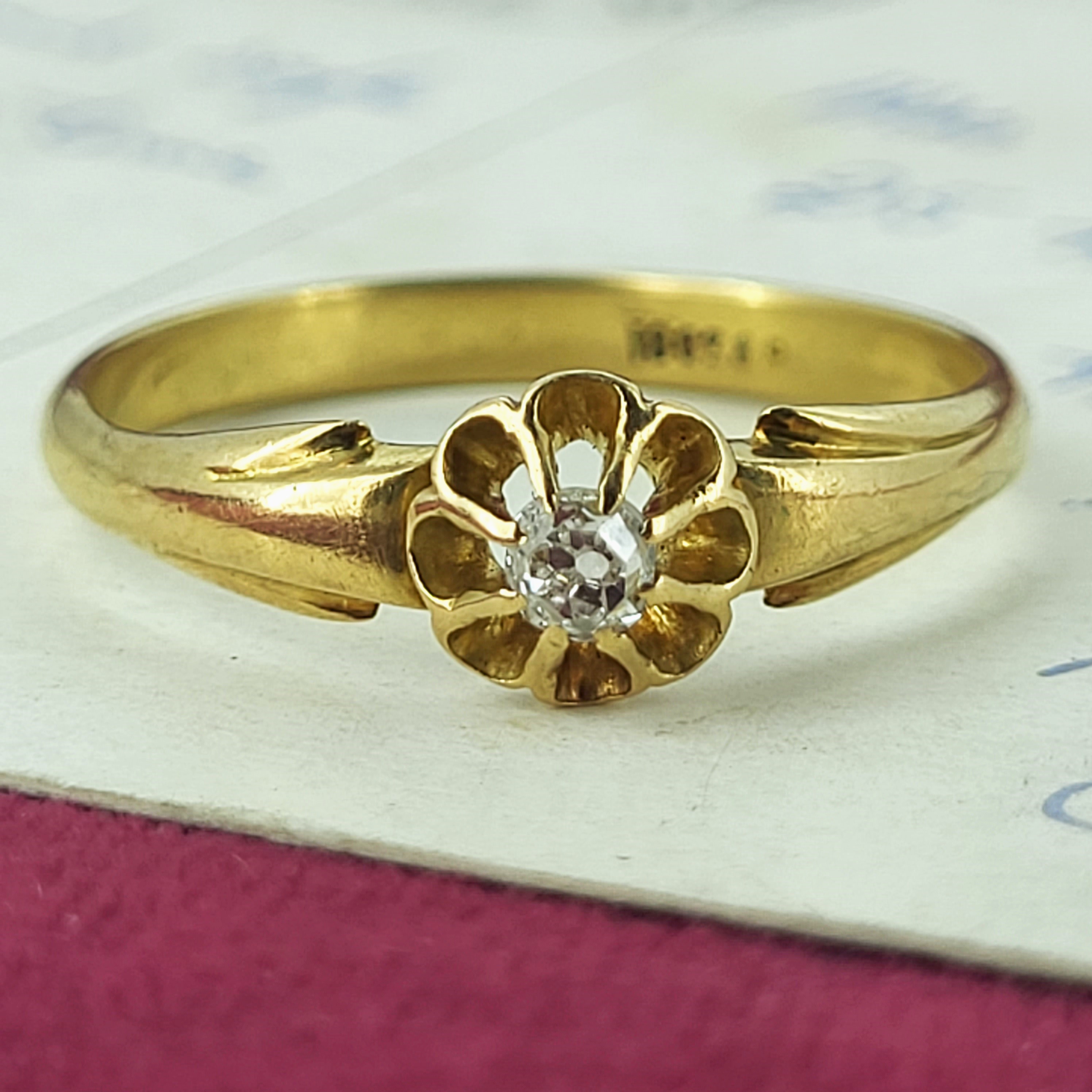 The ring features an Old Cut Diamond measuring 3.3mm, weighing approximately 0.15cts. The diamond is set in a claw setting forming the shape of a flower making this ring look delightfully pretty.
