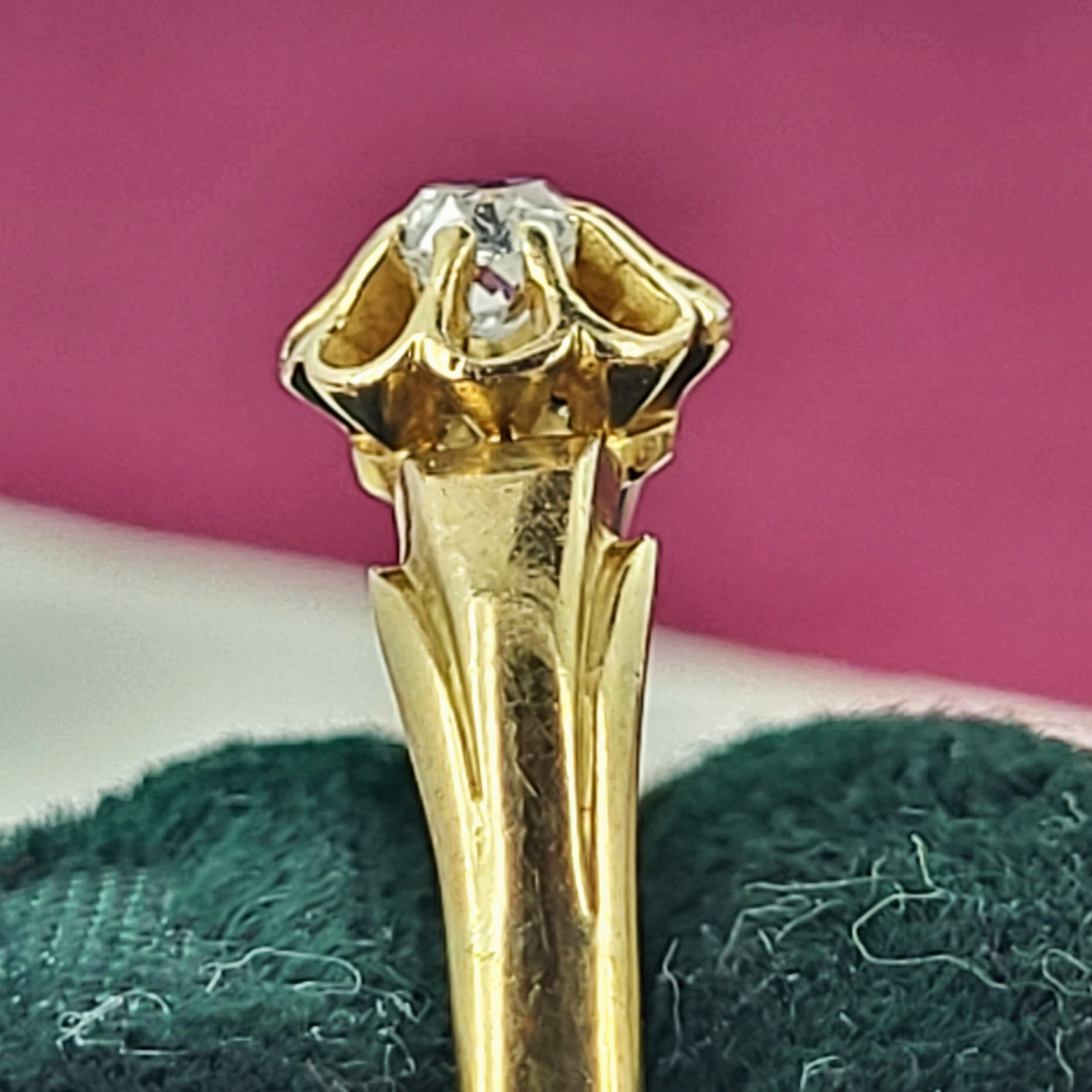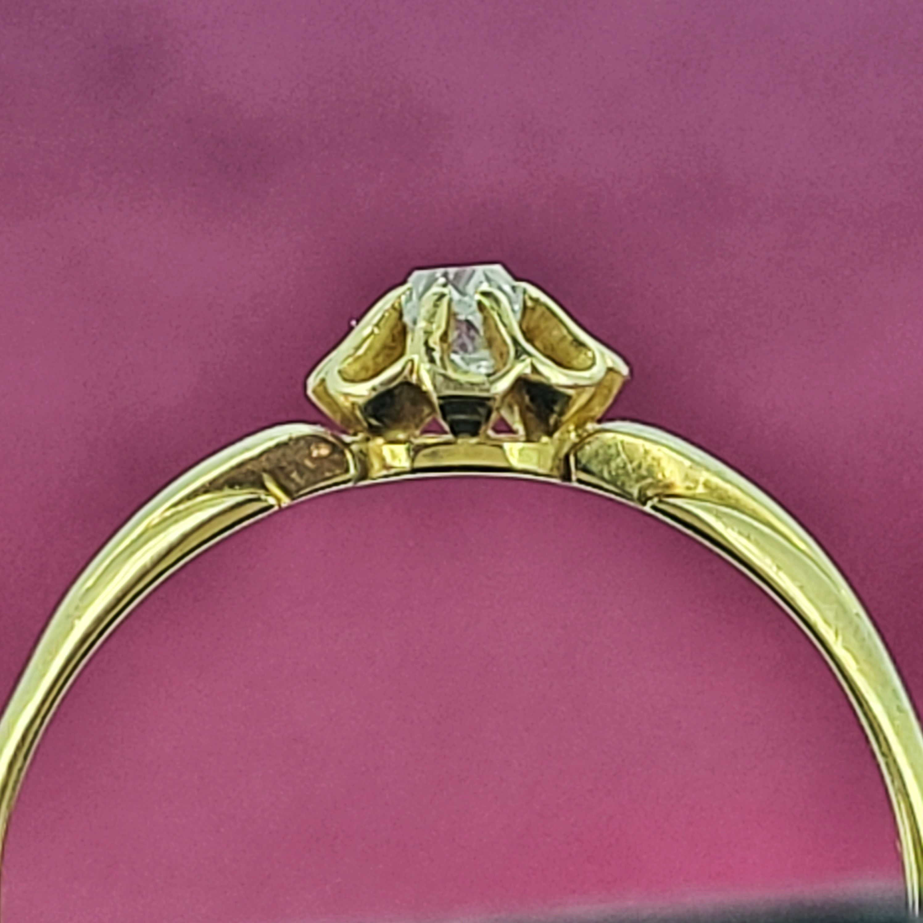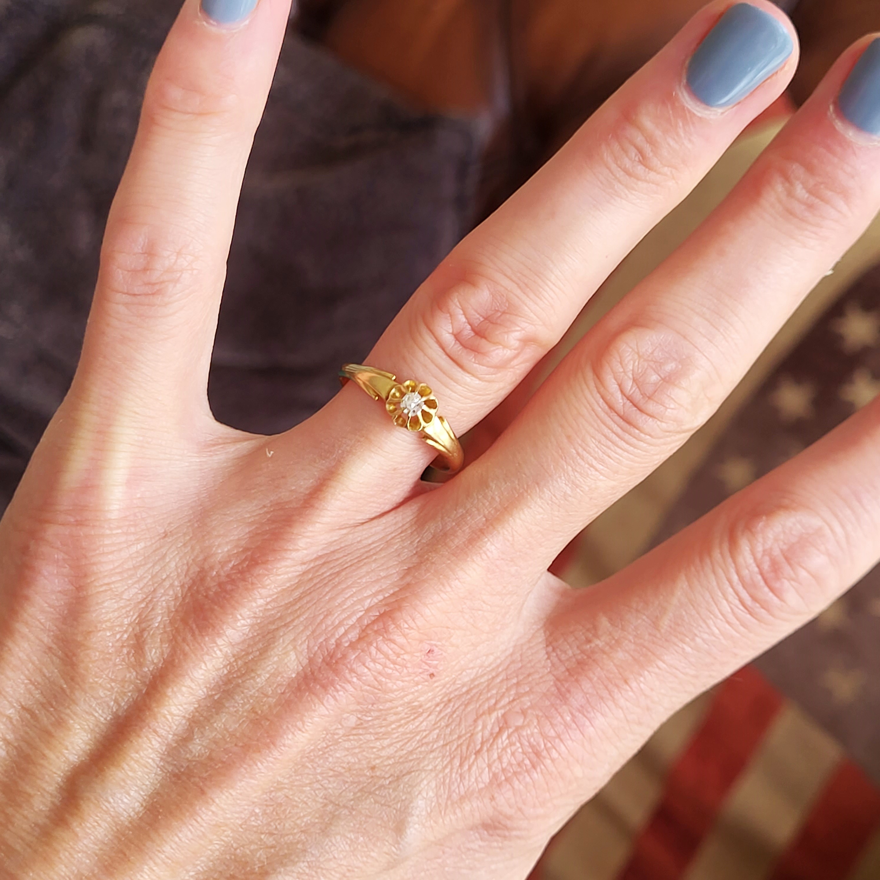 The ring features an Old Cut Diamond measuring 3.3mm, weighing approximately 0.15cts. The diamond is set in a claw setting forming the shape of a flower making this ring look delightfully pretty.
