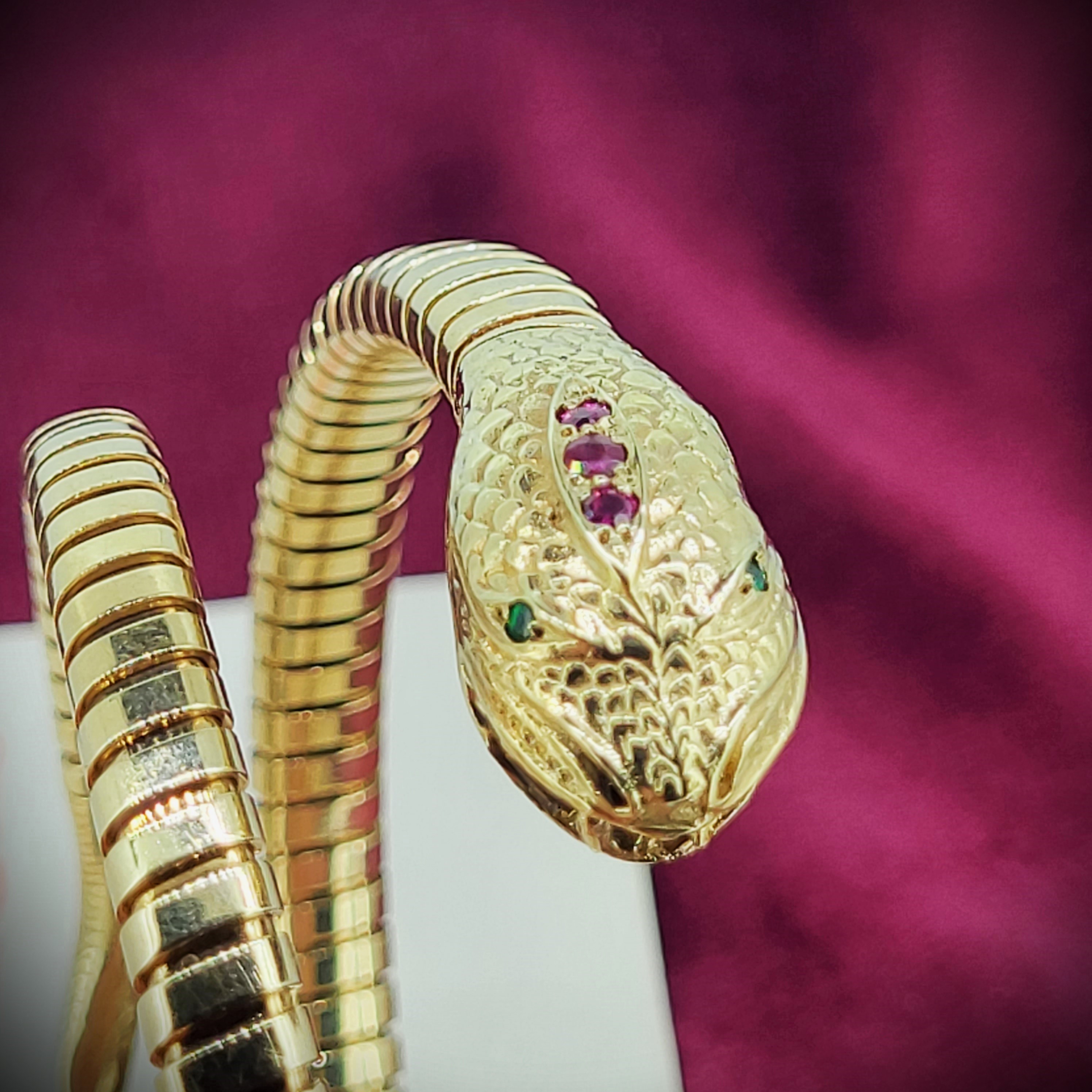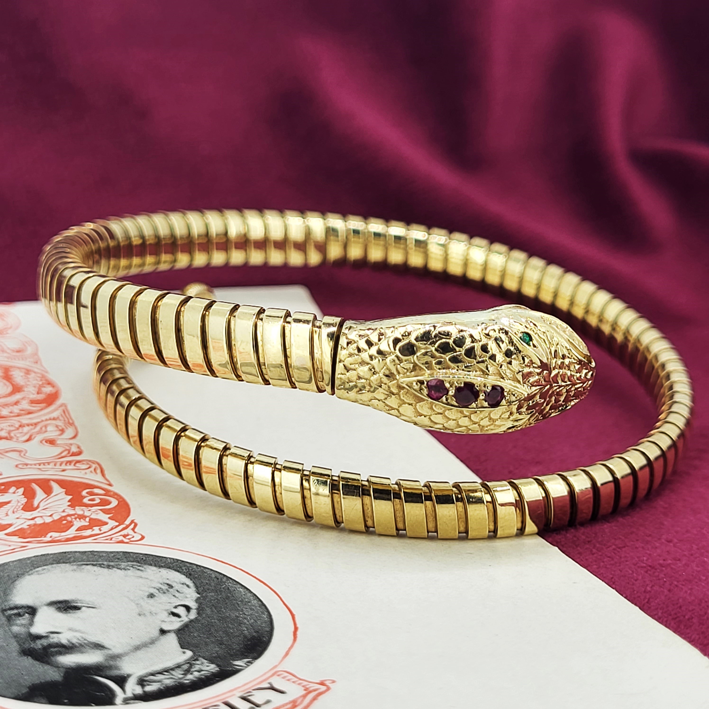 The bangle features a ribbed texture for the body and a Snakes head with detailed scales on the head and tail. It has rubies set in the head and tail and has vivid emerald green eyes.