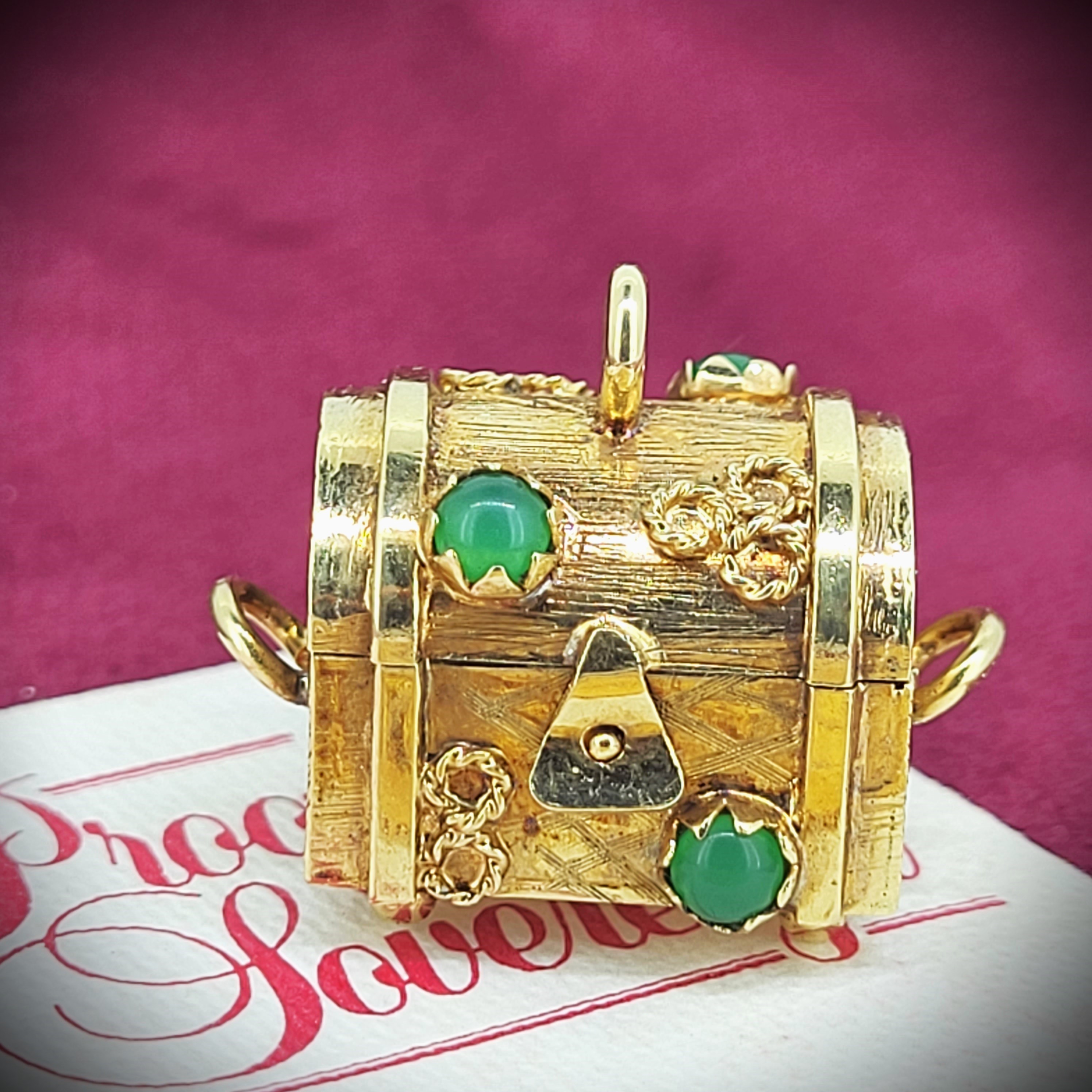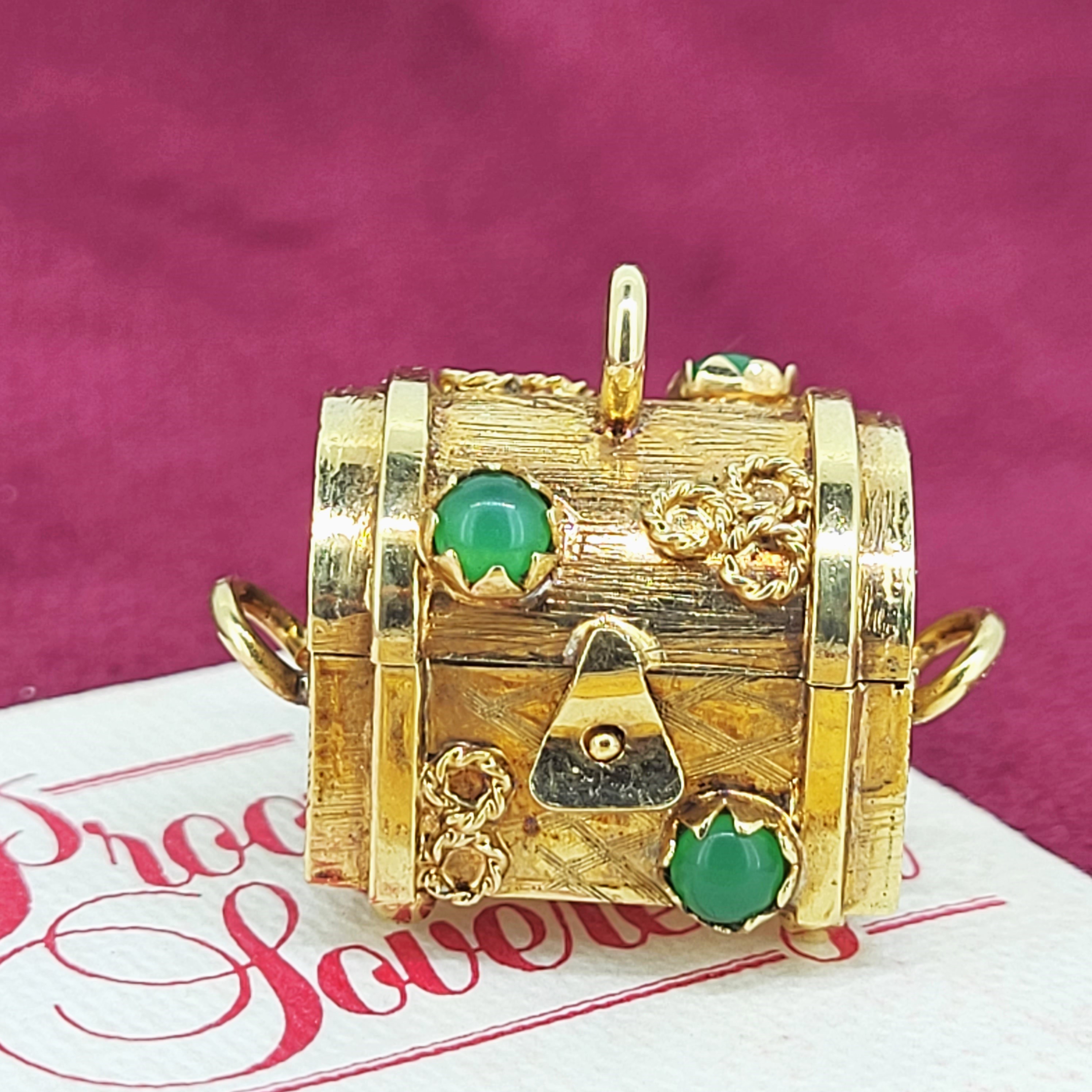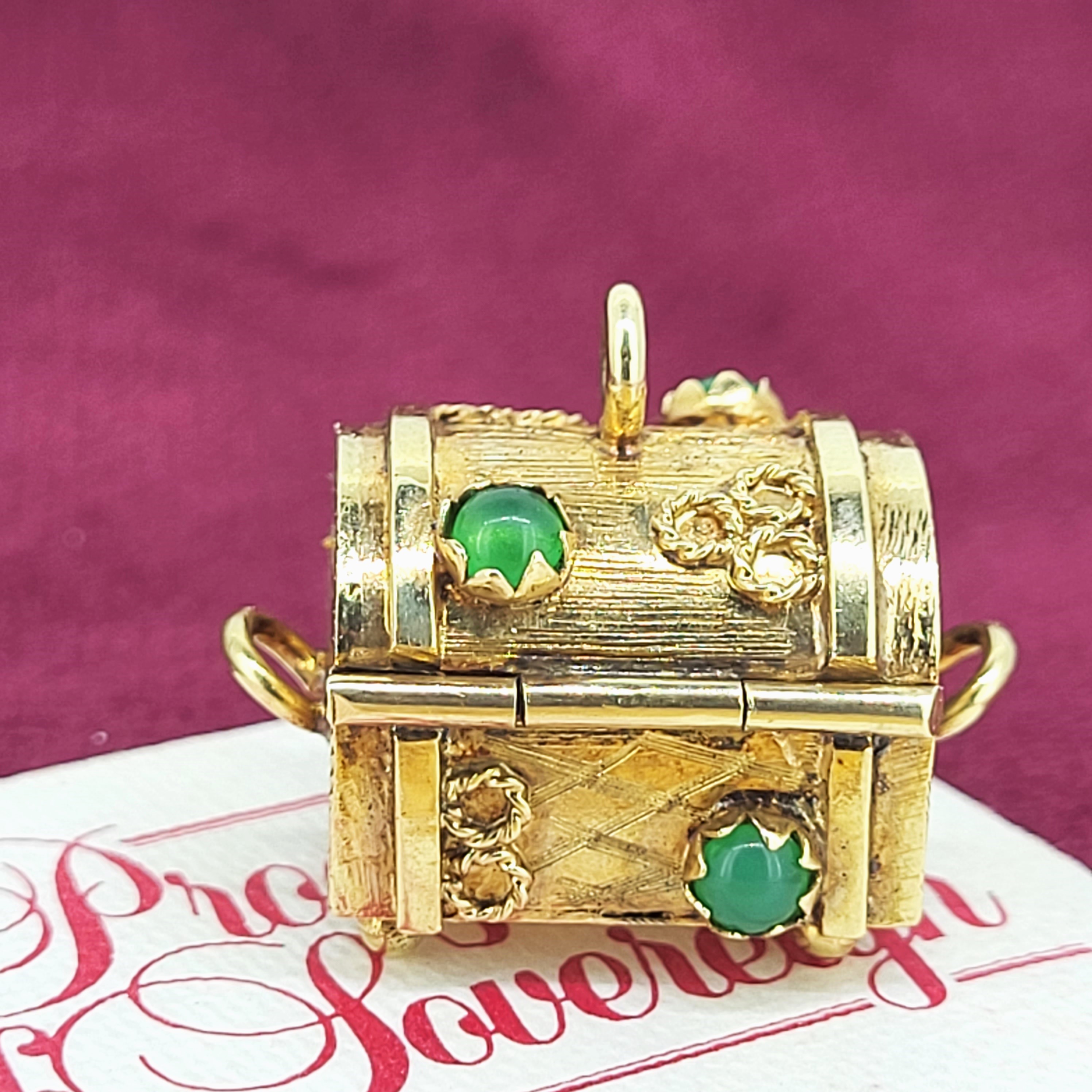 A 9ct Yellow Gold Treasure Chest Charm with Cabochon Green Agate set into the front and back of the chest.