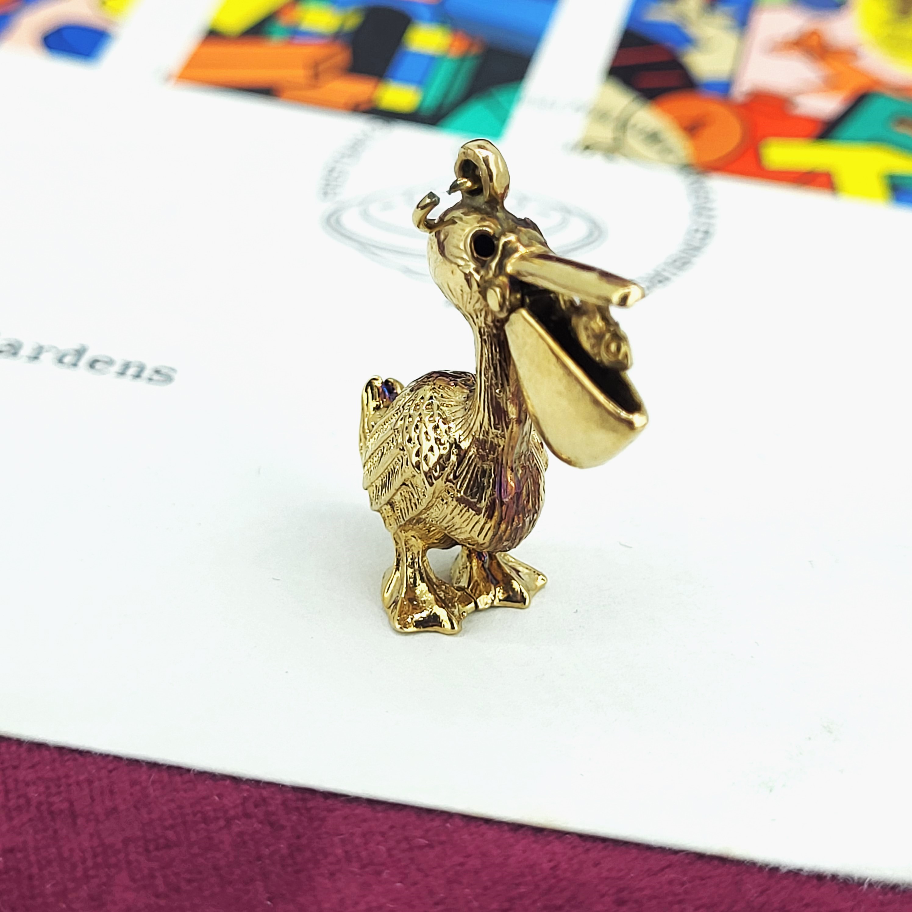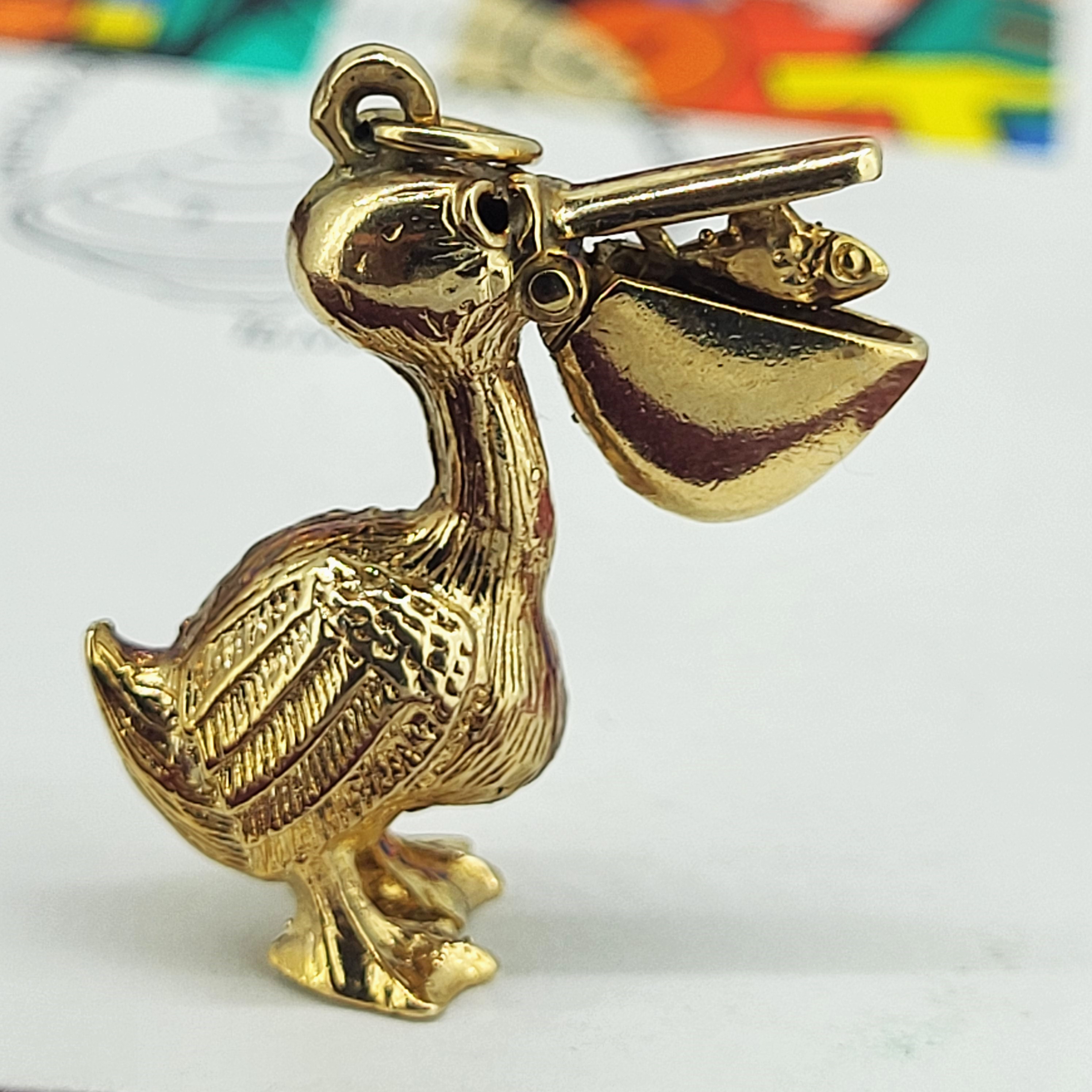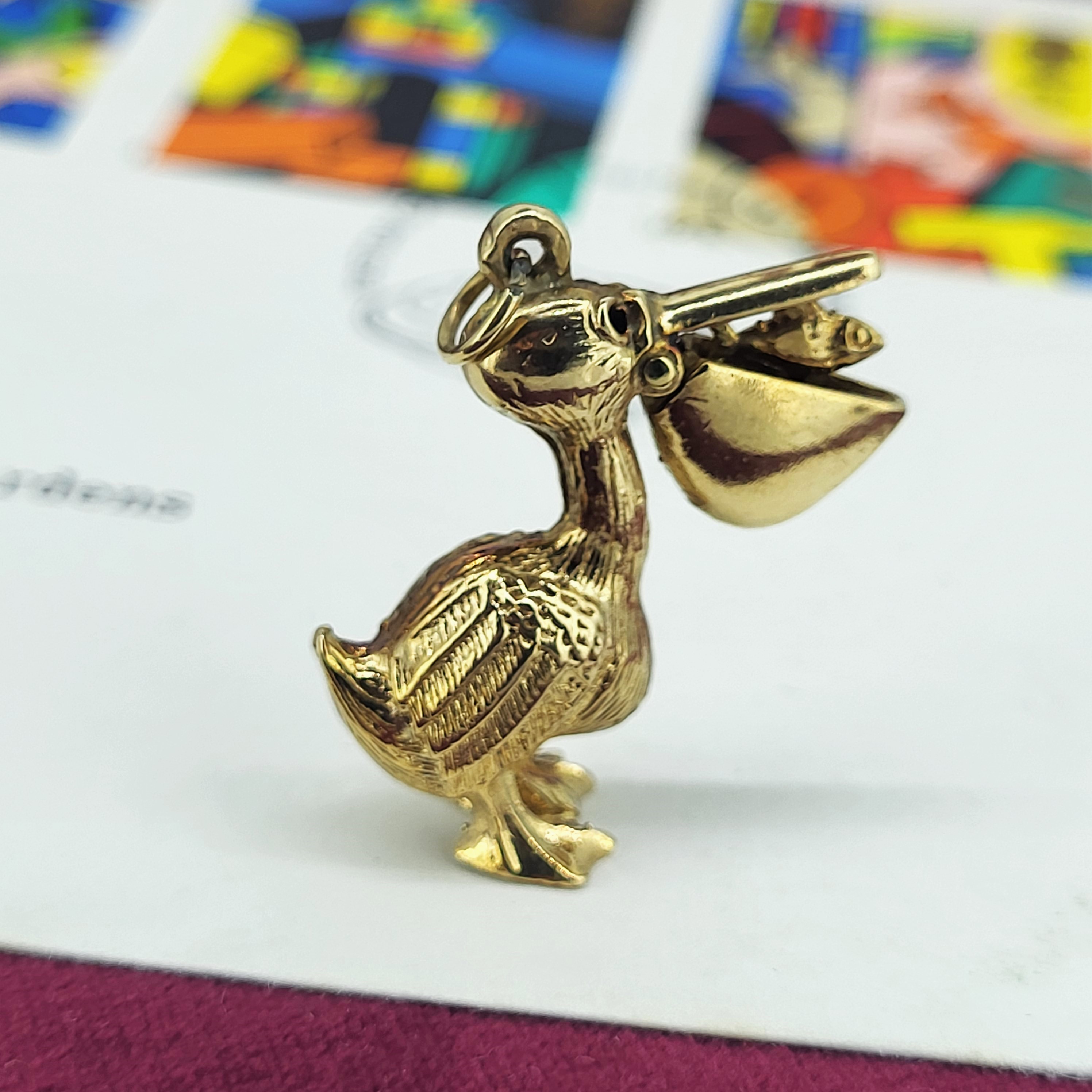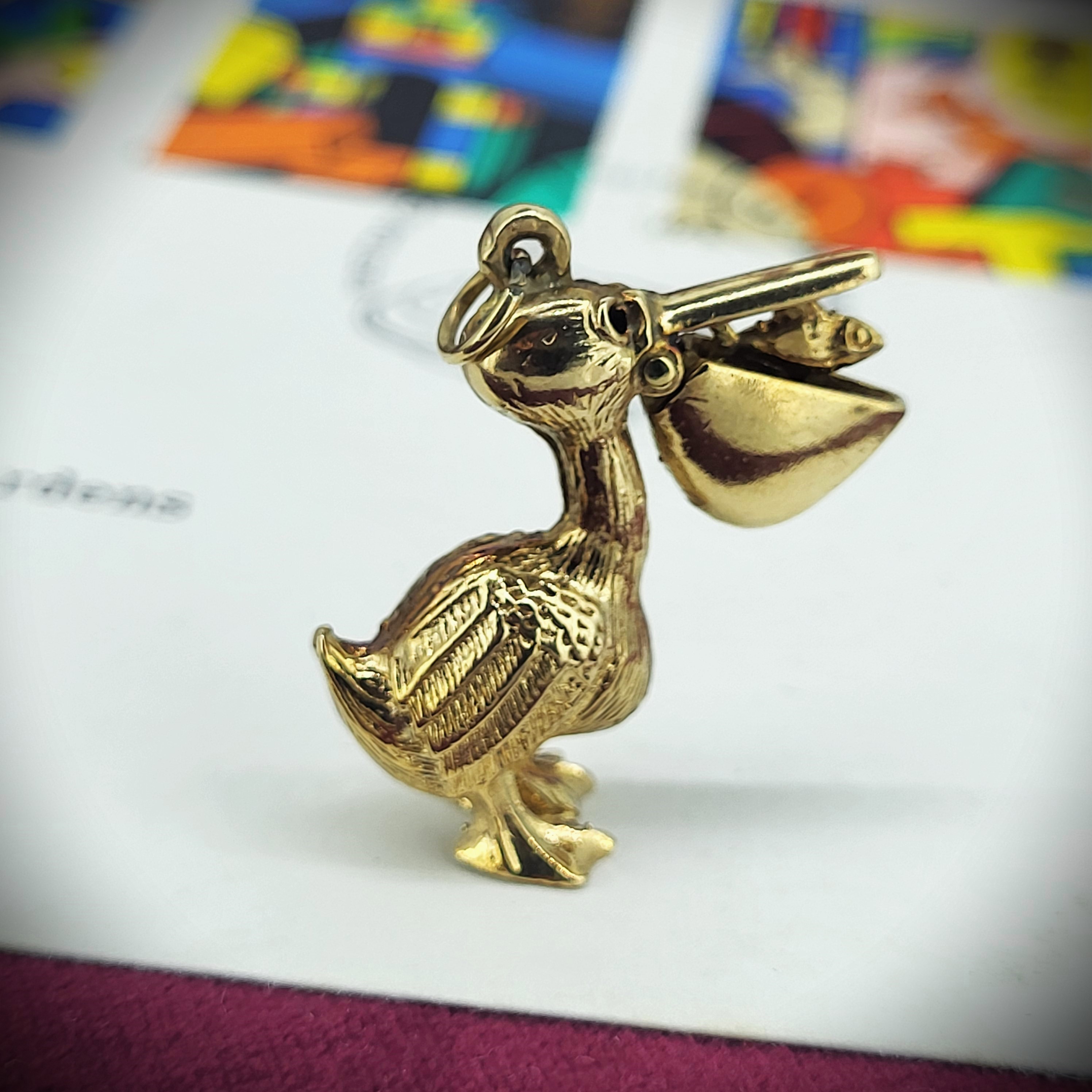 The charm is articulated and the beak opens to reveal a fish inside.