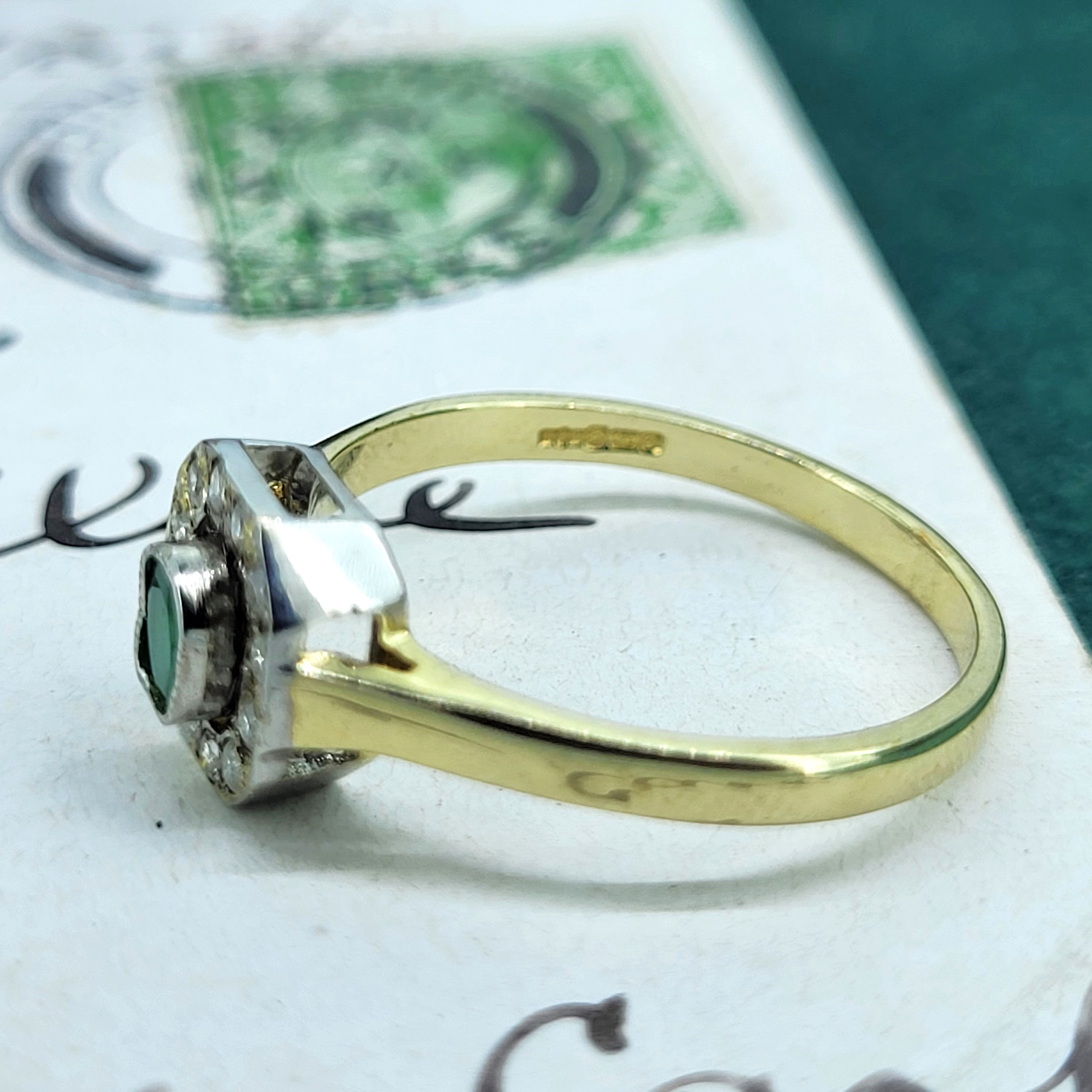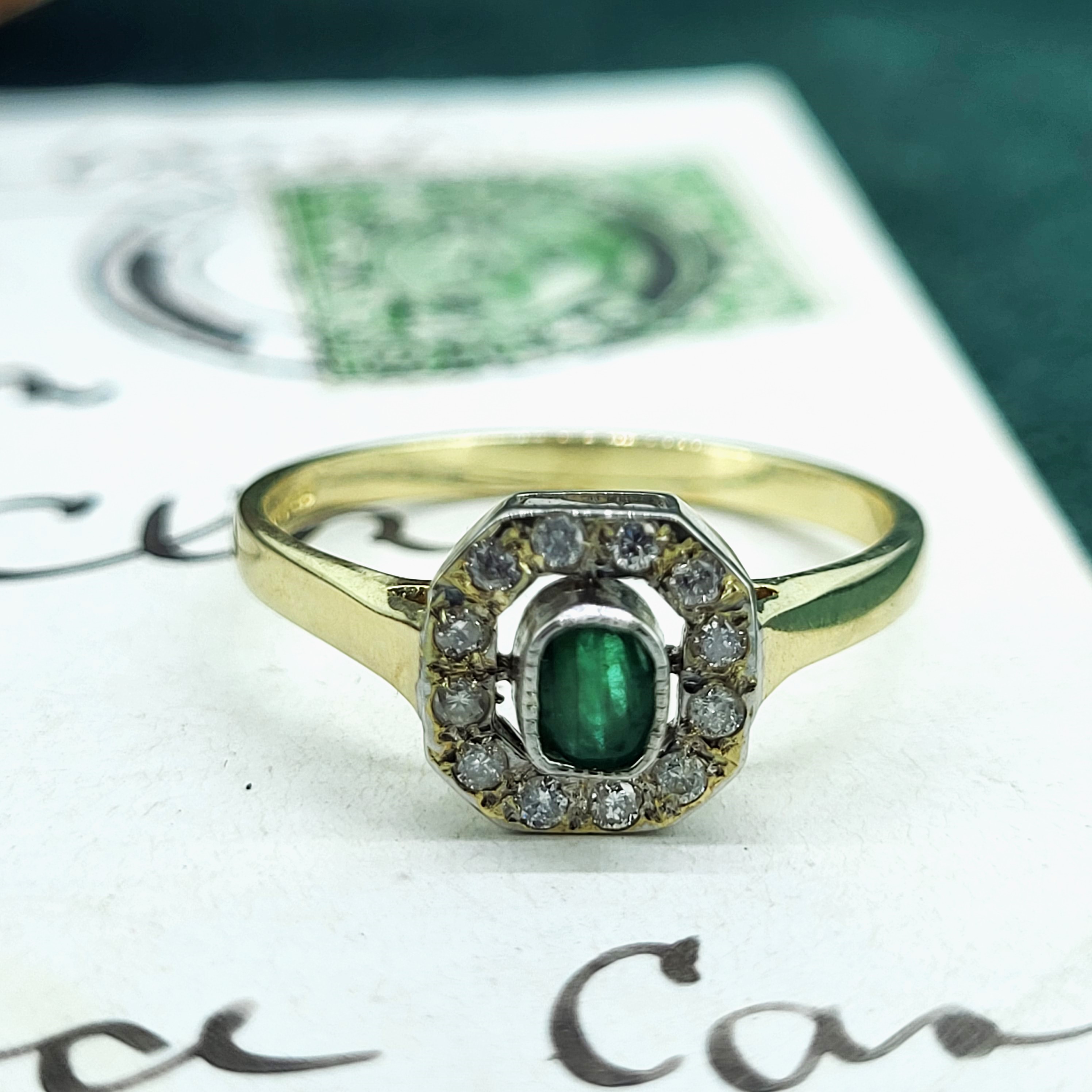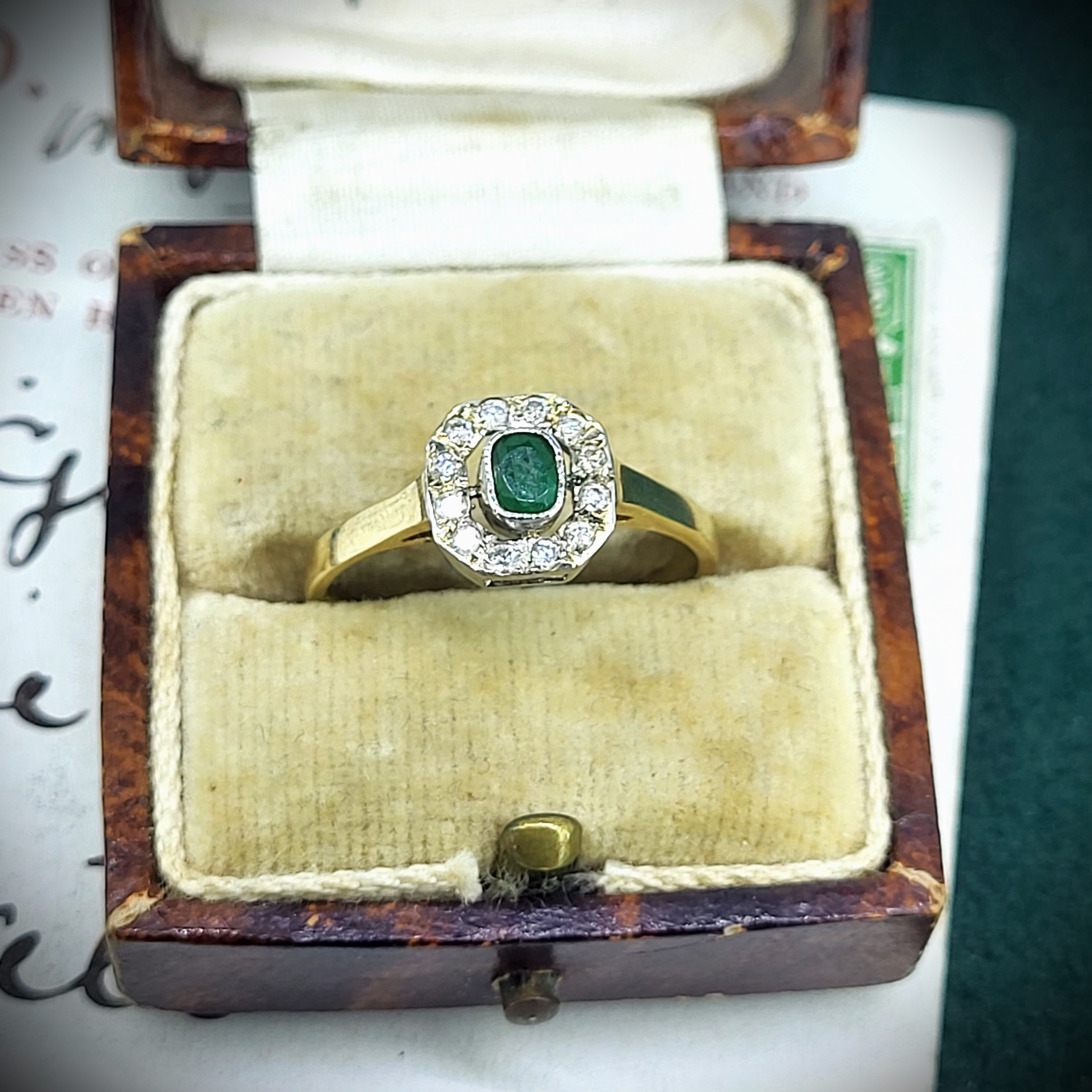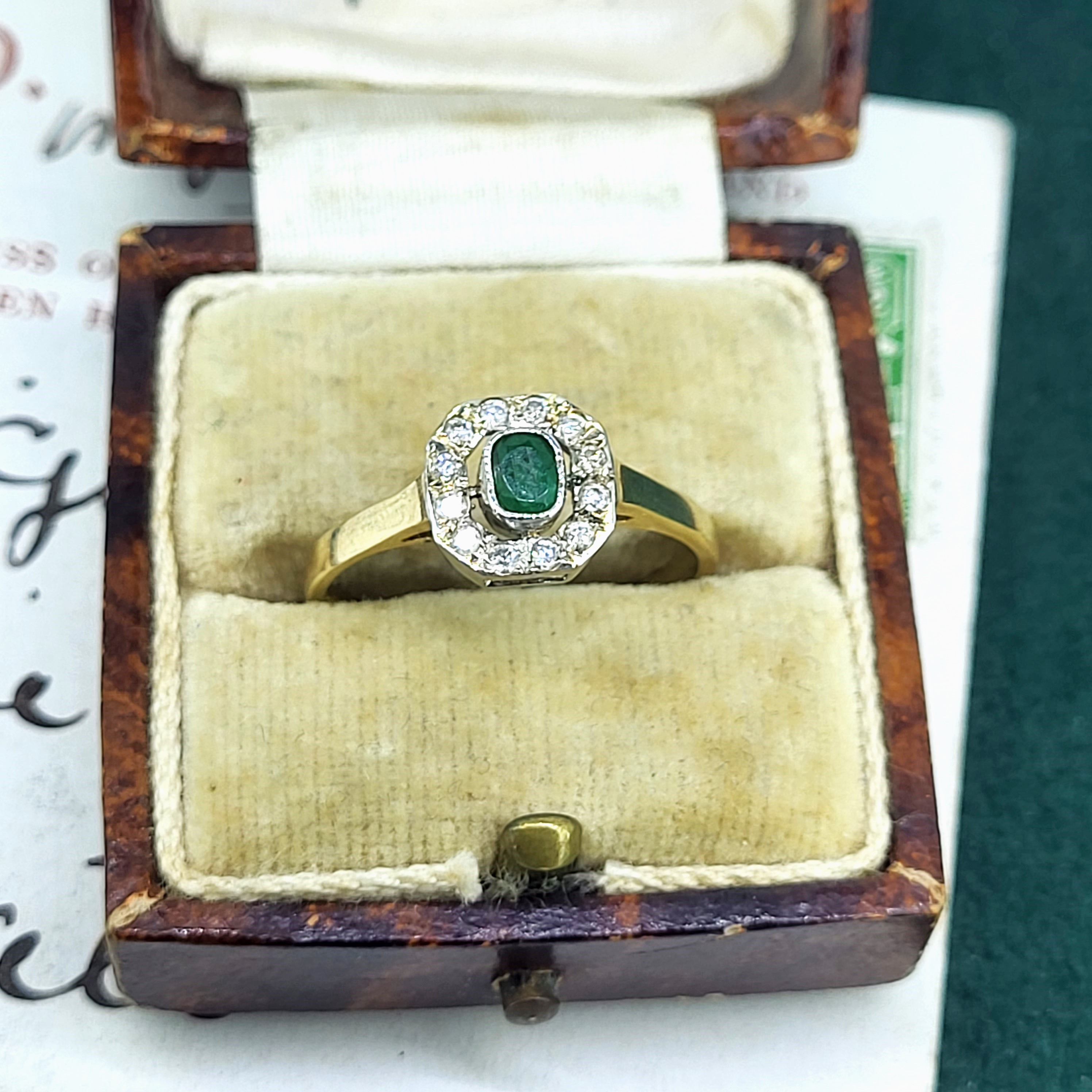 A 9ct Yellow Gold Emerald and Diamond Cluster Ring. The ring features a central emerald measuring 4mm by 3mm and is surrounded by twelve round brilliant diamonds.