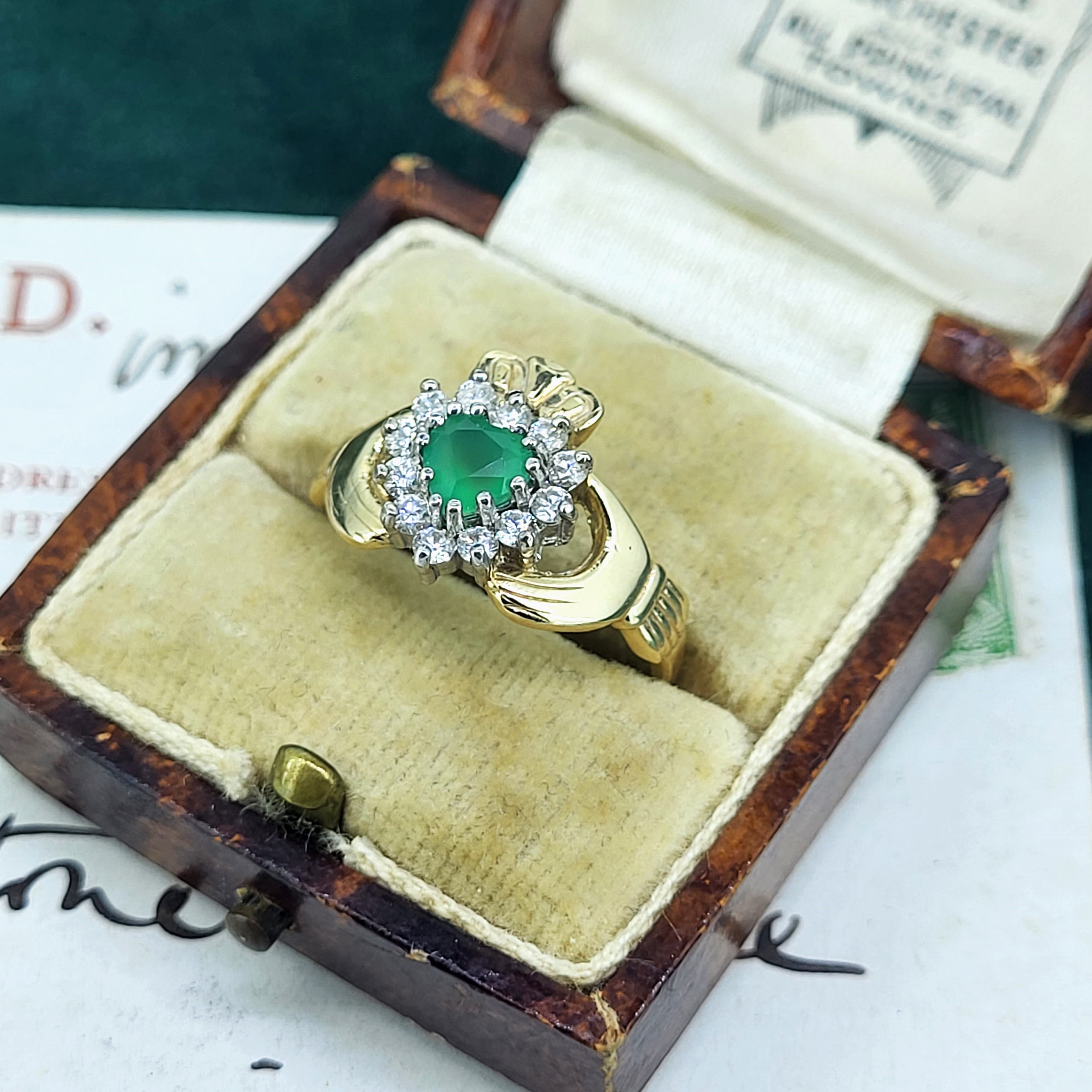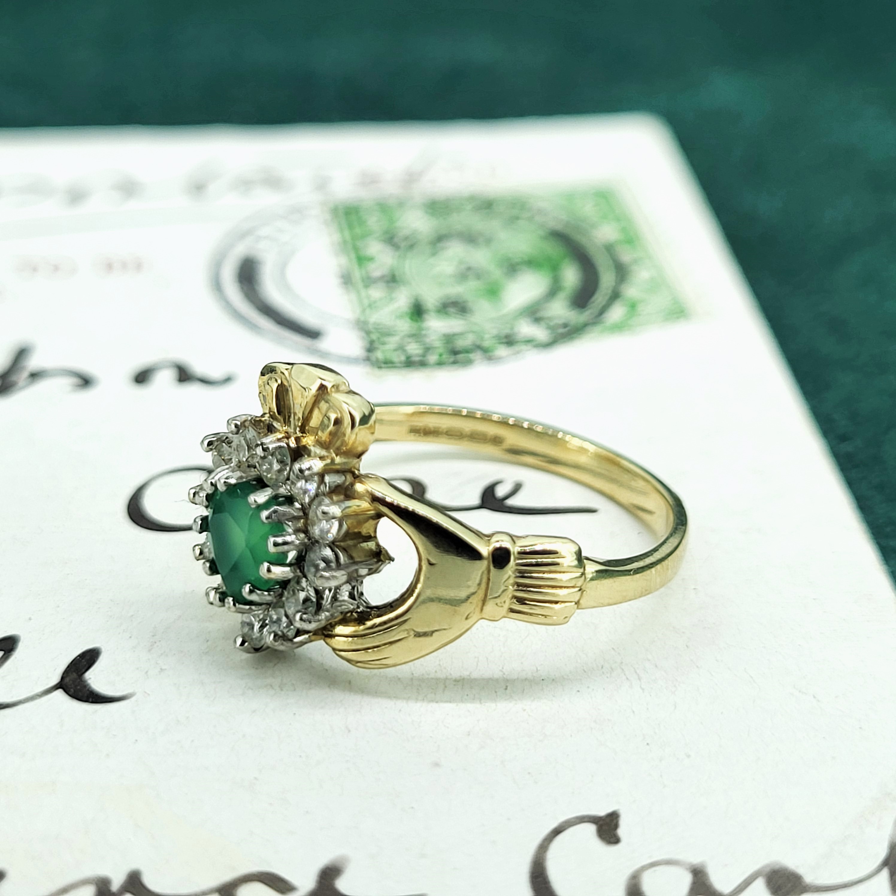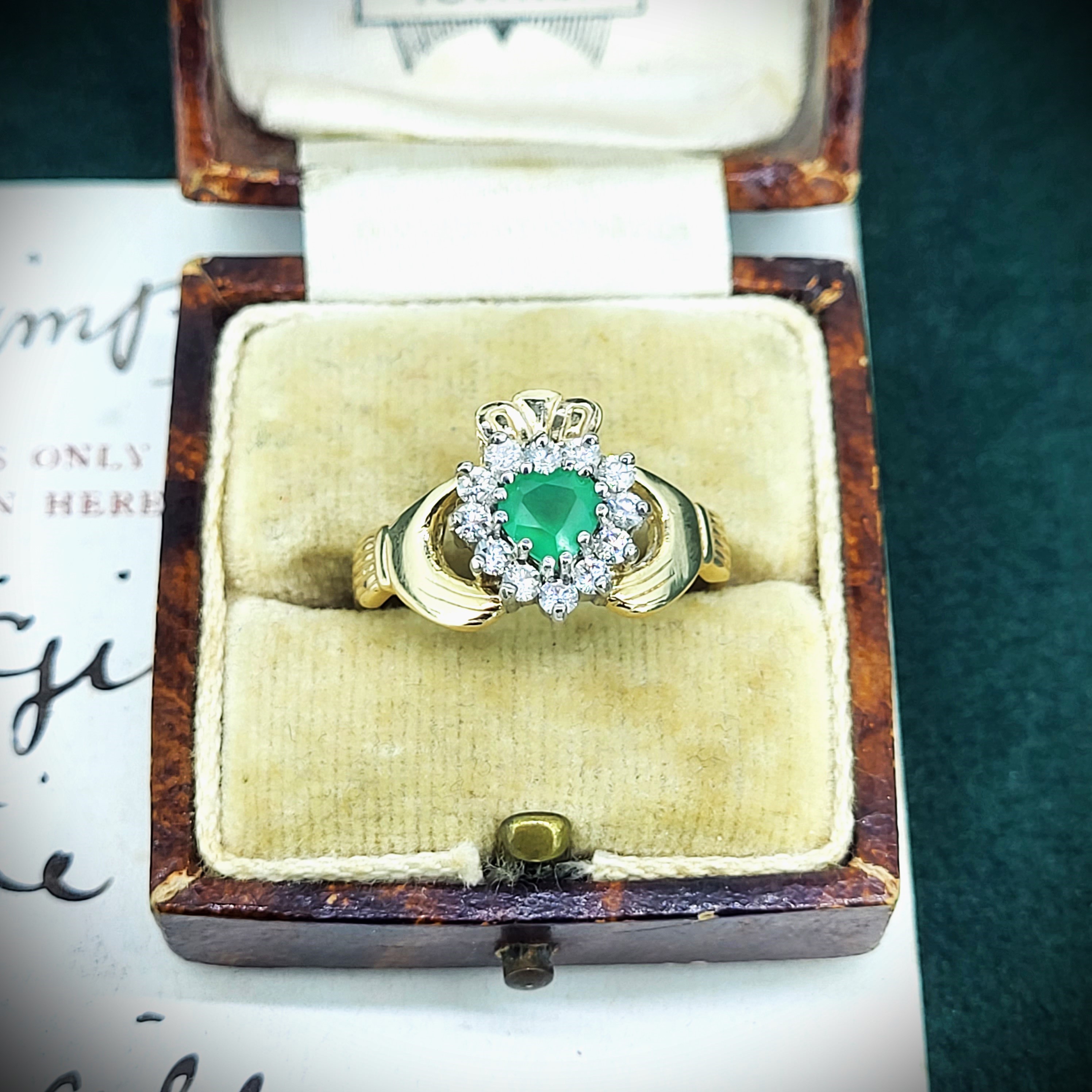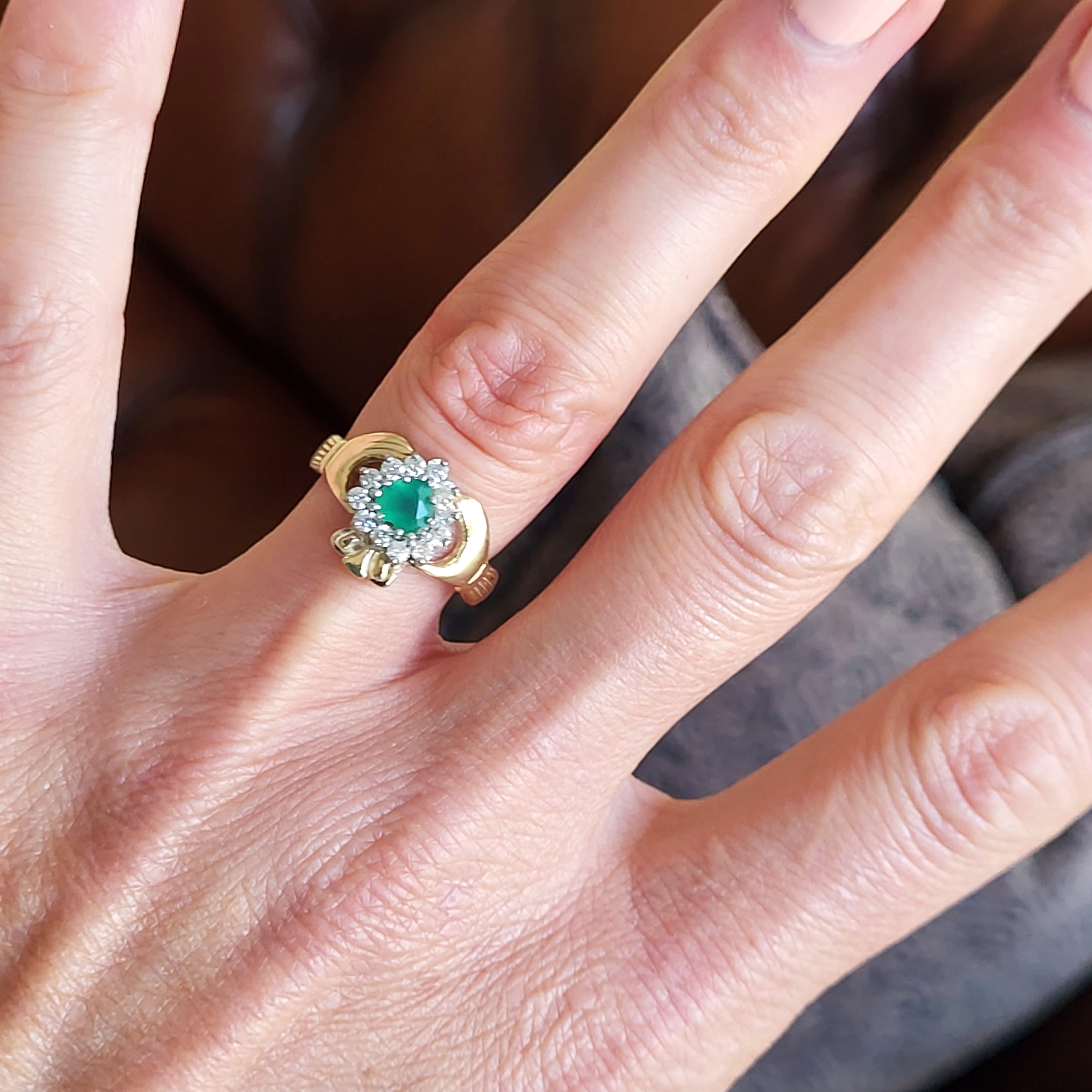 A 9ct Yellow Gold Claddagh Ring featuring a central Heart Shape Emerald surrounded by Diamonds.