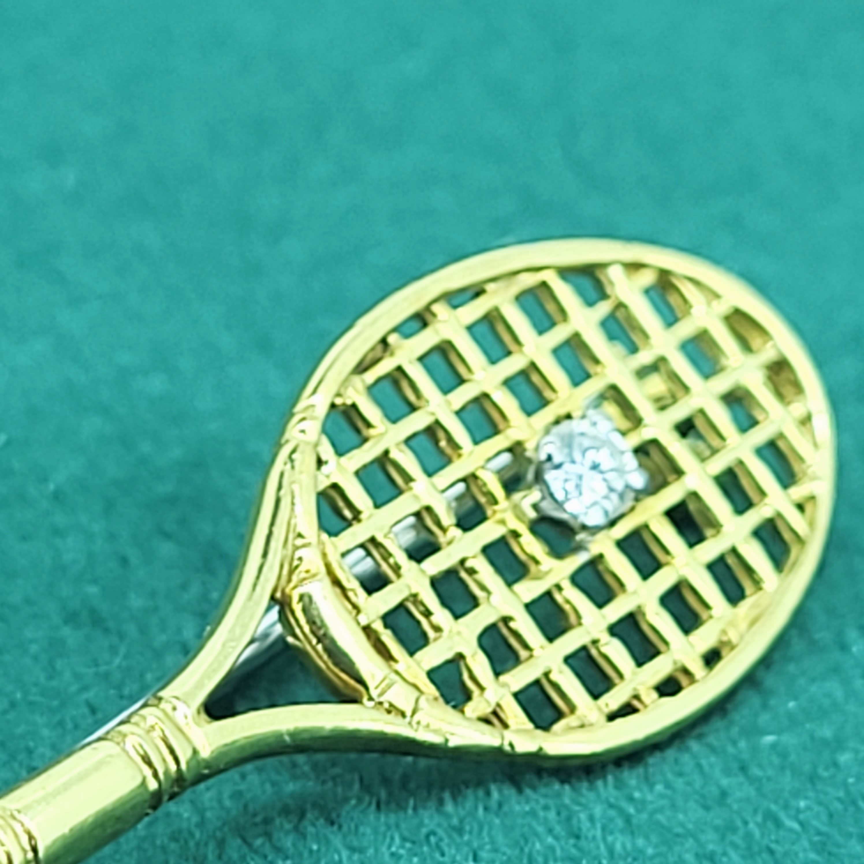 The brooch measures 40mm in length with the head of the racquet measuring 11mm. The brooch features a diamond measuring 2.5mm estimated at 0.05cts. That's a diamond tennis ball!