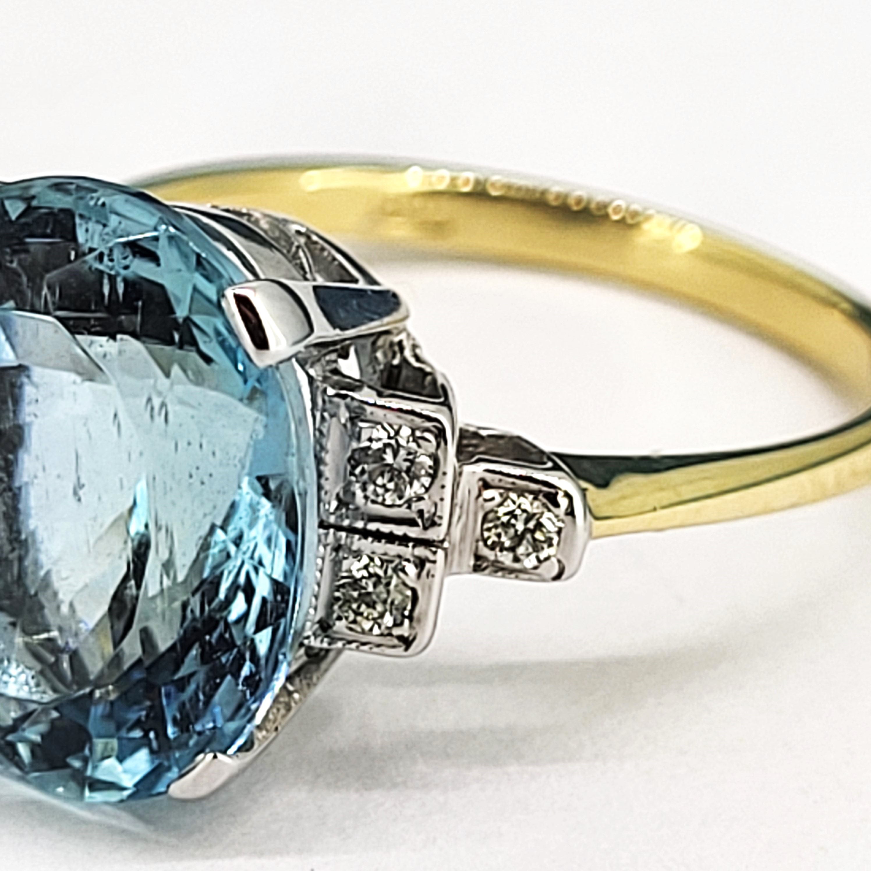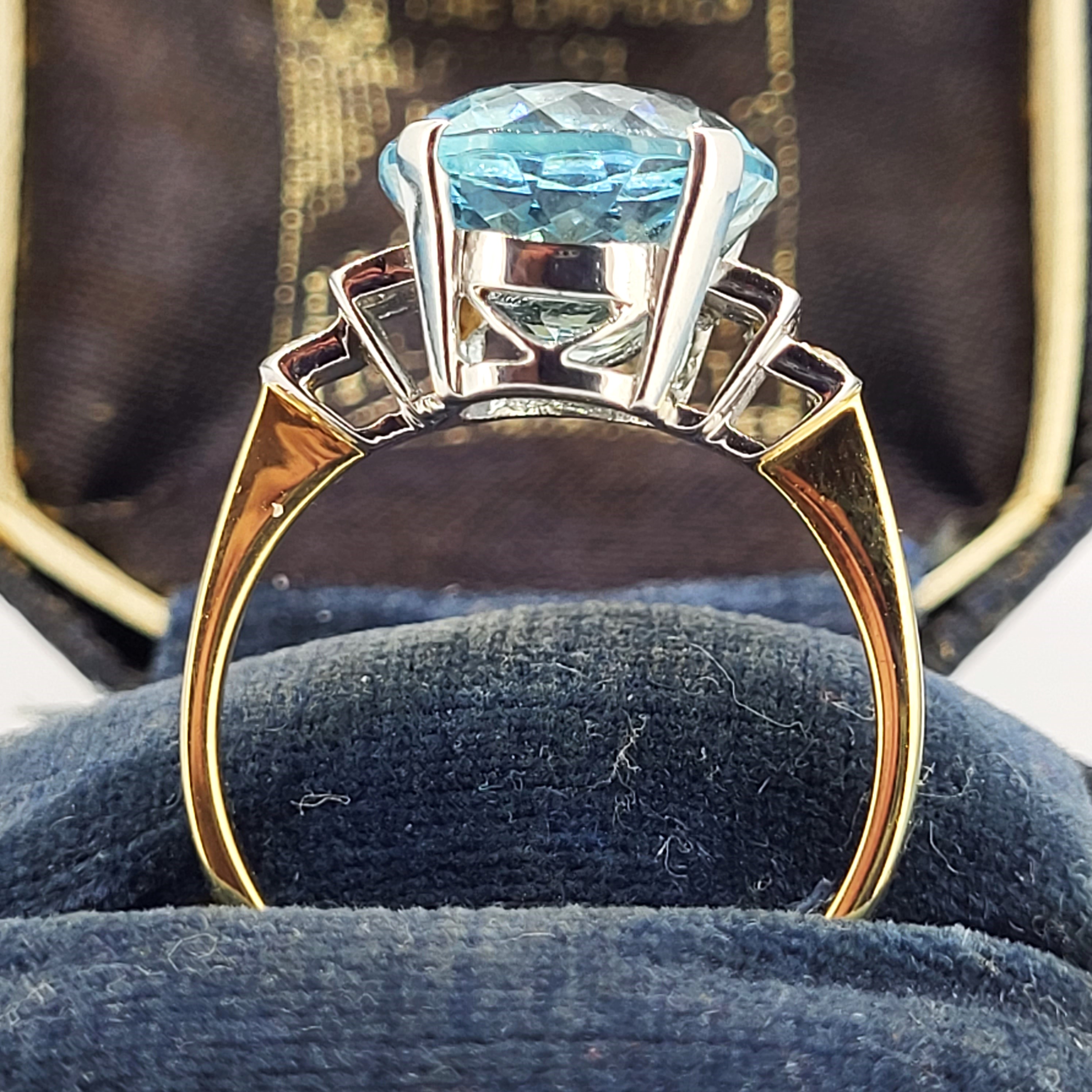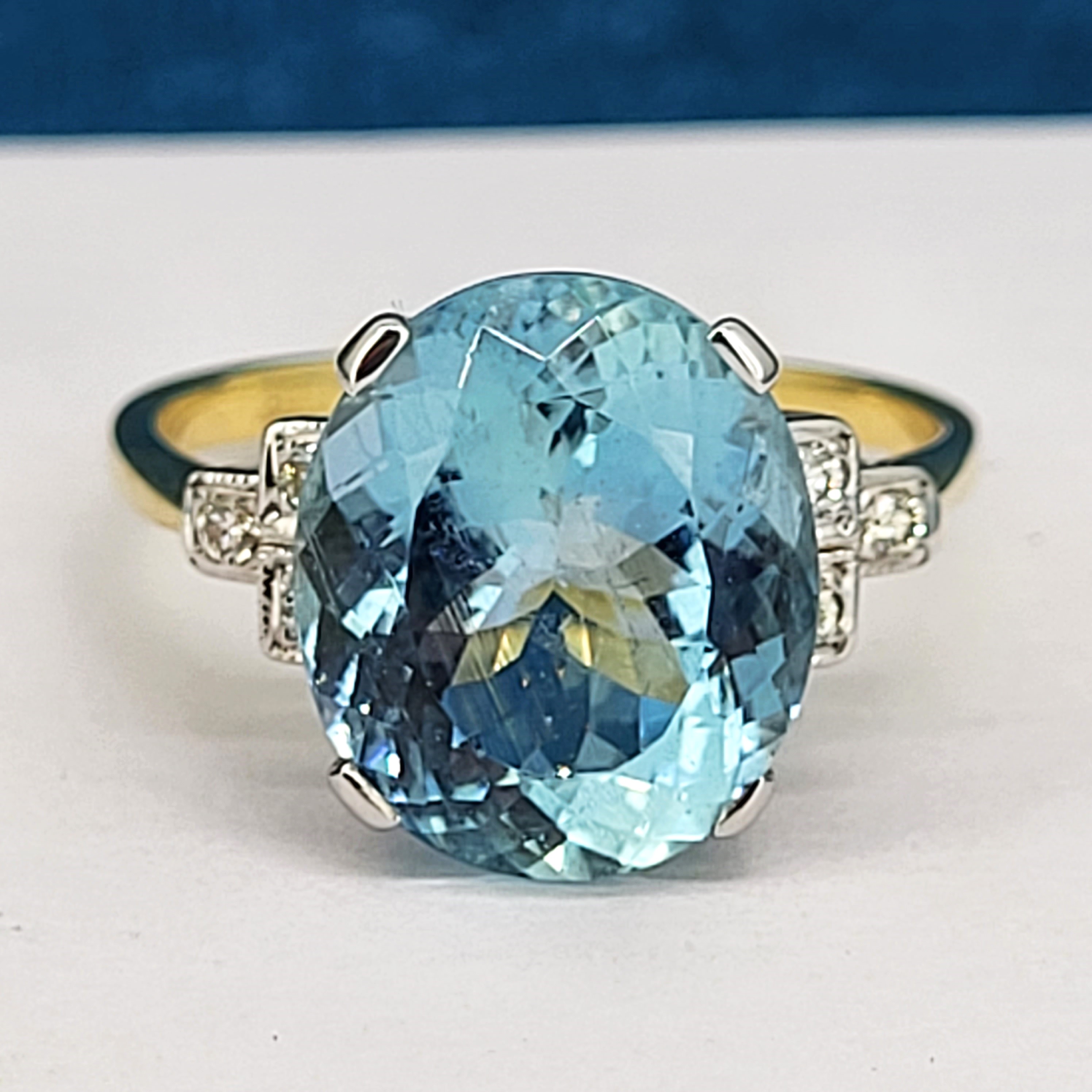 The central Aquamarine measures 12.6mm by 10.8mm and is estimated at a whopping 6.20cts in weight. Its colour is wildly vibrant and the brilliance afforded by the cut is spectacular. The faceted oval brilliant cut features more facets than a traditional cut adding to the fabulous sparkle.