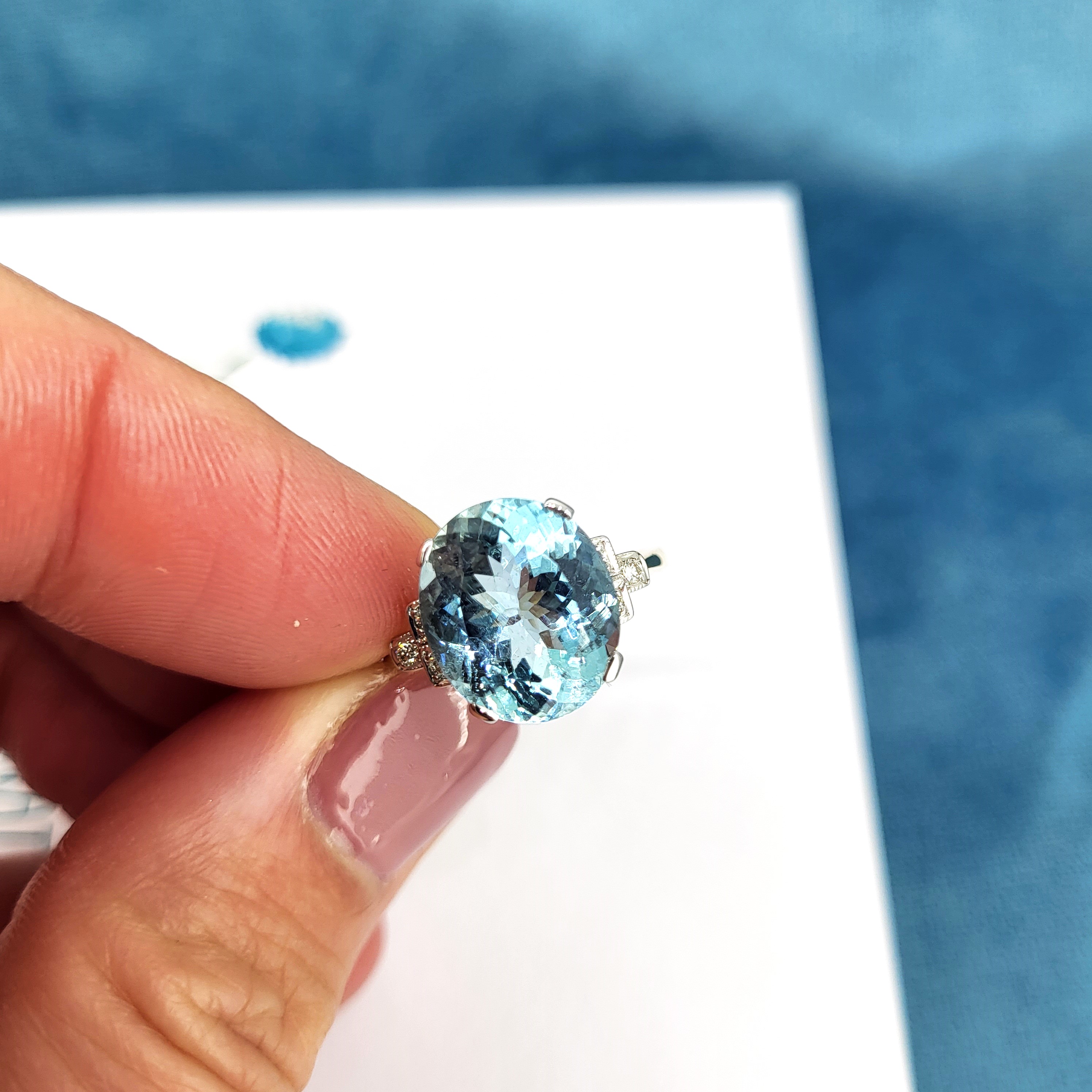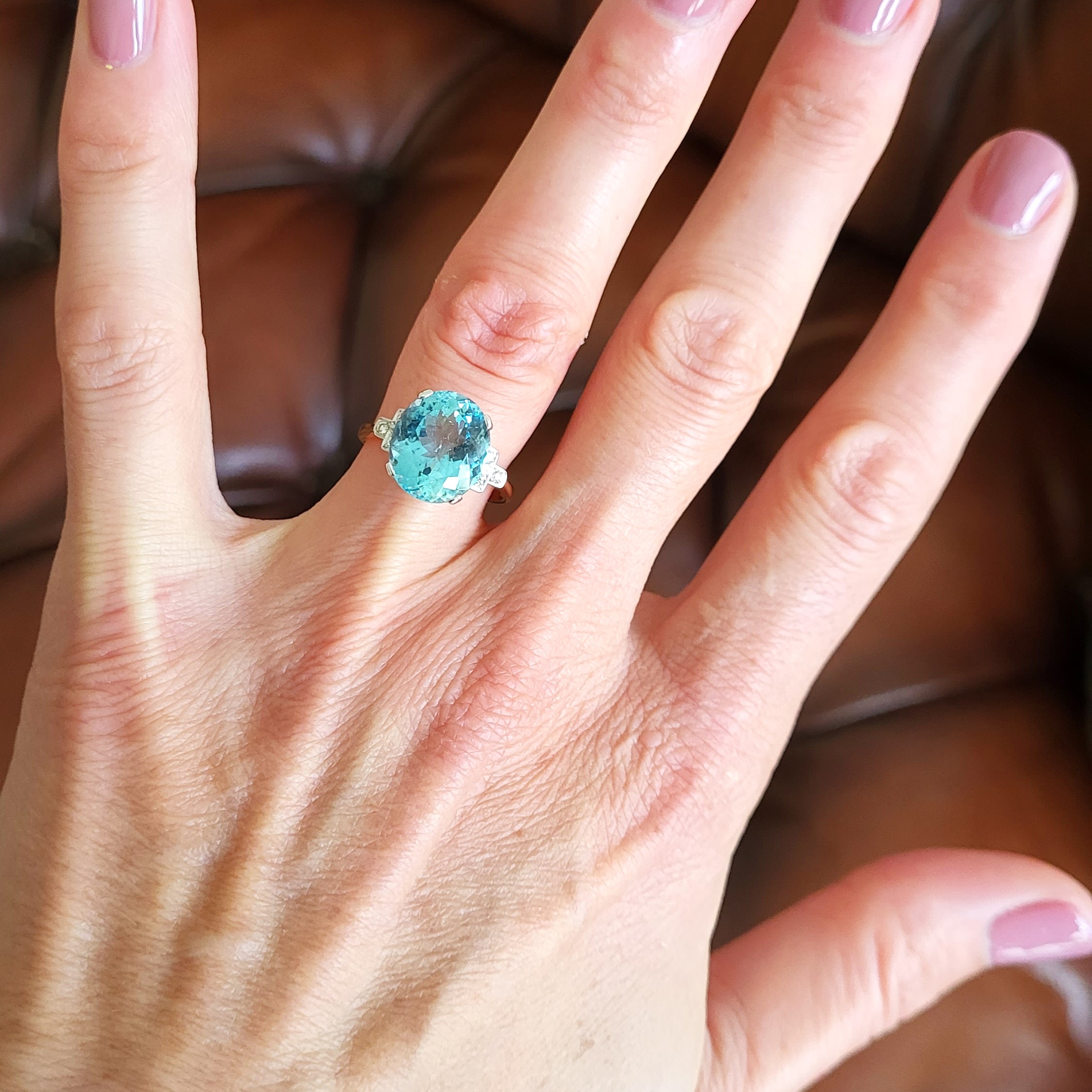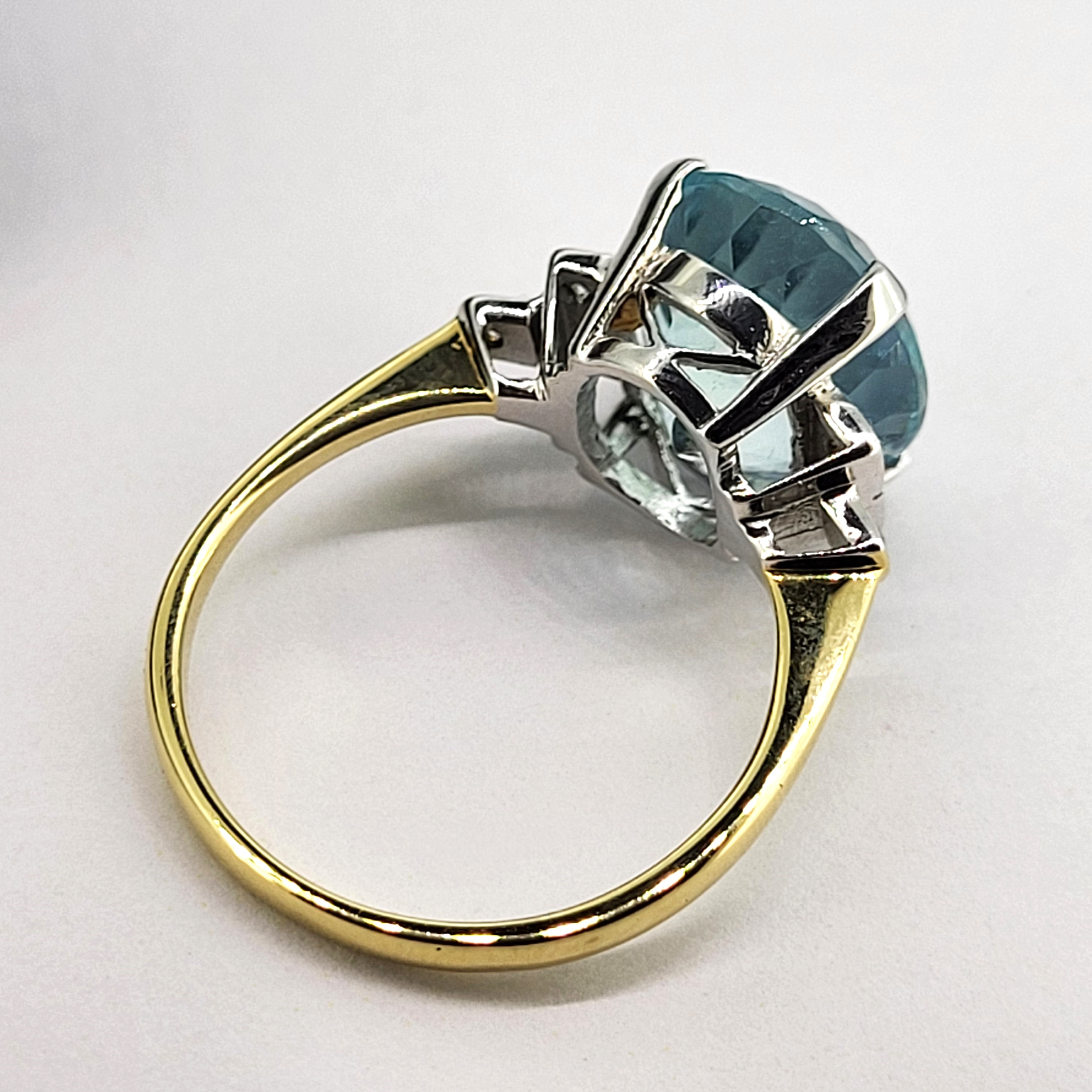 The central Aquamarine measures 12.6mm by 10.8mm and is estimated at a whopping 6.20cts in weight. Its colour is wildly vibrant and the brilliance afforded by the cut is spectacular. The faceted oval brilliant cut features more facets than a traditional cut adding to the fabulous sparkle.