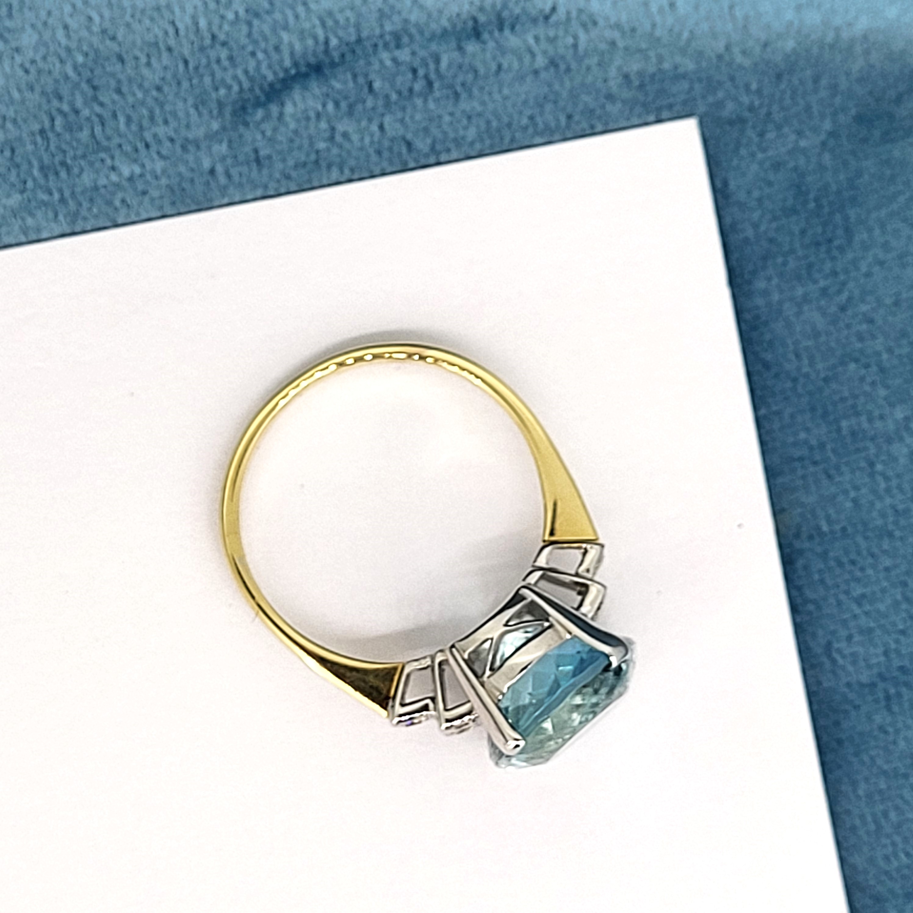 It is adorned by three brilliant cut diamonds on each side in the ever popular, step-cut art-deco inspired design. The diamonds weigh 0.10ct in total and are a lovely extension to and from the central aquamarine.