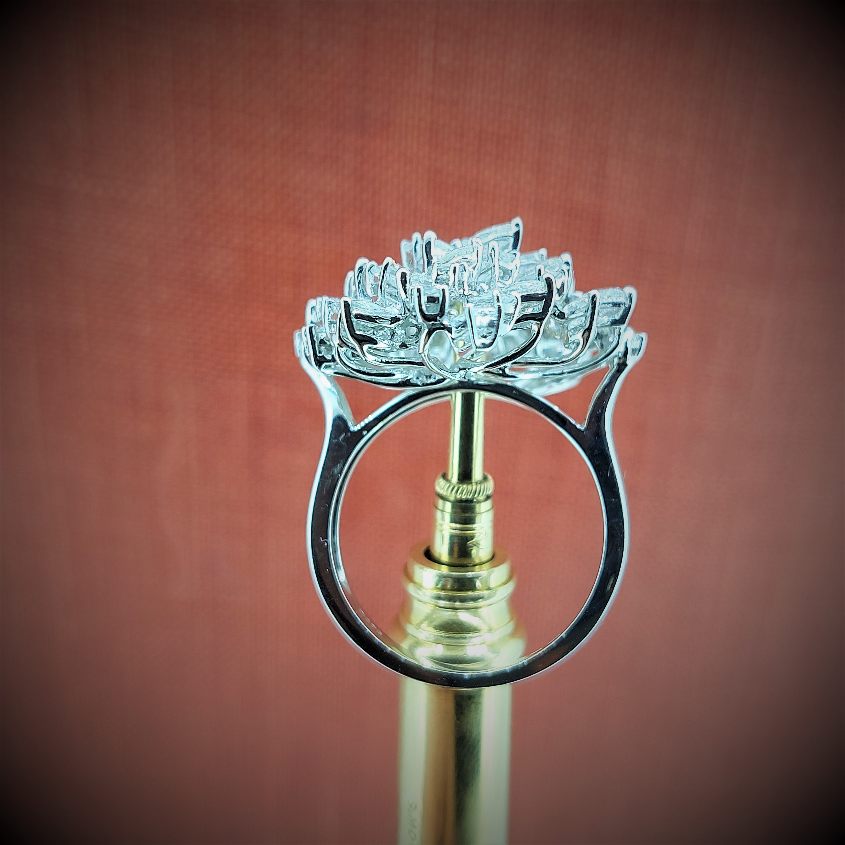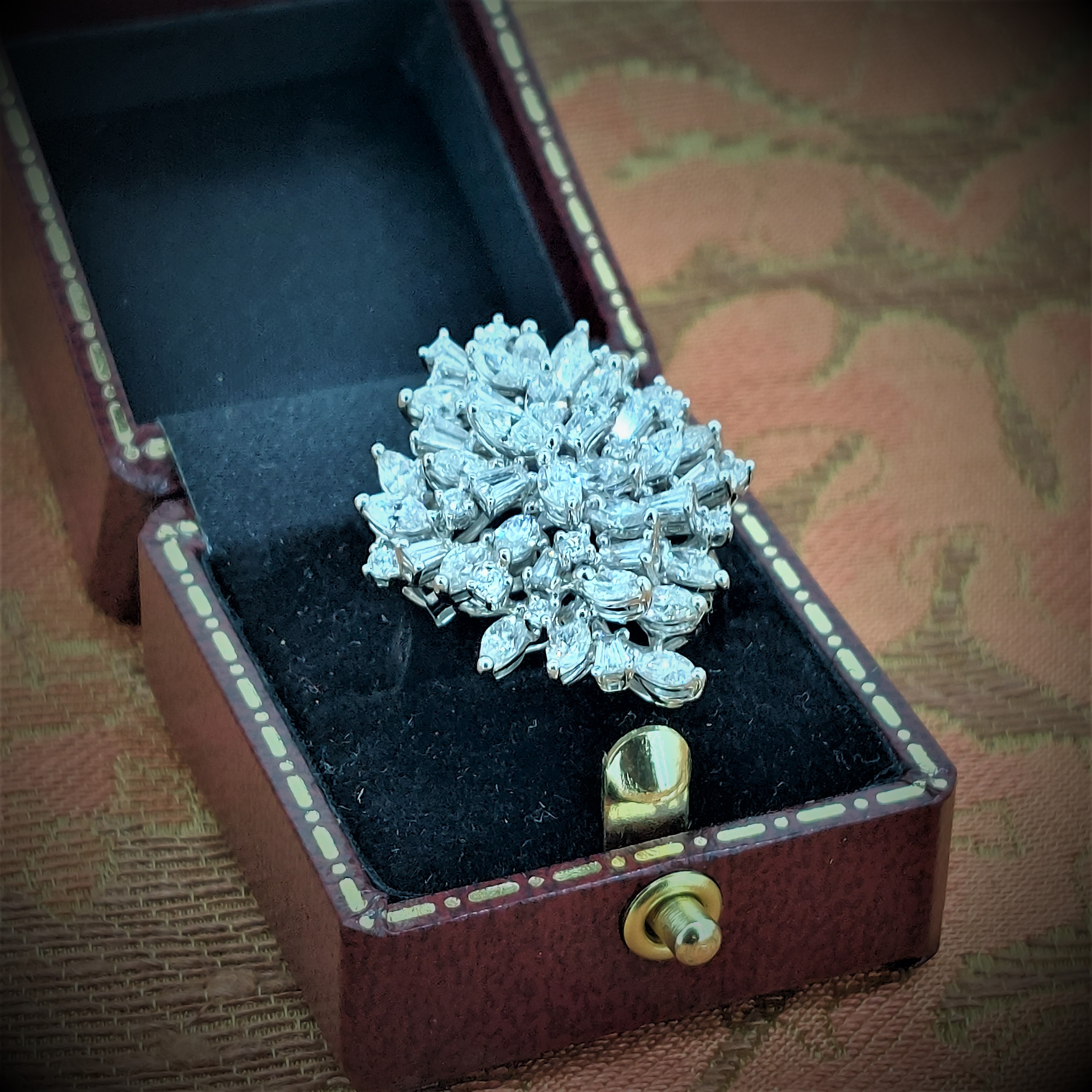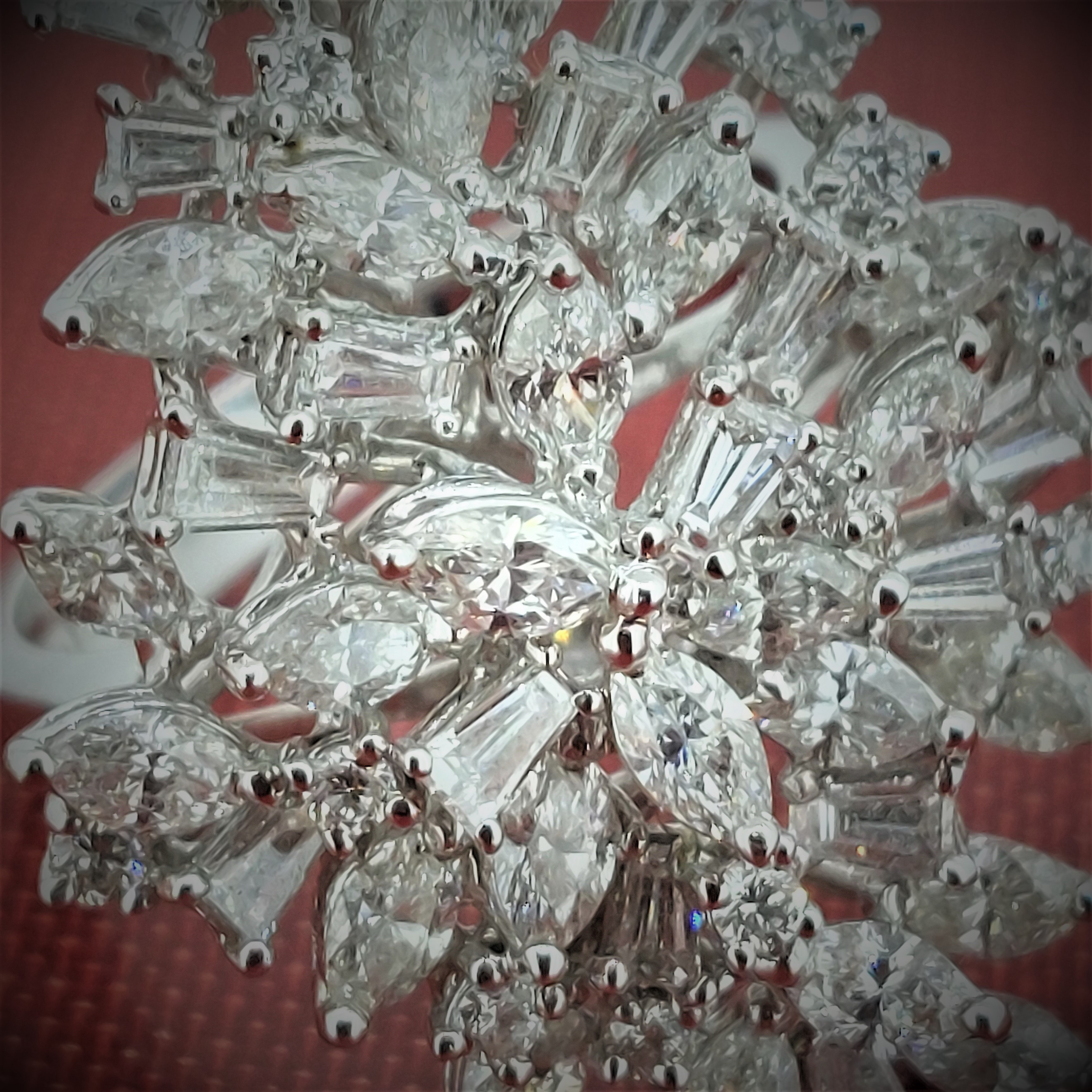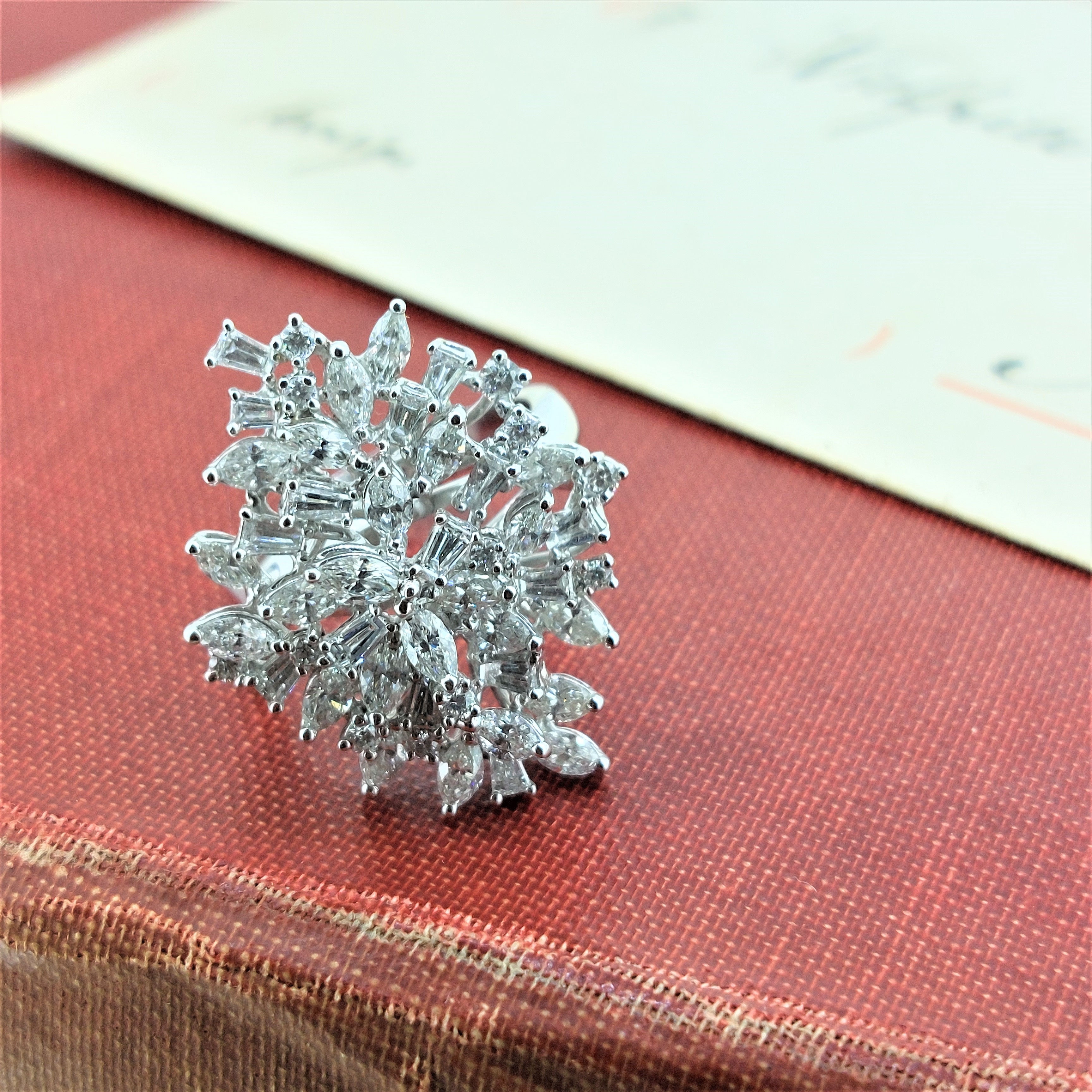 The ring is set with a mixture of Round Brilliant Cut, Baguette Cut and Marquise Cut Diamonds all individually claw set in 18ct White Gold.The total carat weight is an impressive 2.73 carats and the ring measures 32mm by 23mm. This ring will not go unnoticed. Currently size M 1/2 but can be altered to suit.