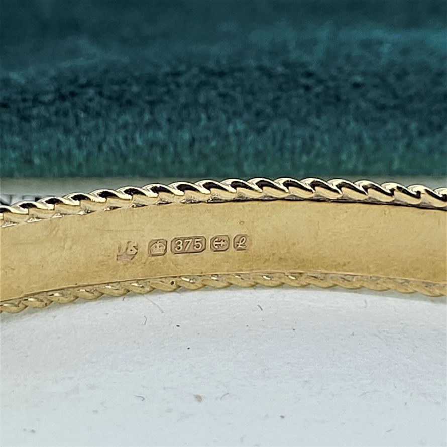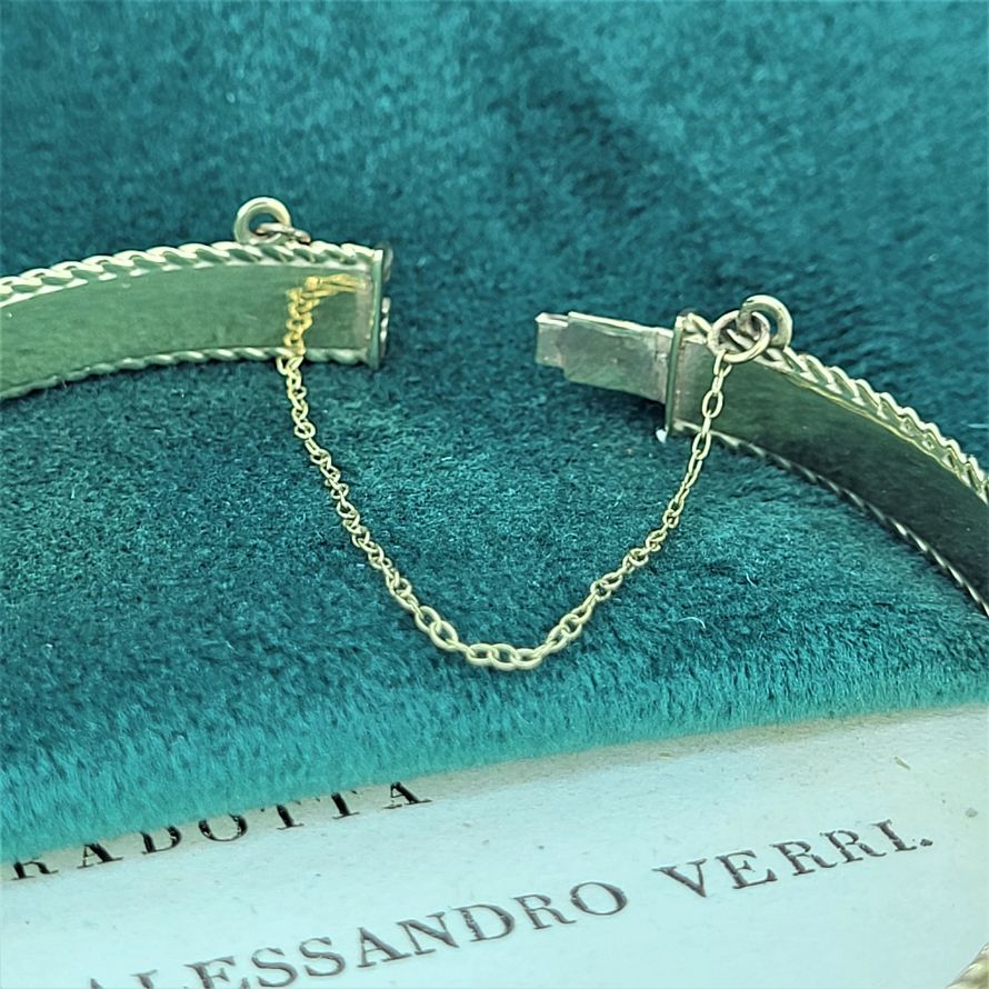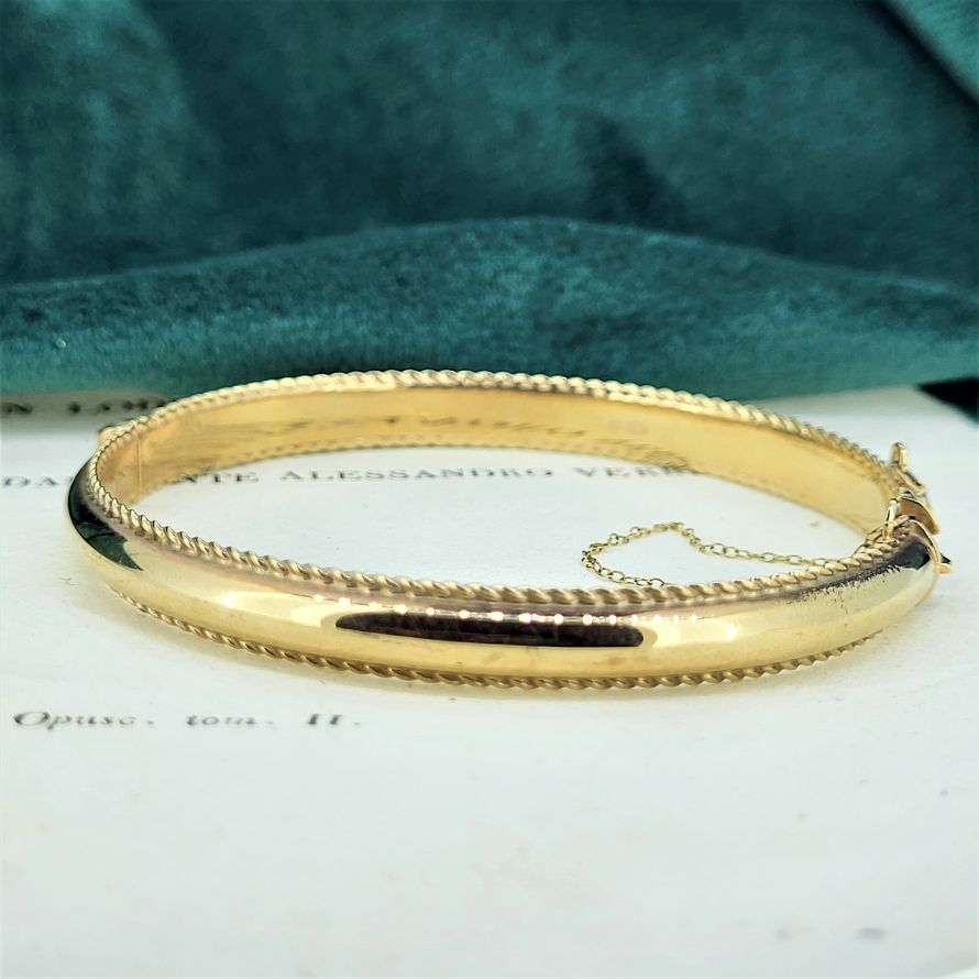 Weighing 11 grams in solid 9ct gold and designed to fit a wrist with a 6cm diameter. The bangle itself has a 7.5mm width that includes a simple, polished milgrain border. The clasp clicks perfectly in place and there is the added security of a 9ct gold safety chain for that extra piece of mind.How lucky we were to find her!