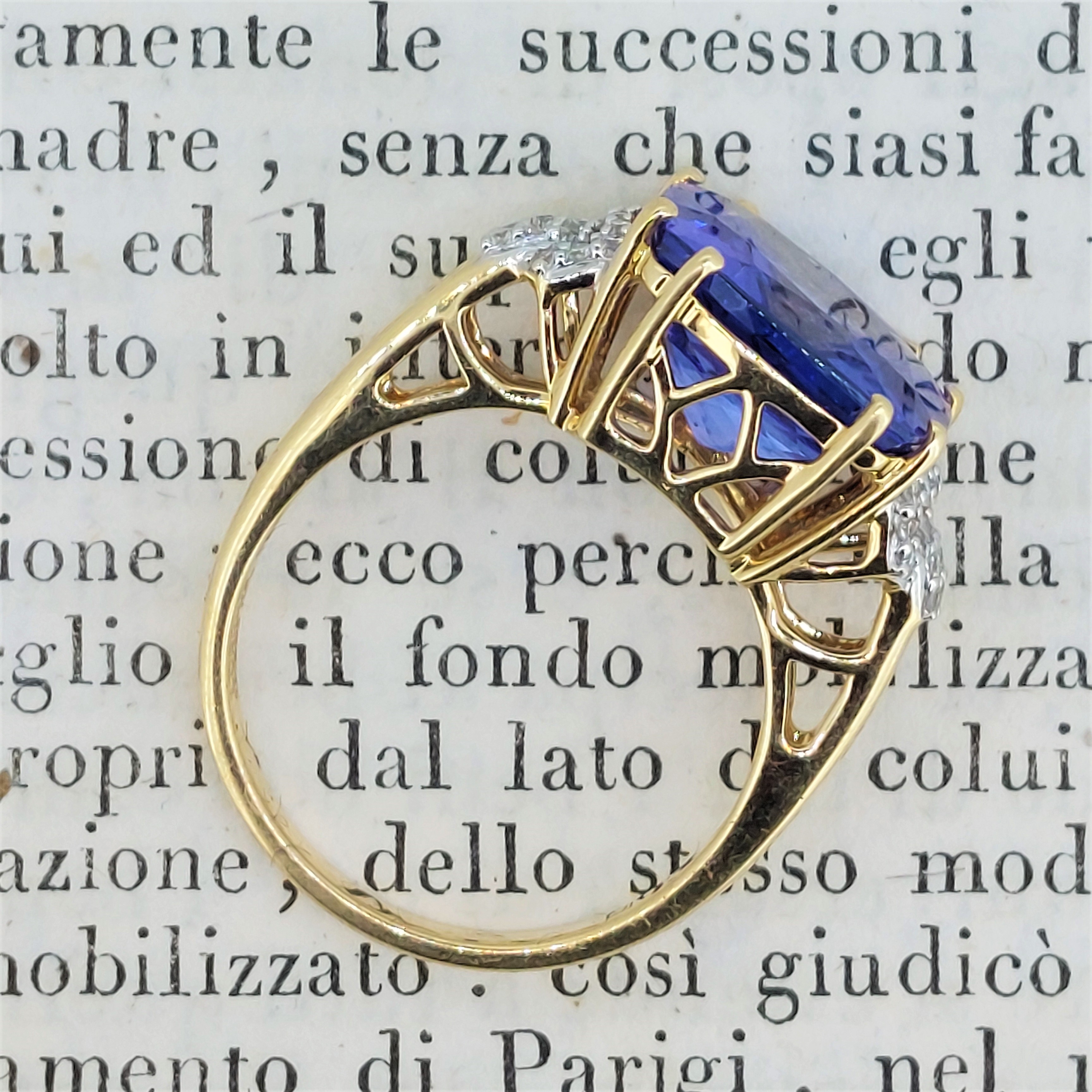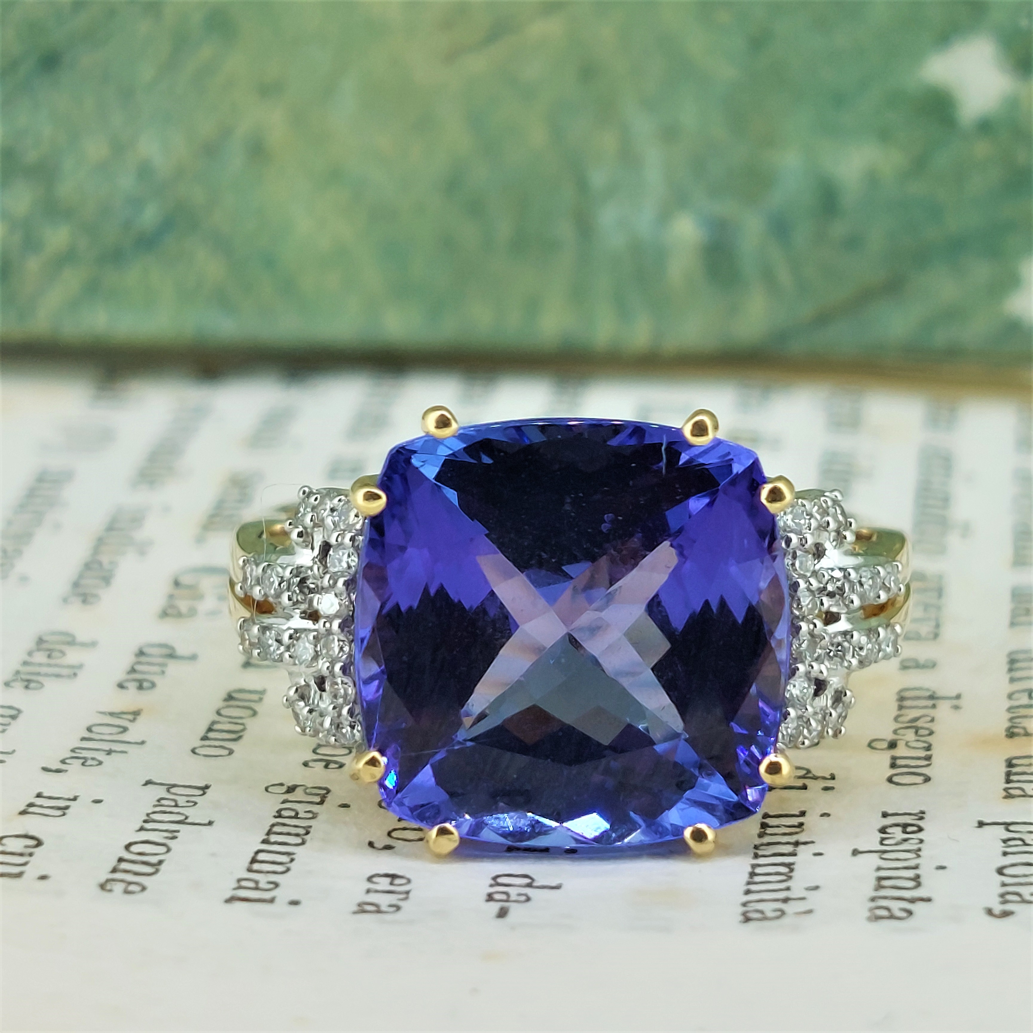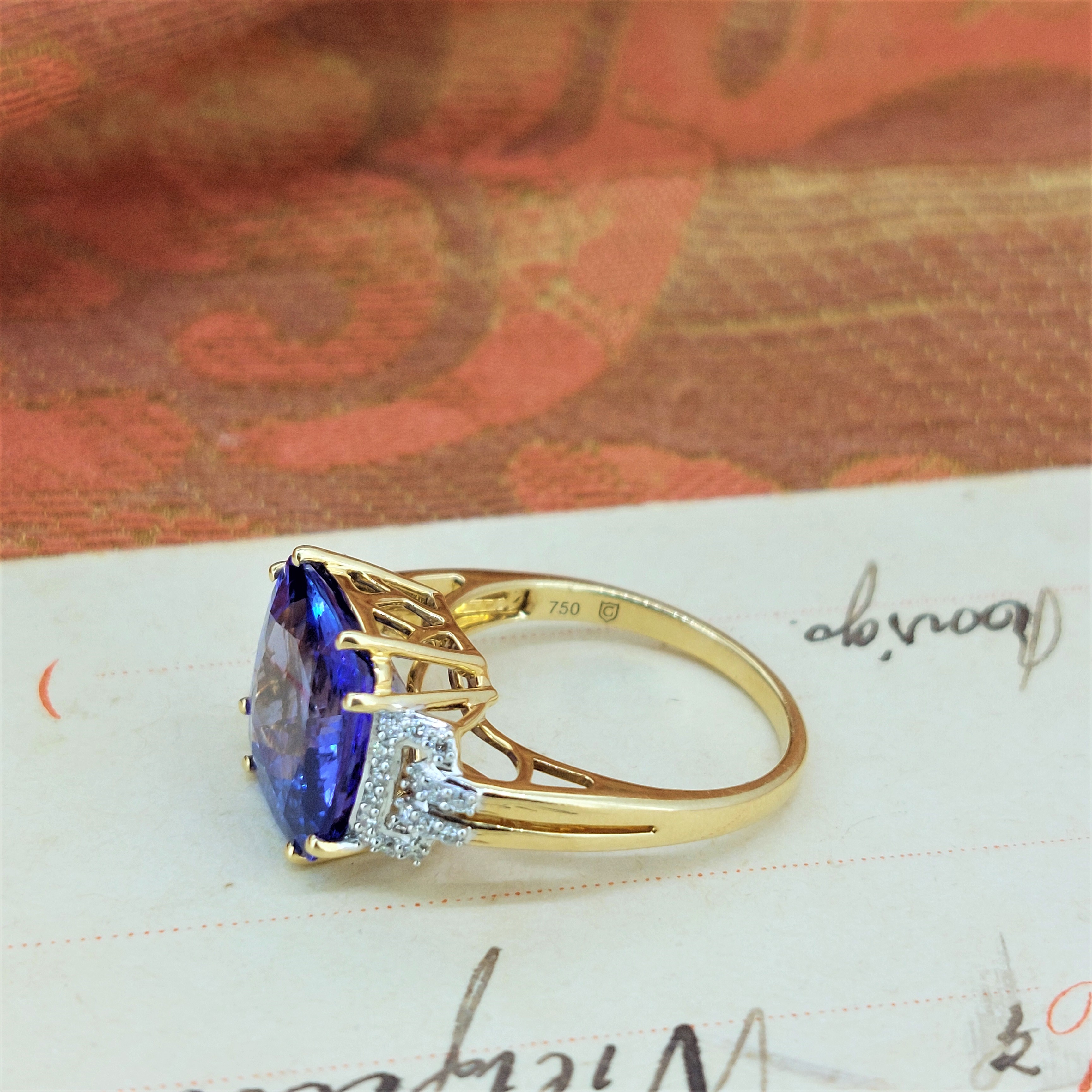 An eye catching diamond and tanzanite ring set in 18ct yellow gold. The tanzanite is a fancy french cut weighing approximately 7.5ct set with symmetrical round brilliant cut diamonds weighing approxiamtely 0.20ct. Currently size N but can be sized to fit. Unworn (new, old stock).