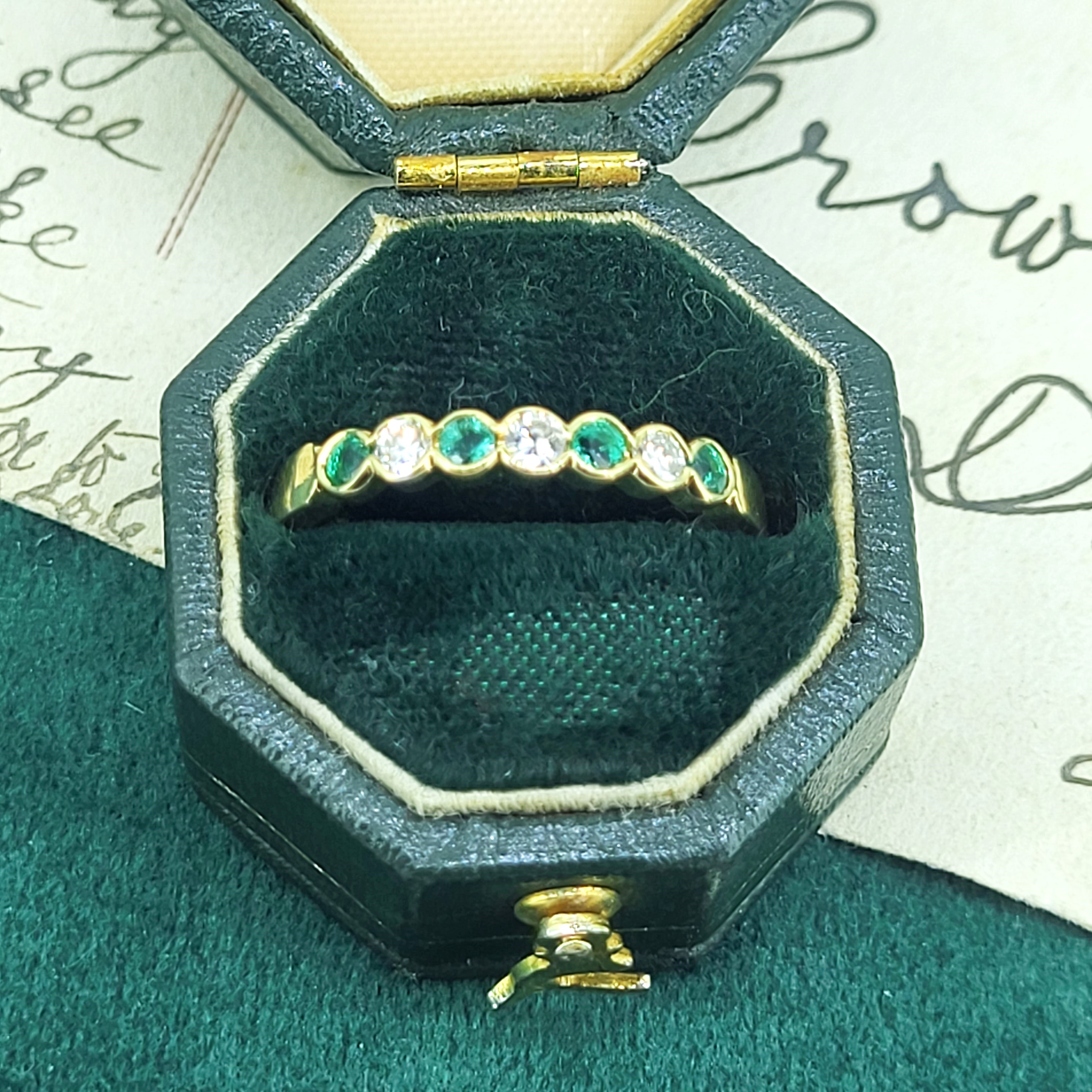 An Emerald and Diamond Half Eternity Ring crafted from 18ct Yellow Gold.