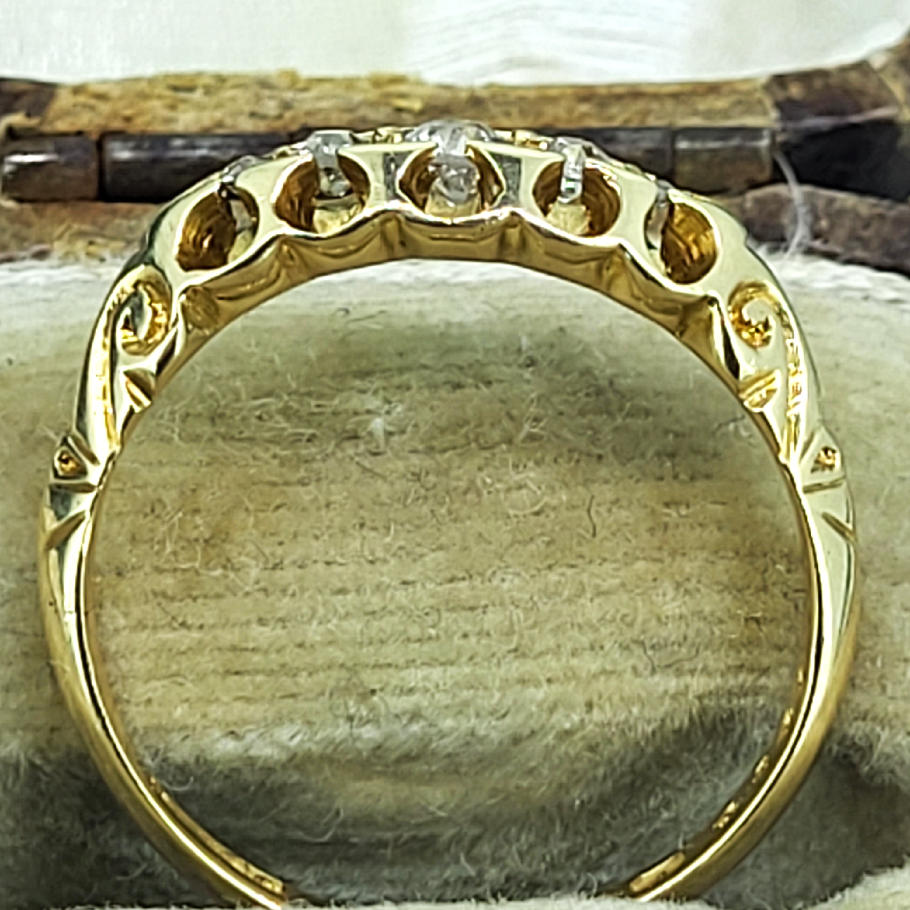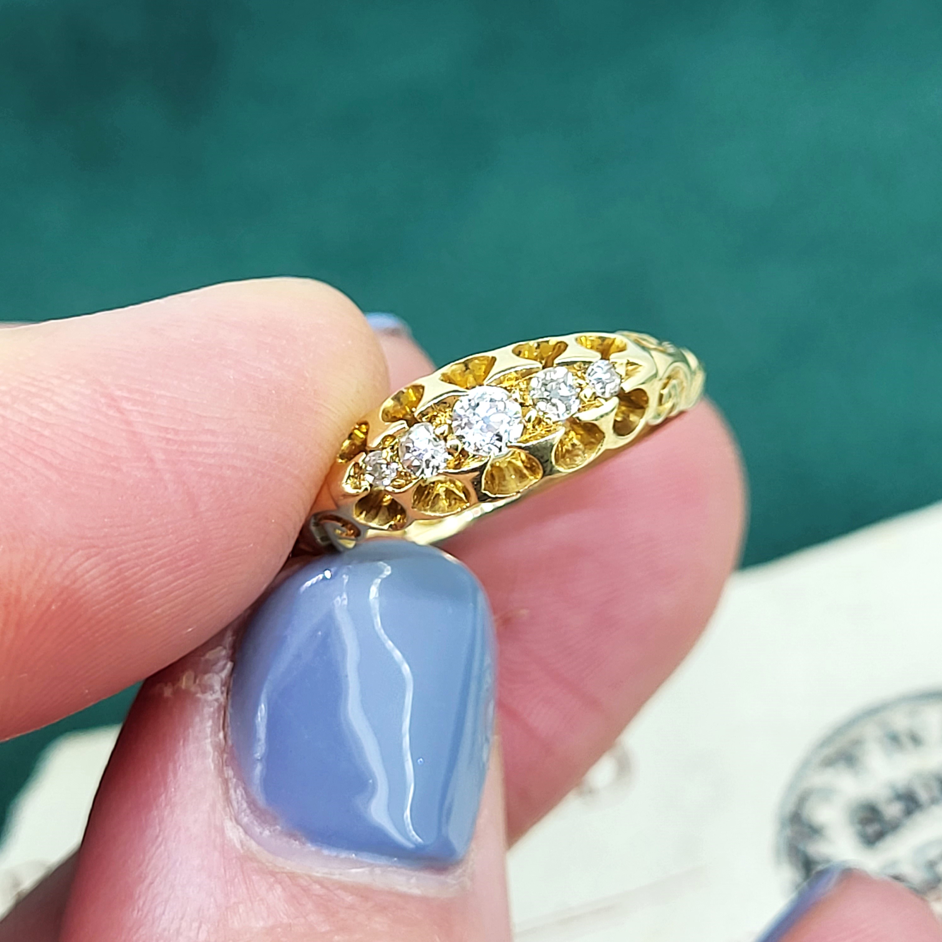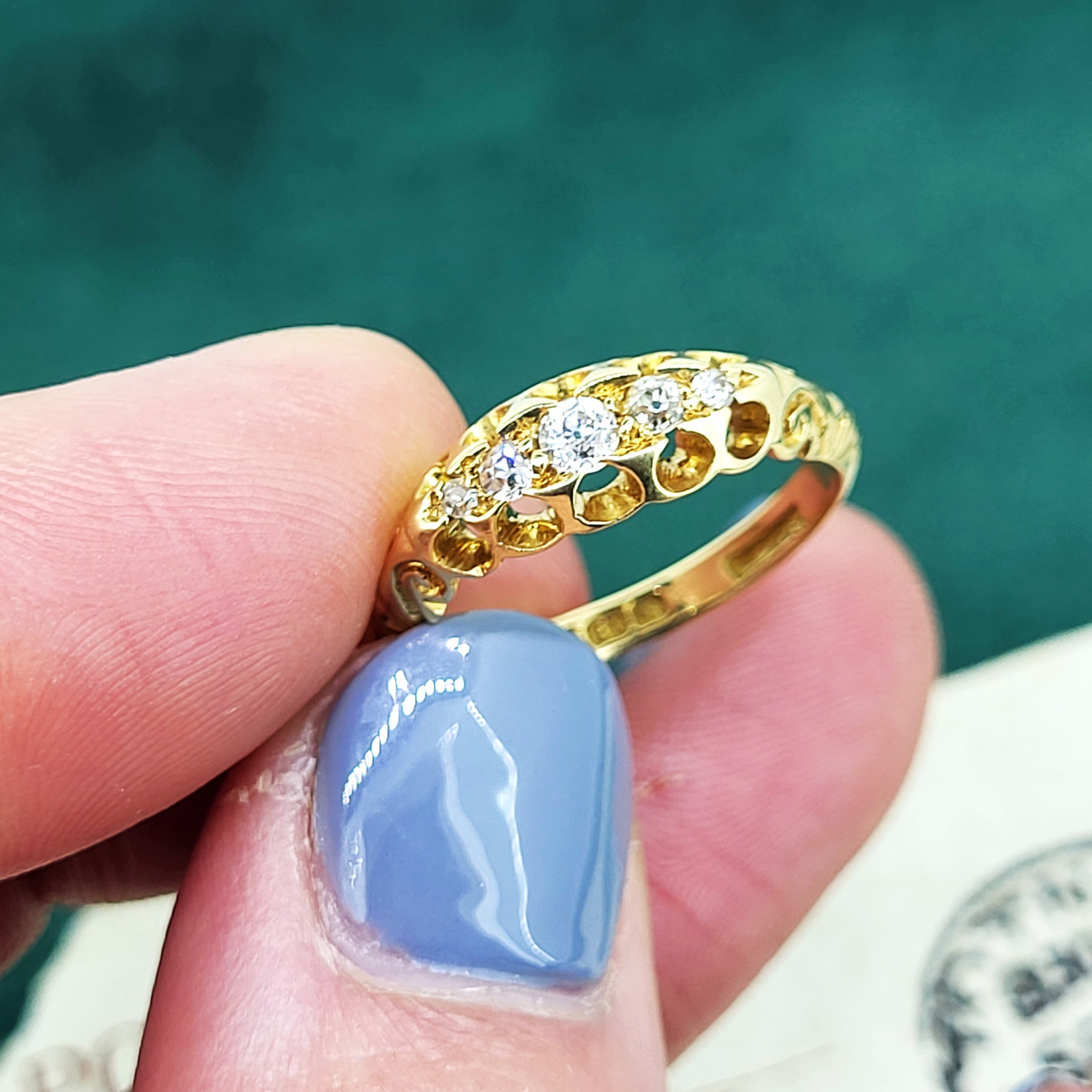 It measures 6mm at its widest point and tapers to a substantial 2.5mm shank. The ring was hallmarked in Chester in 1901 and is delightfully pretty.