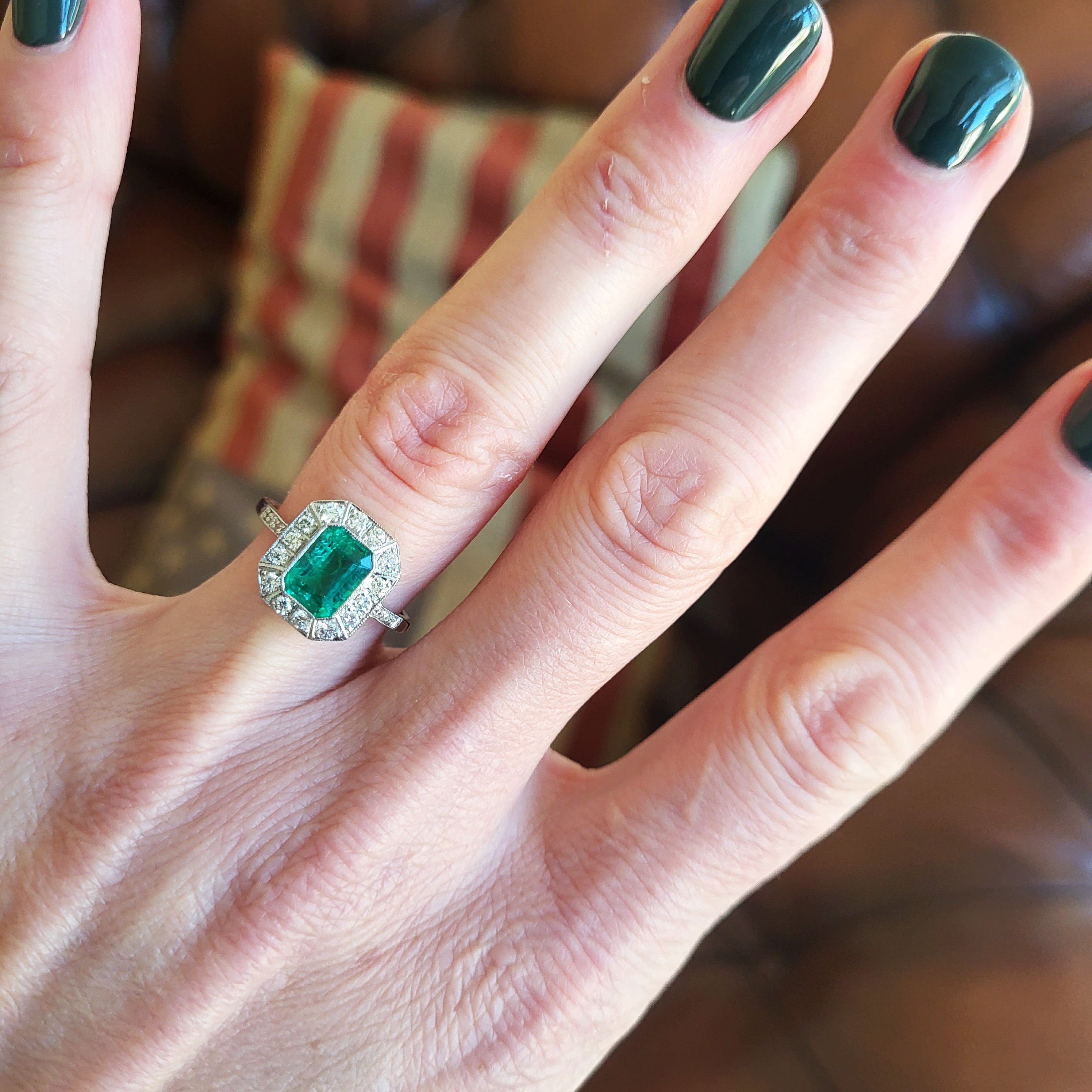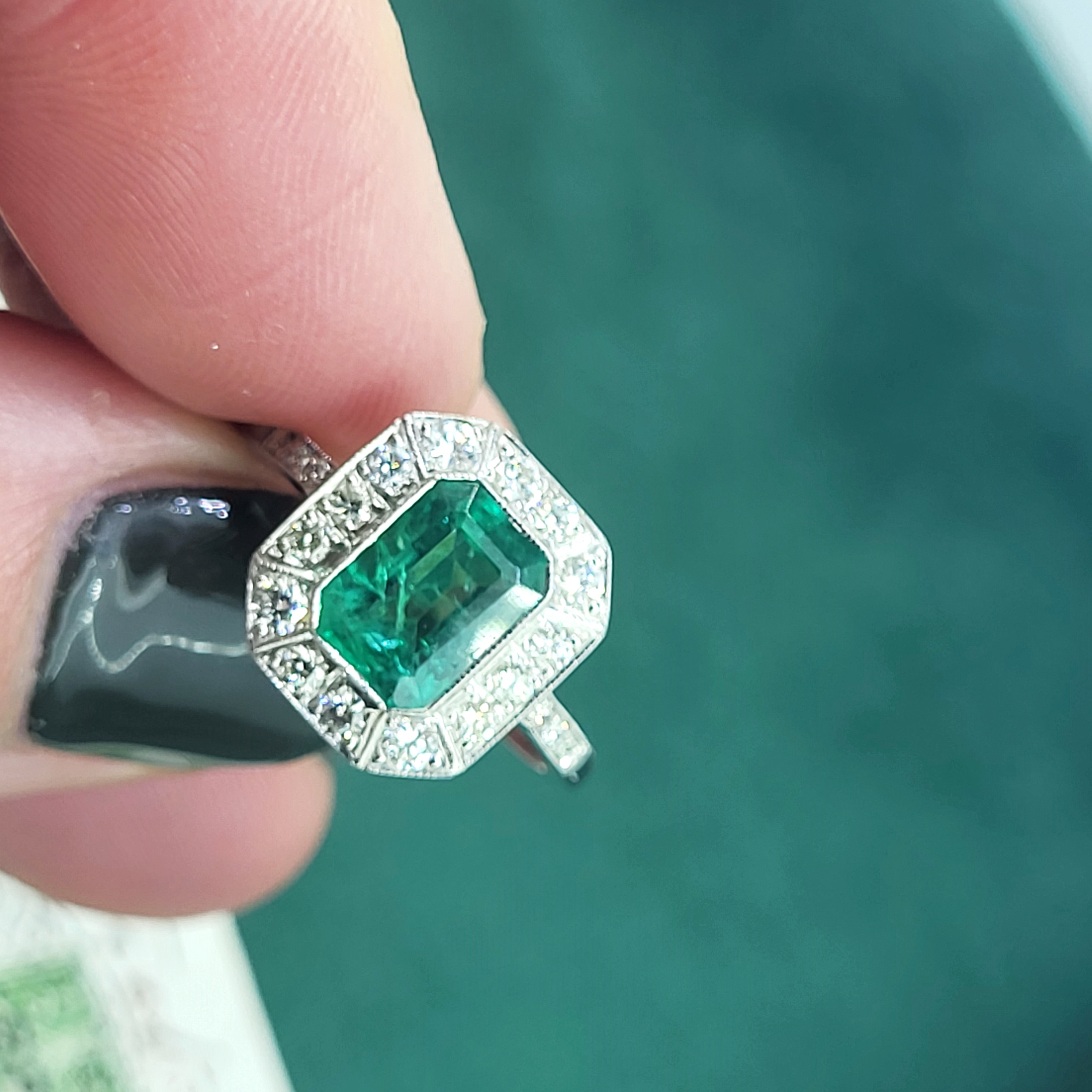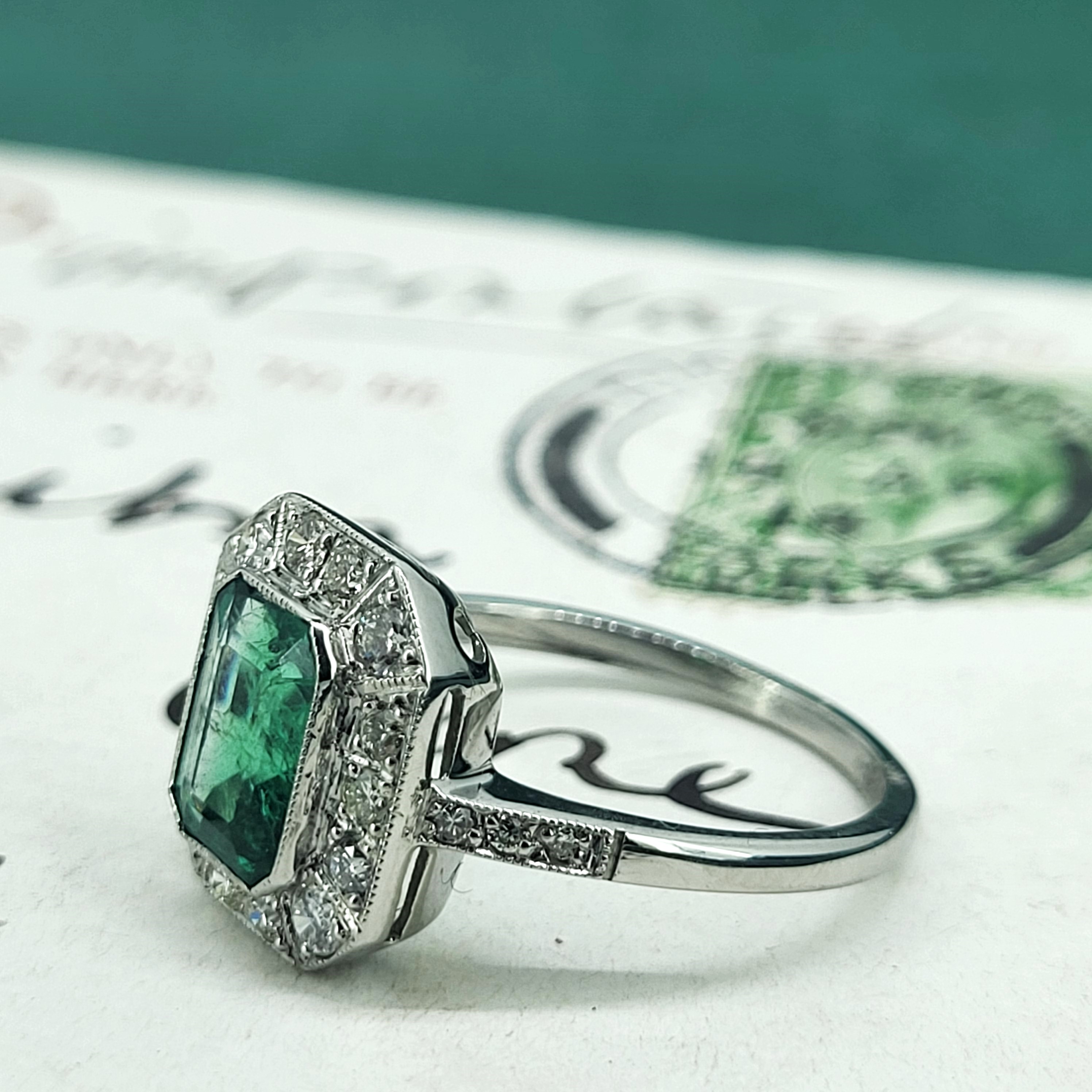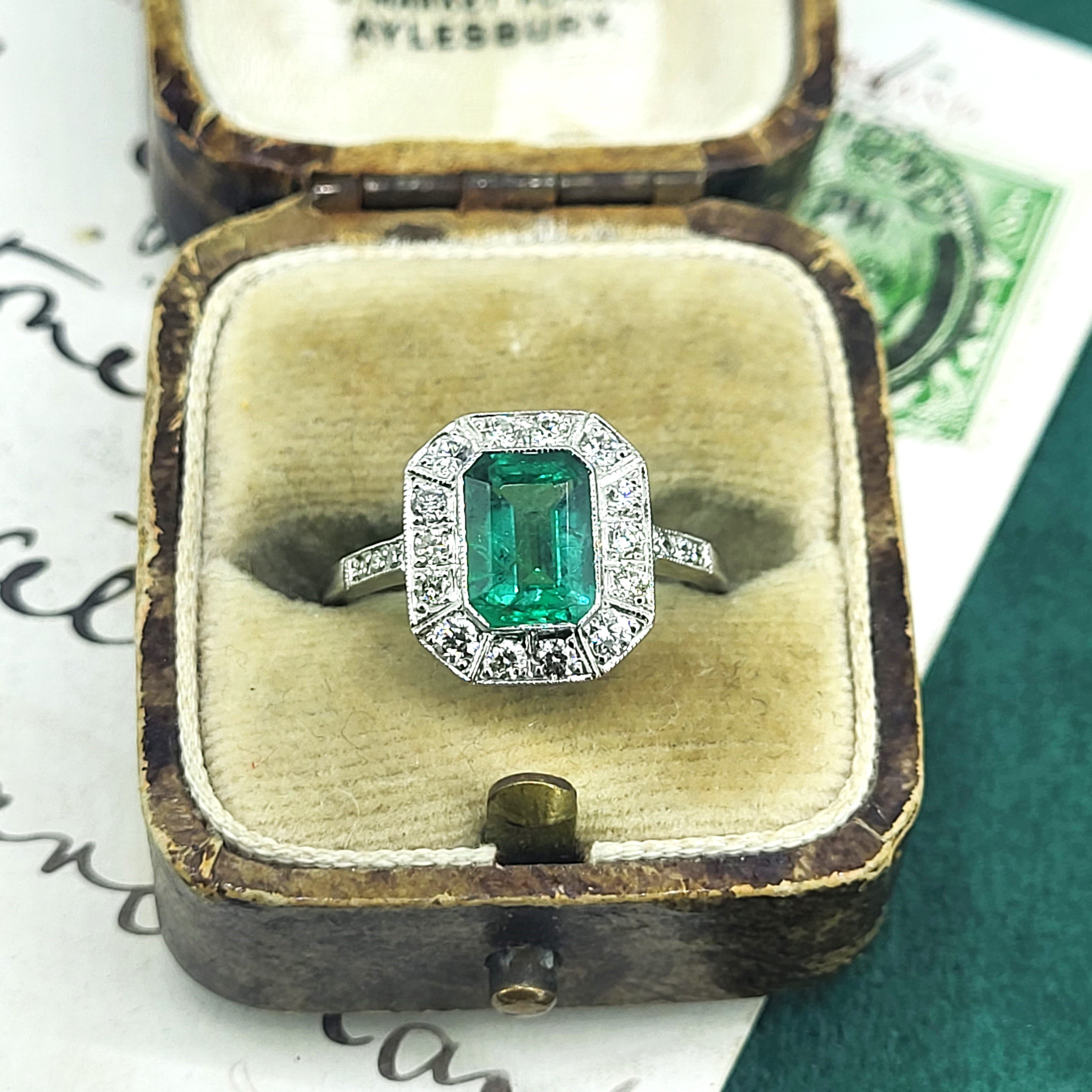 The emerald is a vibrant green and measures 8mm by 6mm, weighing in excess of an impressive 1.50cts. It is surrounded by bright white round brilliant cut diamonds weighing 0.50cts. It has a grain setting which gives it that vintage/art deco feel.