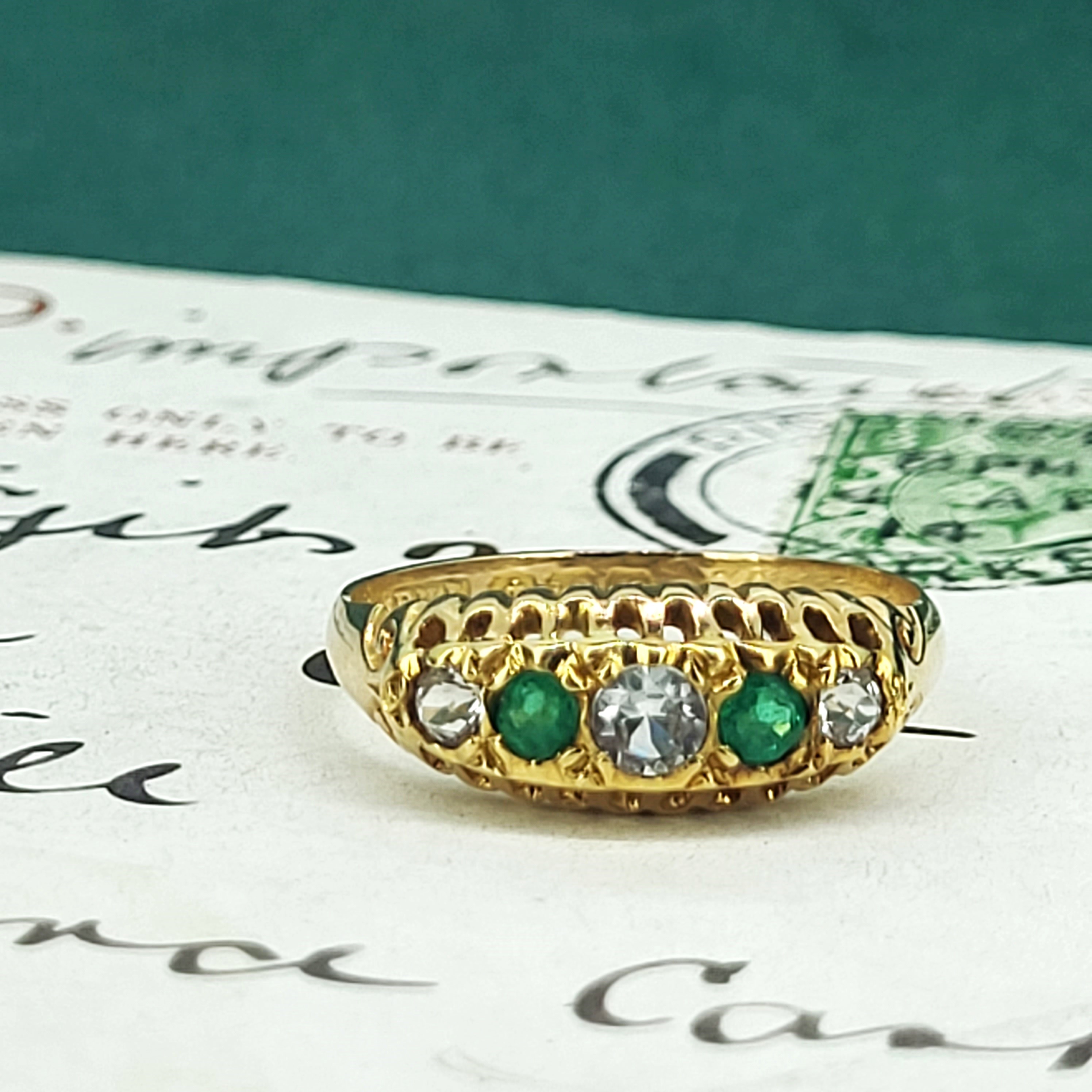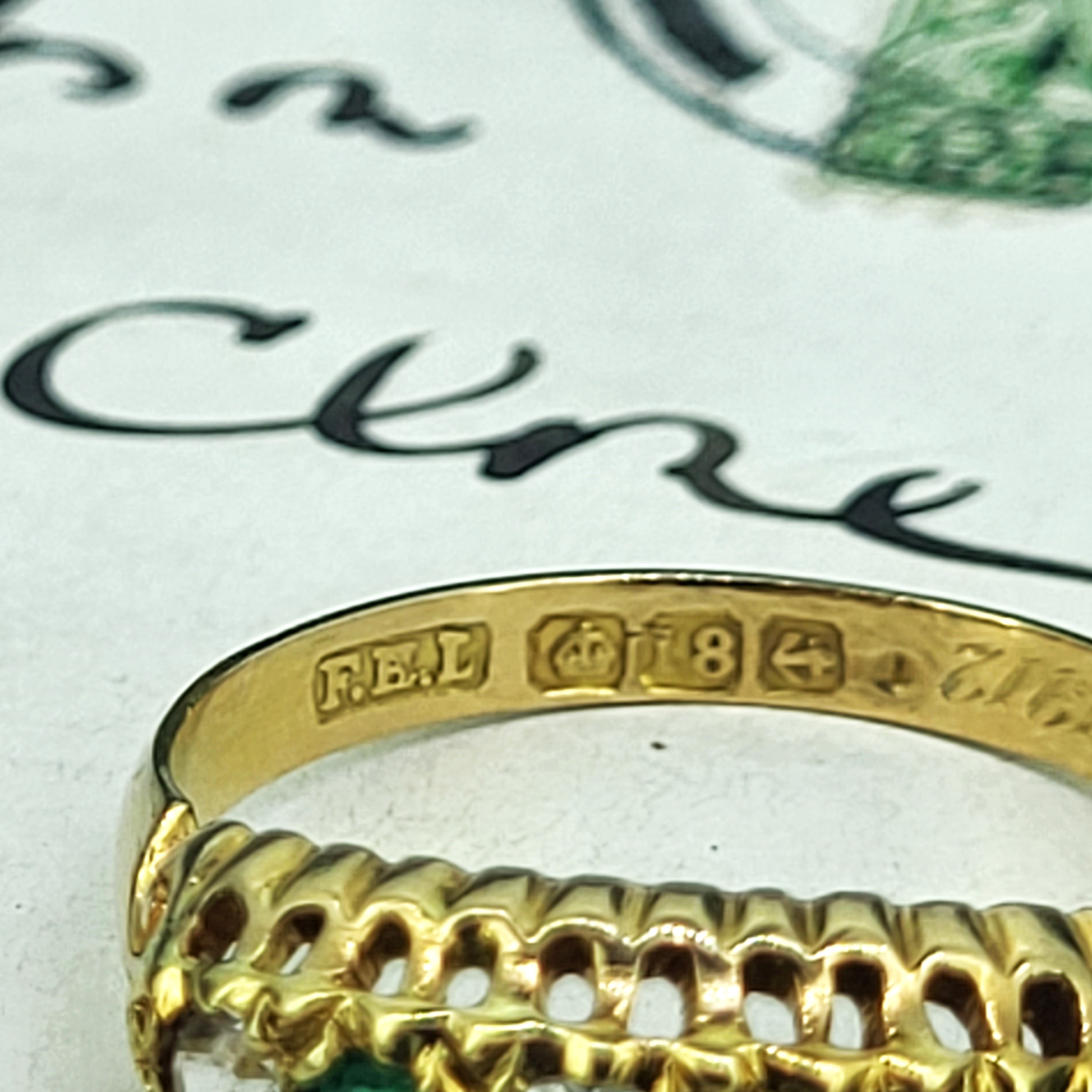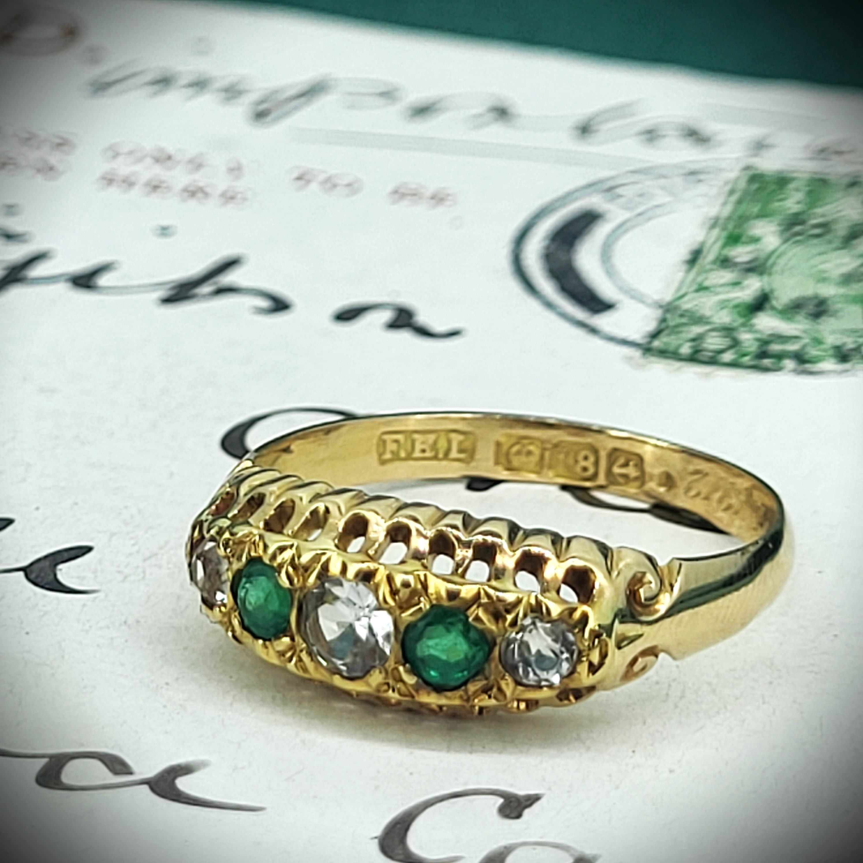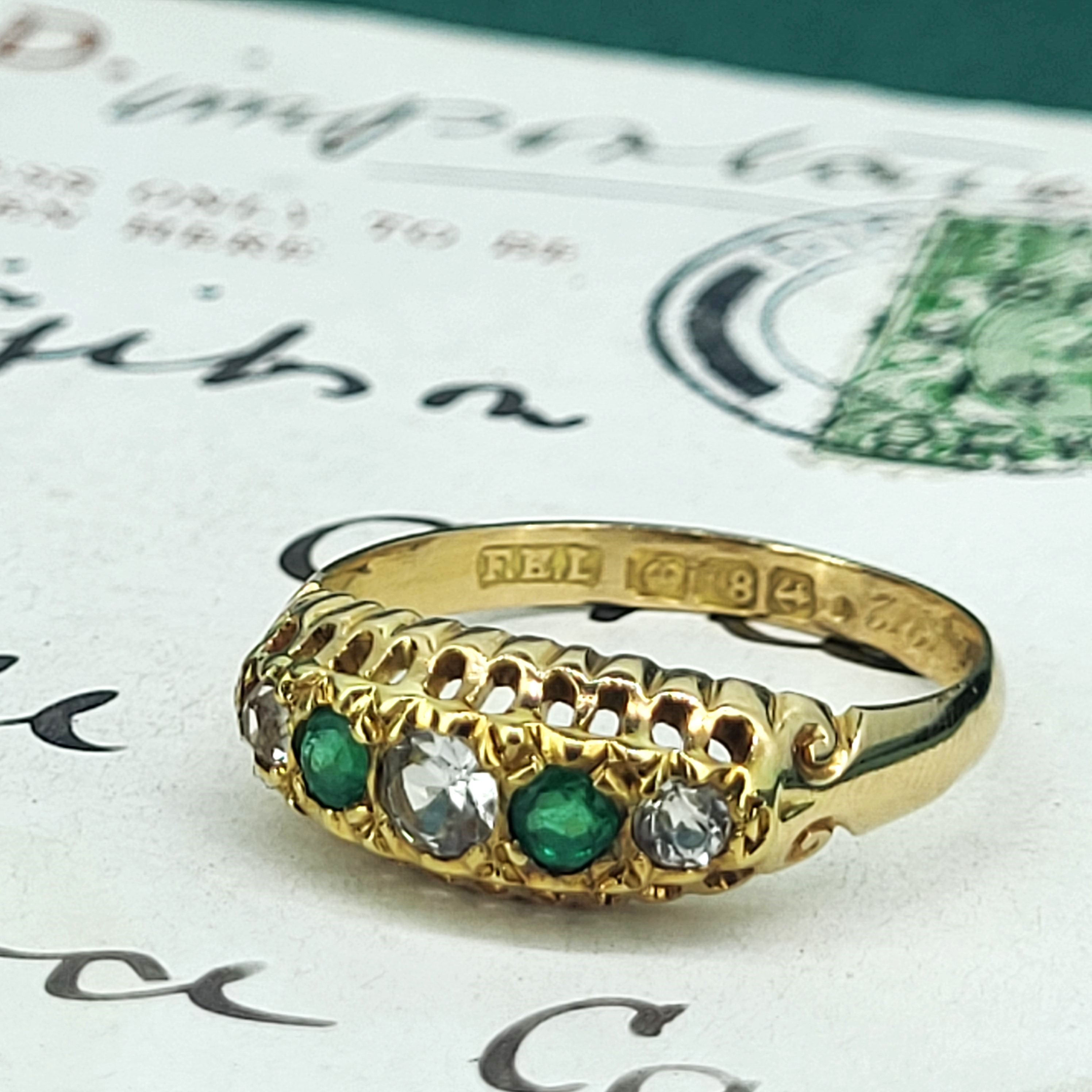 An Antique Paste Ring crafted from 18ct Yellow Gold. The ring features alternating green and white paste stones that are delightfully bright.
