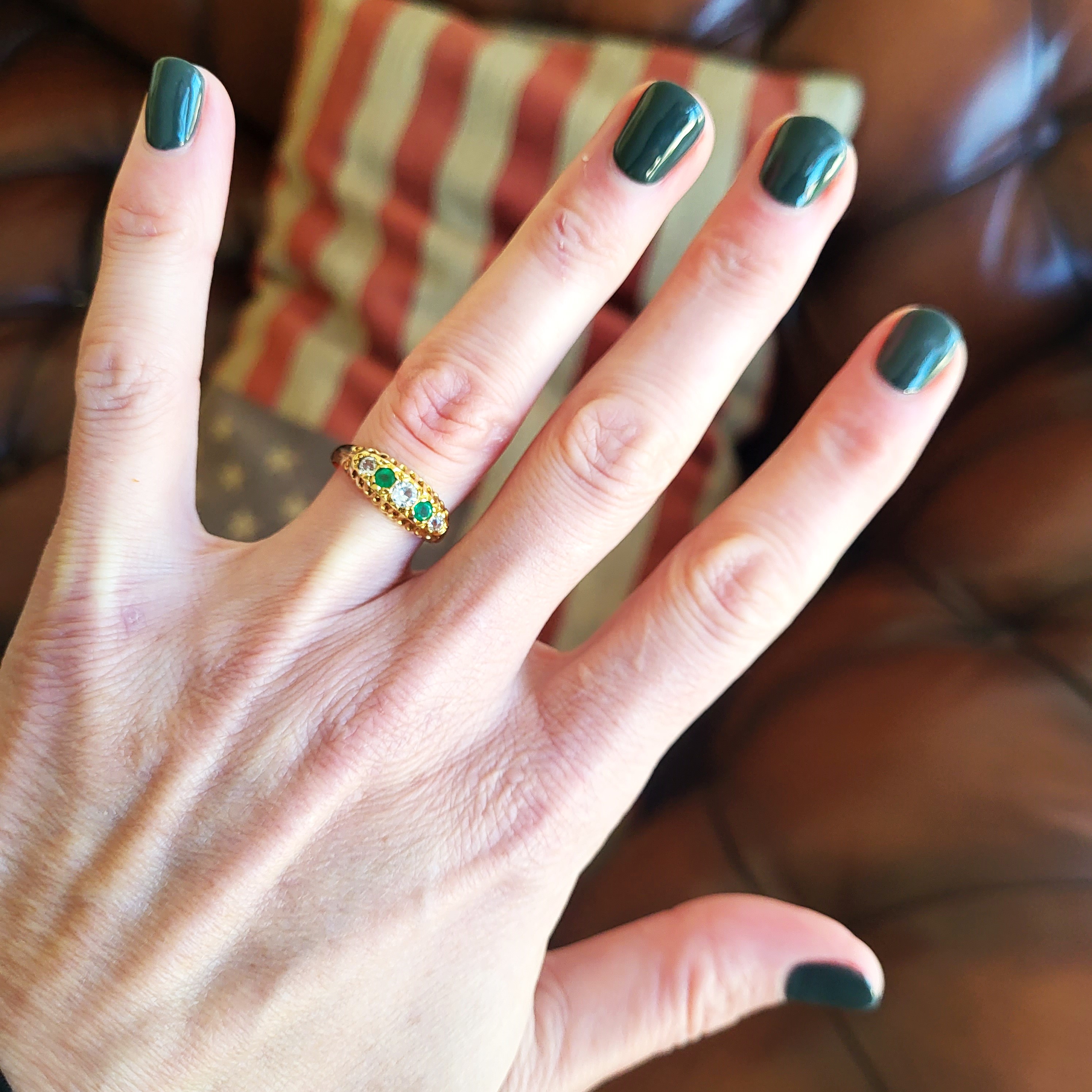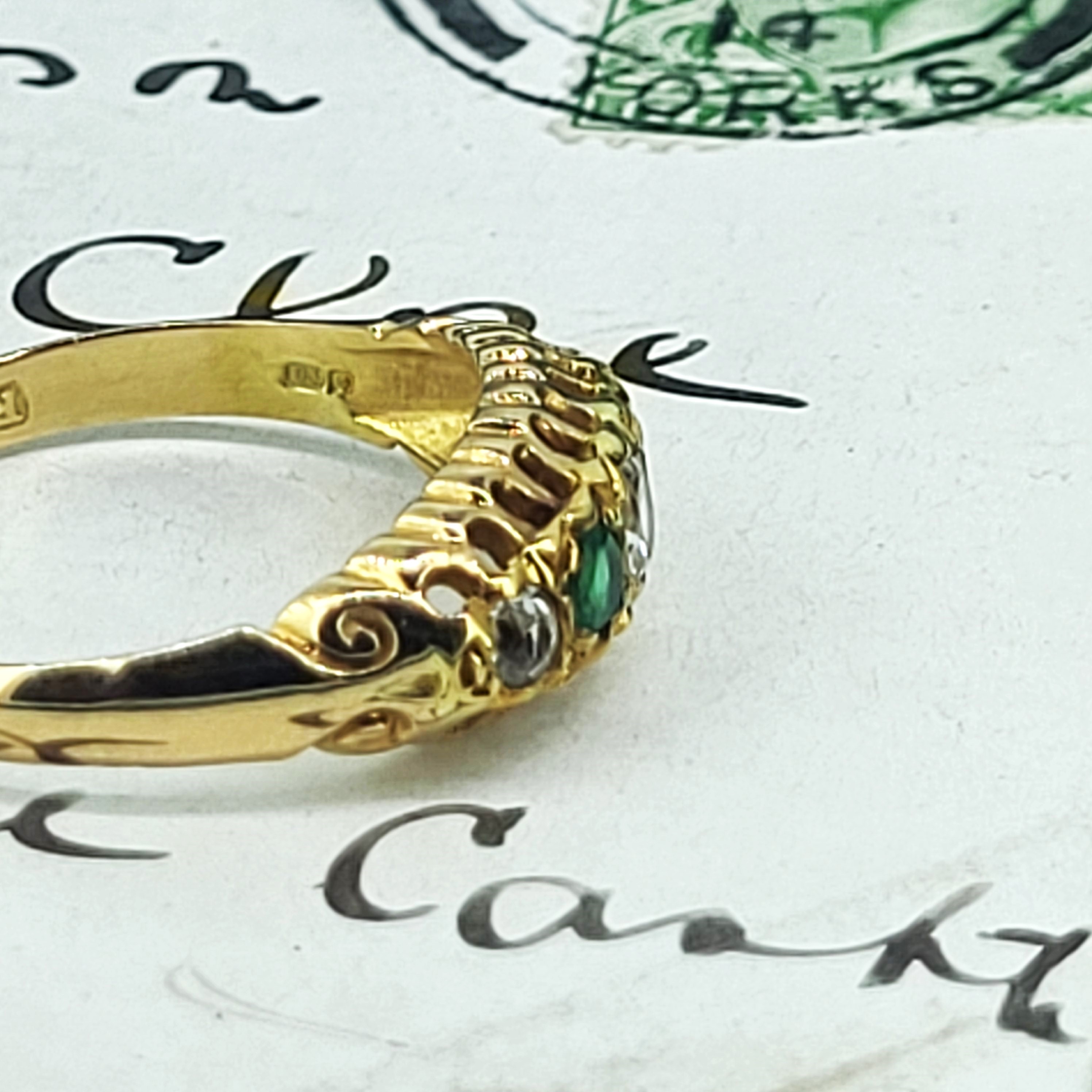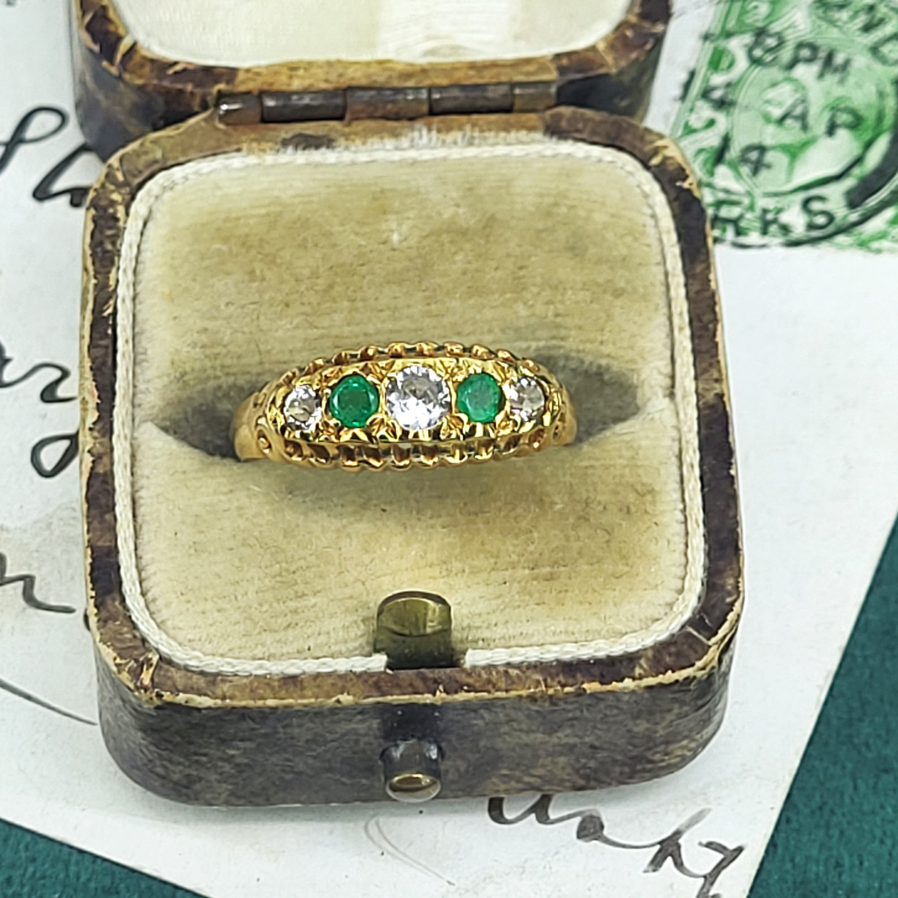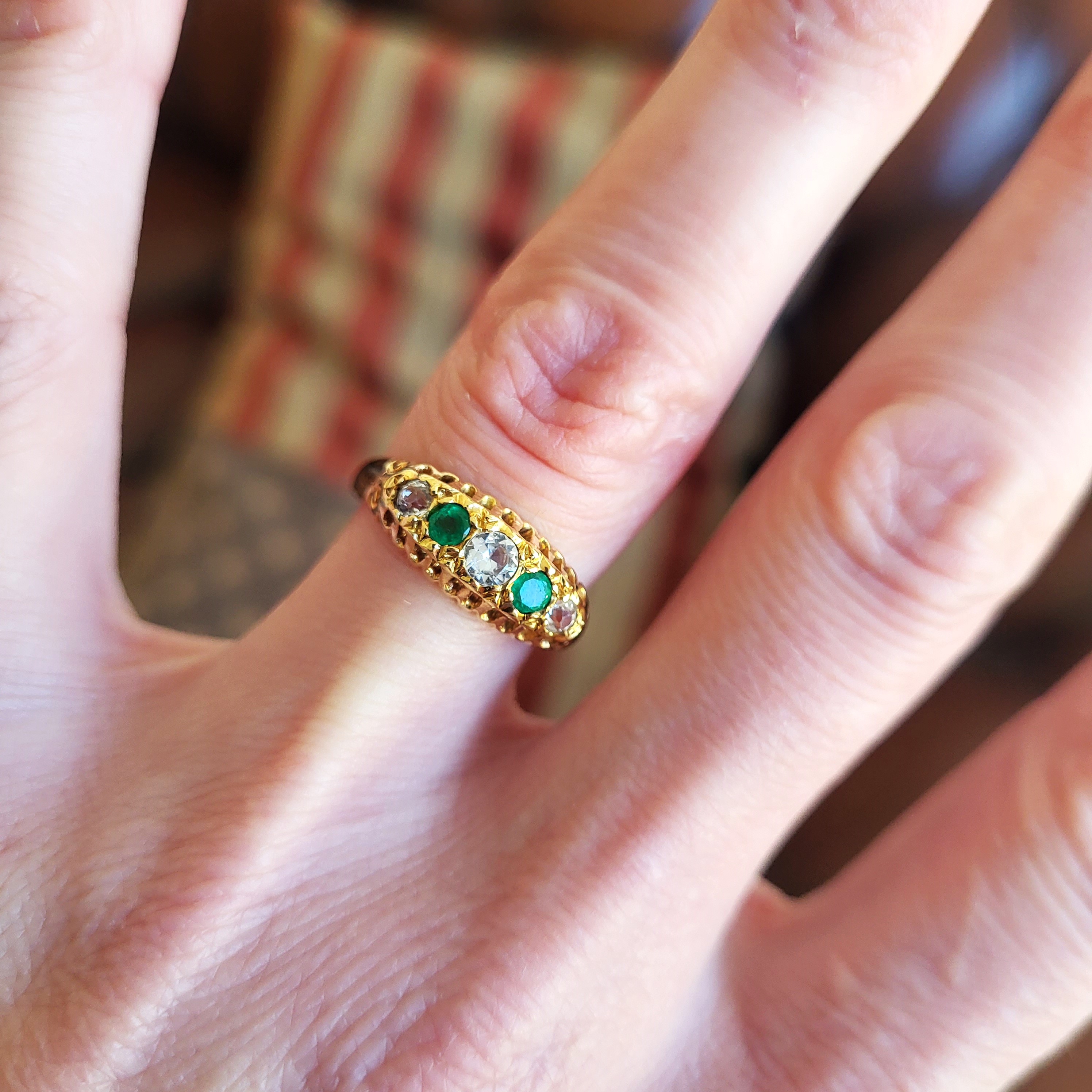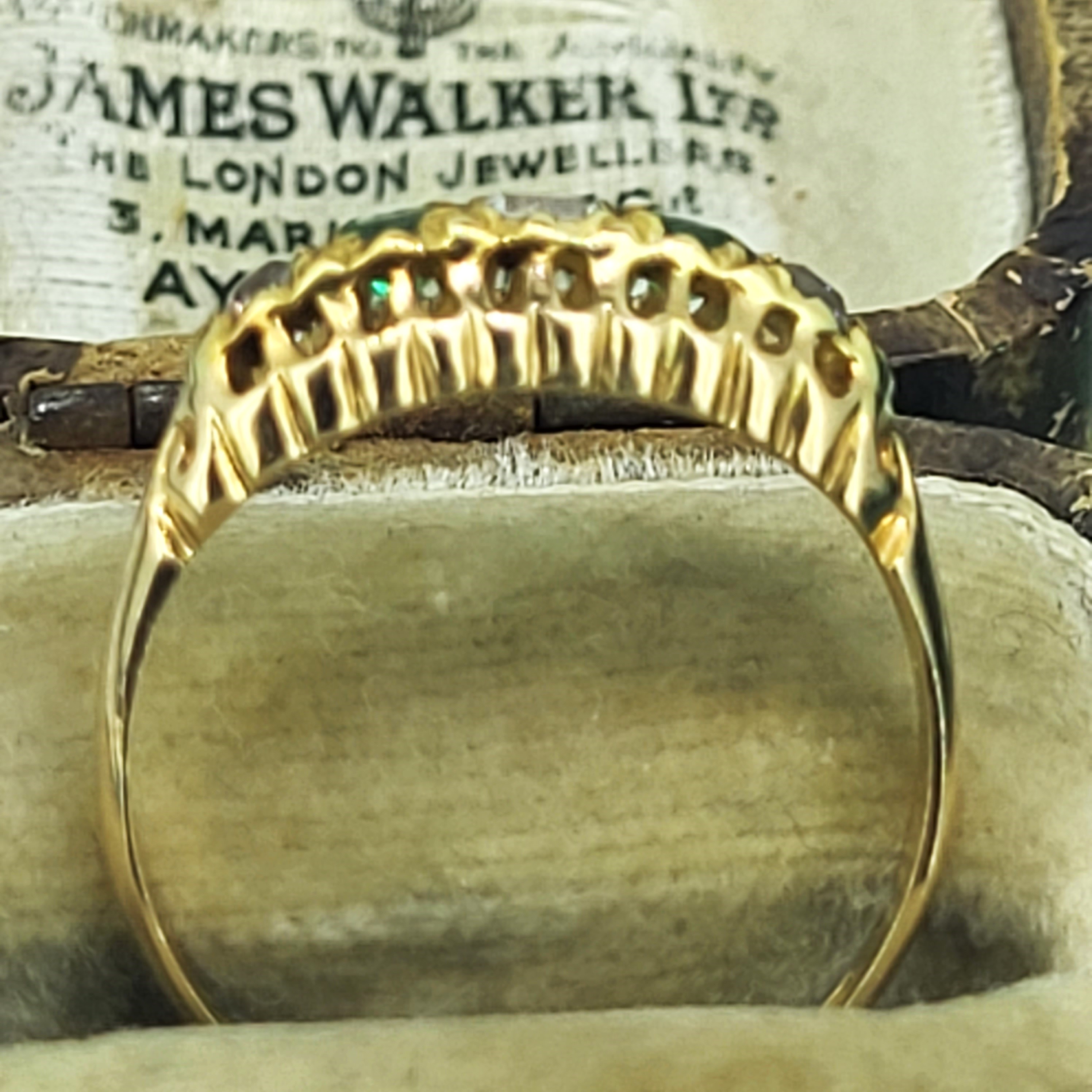 An Antique Paste Ring crafted from 18ct Yellow Gold. The ring features alternating green and white paste stones that are delightfully bright.