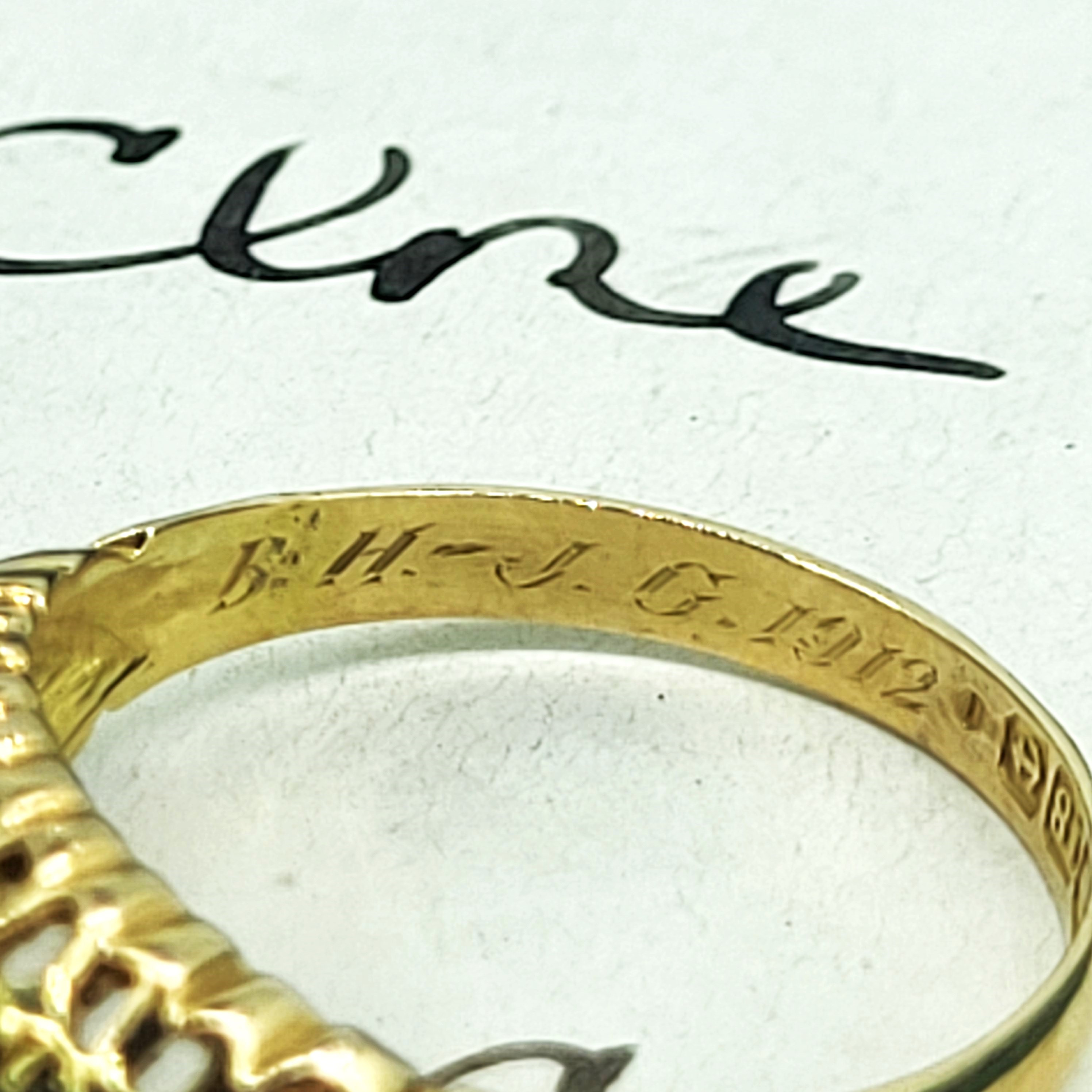 The ring was hallmarked in Birmingham by F.H.L who we unfortunately cannot find any further information on. It also features the engraving 'B.H. - J.G. 1912'.