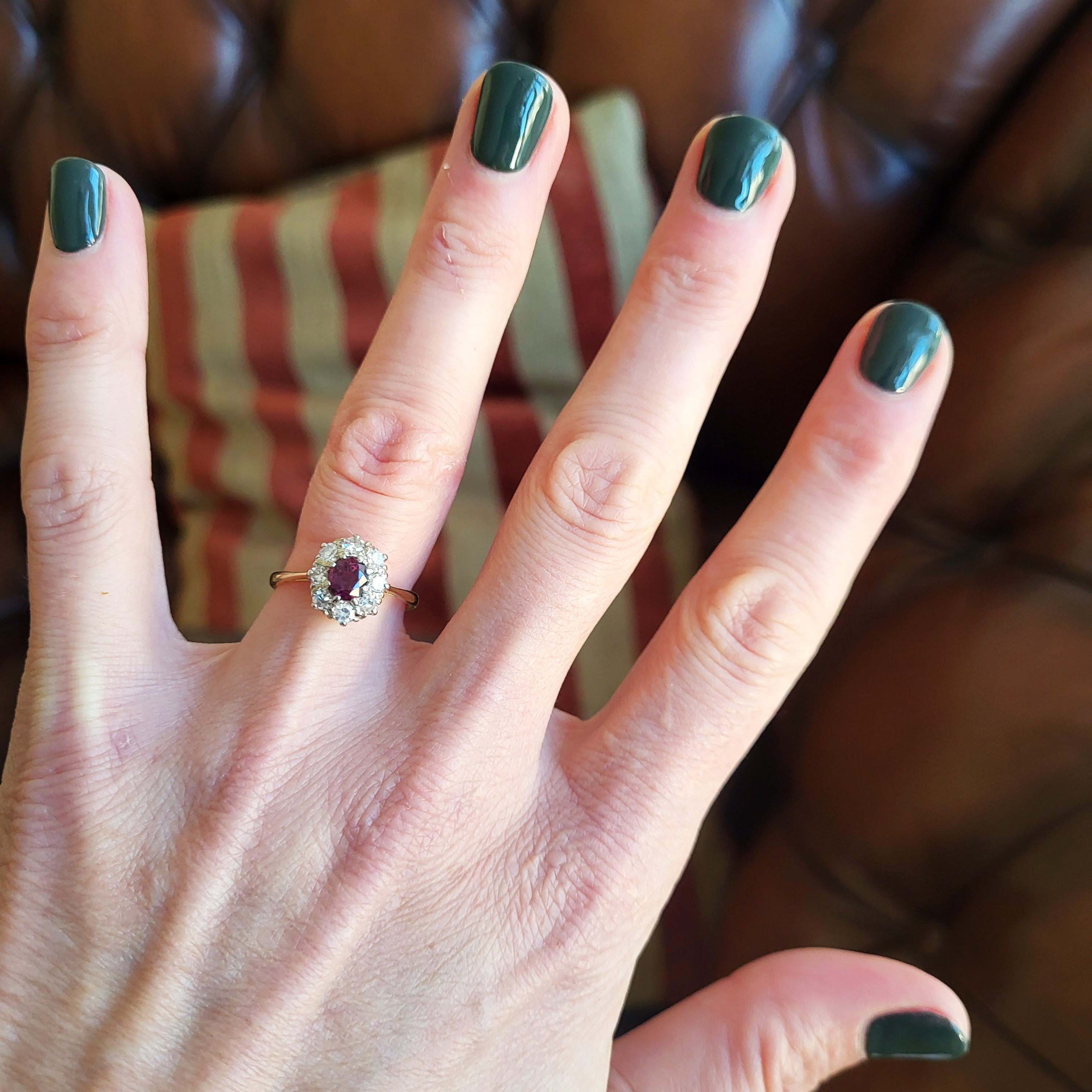 The ring features a slightly oval ruby measuring 5.5mm by 5mm which is surrounded by 8 round brilliant diamonds weighing 0.50cts. The ruby is a lovely merlot colour and the diamonds are fabulously brilliant.
