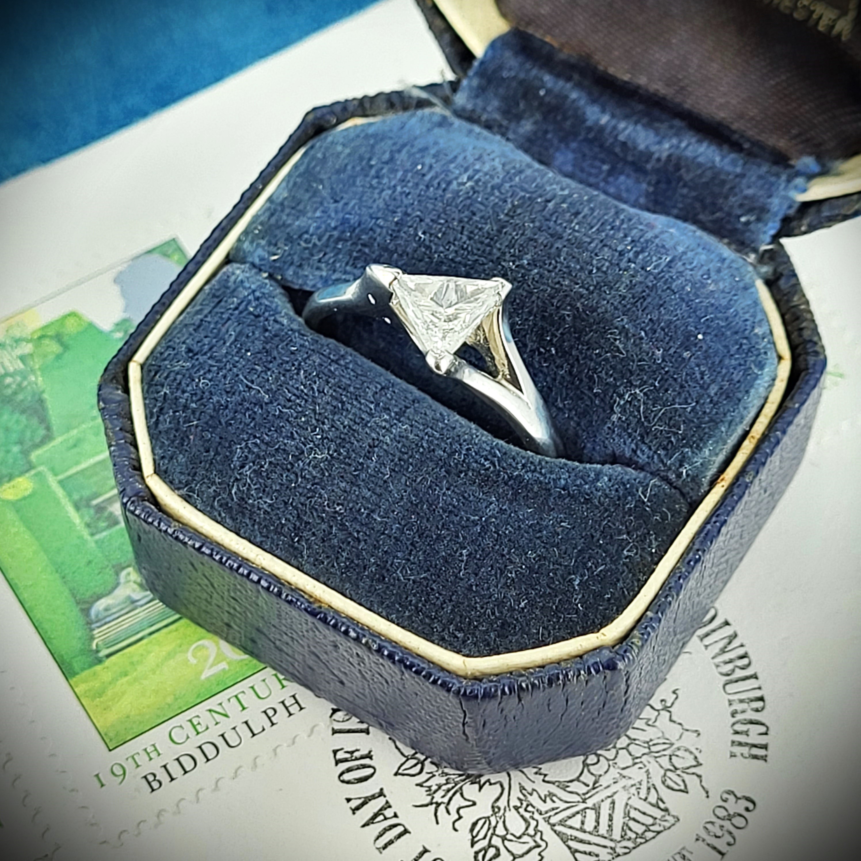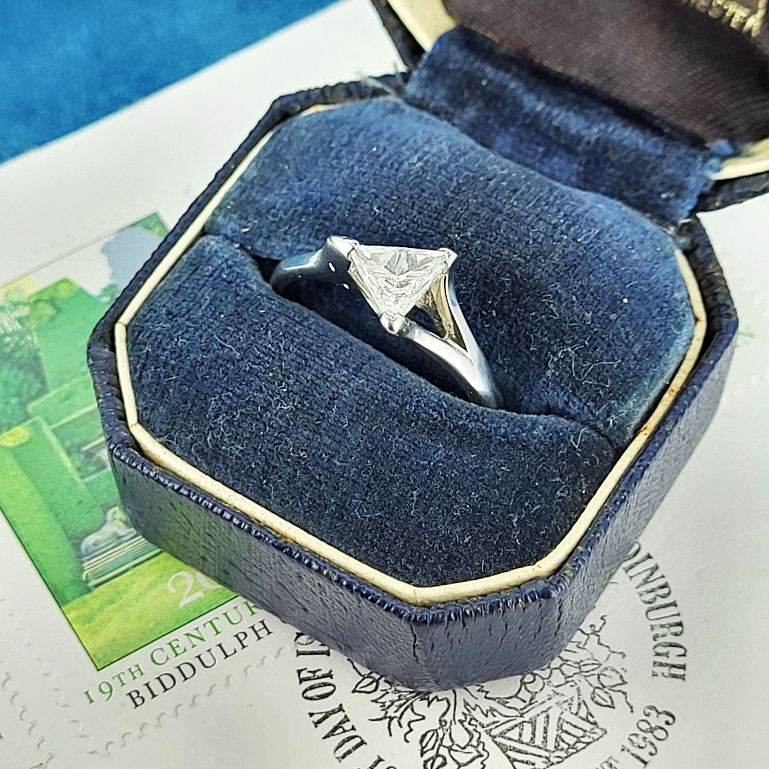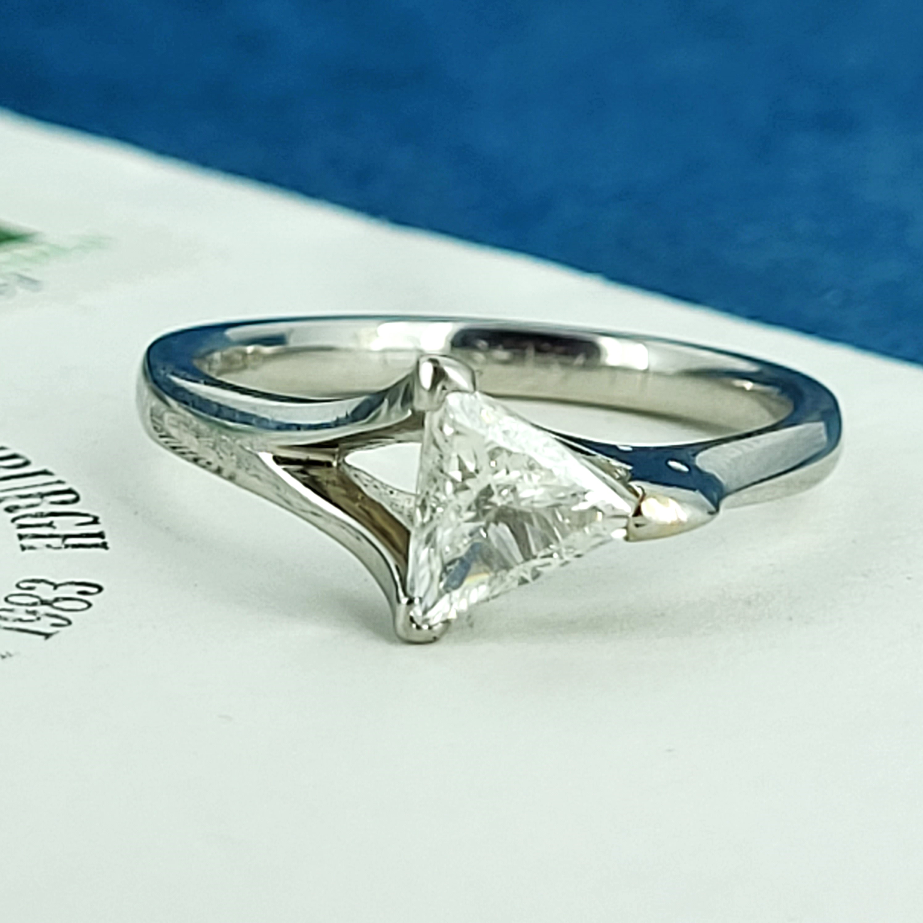 The trilliant cut diamond weighs 0.75cts and is triangular in shape with flat edges. This diamond shape will suit a wearer who loves individuality and want a ring that will stand out from the crowd!