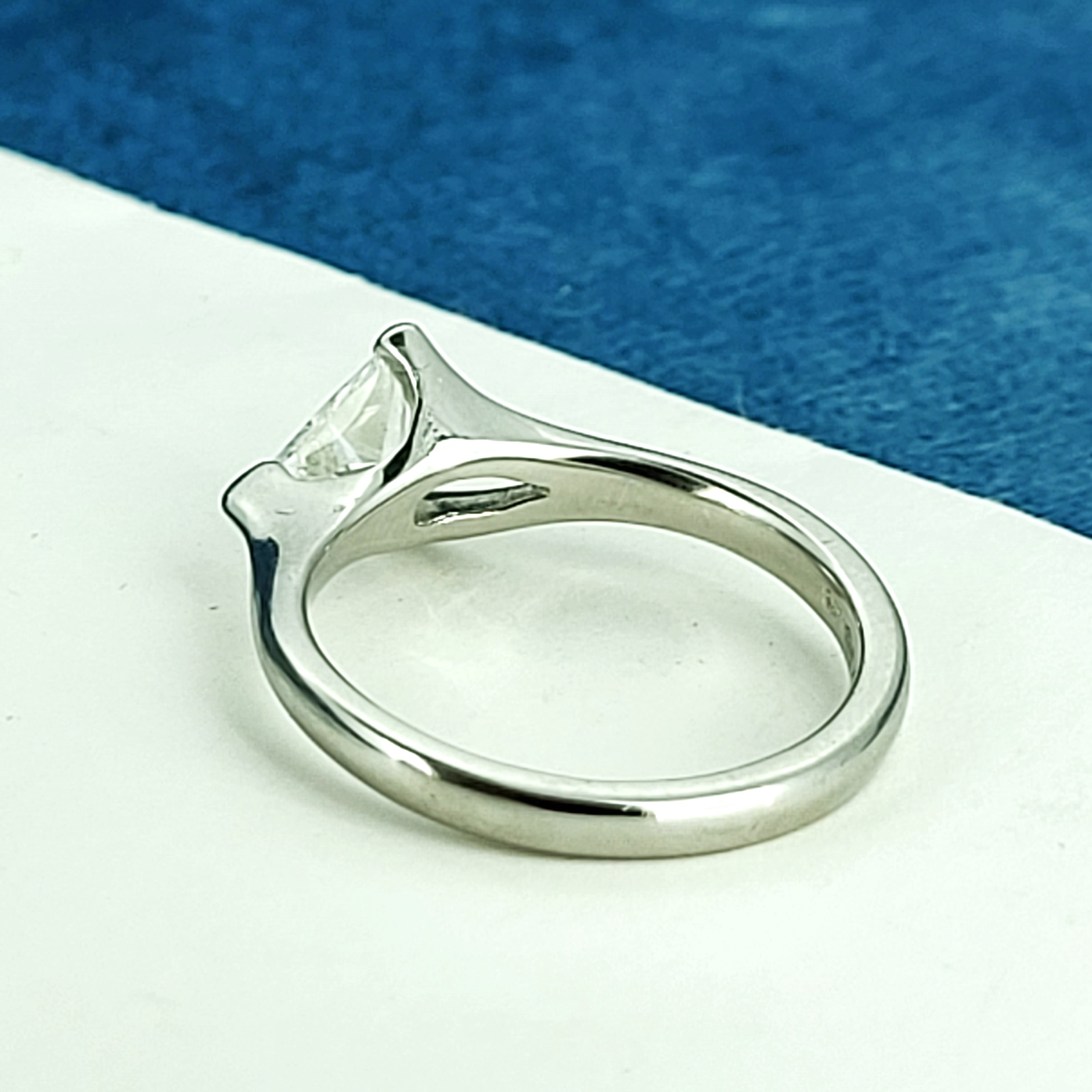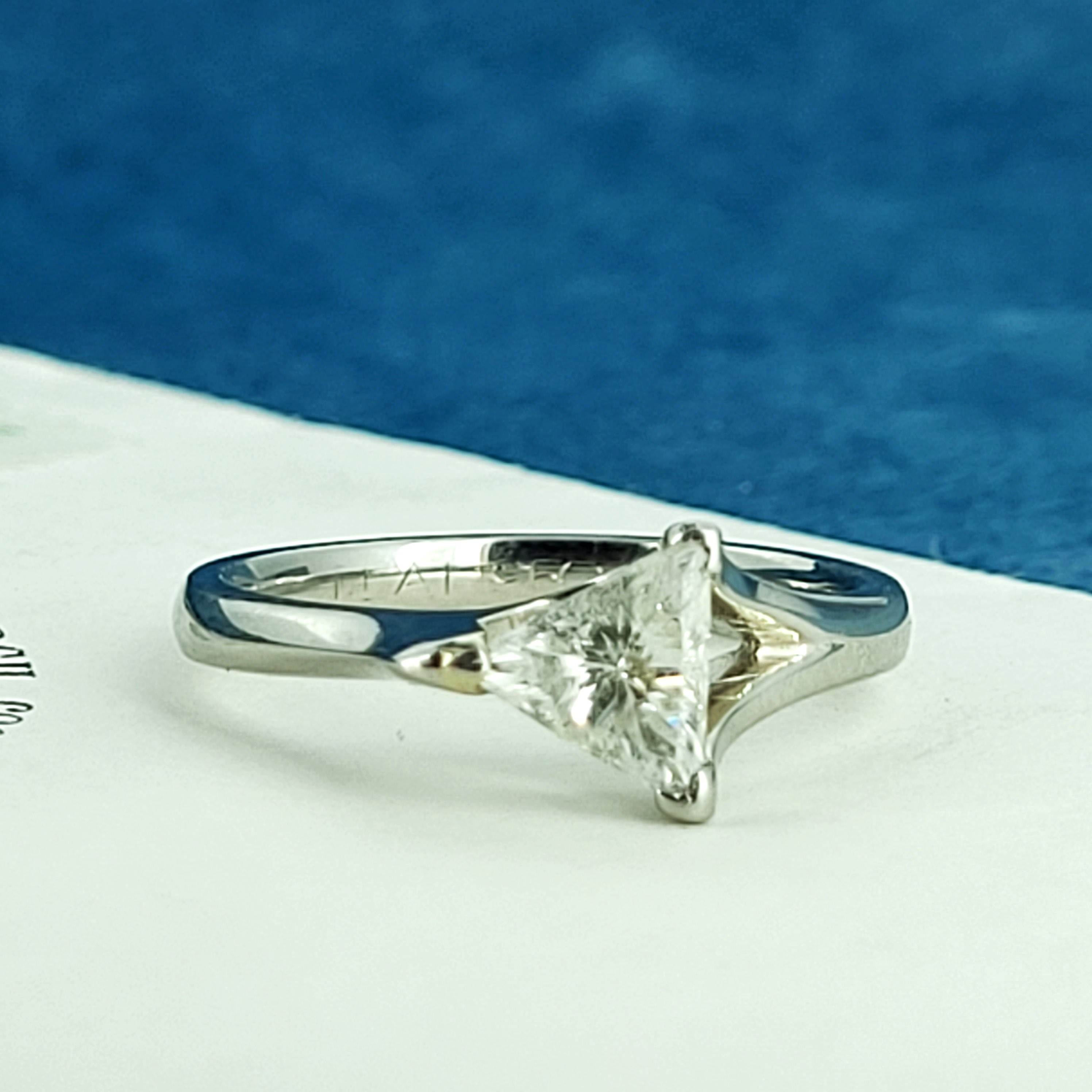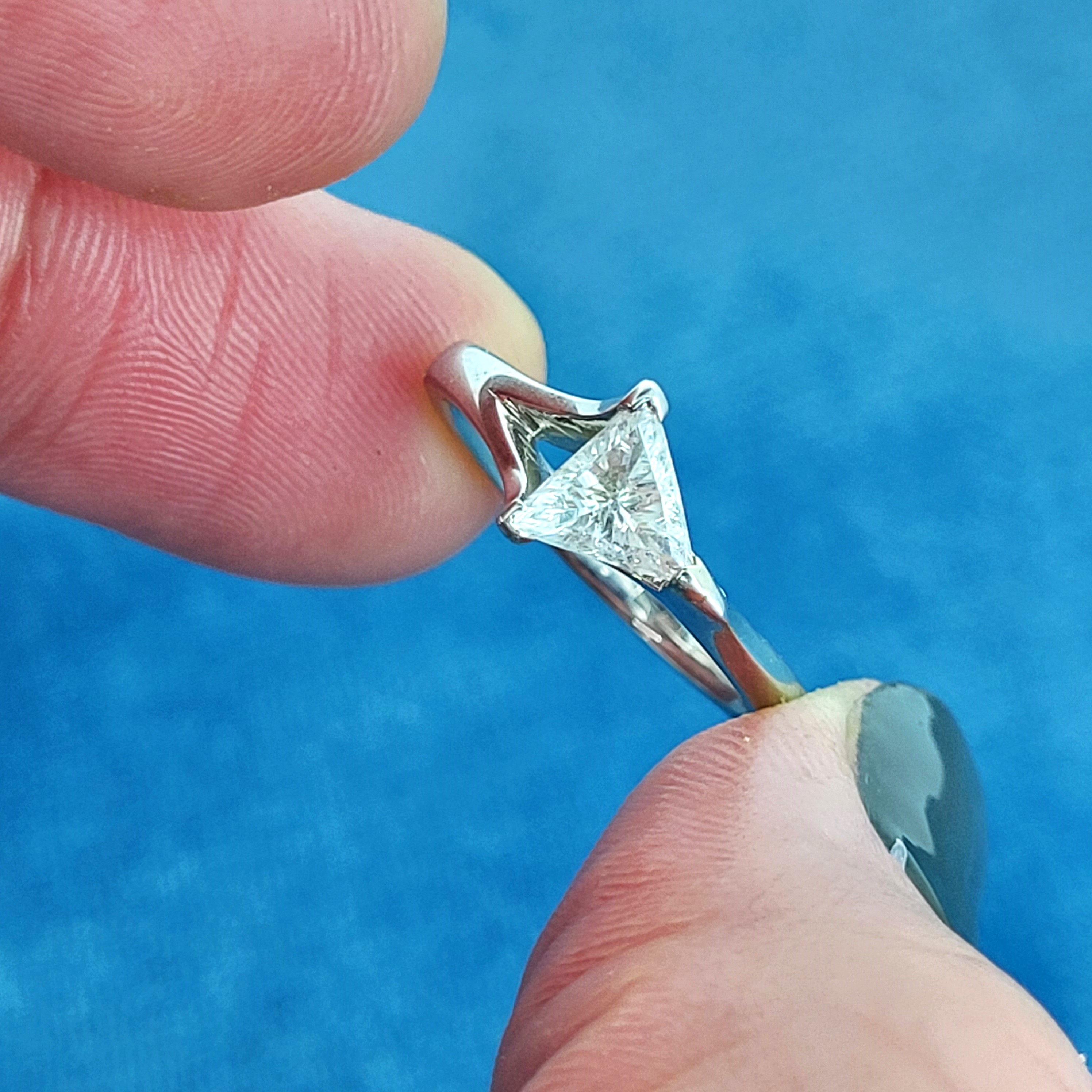 The trilliant cut diamond weighs 0.75cts and is triangular in shape with flat edges. This diamond shape will suit a wearer who loves individuality and want a ring that will stand out from the crowd!