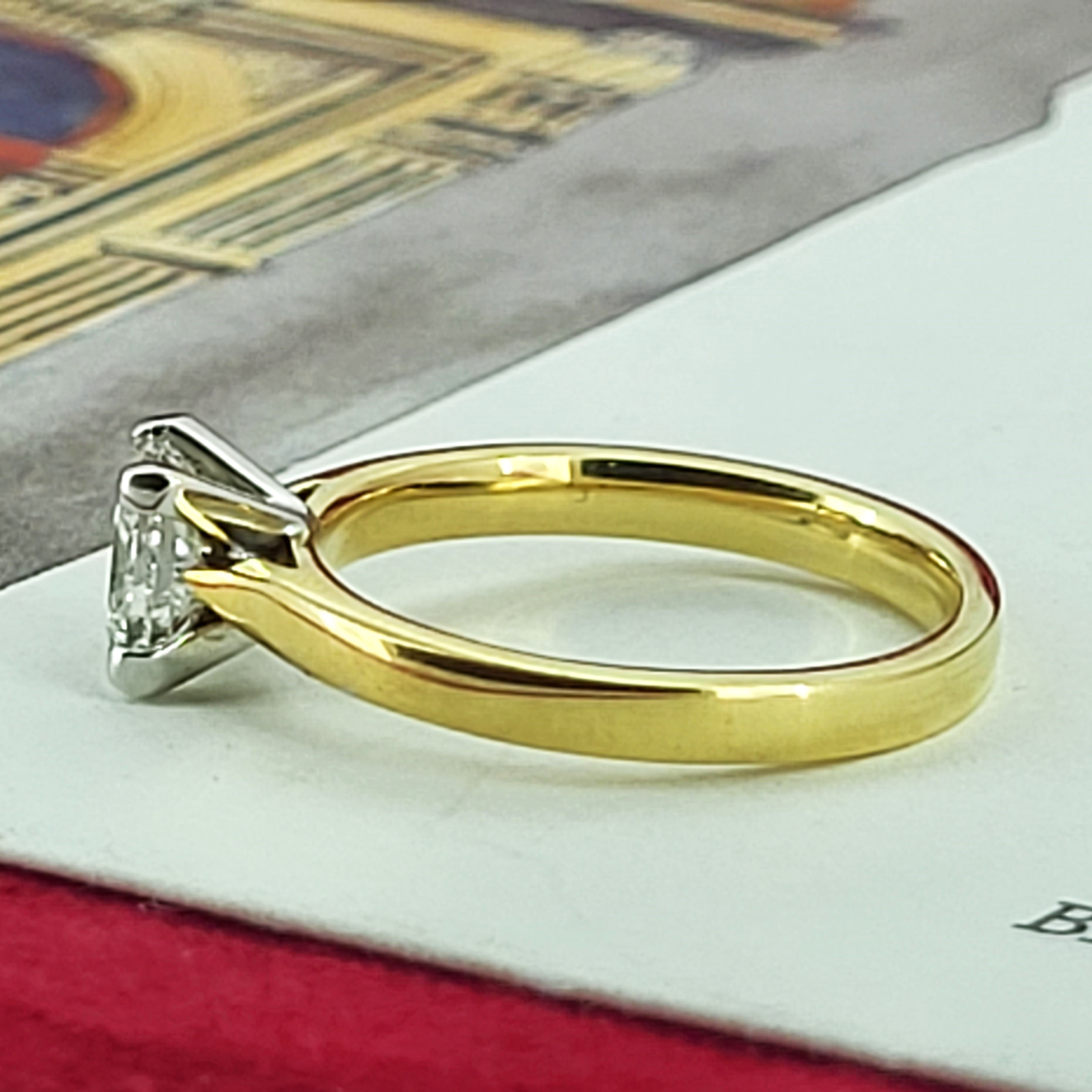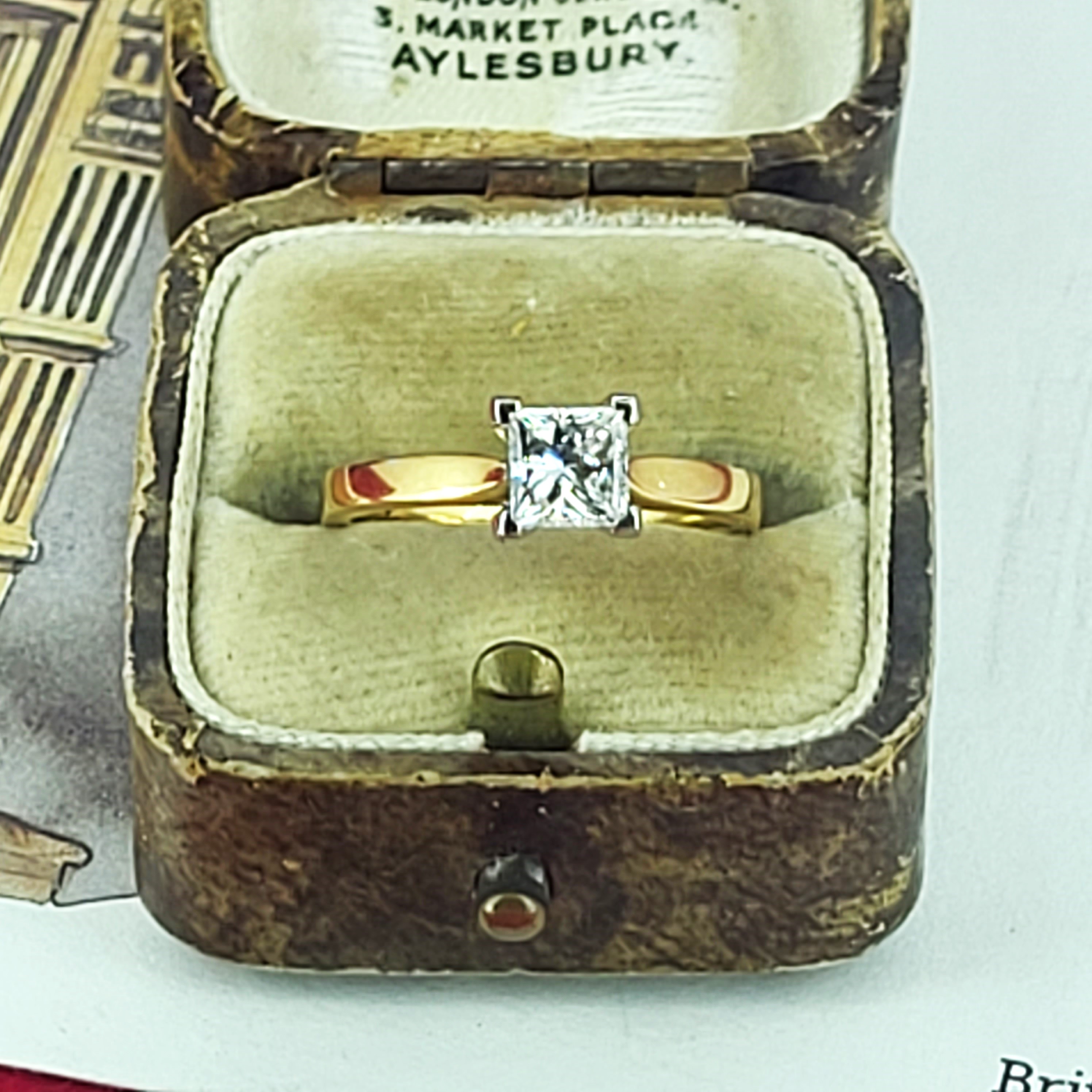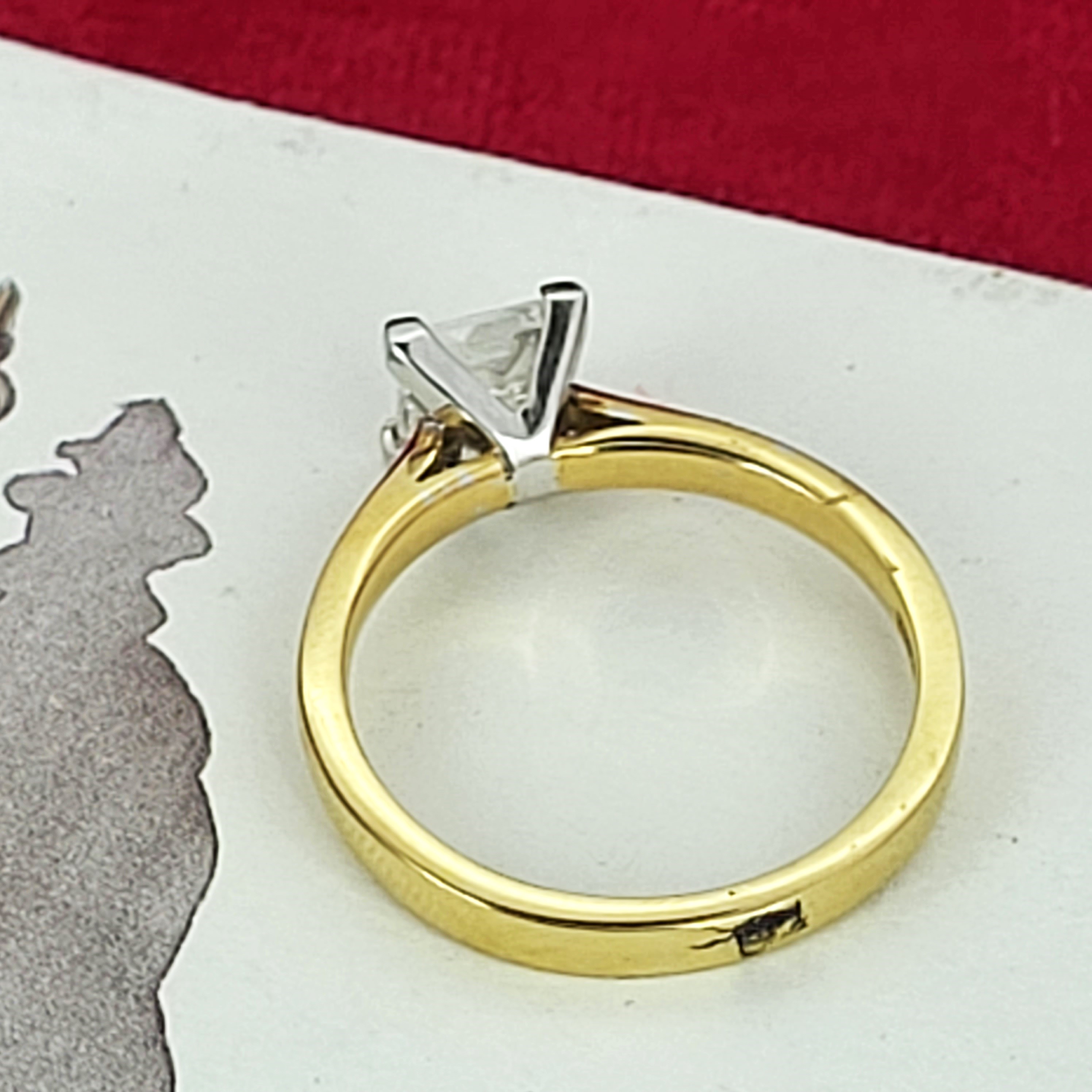 The Princess Cut Diamond is set in 18ct White Gold and is suspended on a traditional 2.2mm 18ct Yellow Gold shank. It weighs 3.9 grams.