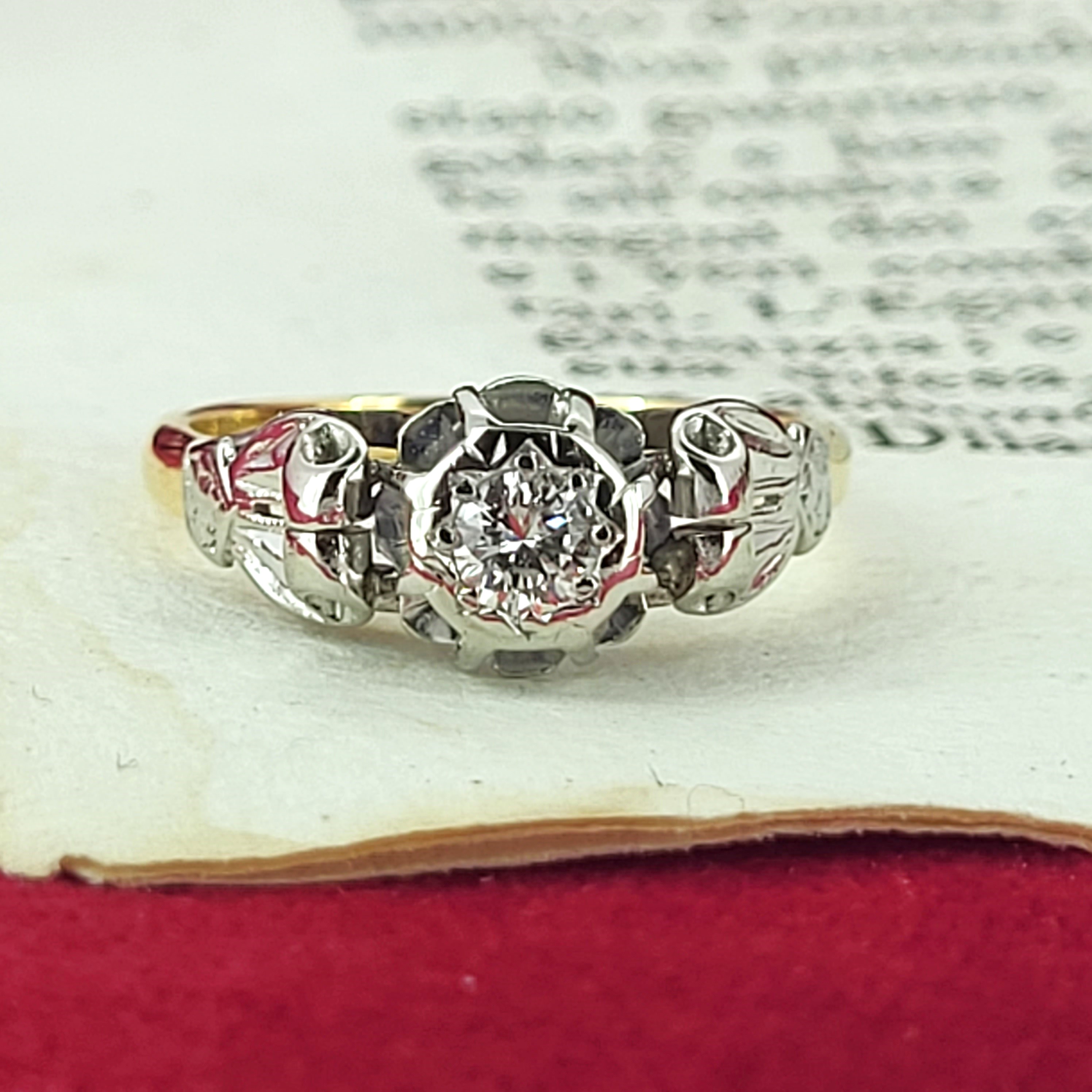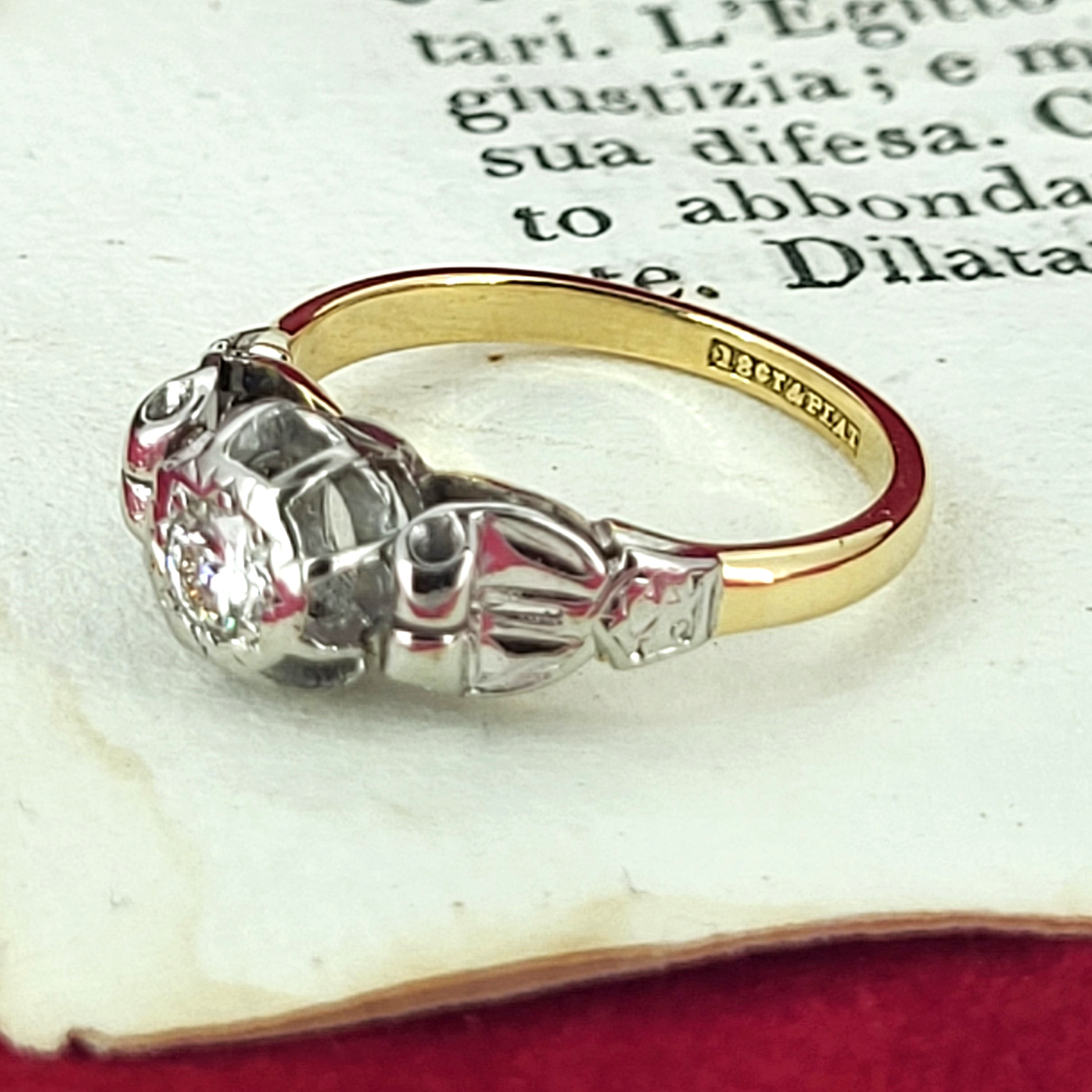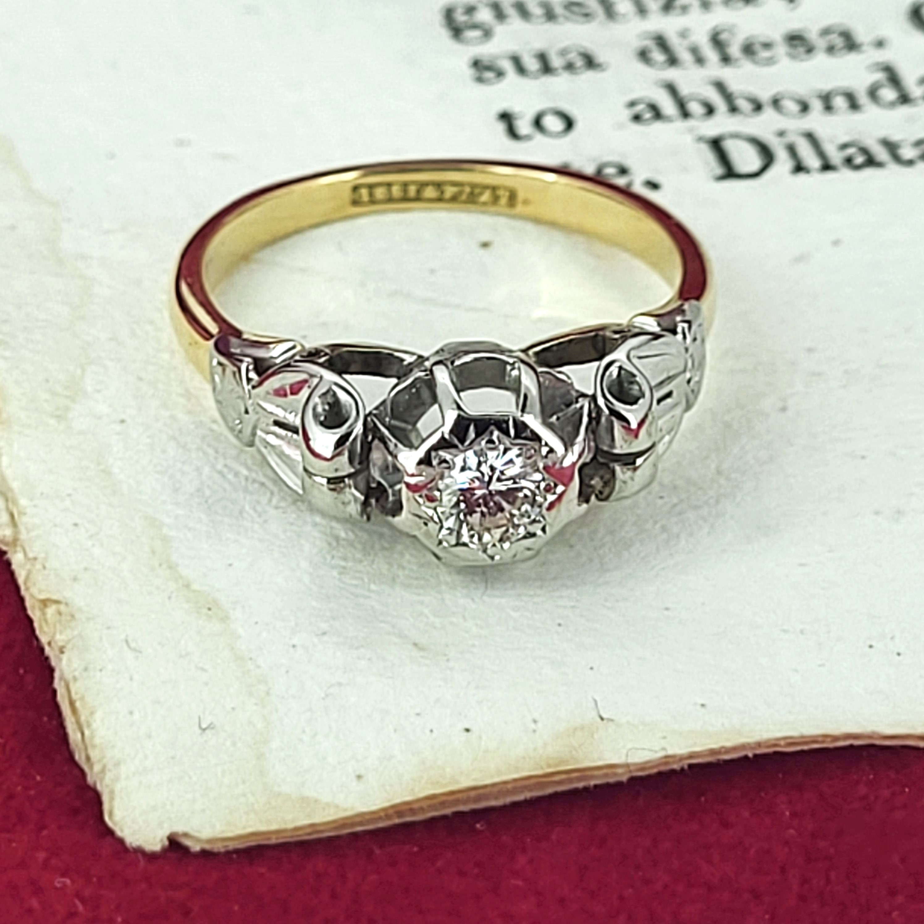 The ring features a round brilliant cut diamond in the centre measuring 4mm, estimated at 0.25cts. It is set in Platinum and is accompanied by detailed shoulders and is fitted to an 18ct Yellow Gold shank. Its delightfully pretty and weighs 3.0 grams.