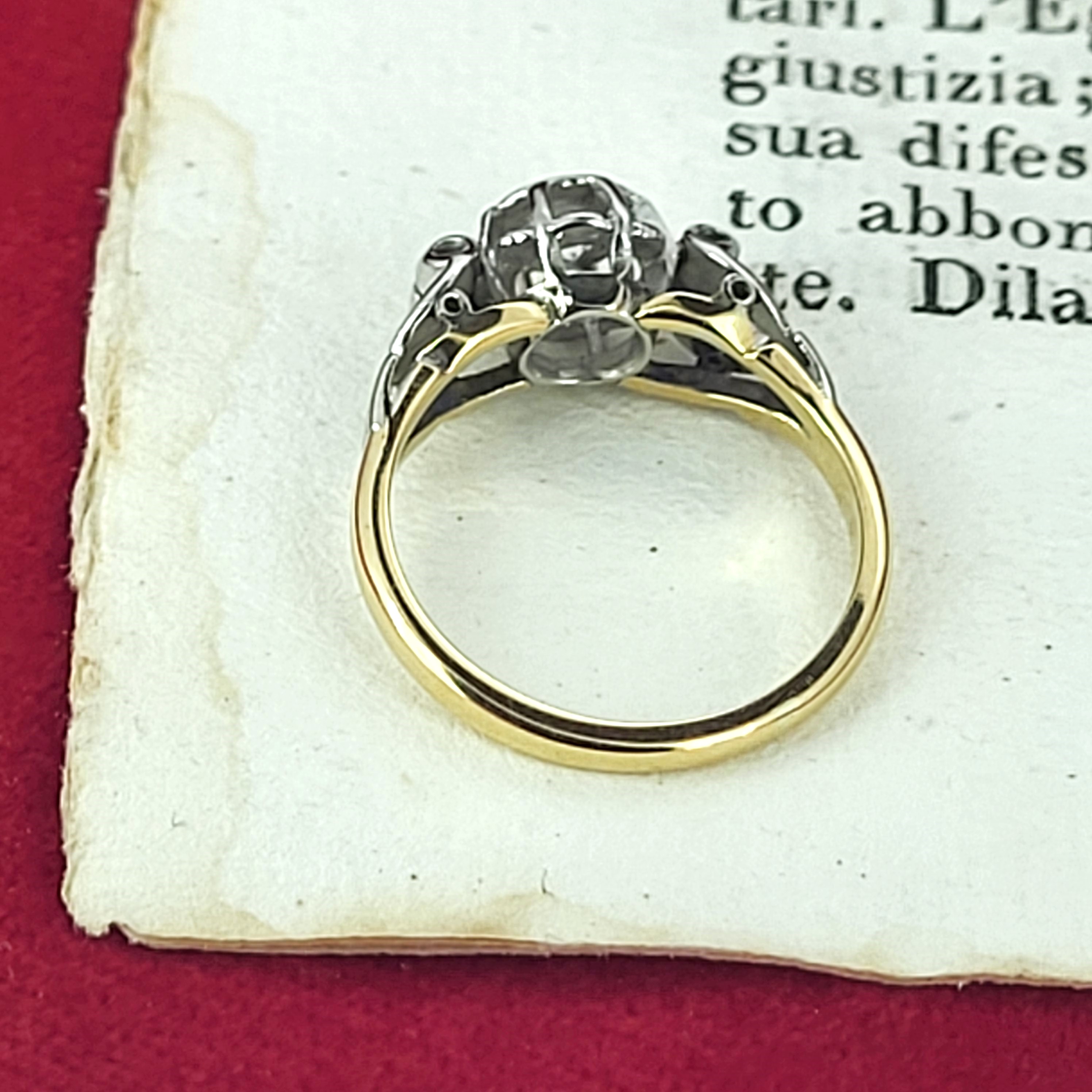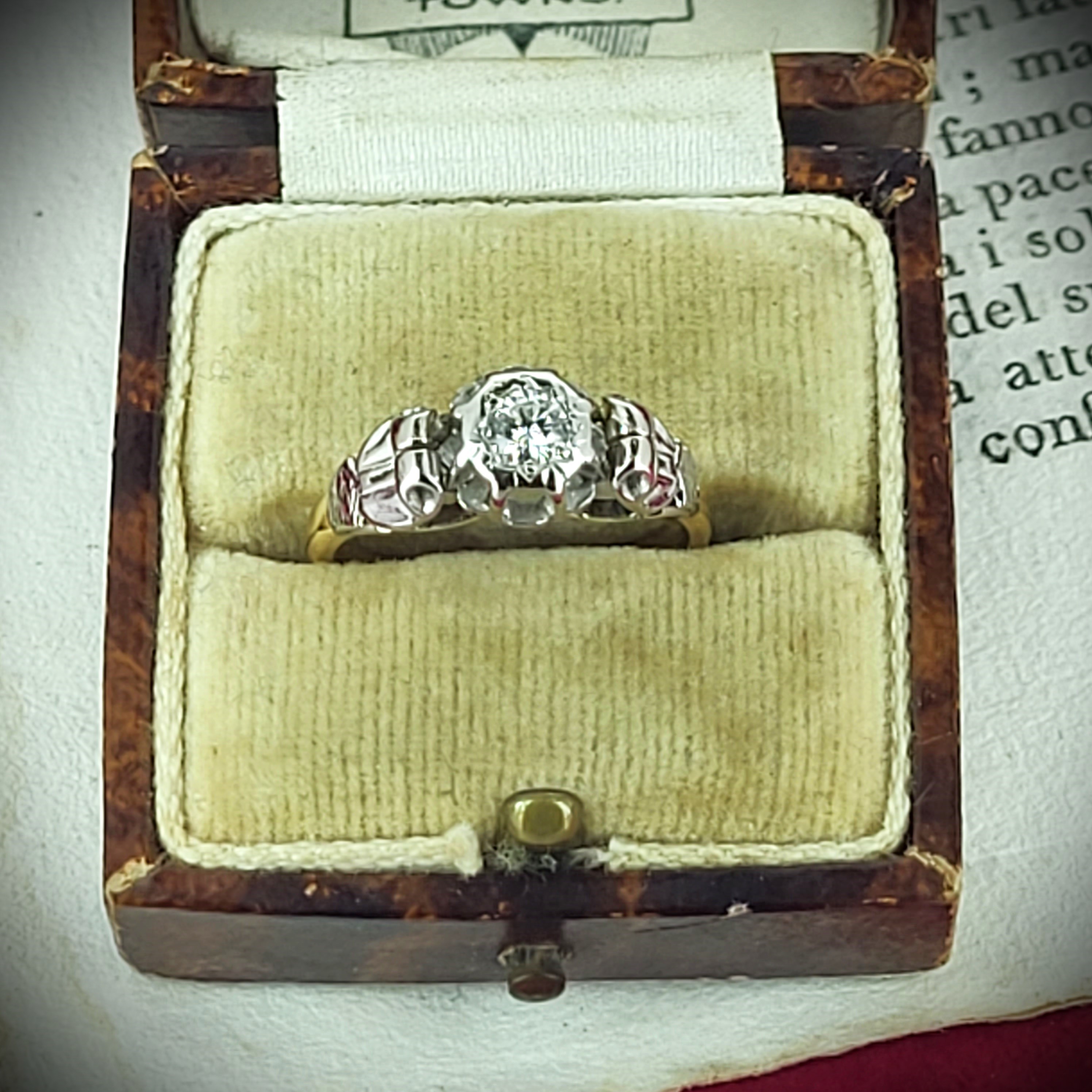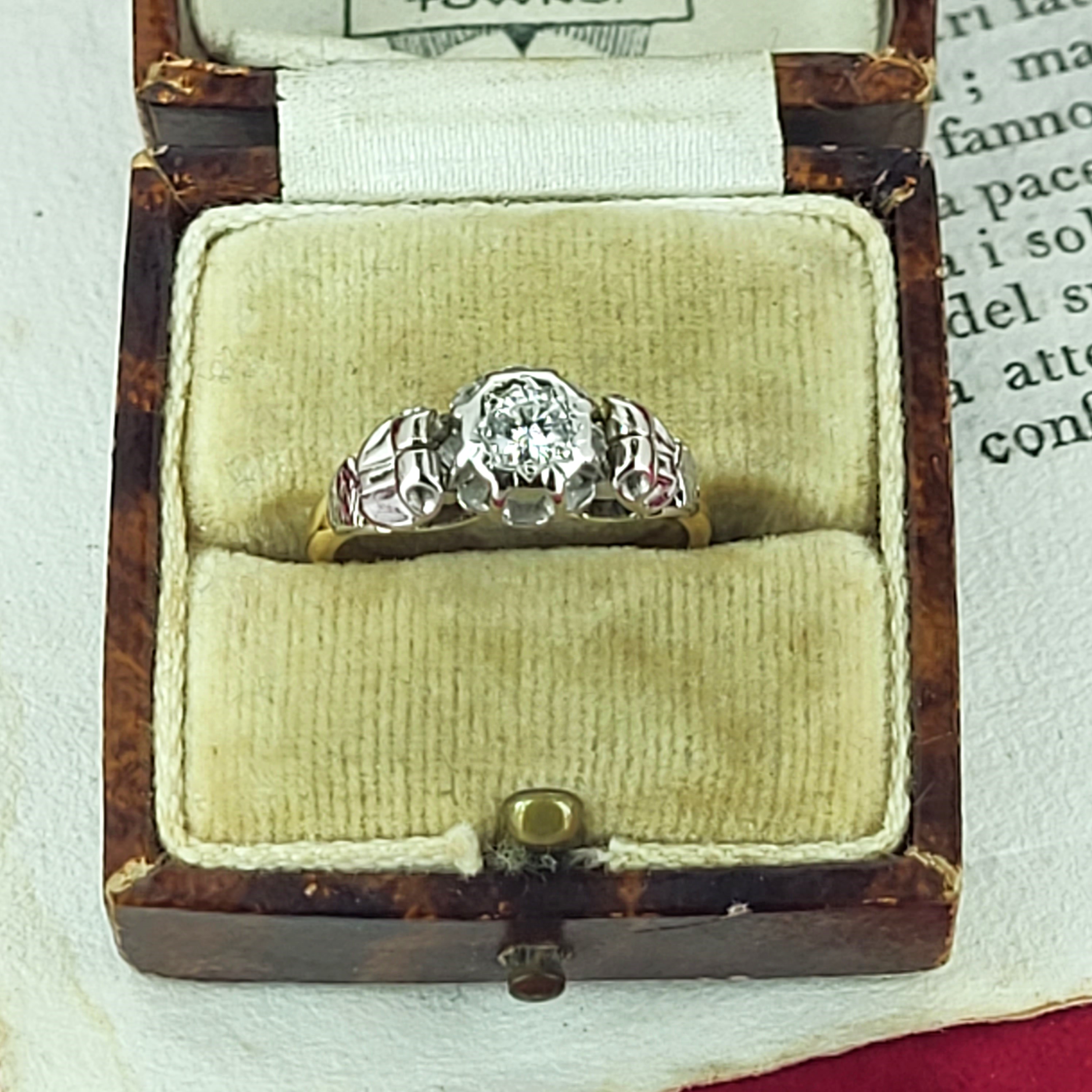 The ring features a round brilliant cut diamond in the centre measuring 4mm, estimated at 0.25cts. It is set in Platinum and is accompanied by detailed shoulders and is fitted to an 18ct Yellow Gold shank. Its delightfully pretty and weighs 3.0 grams.
