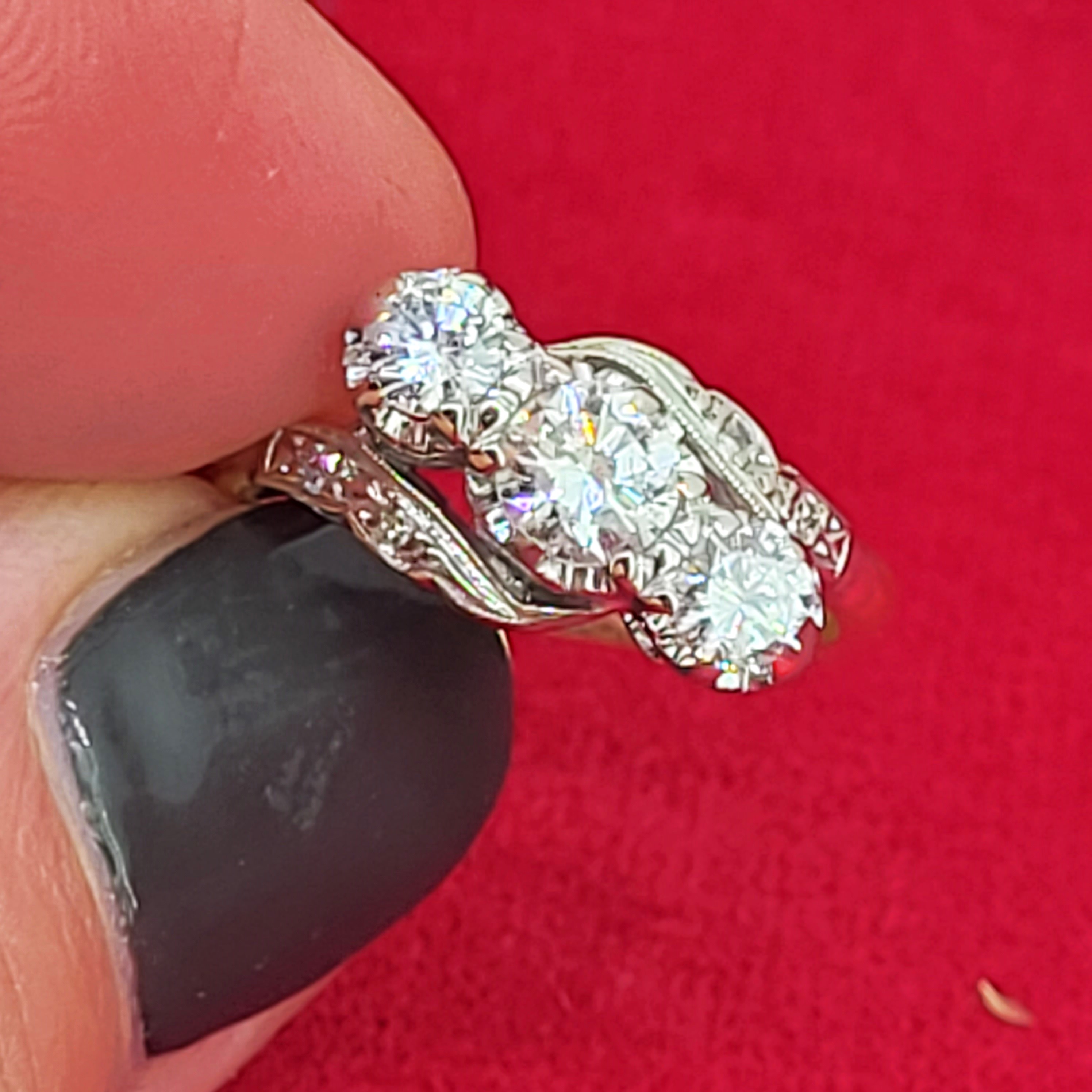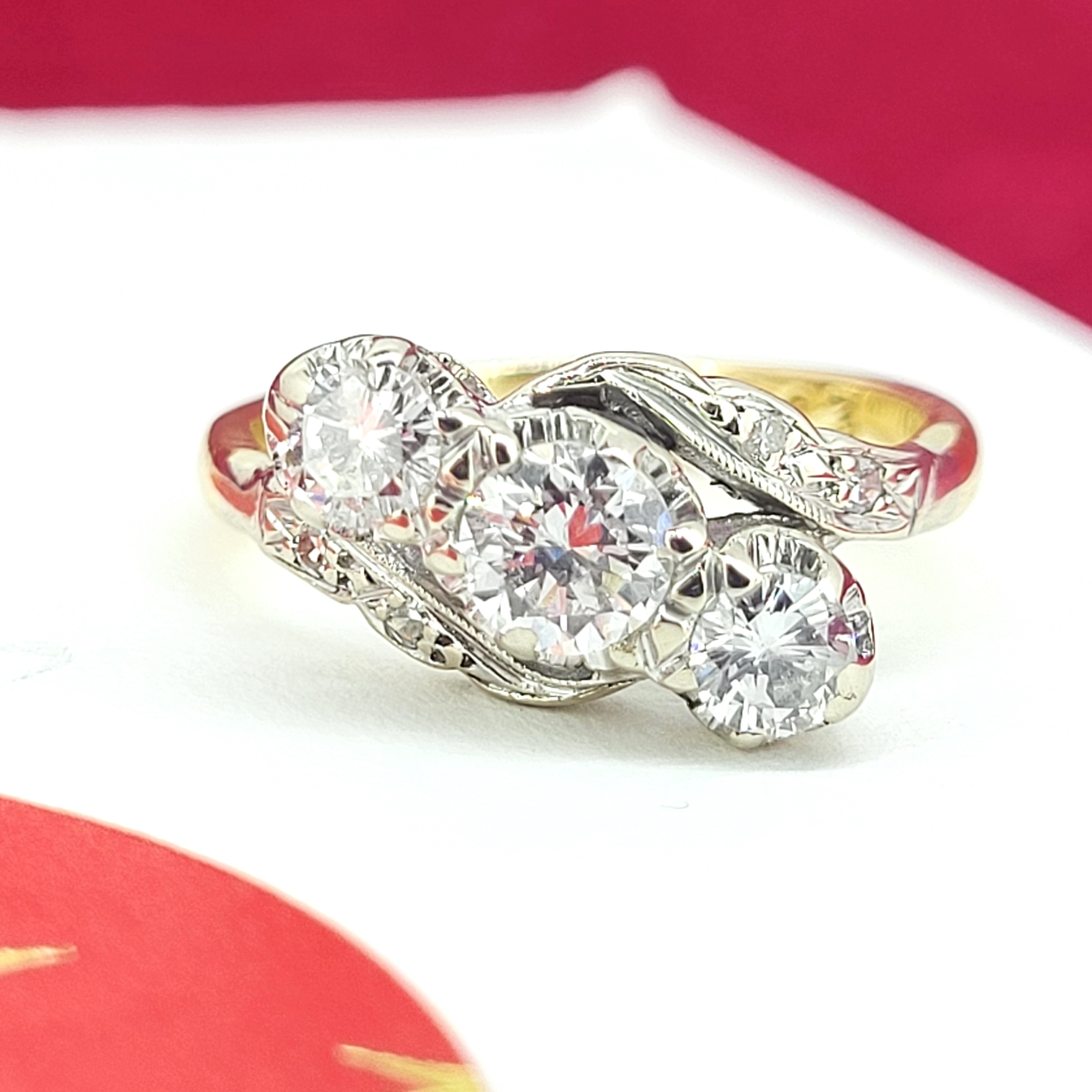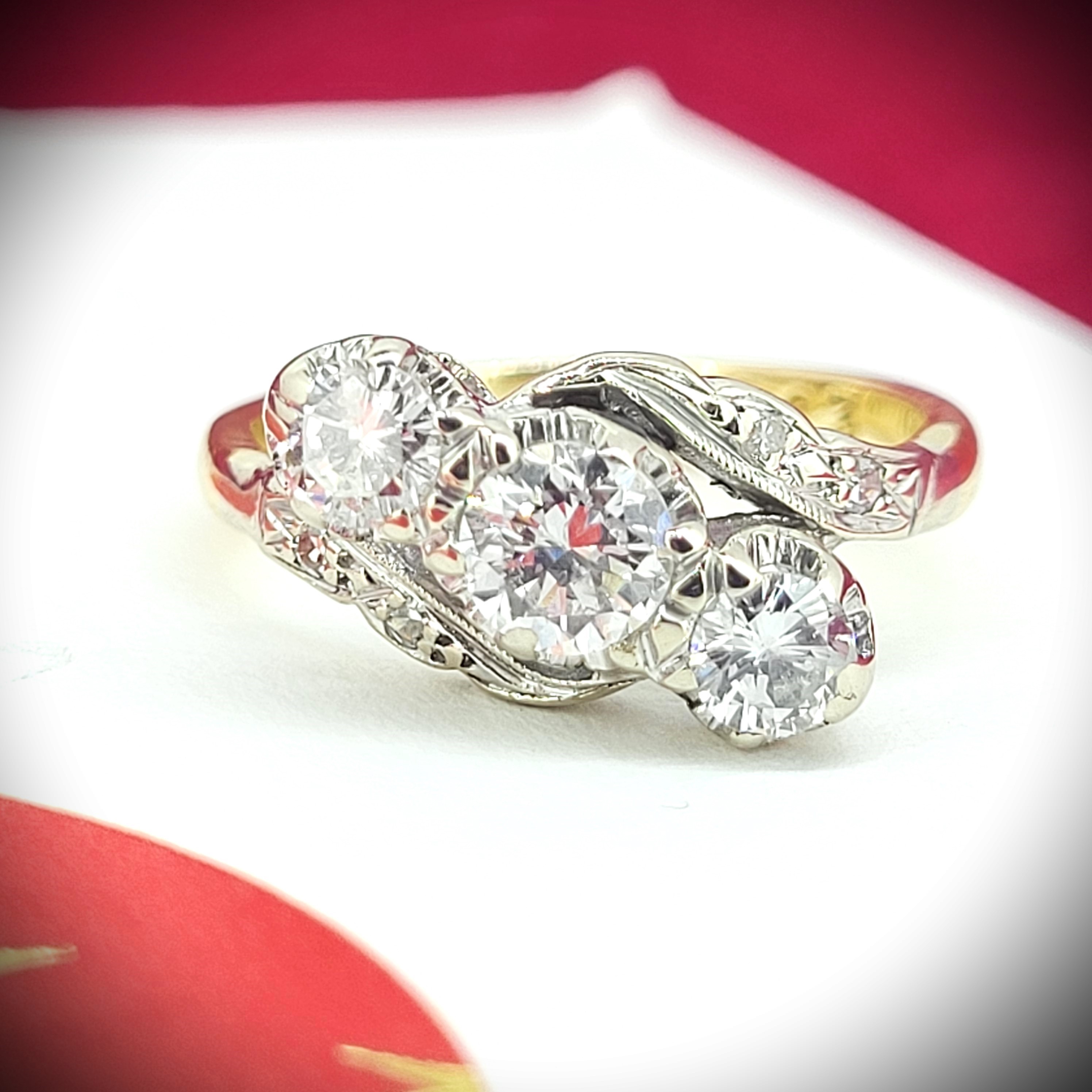 The three round brilliant diamonds are set in Platinum on a twist and weigh approximately 0.70cts. The twist is detailed with small diamonds bordered with milgrain,giving this ring a truely romantic and classic feel. Just gorgeous!