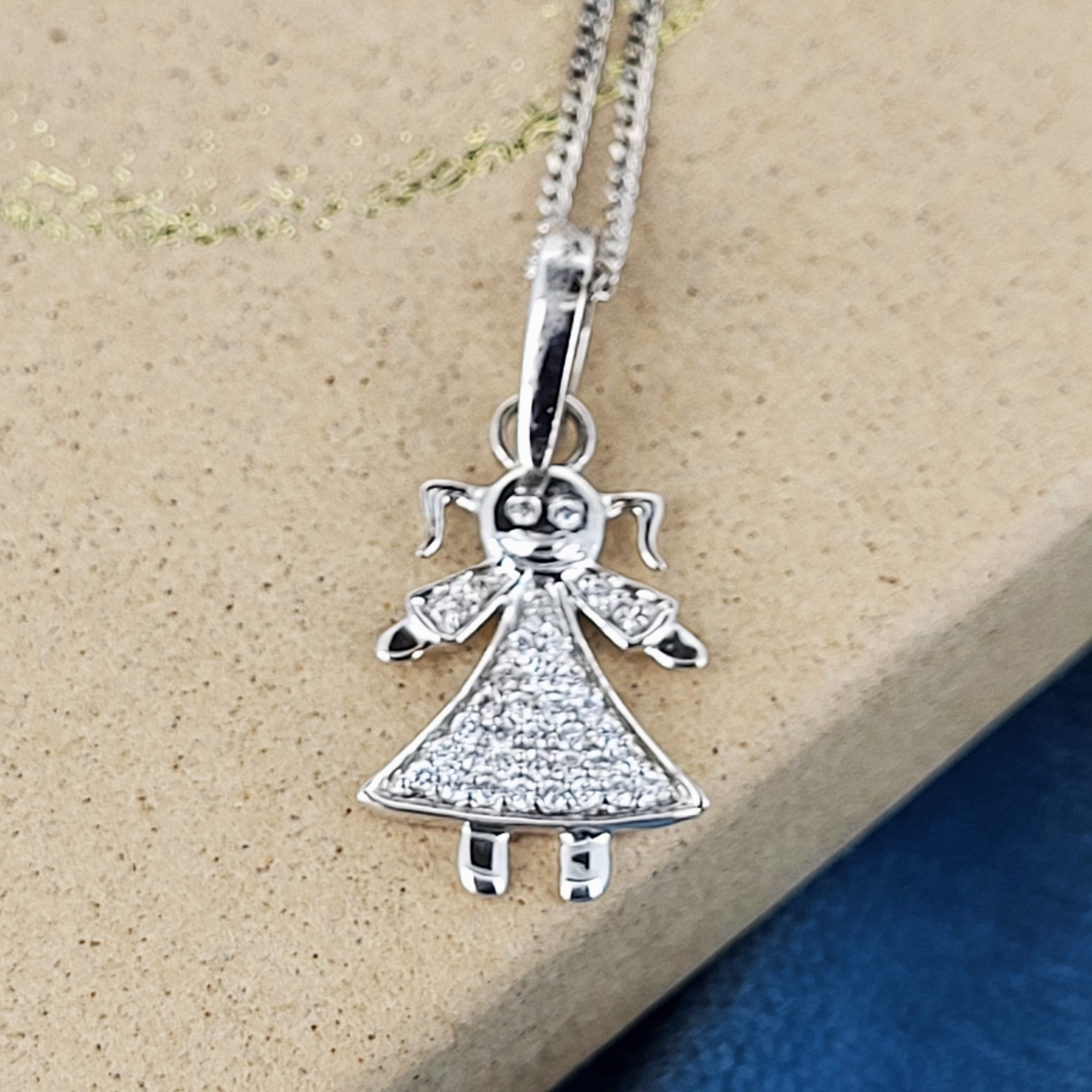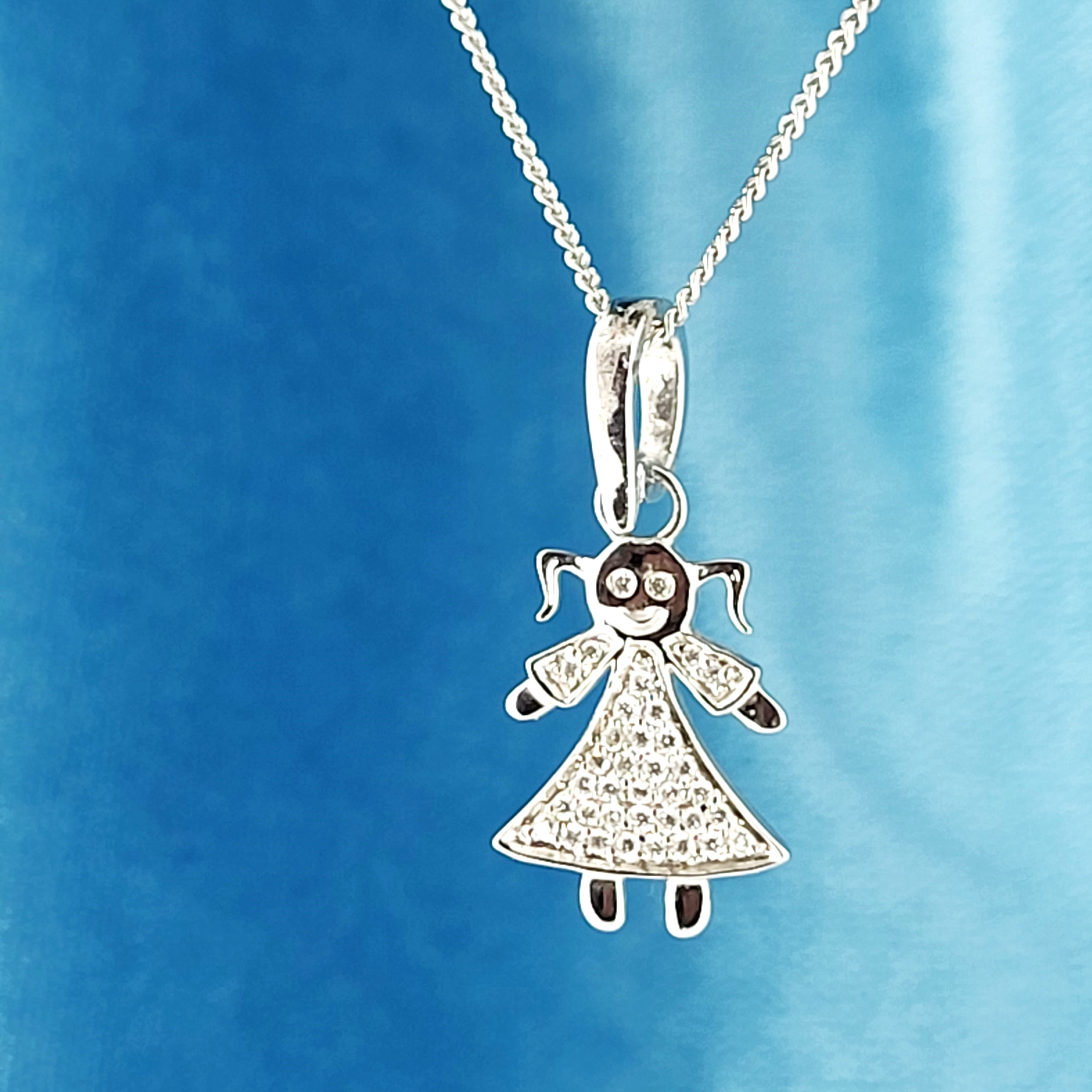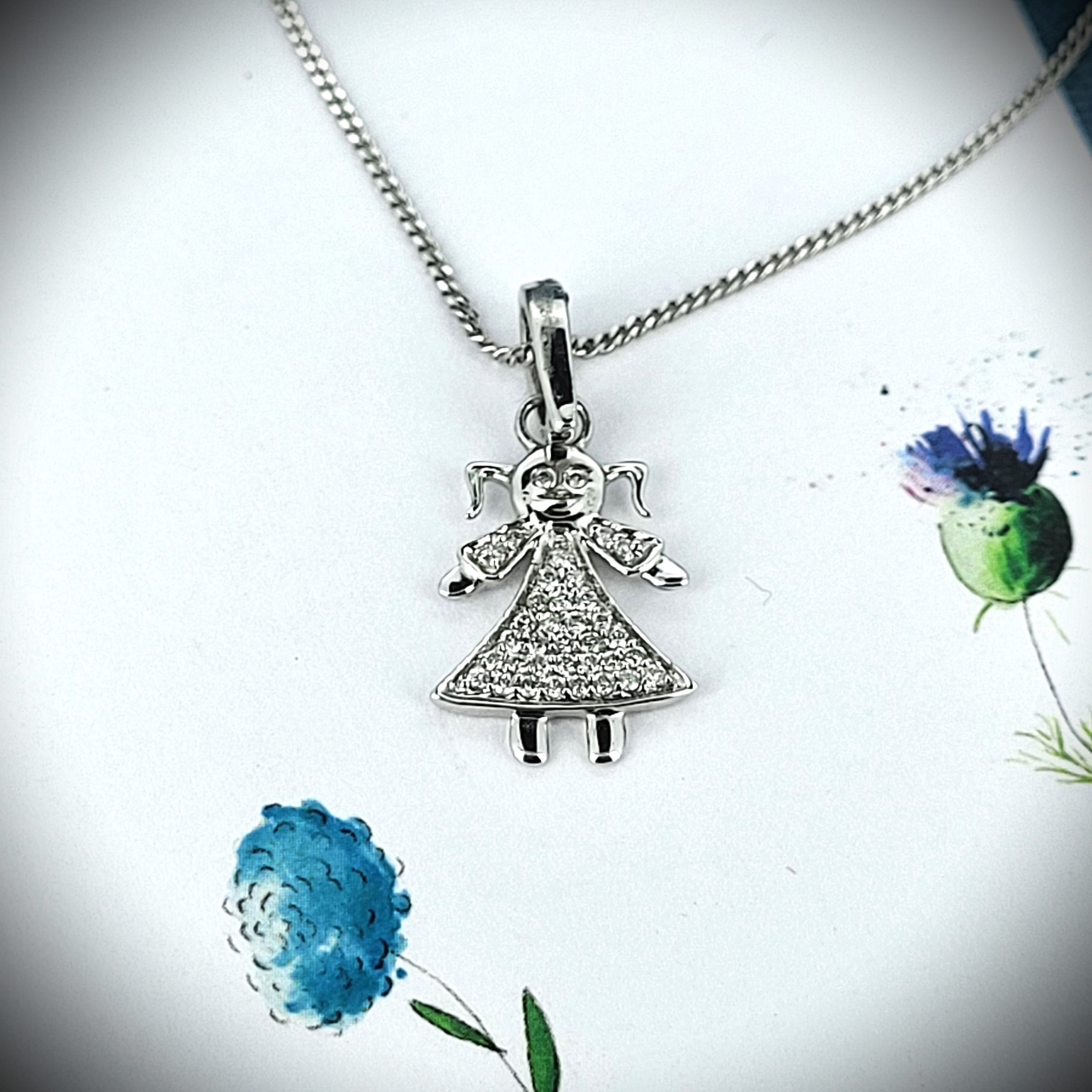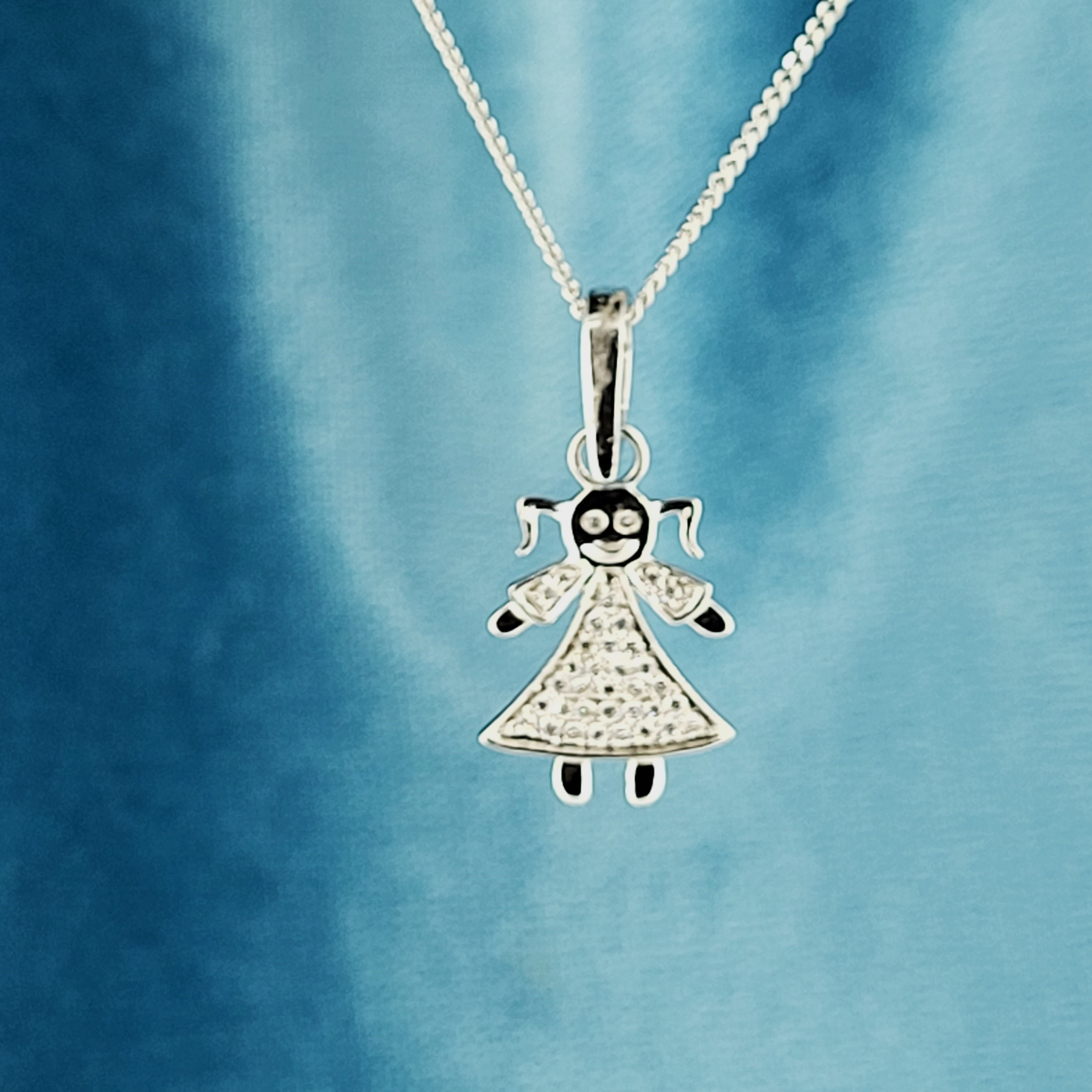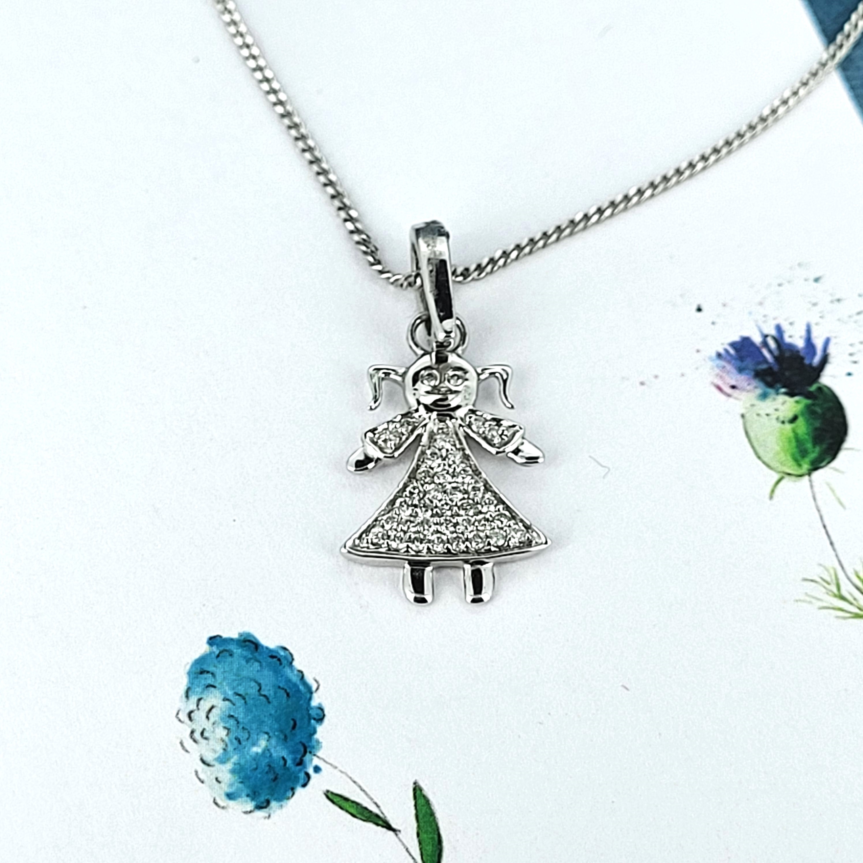 This pendant is dainty and cute and measures 18mm by 12mm not including the bail. It features 34 sparkly, pave set diamonds in the dress and the ragdoll has 2 diamond eyes.