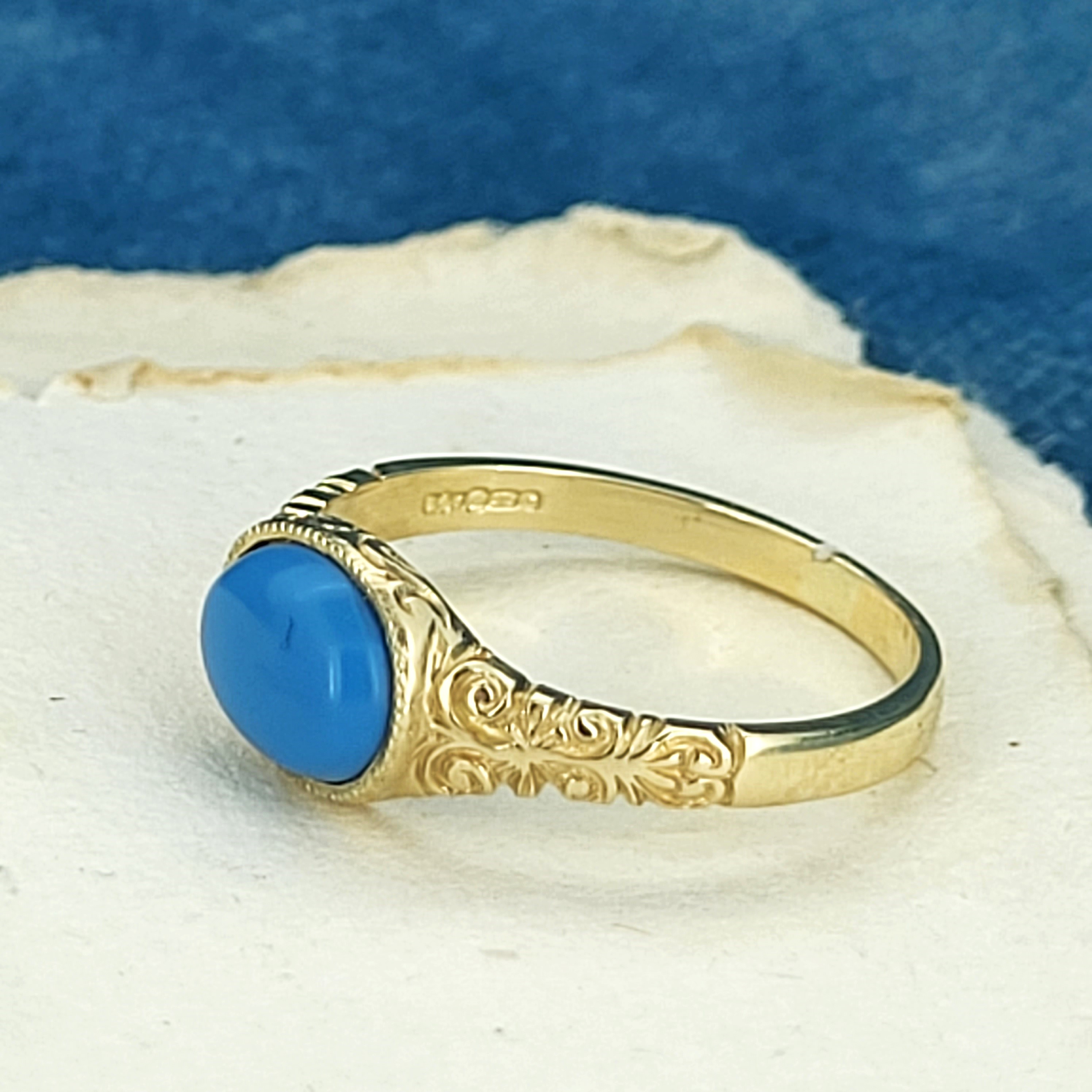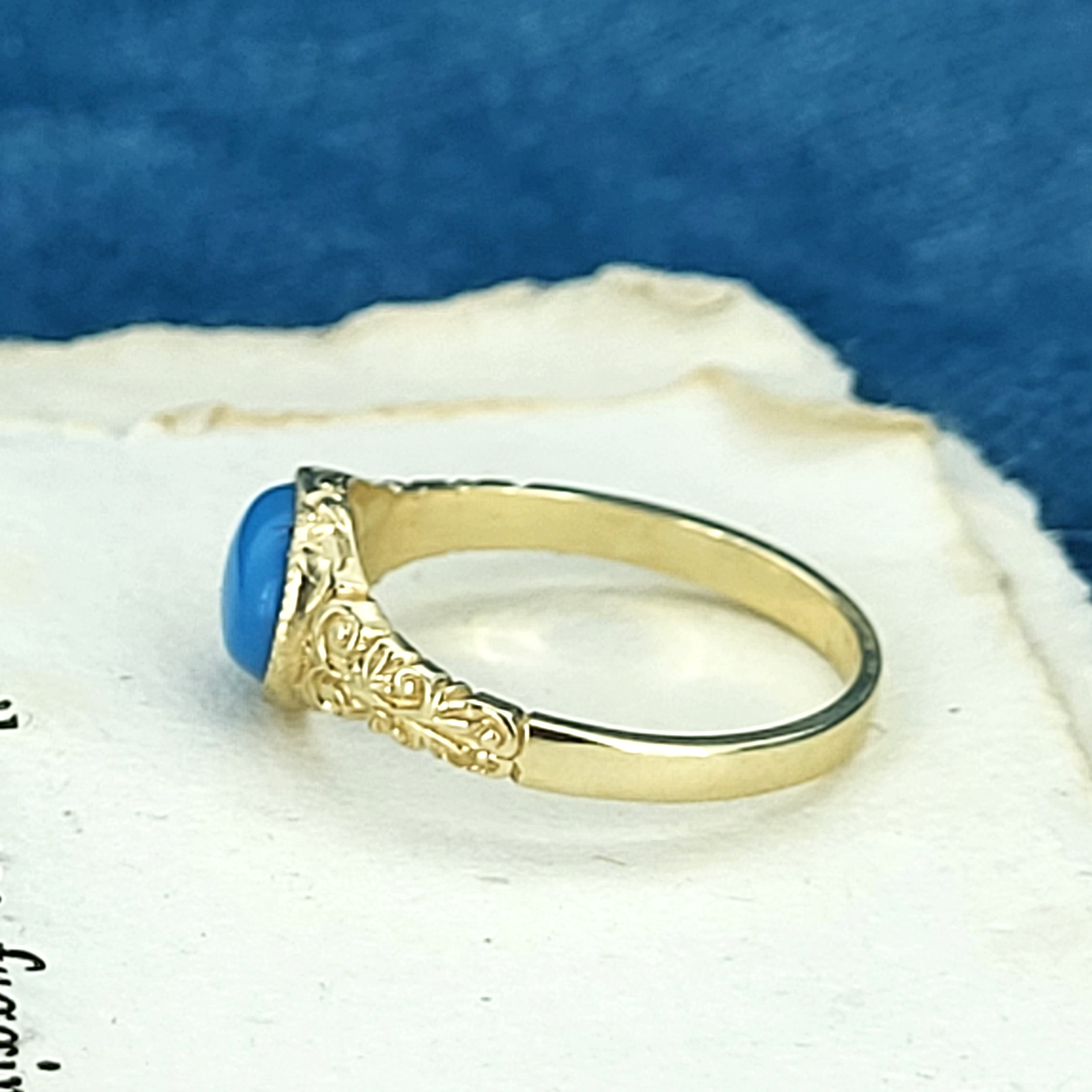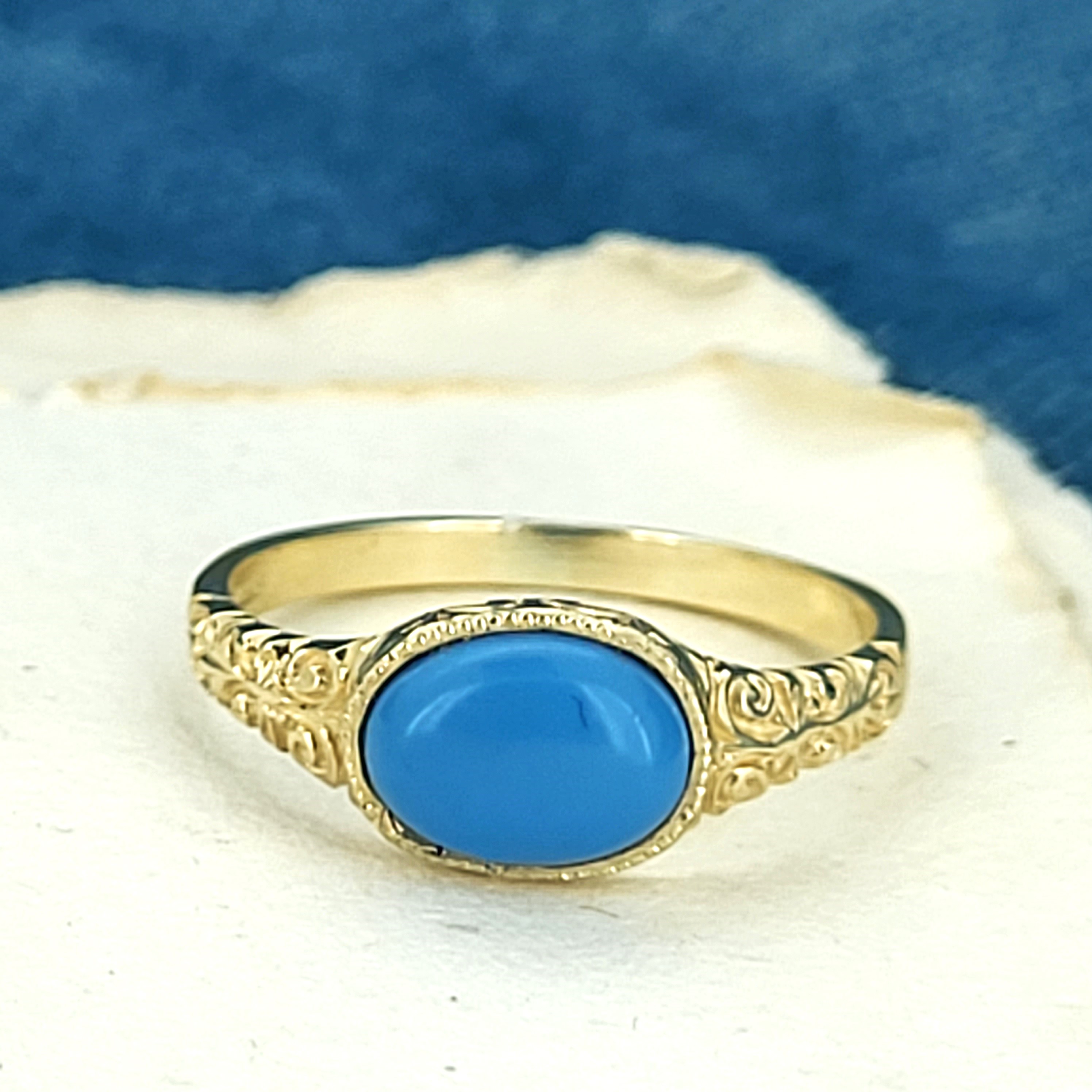 The ring features an Oval Turquoise in the centre measuring 7mm by 5.5mm and is accompanied by scroll engraved shoulders.