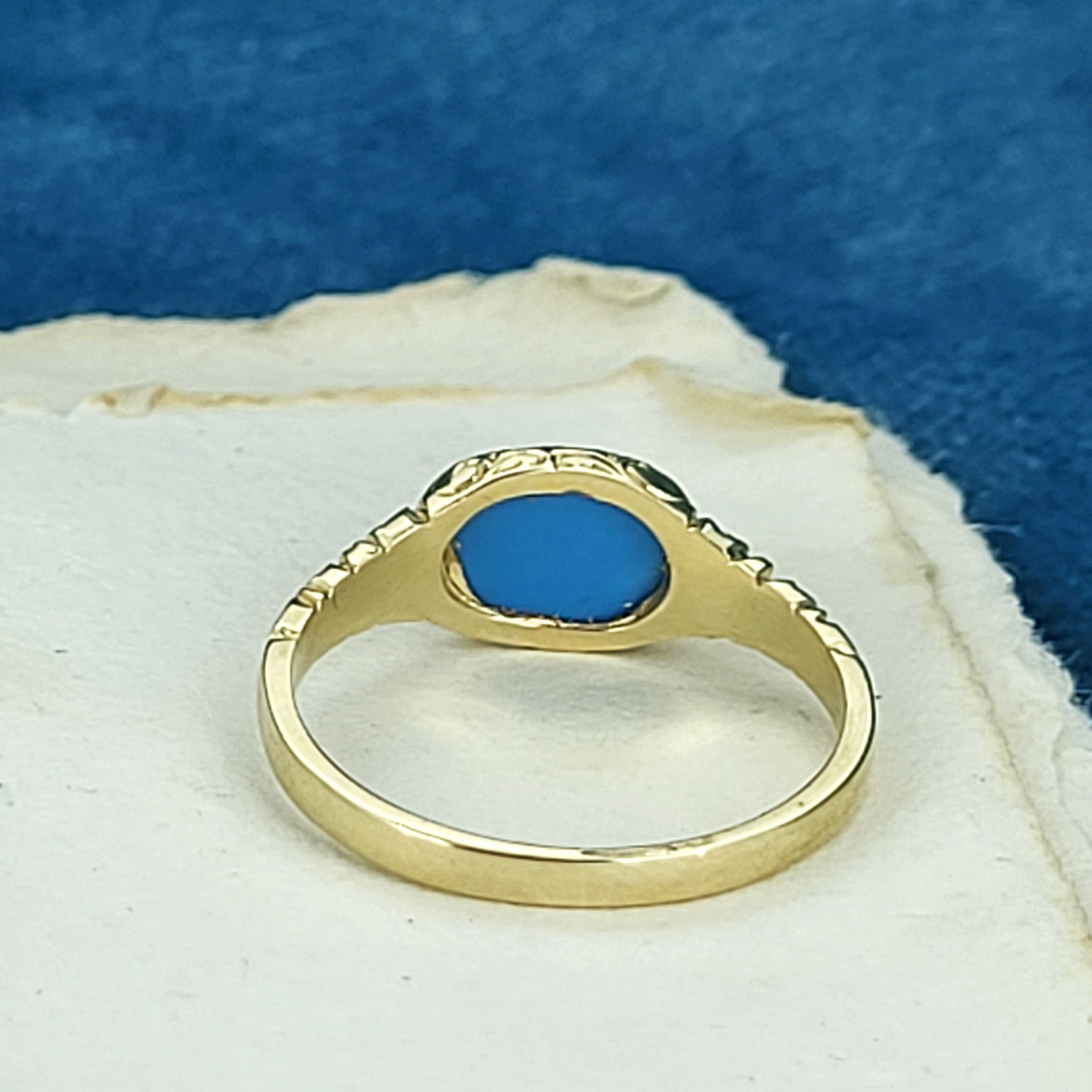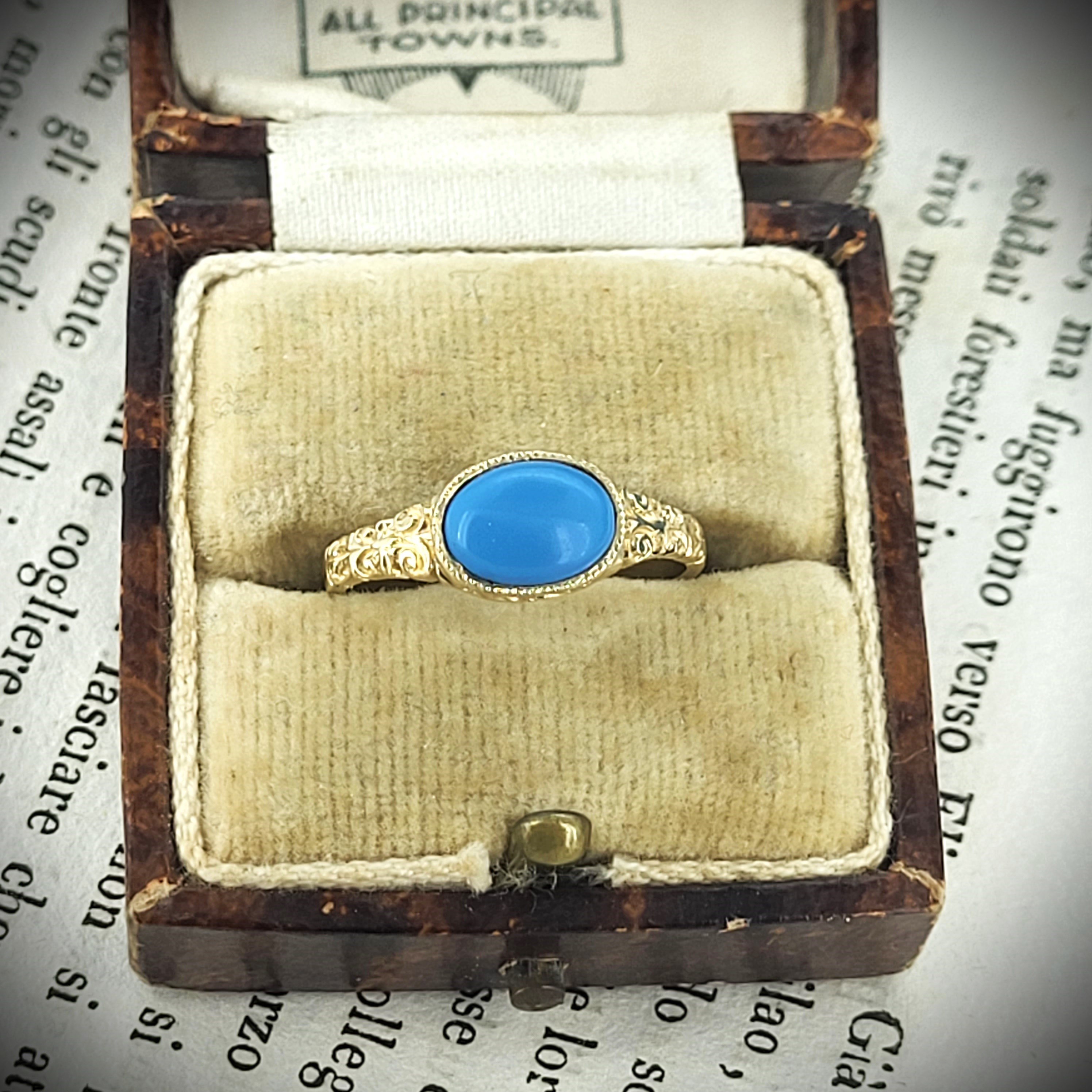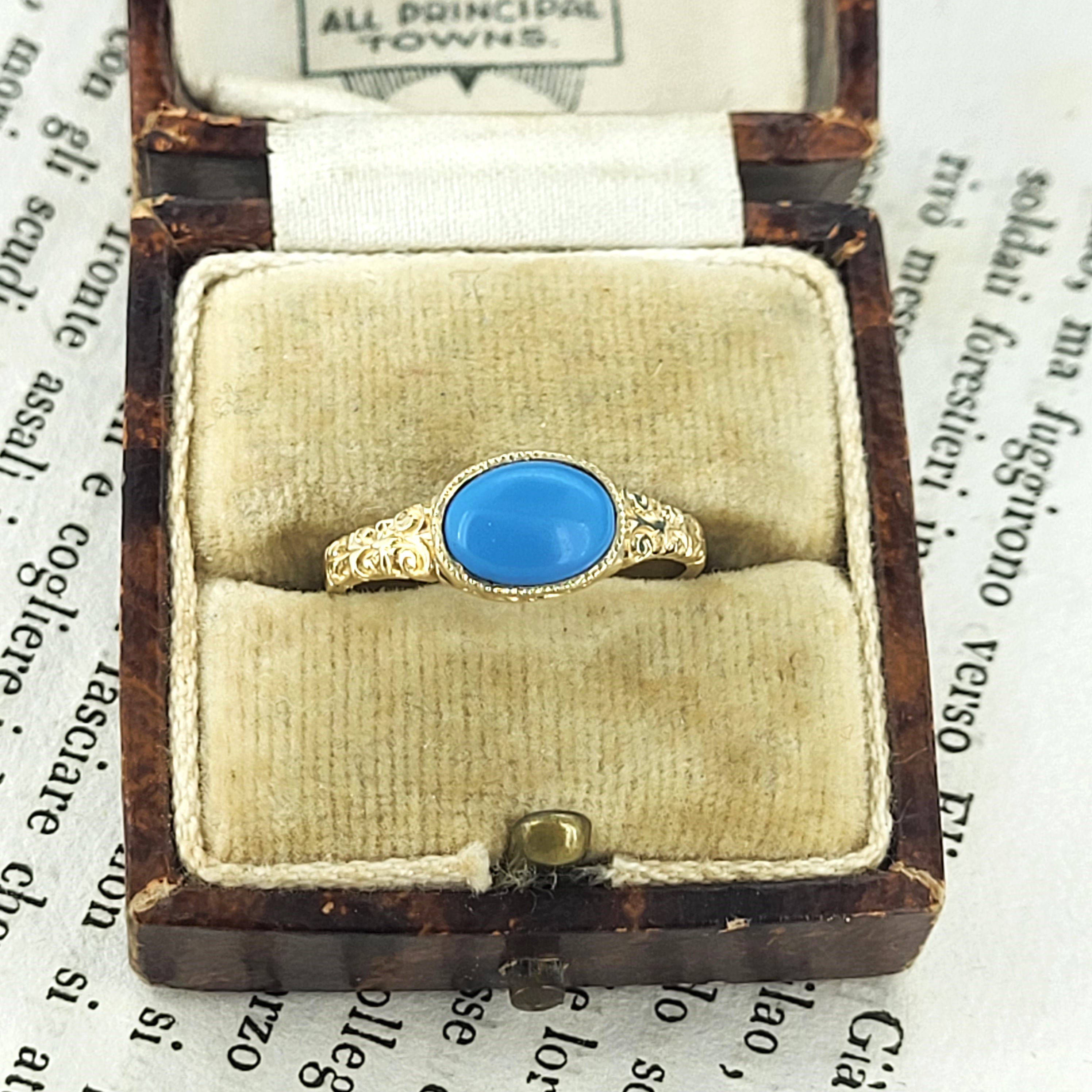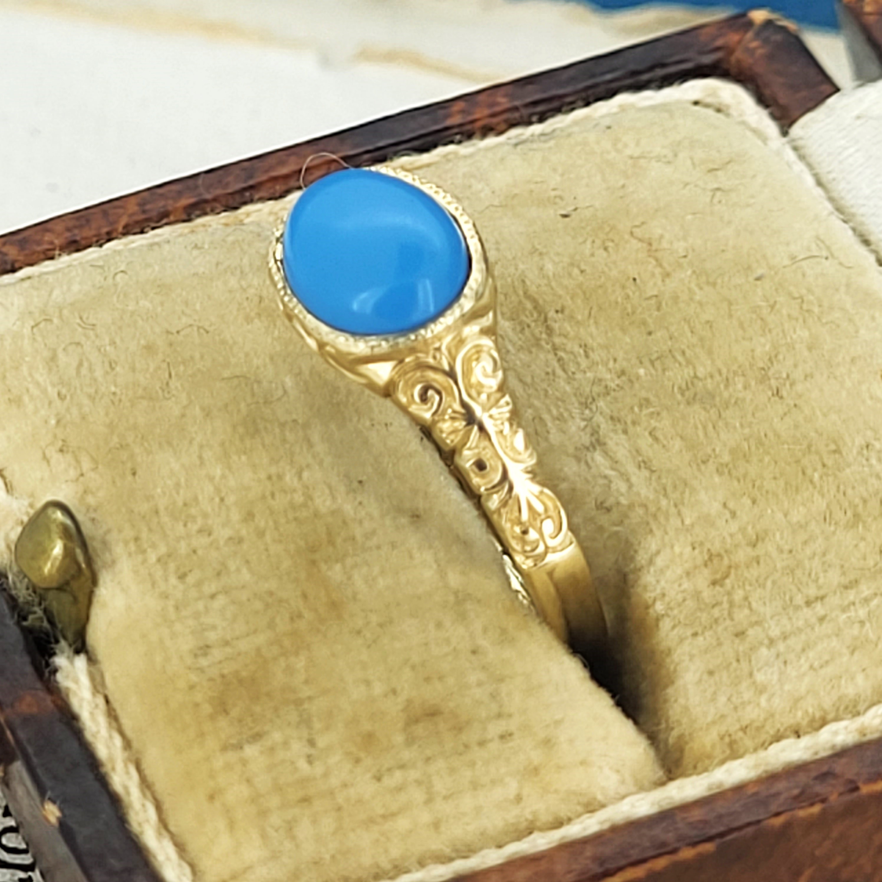 The ring features an Oval Turquoise in the centre measuring 7mm by 5.5mm and is accompanied by scroll engraved shoulders.