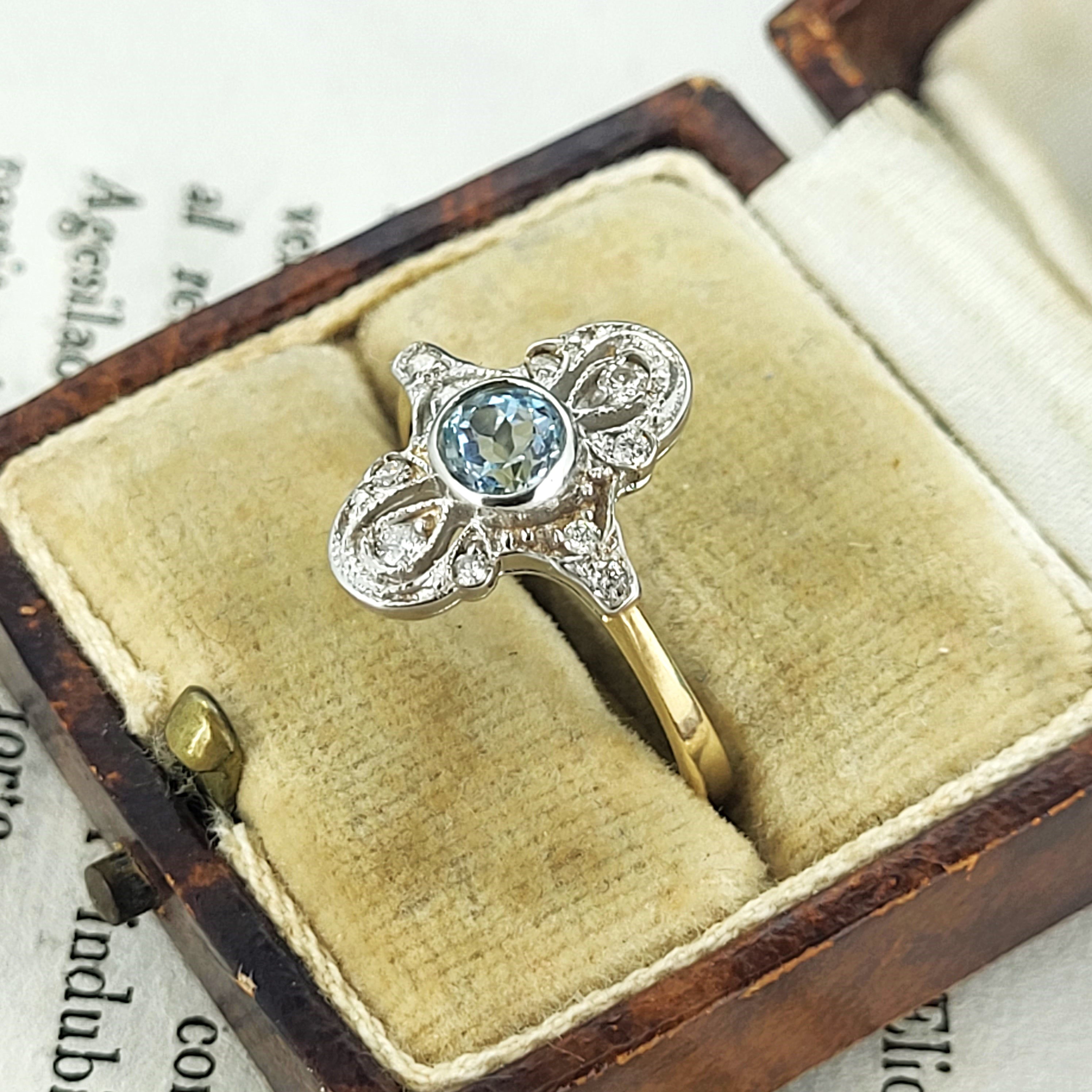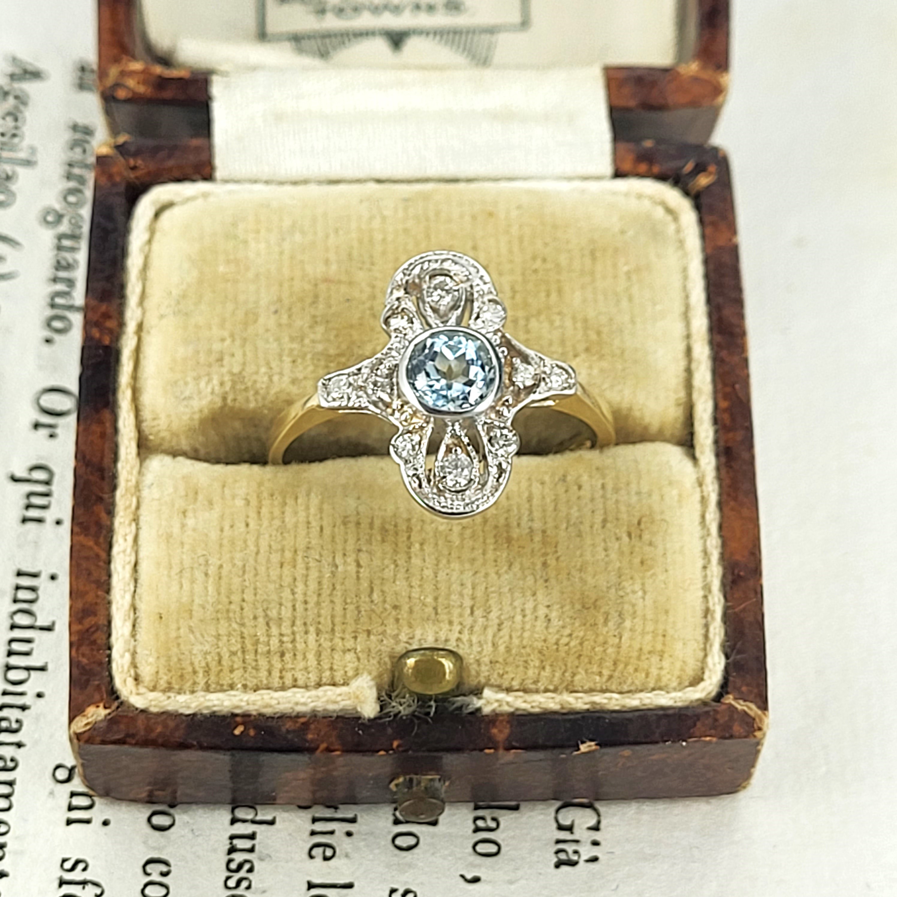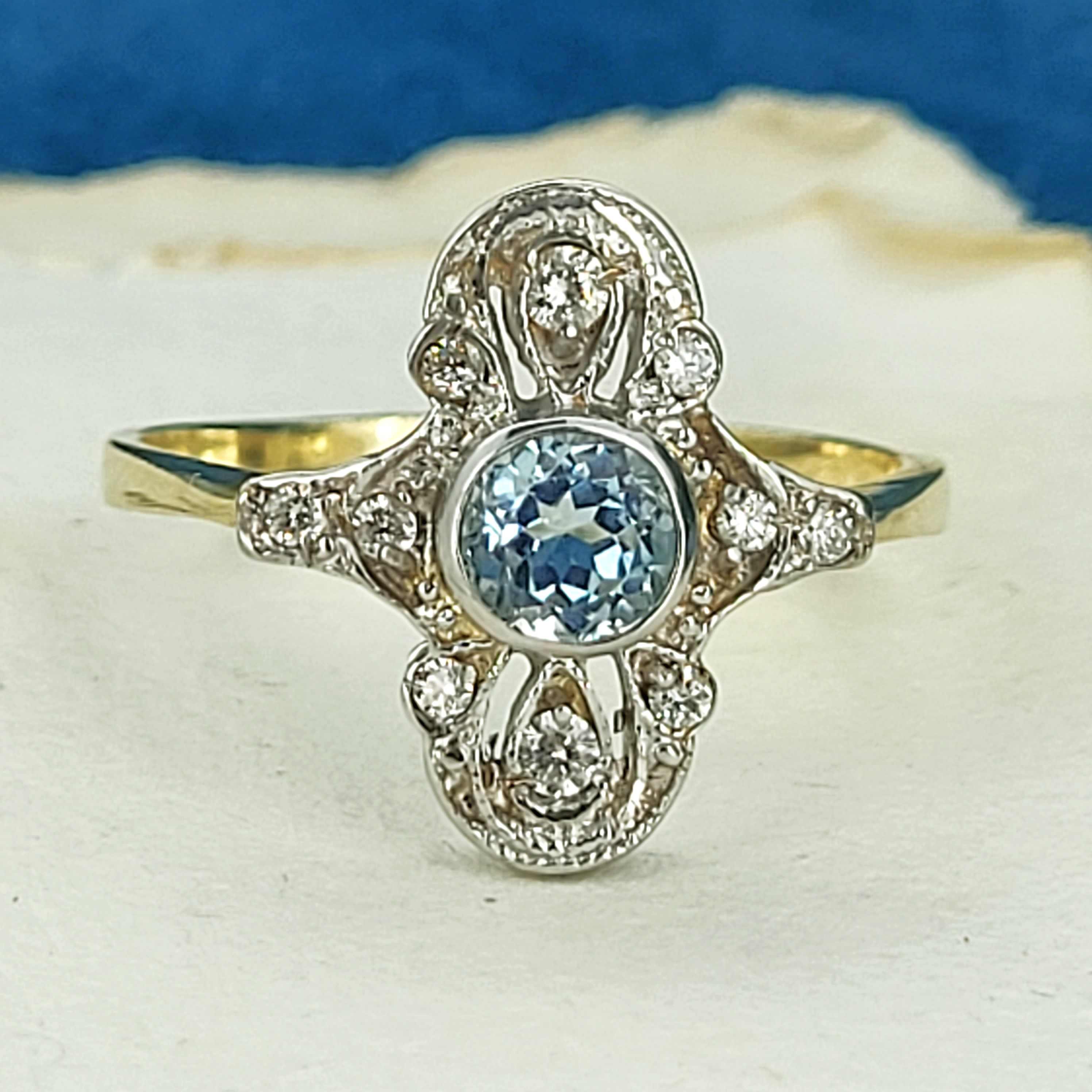 This ring features a central round aquamarine gemstone measuring 5mm. The vivid Aquamarine is surrounded by Round Brilliant Diamonds set in a vintage style setting with milgrain detailing.