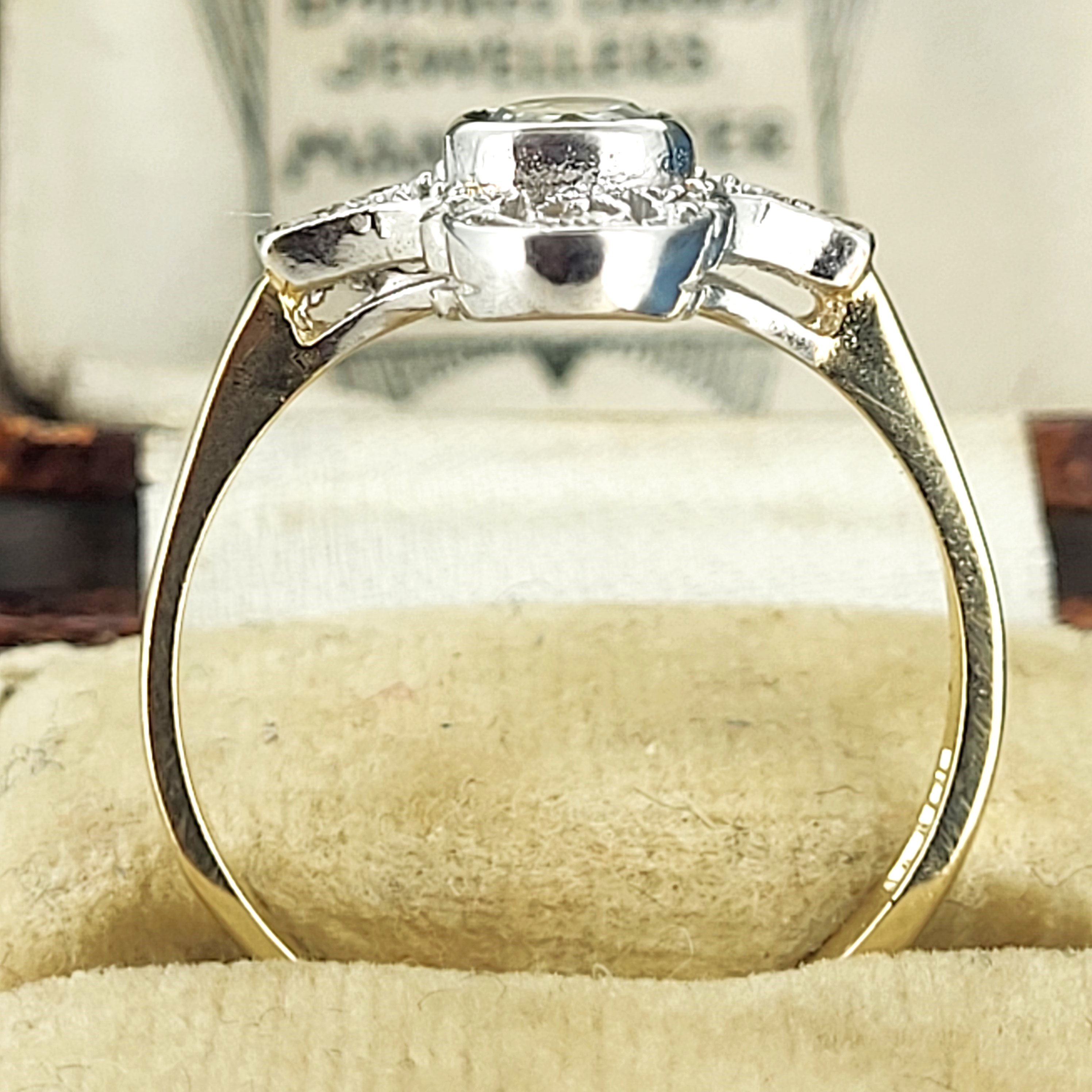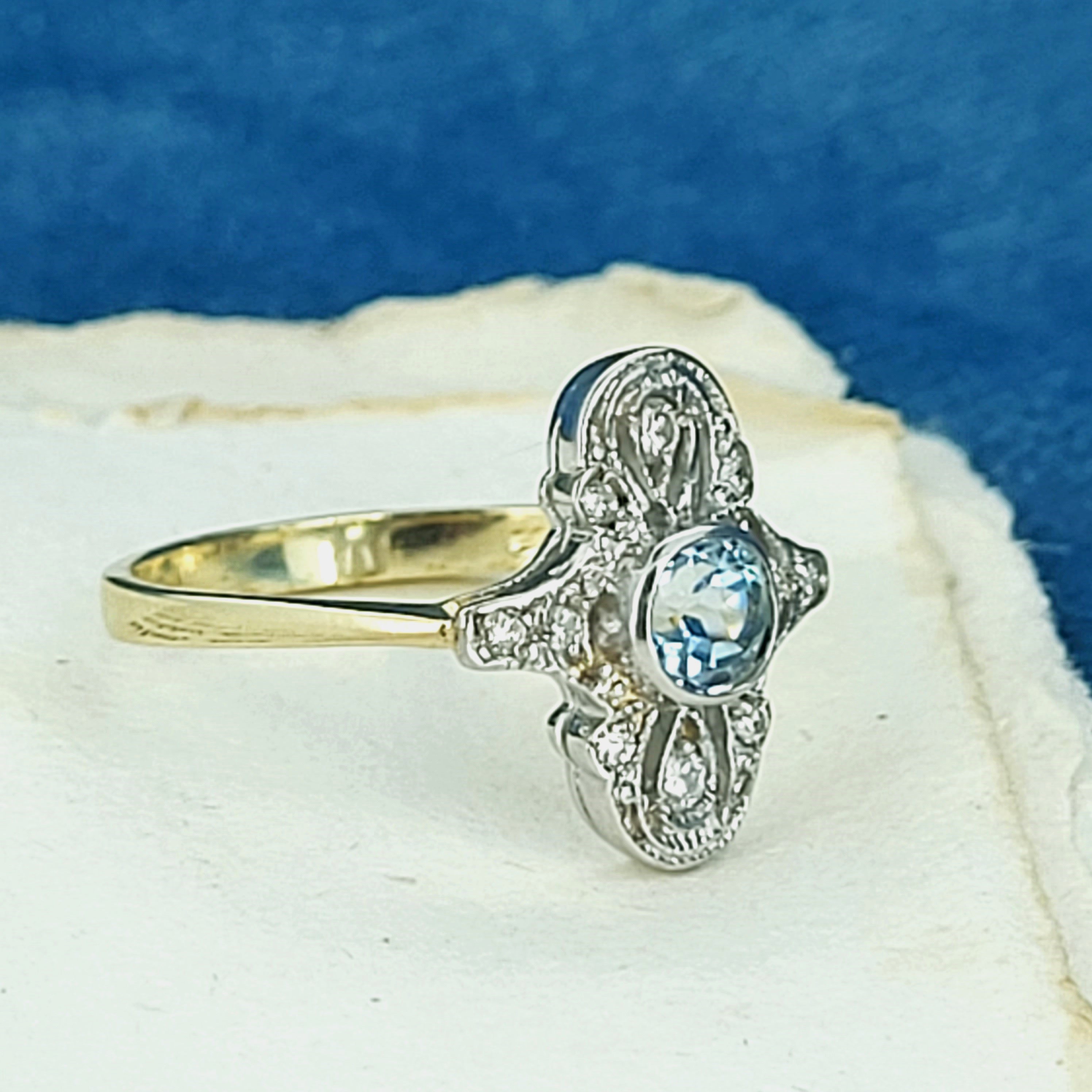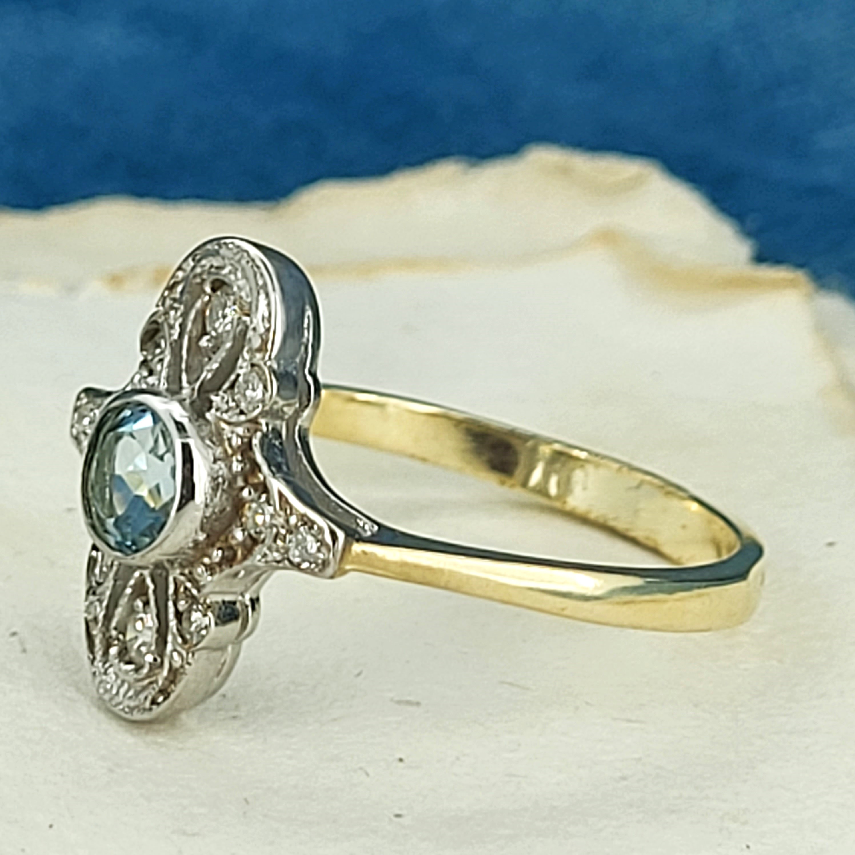 This ring features a central round aquamarine gemstone measuring 5mm. The vivid Aquamarine is surrounded by Round Brilliant Diamonds set in a vintage style setting with milgrain detailing.