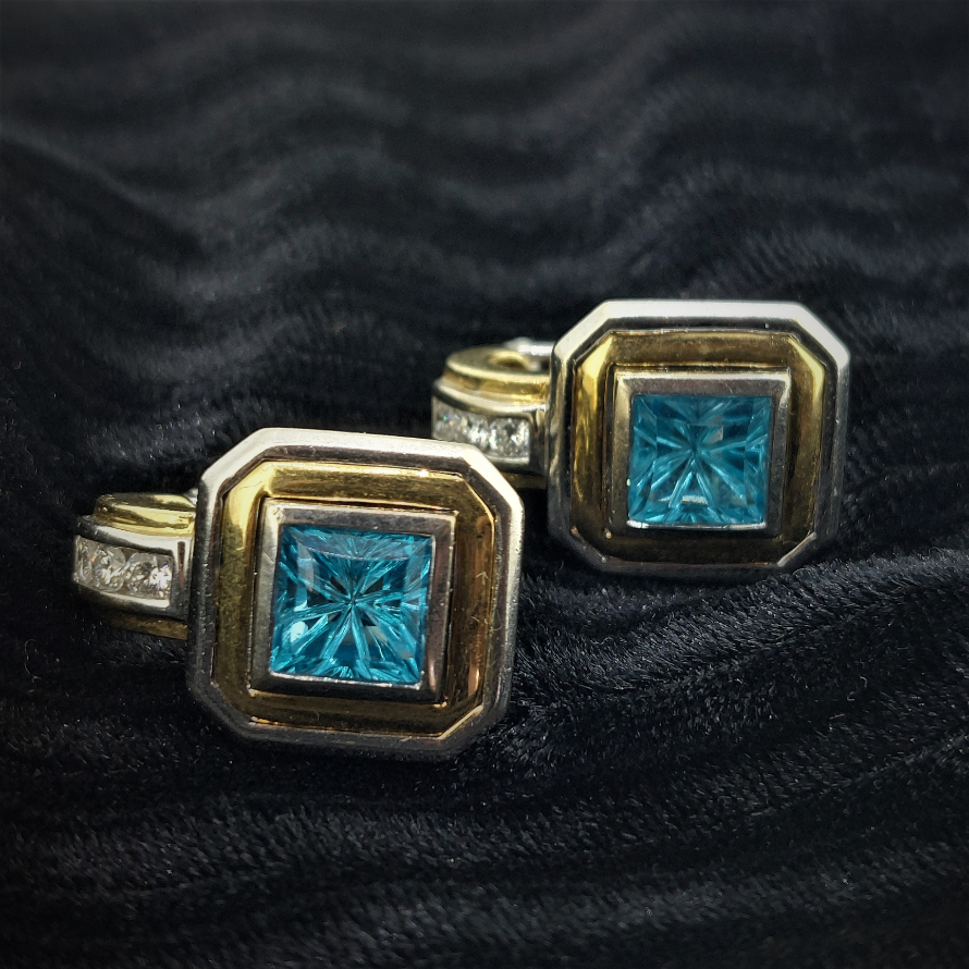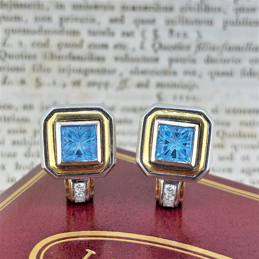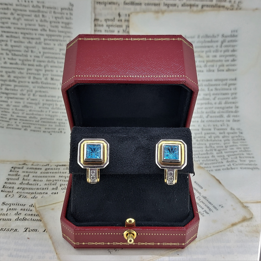 A vibrant Princess Cut Blue Topaz weighing approximately 3.00cts is framed in a combination of Yellow and White Gold.