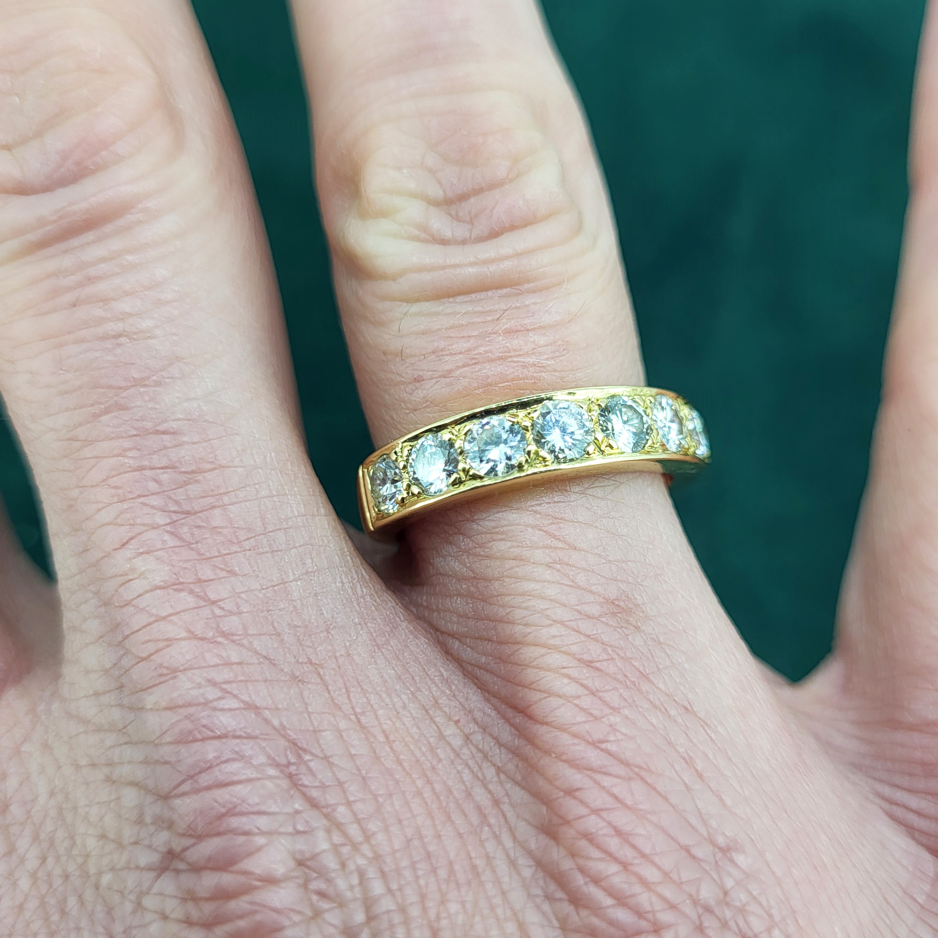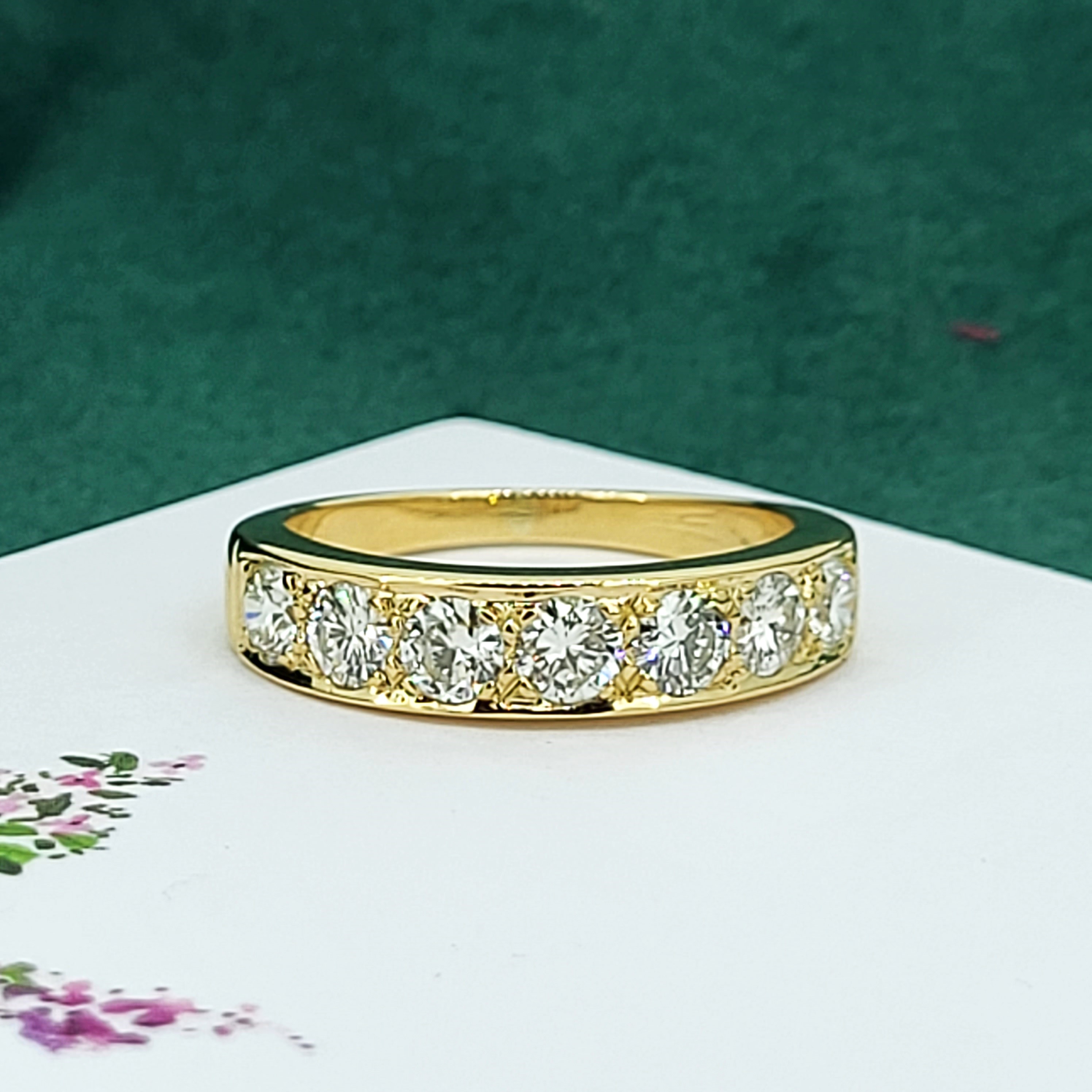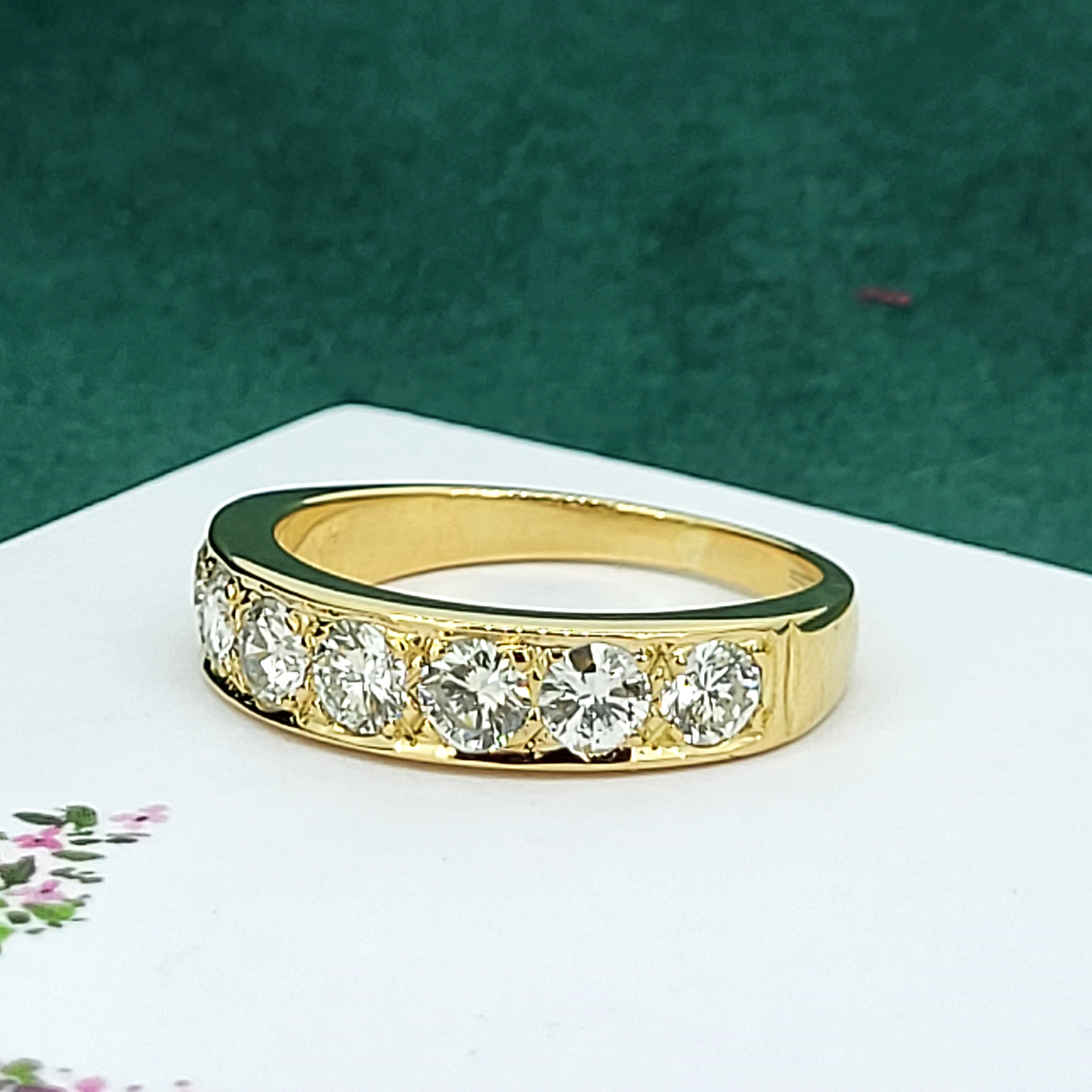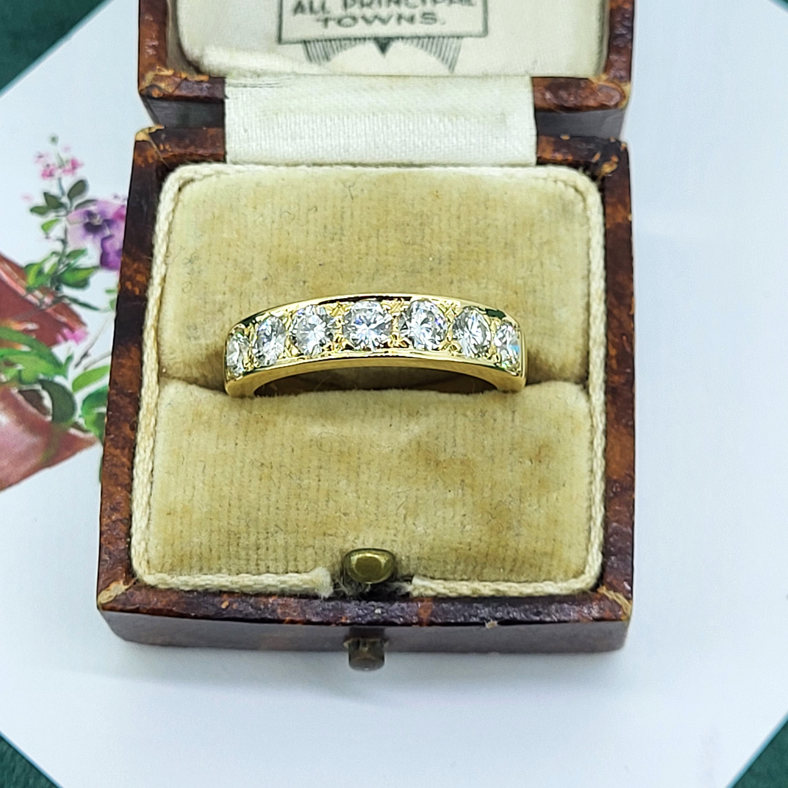 This ring features seven 0.17cts round brilliant cut diamonds set in a vintage style grain setting. The combined carat weight is an estimated 1.20cts. The diamonds are bright with fabulous luster and brilliance, G/H in Colour and SI Clarity.