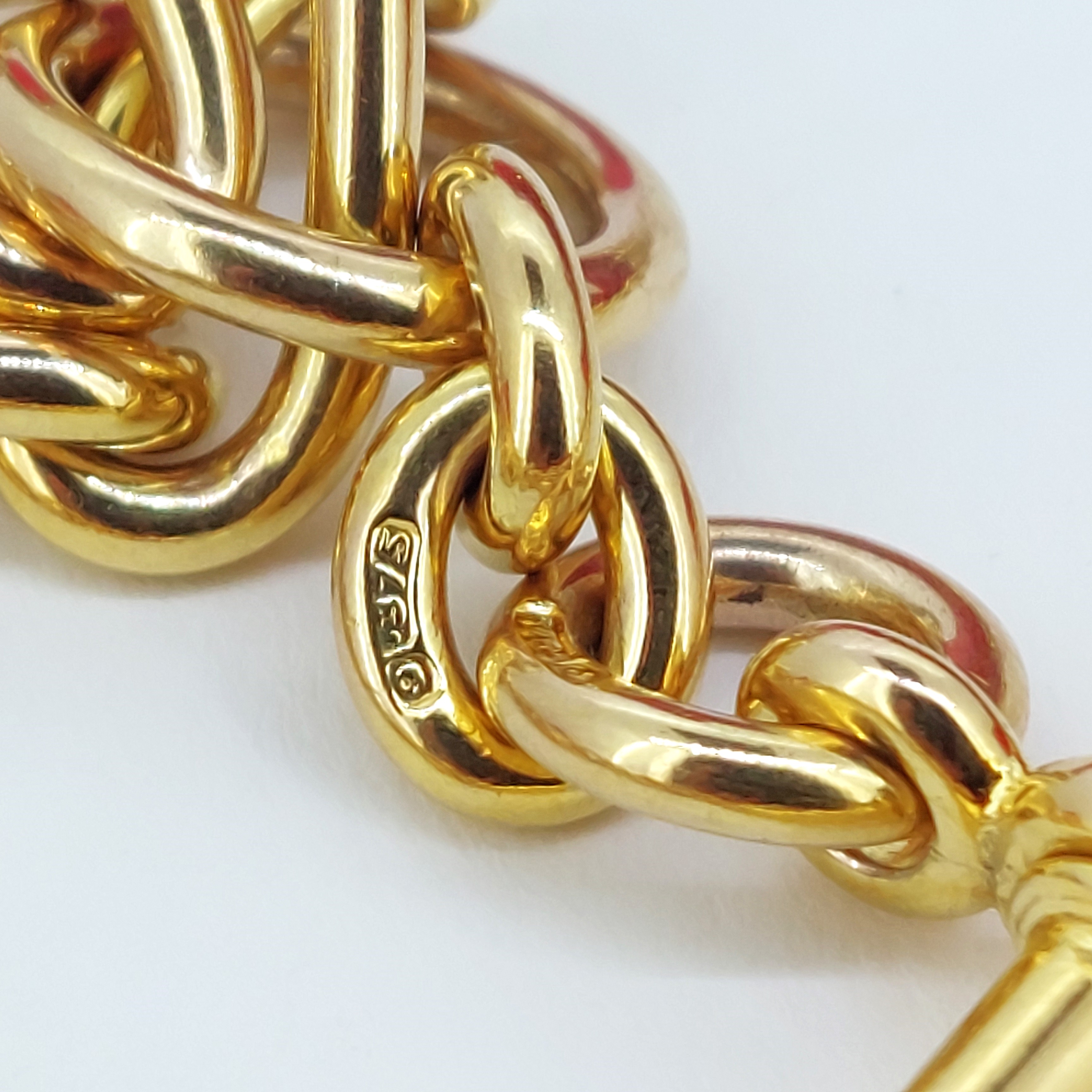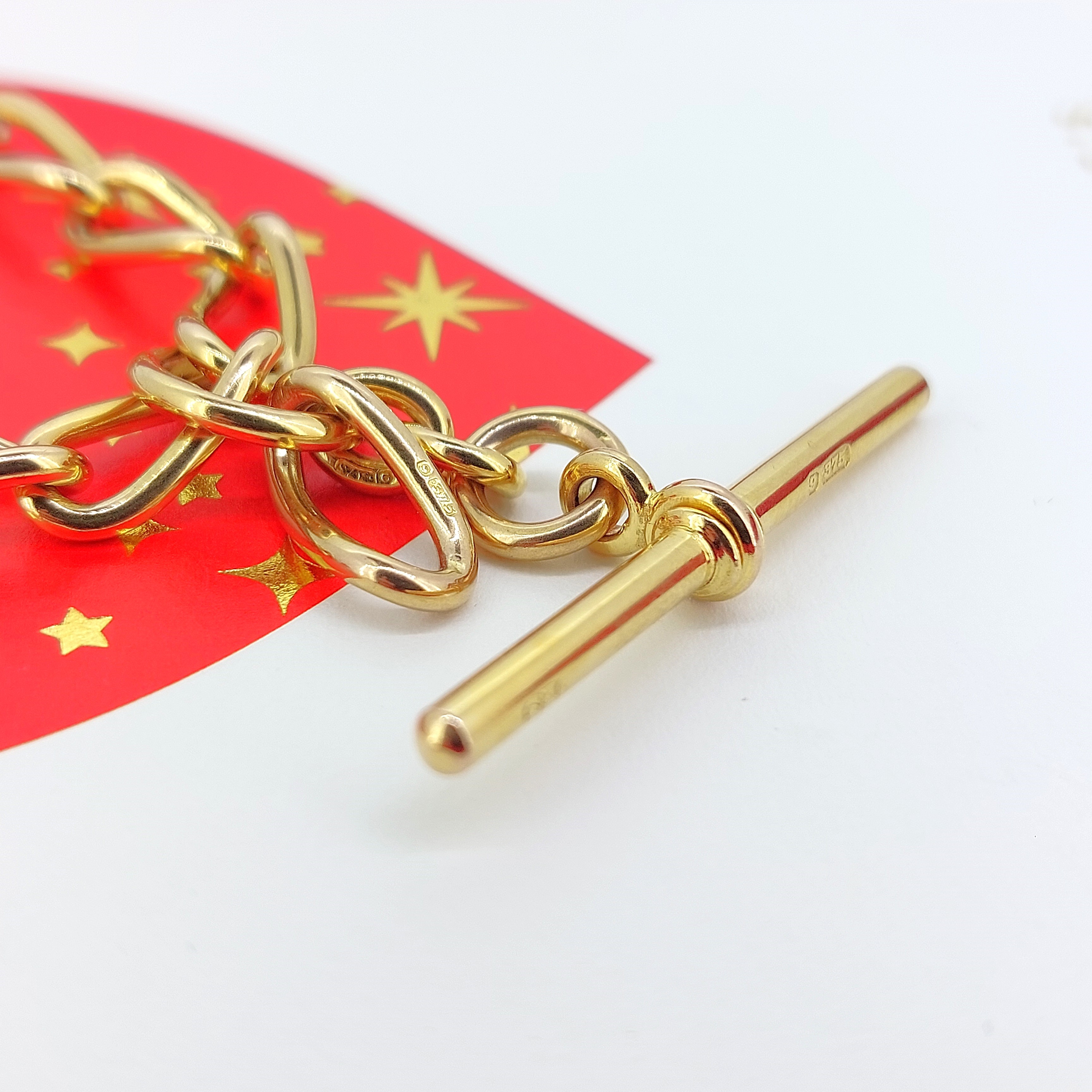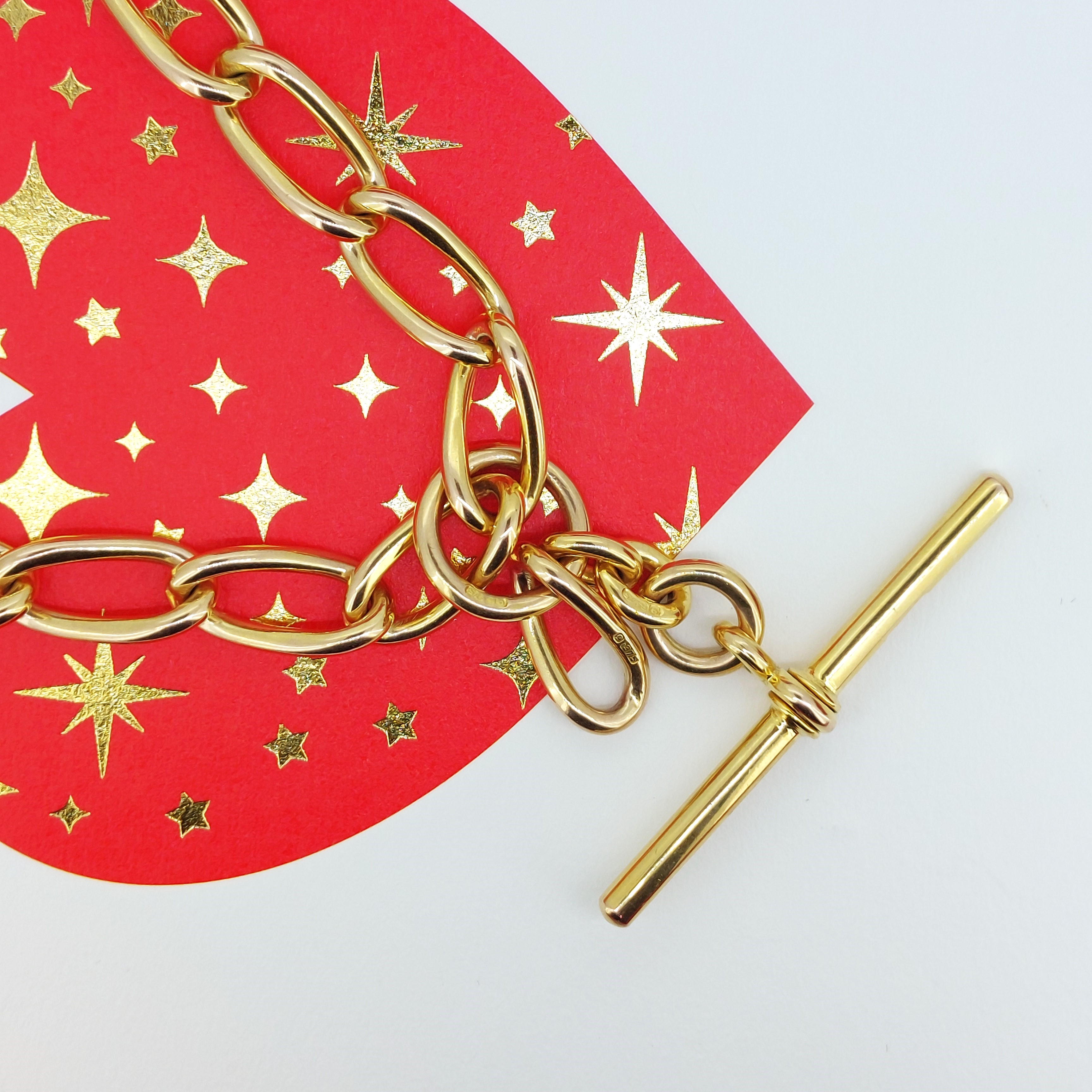 It has a 40mm T-Bar that hangs 1 inch from the centre of the chain. The T-Bar is hallmarked 9ct Gold and features a Makers Mark of JES who we unfortunately can't find any further information on.