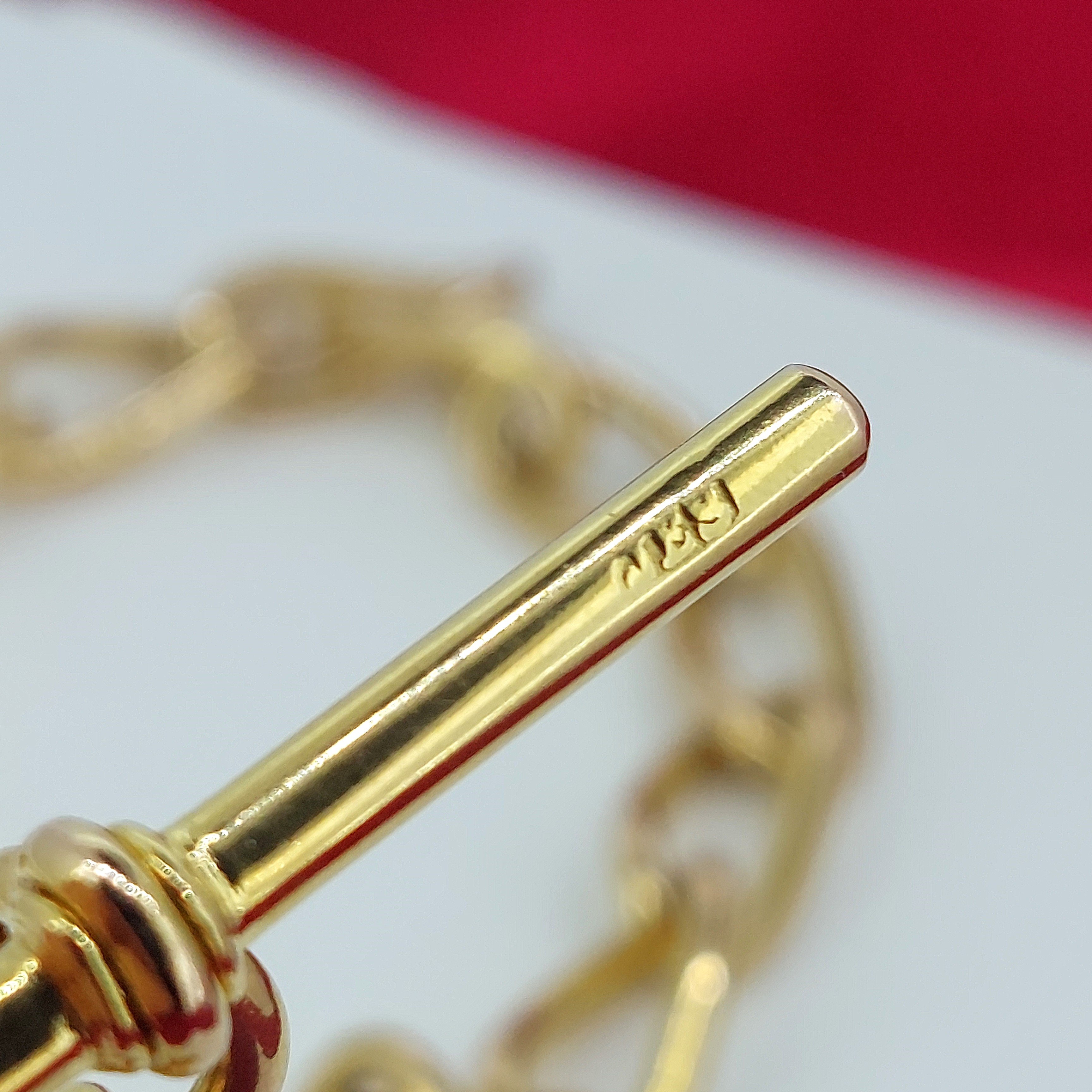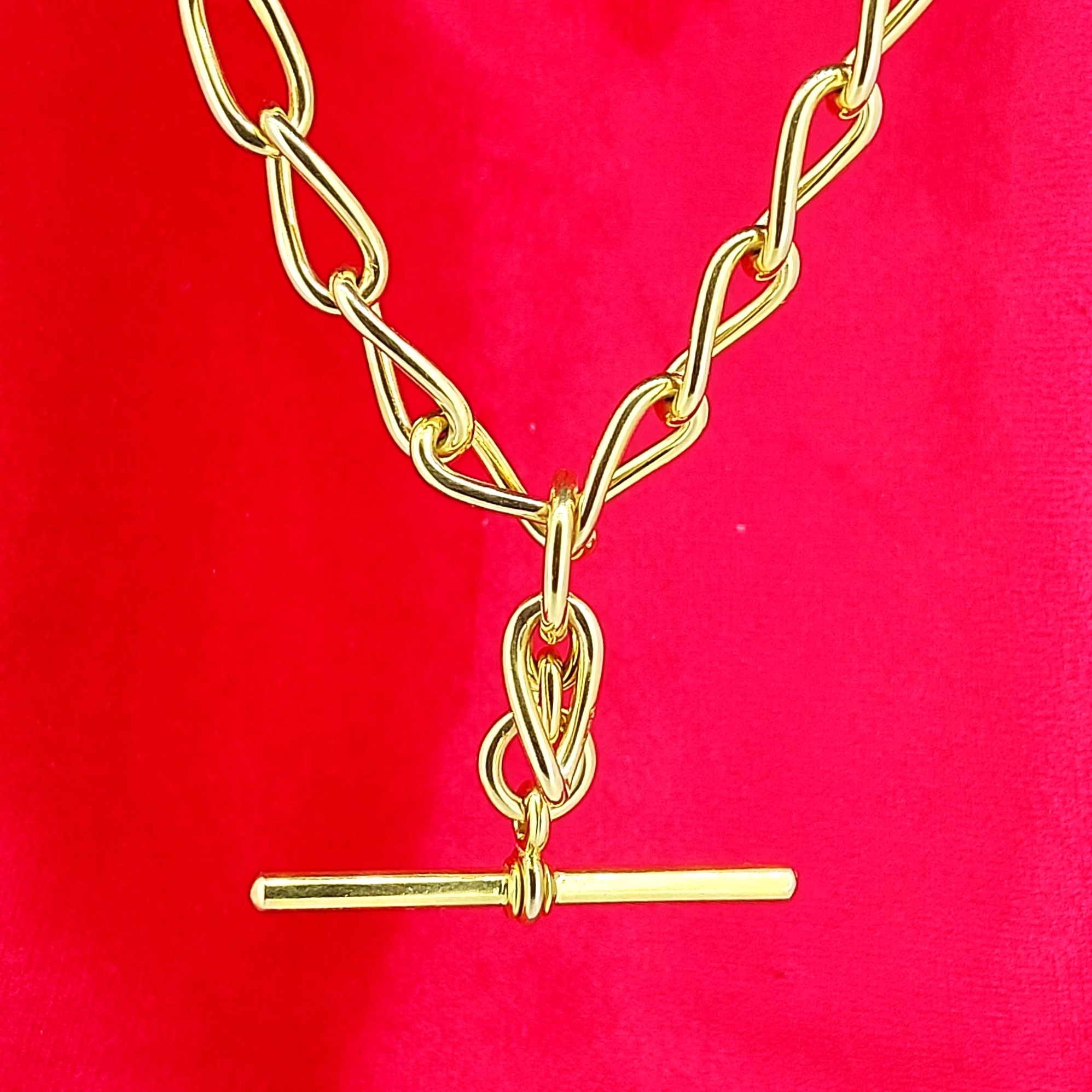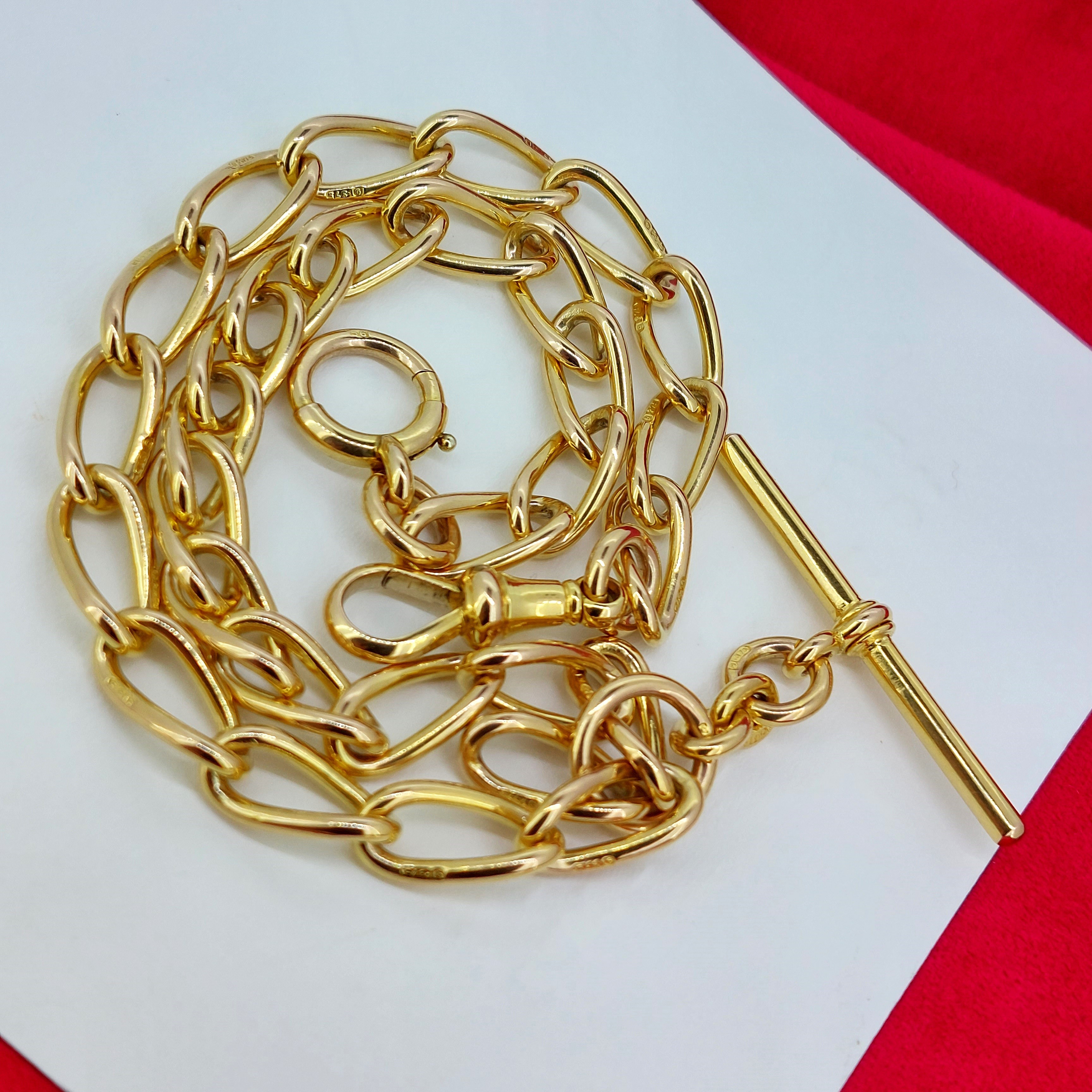 It has a 40mm T-Bar that hangs 1 inch from the centre of the chain. The T-Bar is hallmarked 9ct Gold and features a Makers Mark of JES who we unfortunately can't find any further information on.