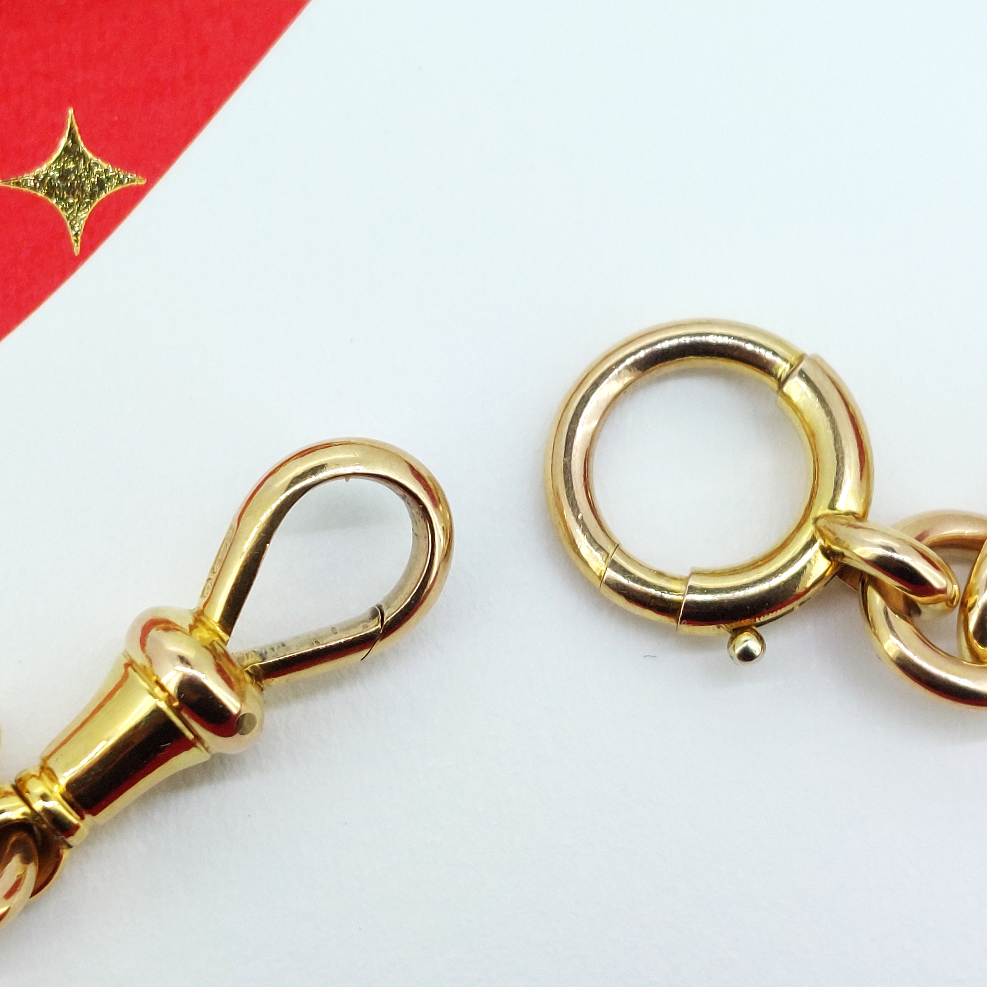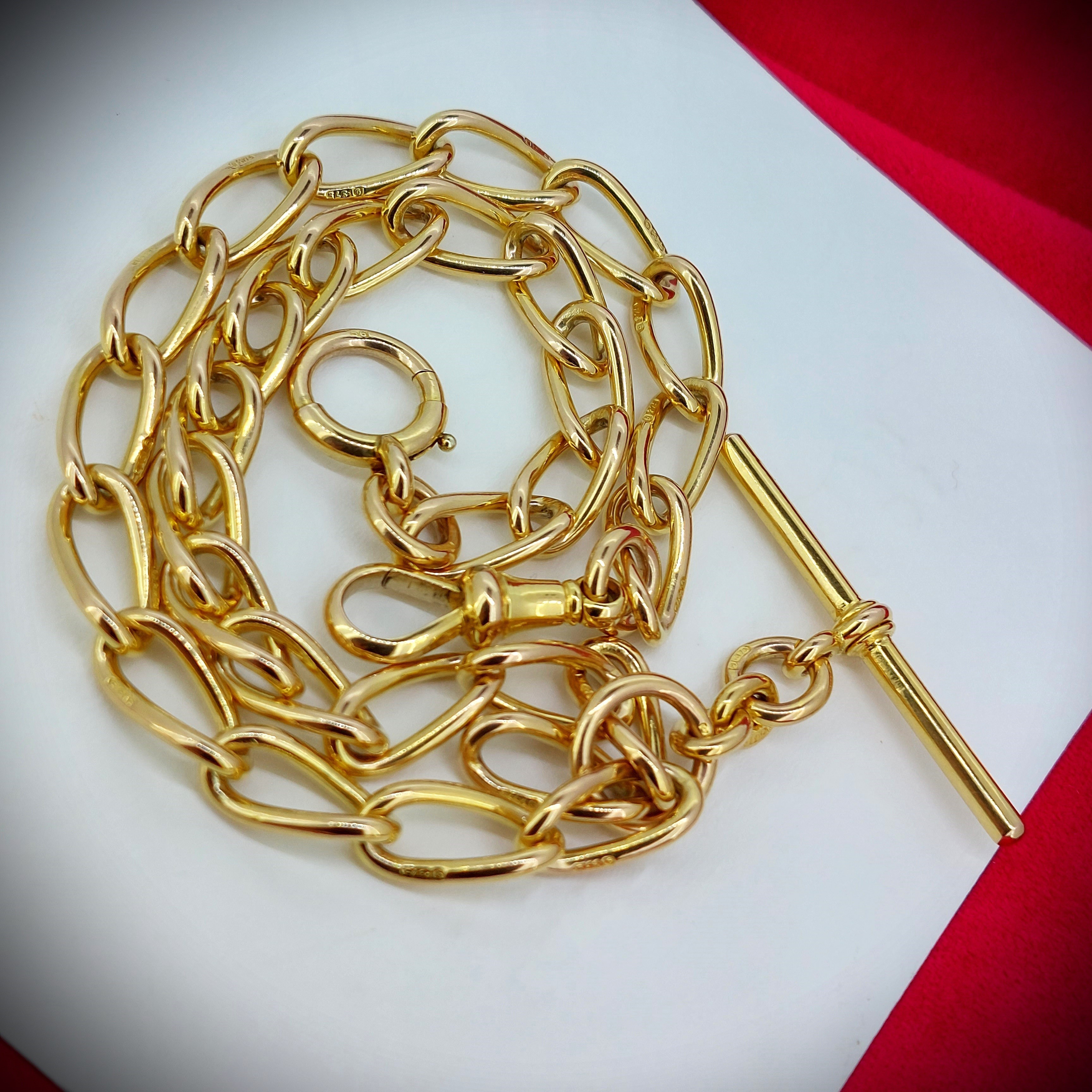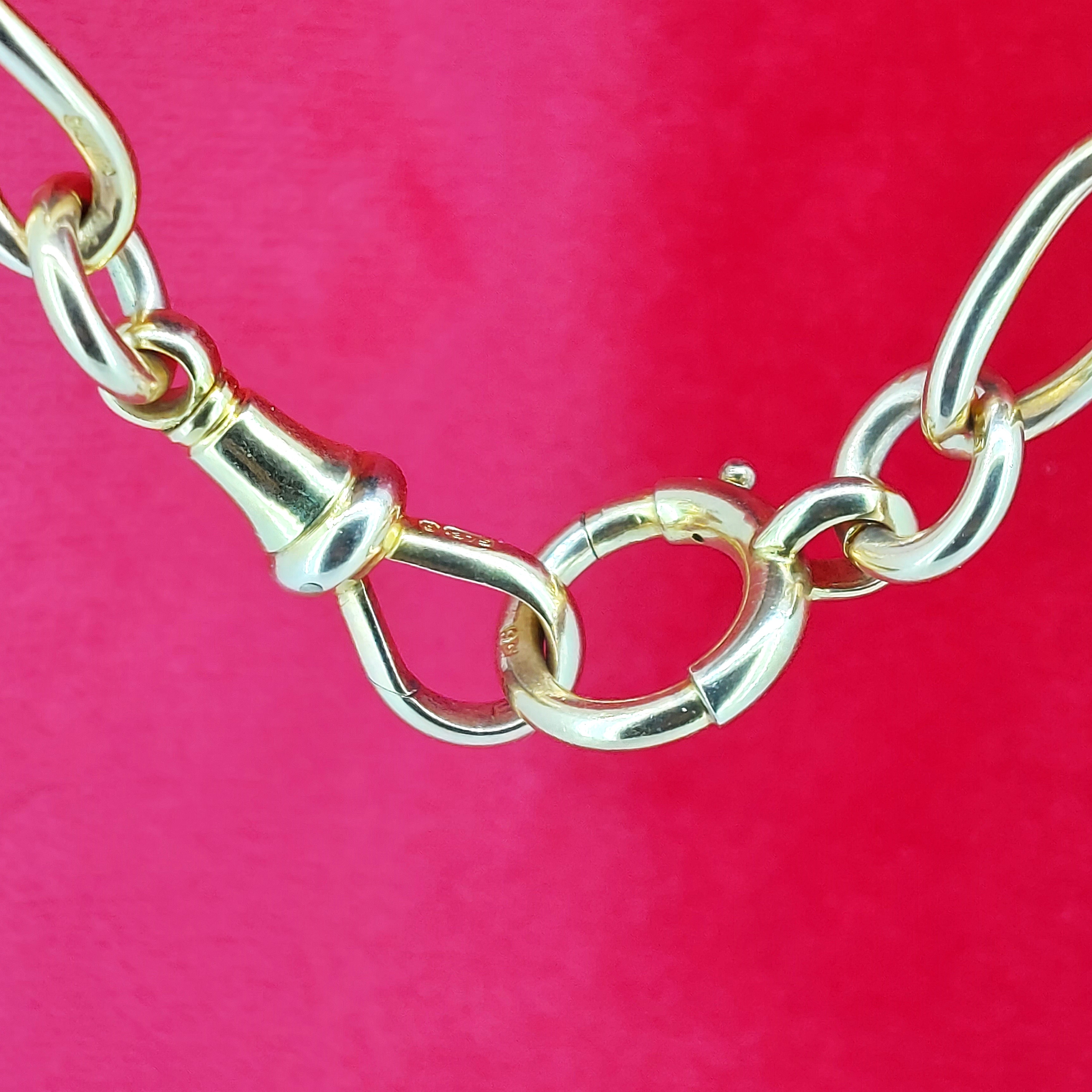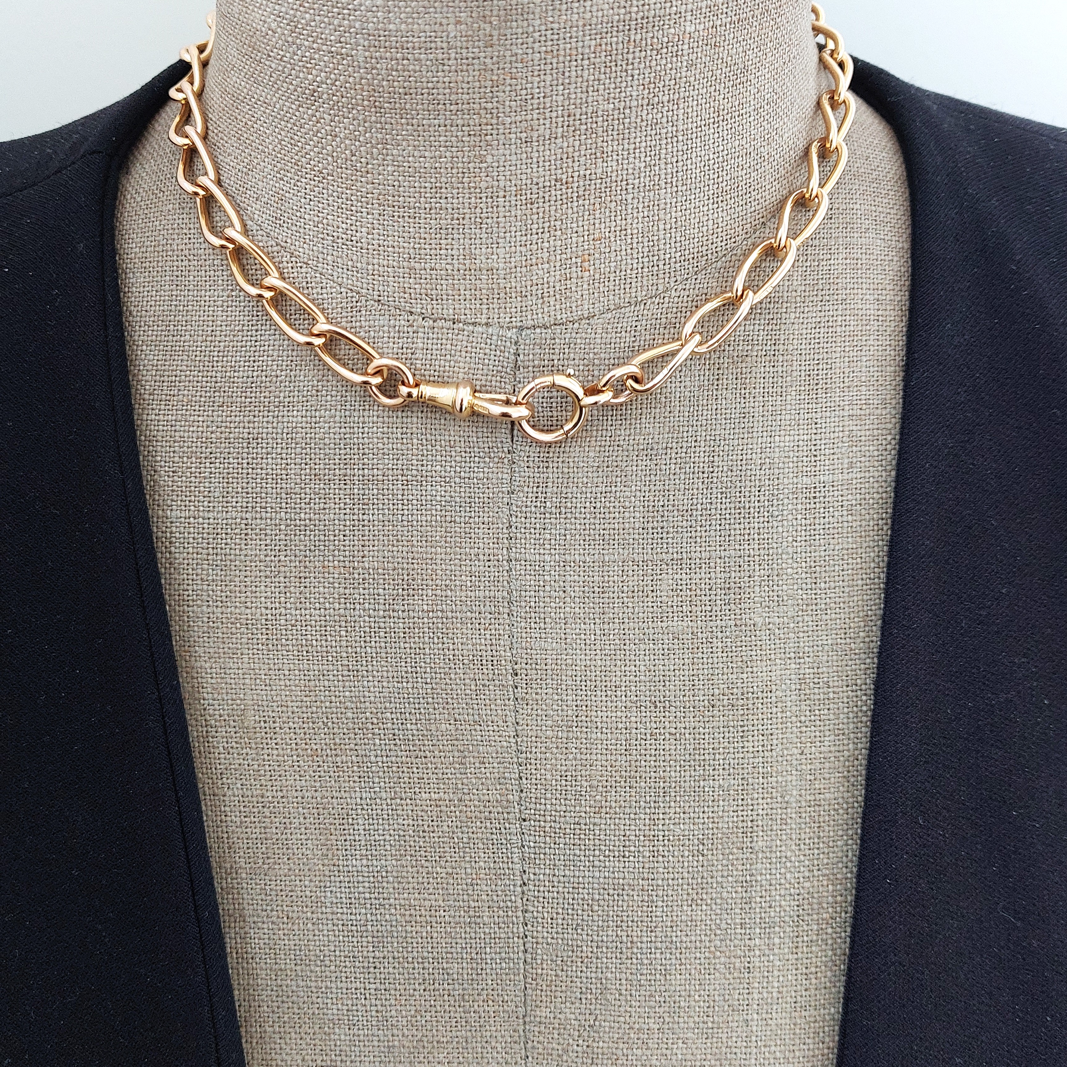 This Albert Chain really is gorgeous, it weighs 40.0 grams and is 15.5 inches in length. There is an additional link which could be used to attach additional hardware or used to extend the necklace to 16 inches.